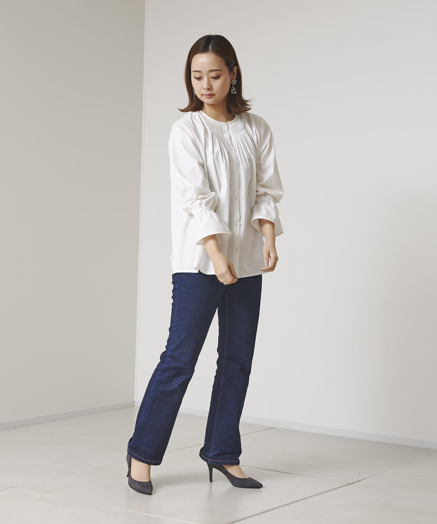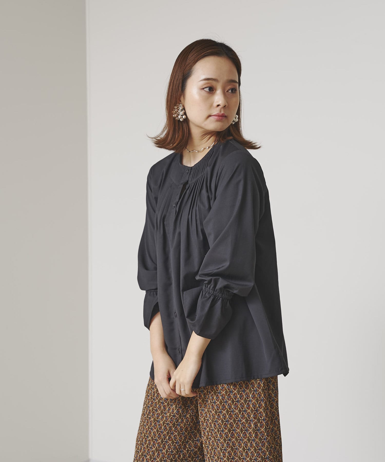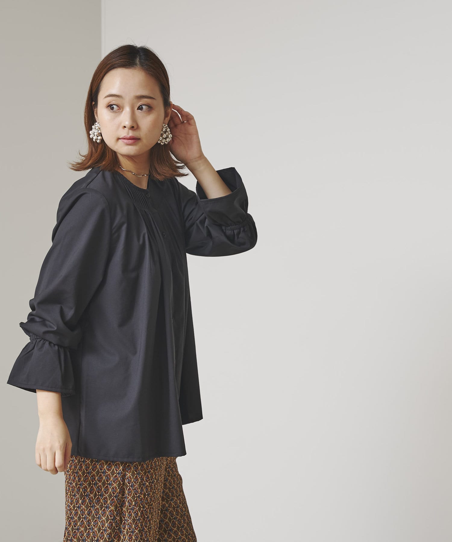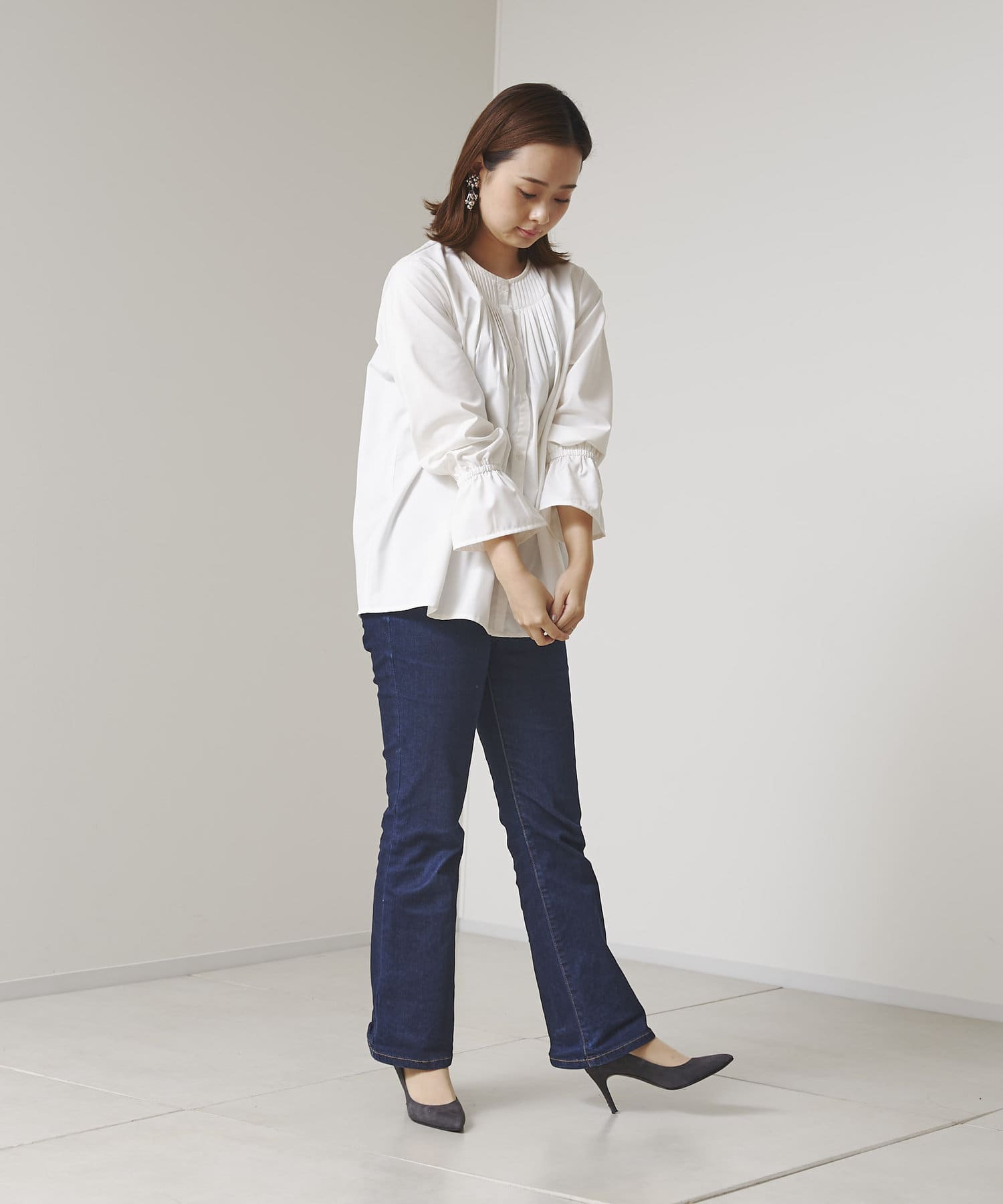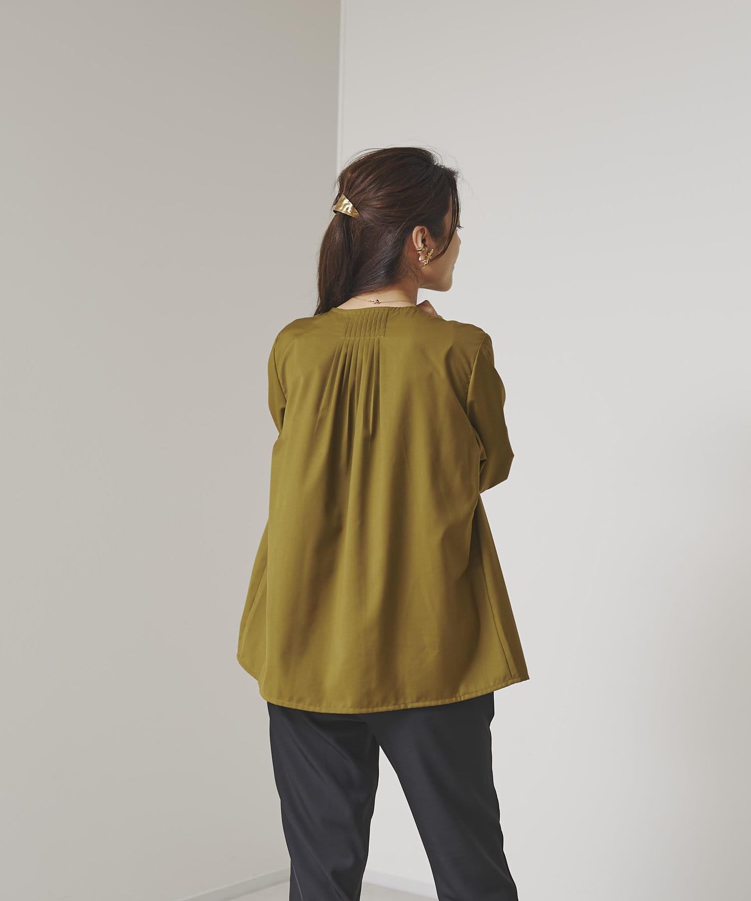 ・フロントのピンタックがネックレスなどなくても華やかな印象に。