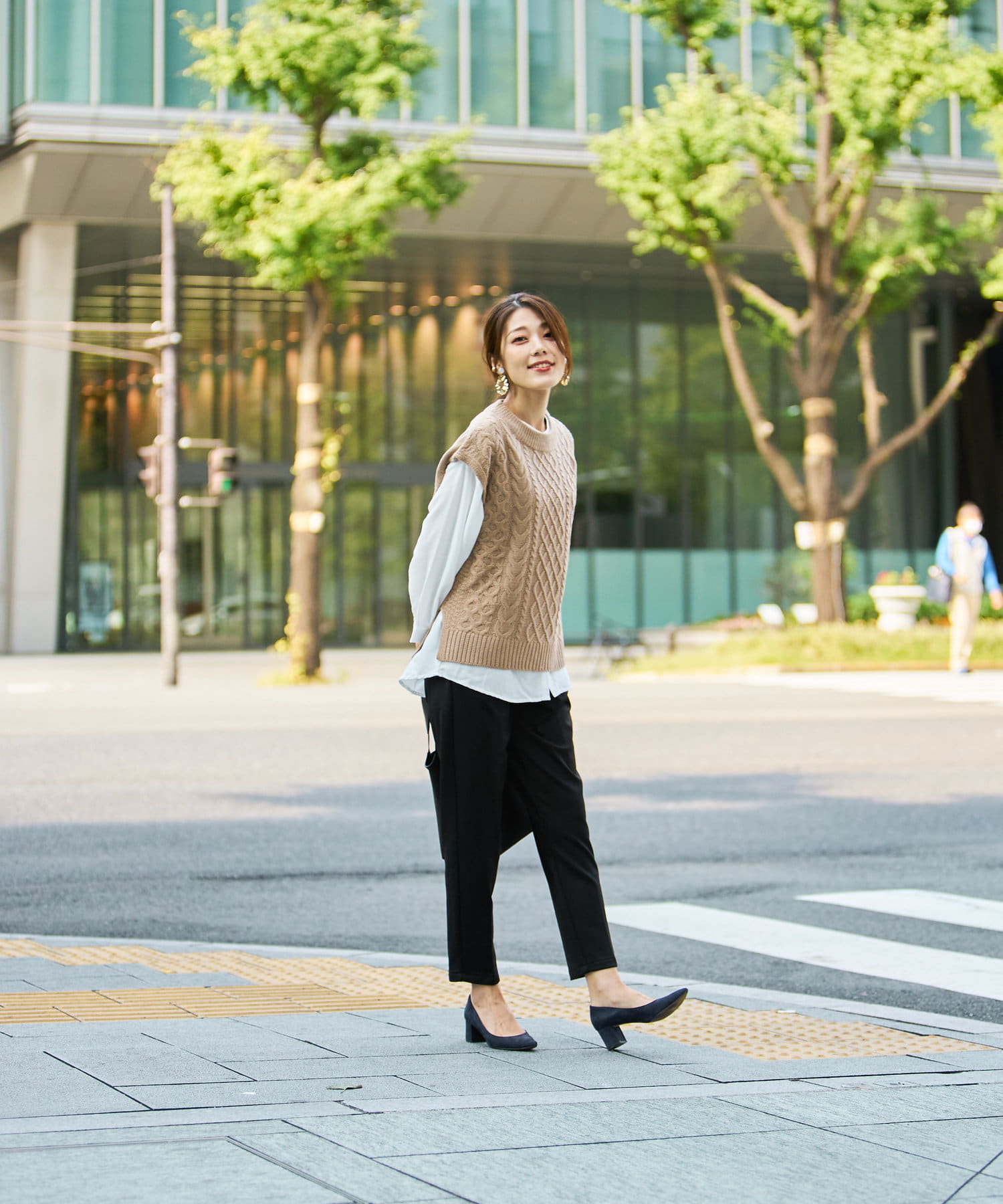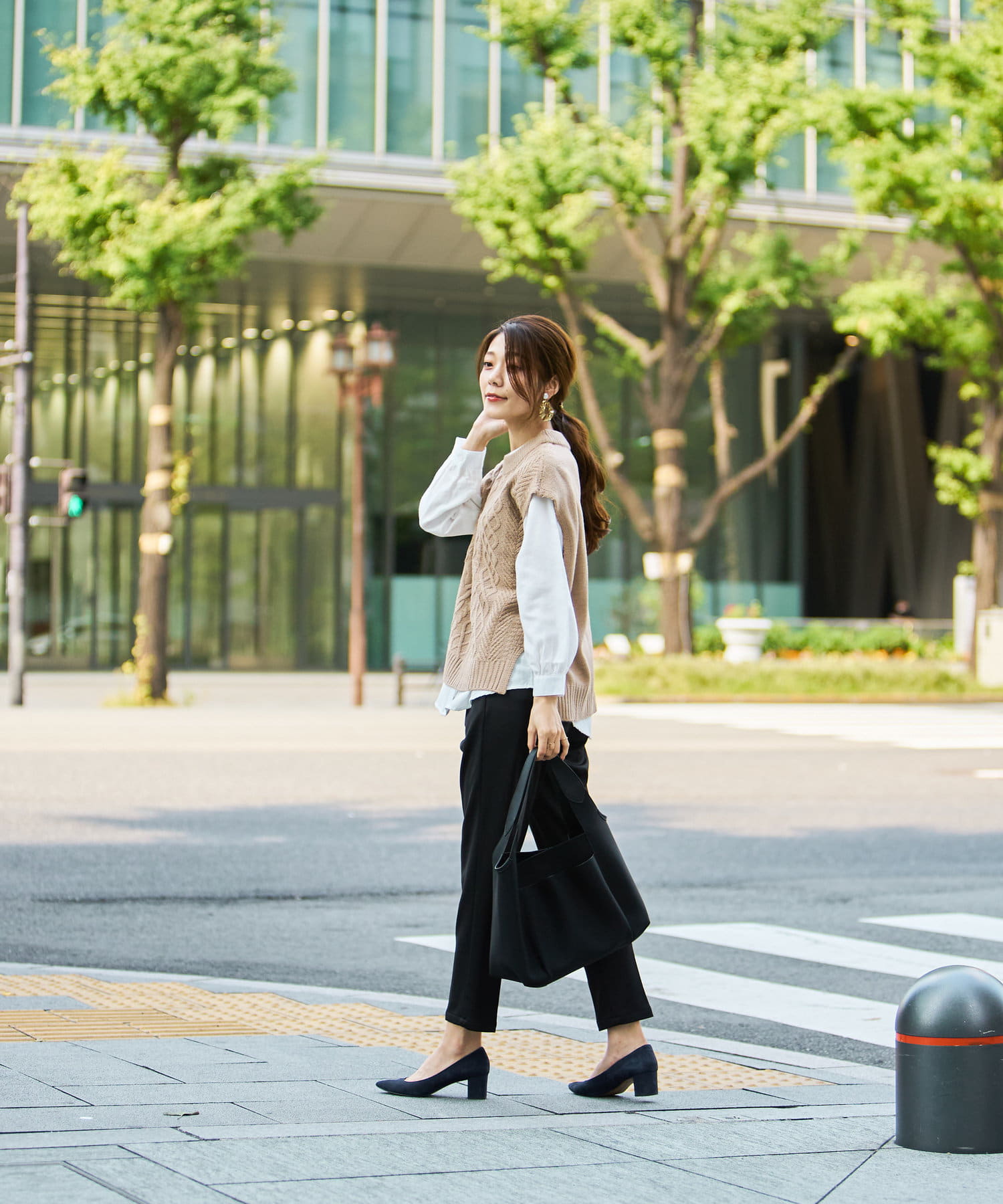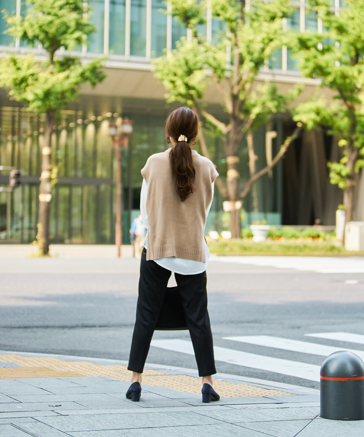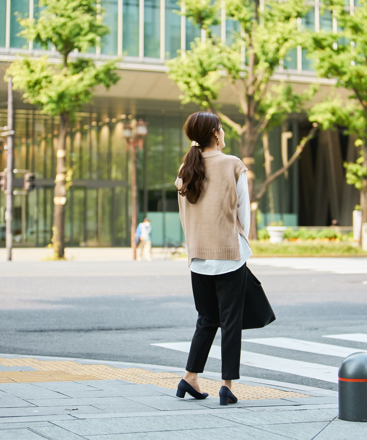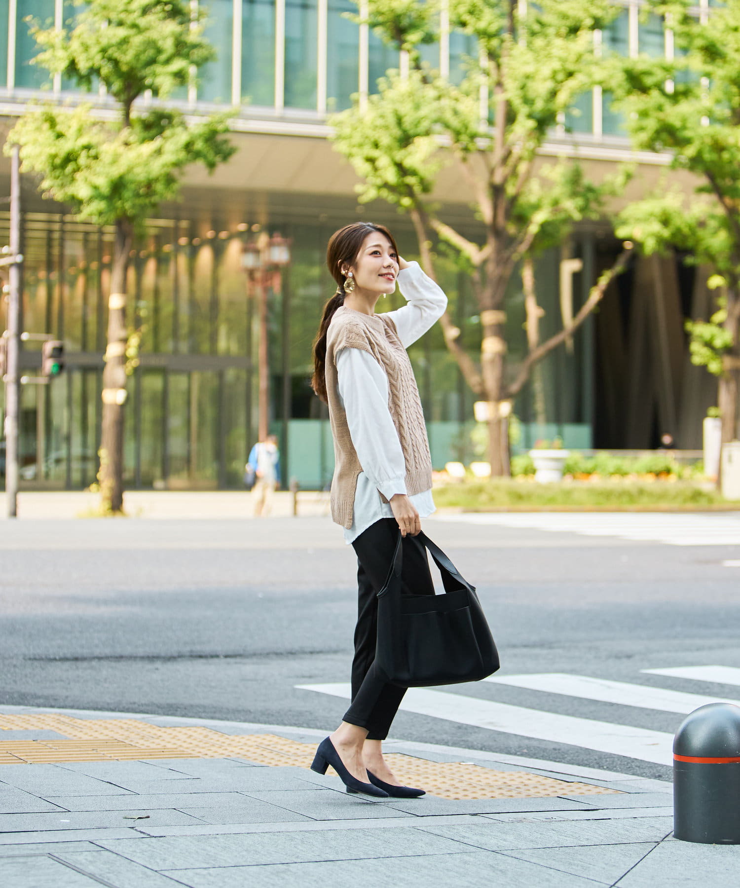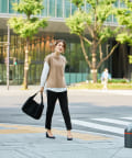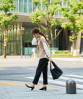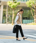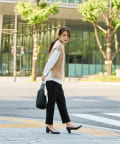 オフィスシーンには黒のパンツなどきれいめ見えするアイテムで。