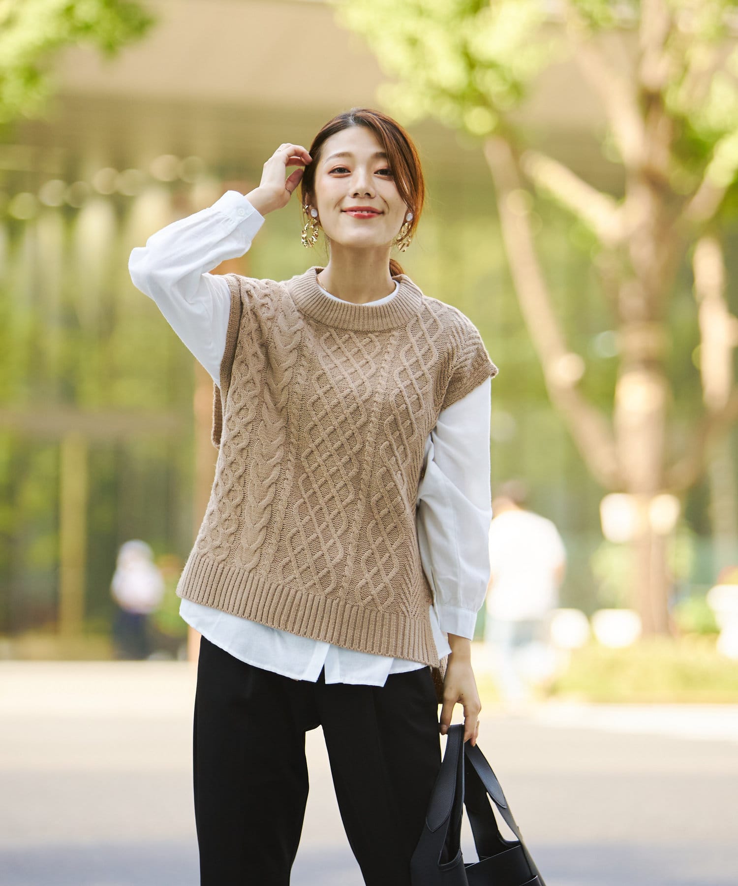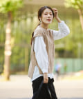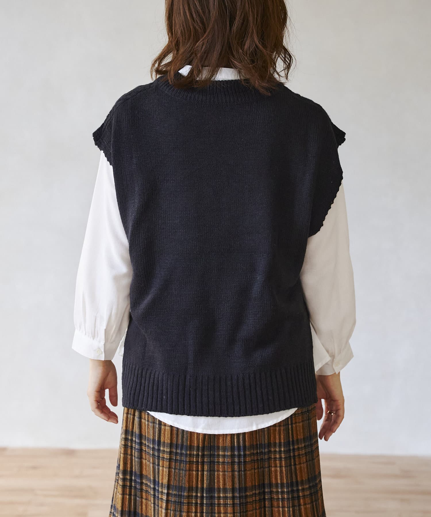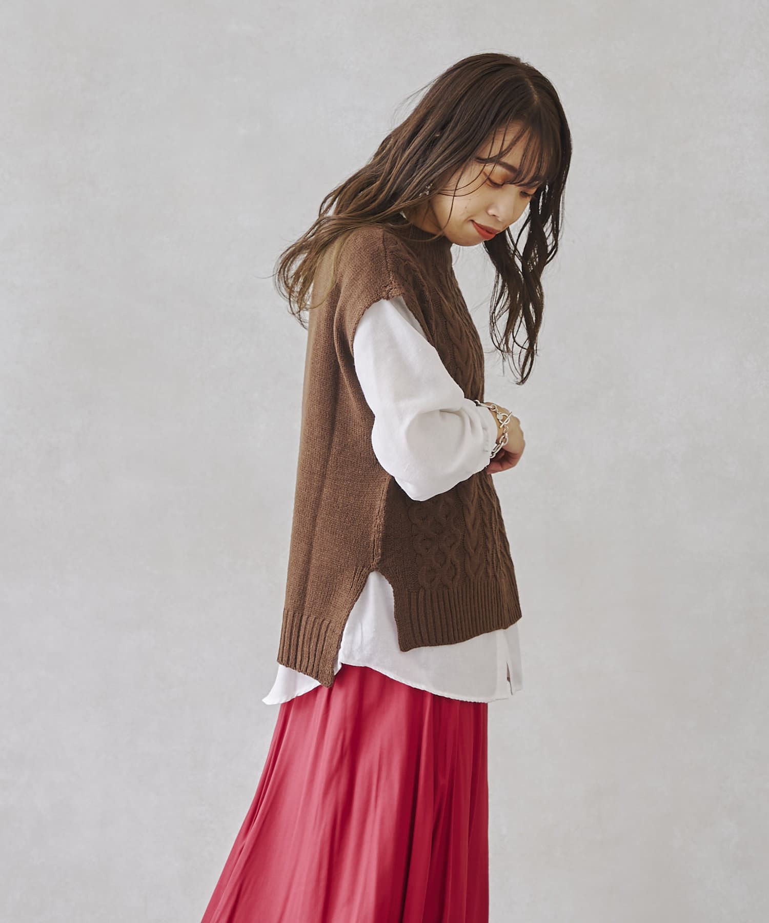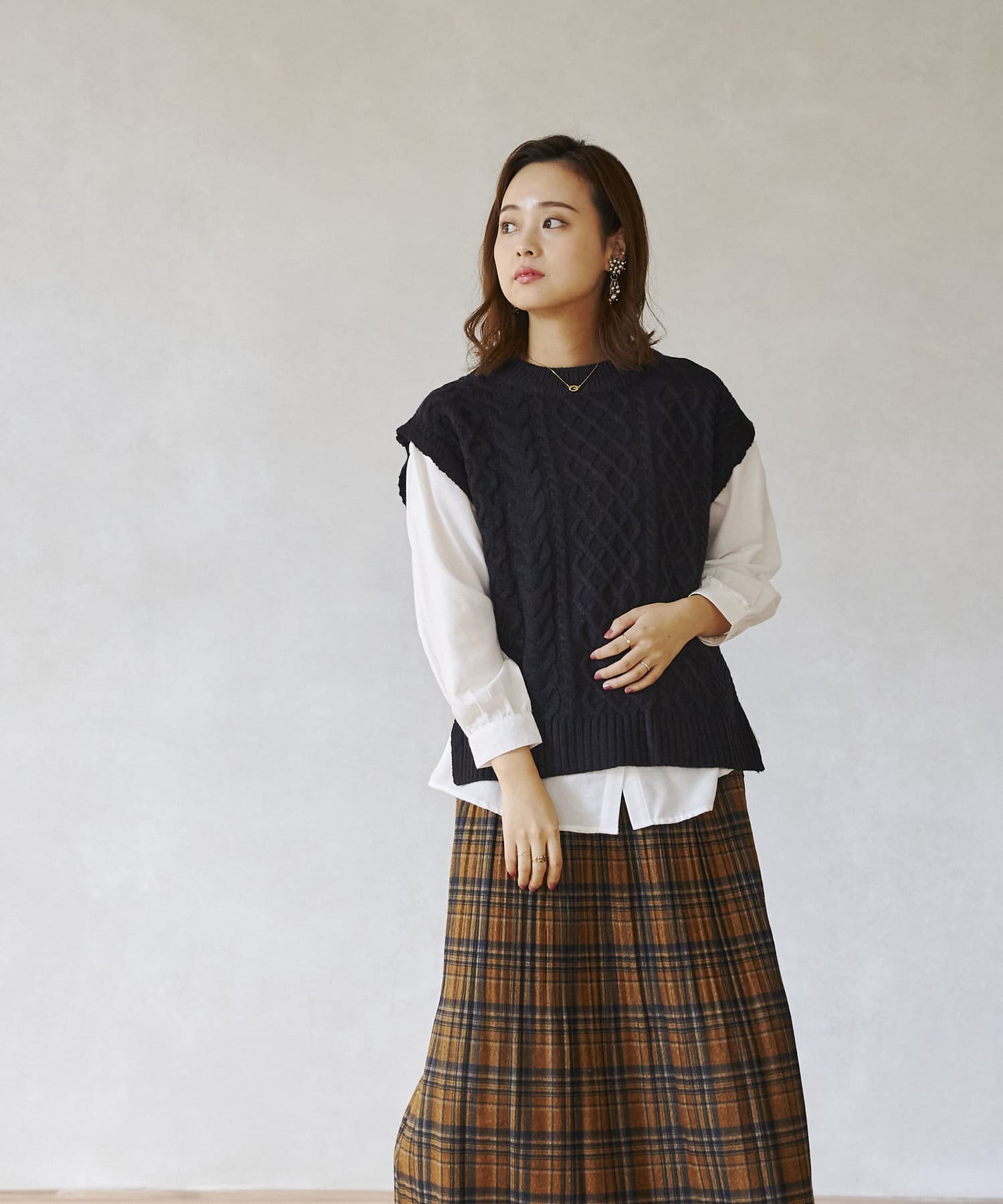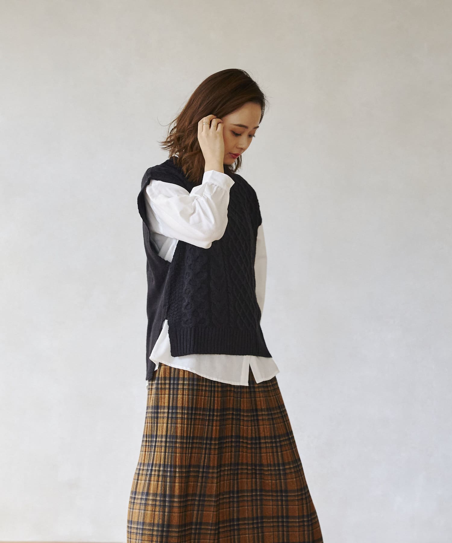 ケーブルニットベストとシャツのセットアイテム。着るだけでトレンドを押さえたコーデに。