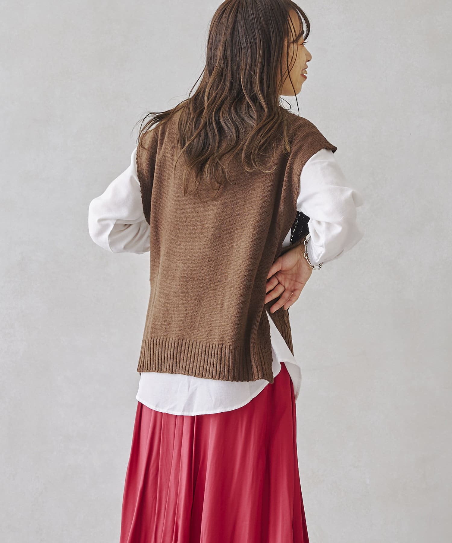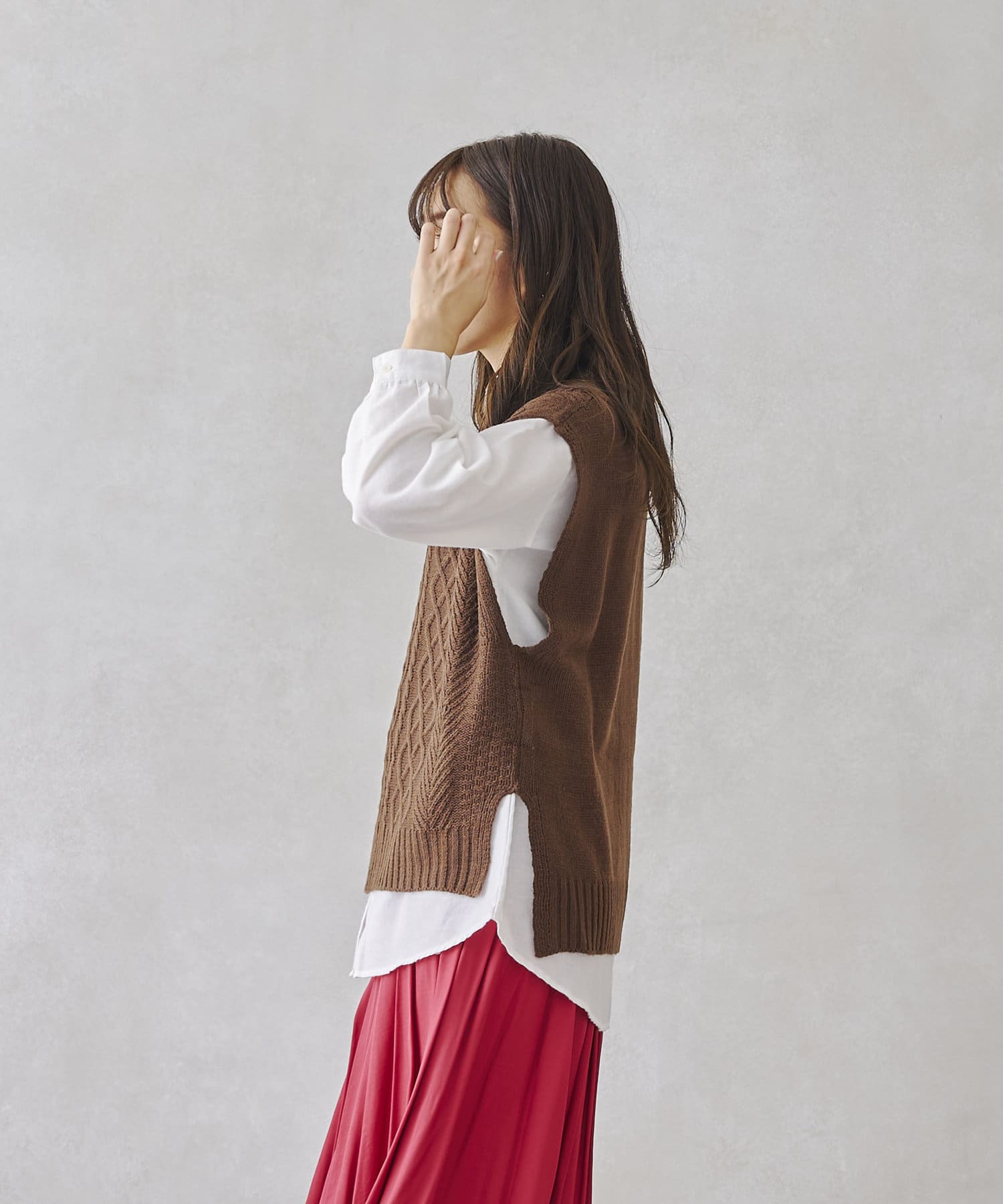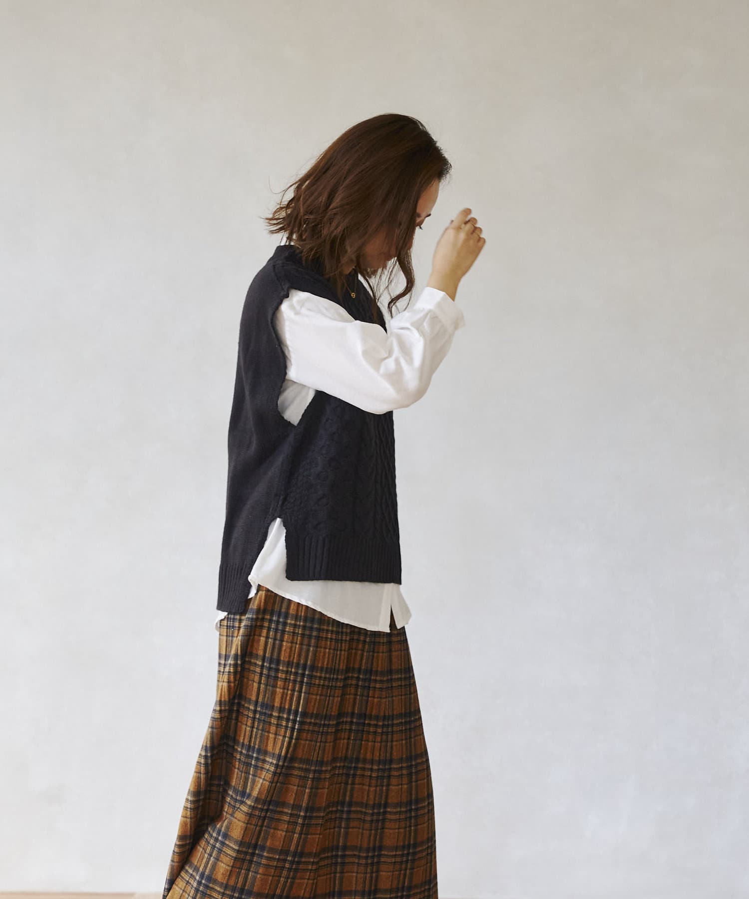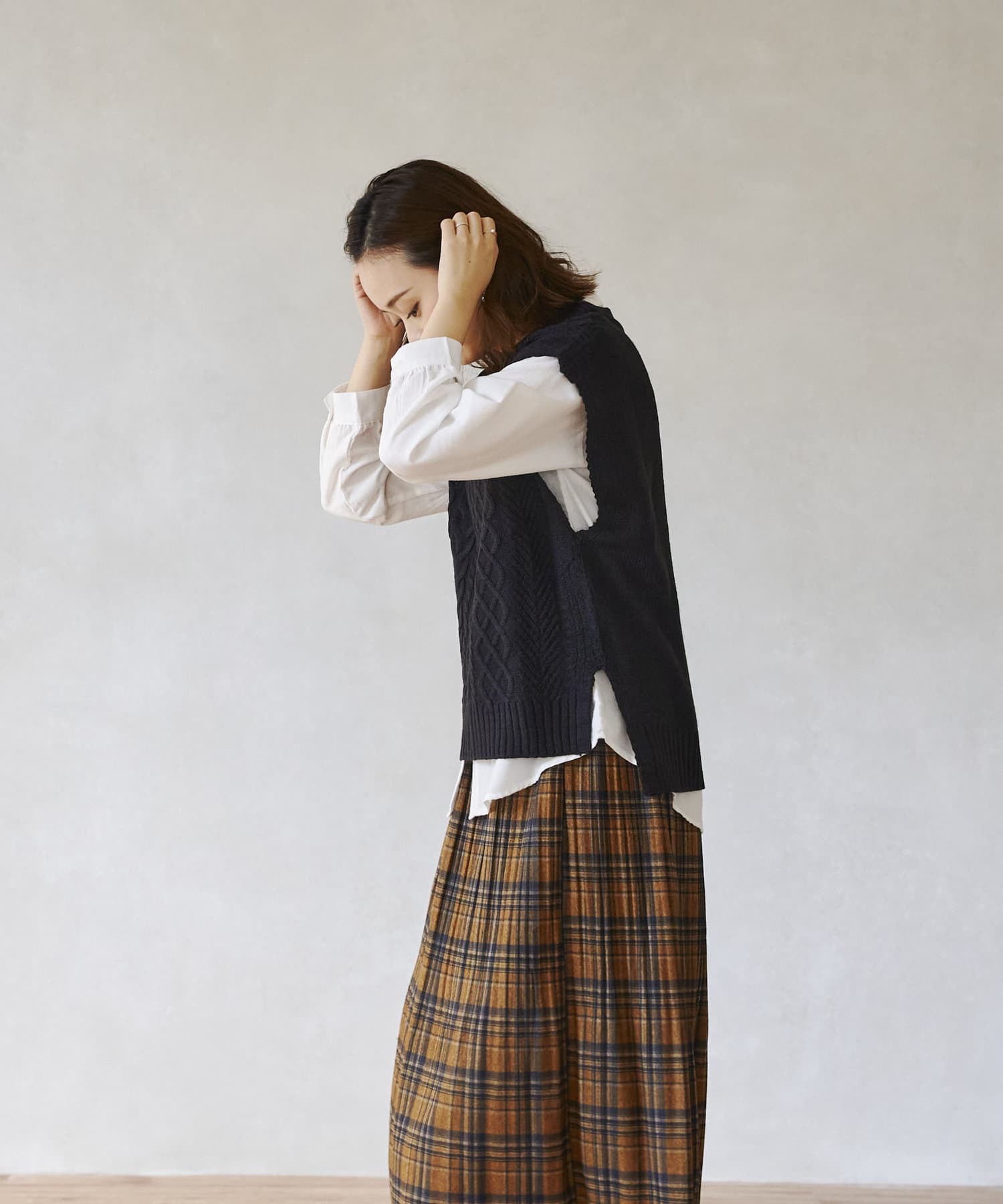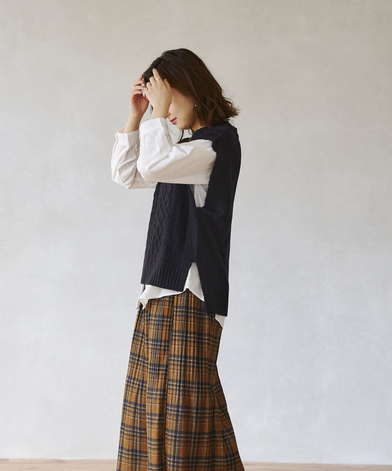 ケーブルニットベストとシャツのセットアイテム。着るだけでトレンドを押さえたコーデに。