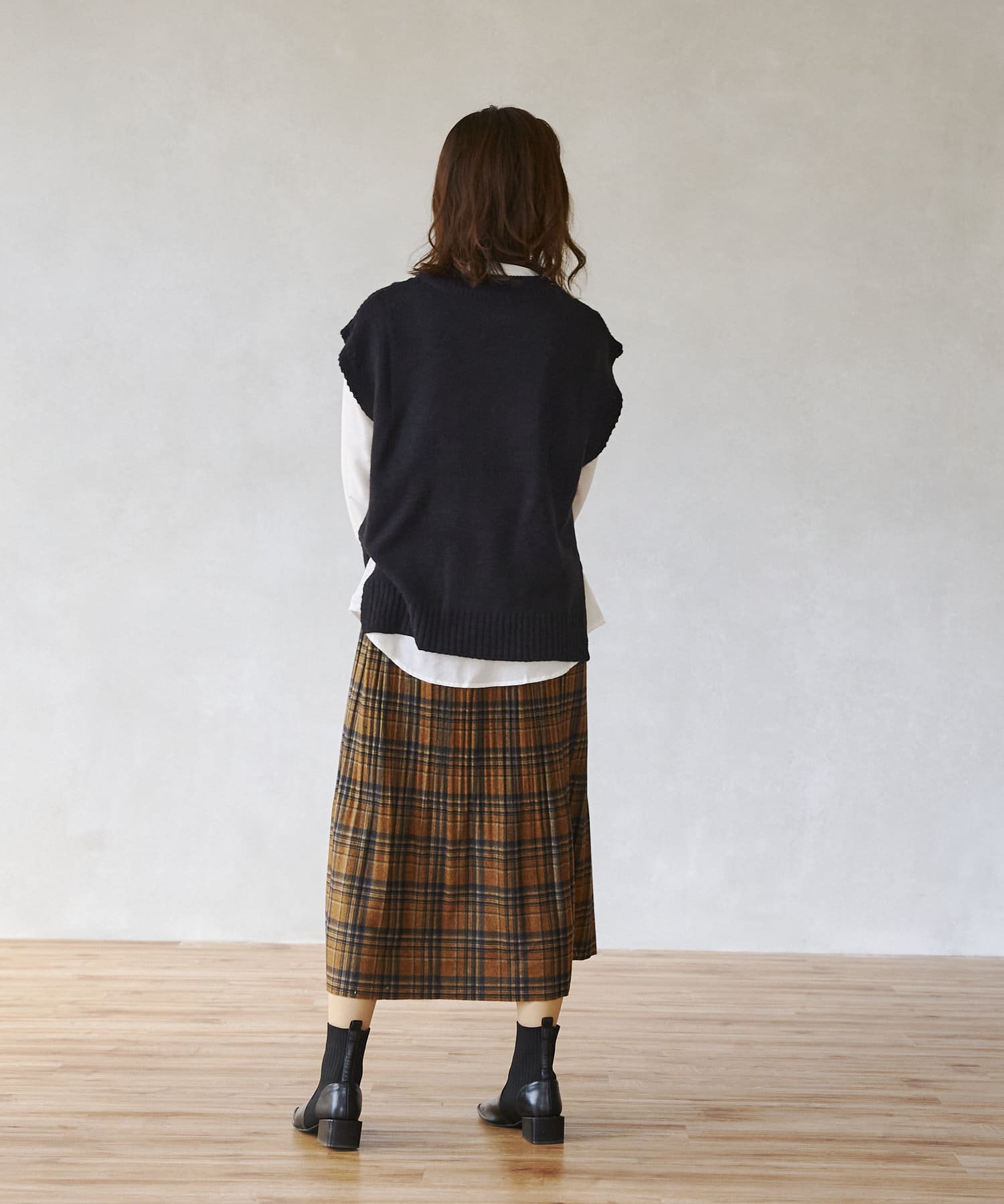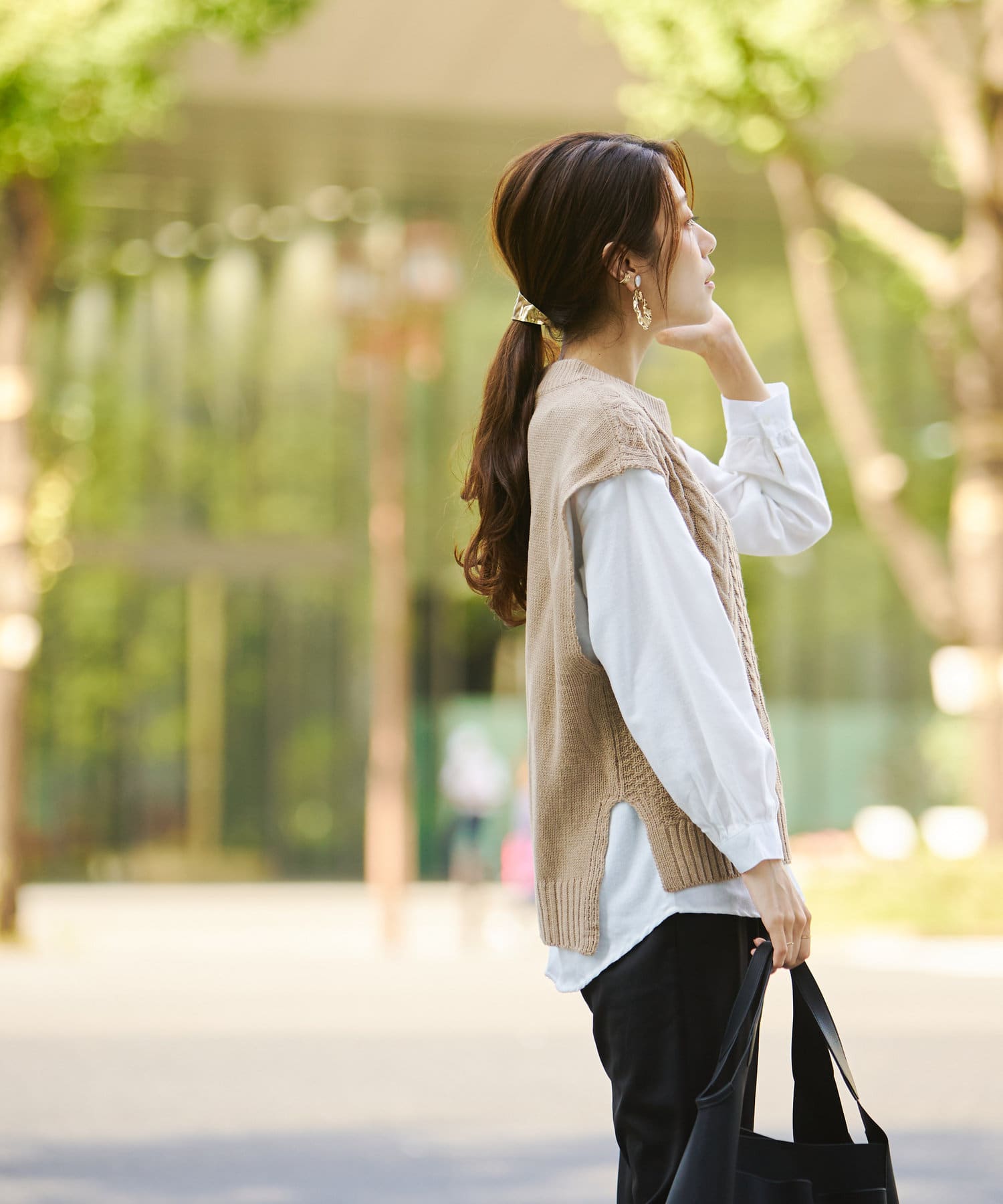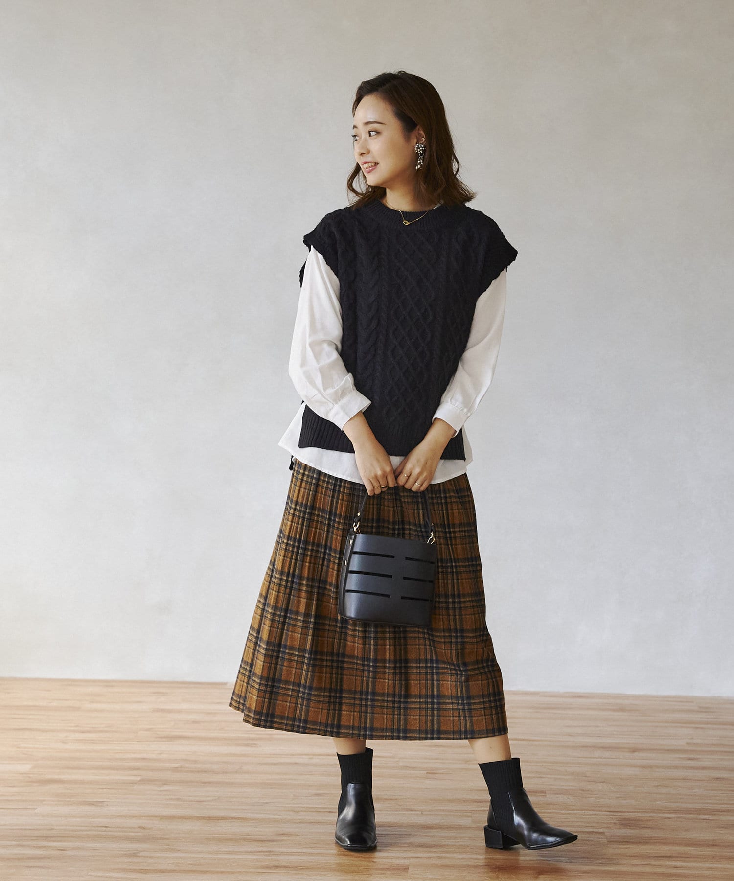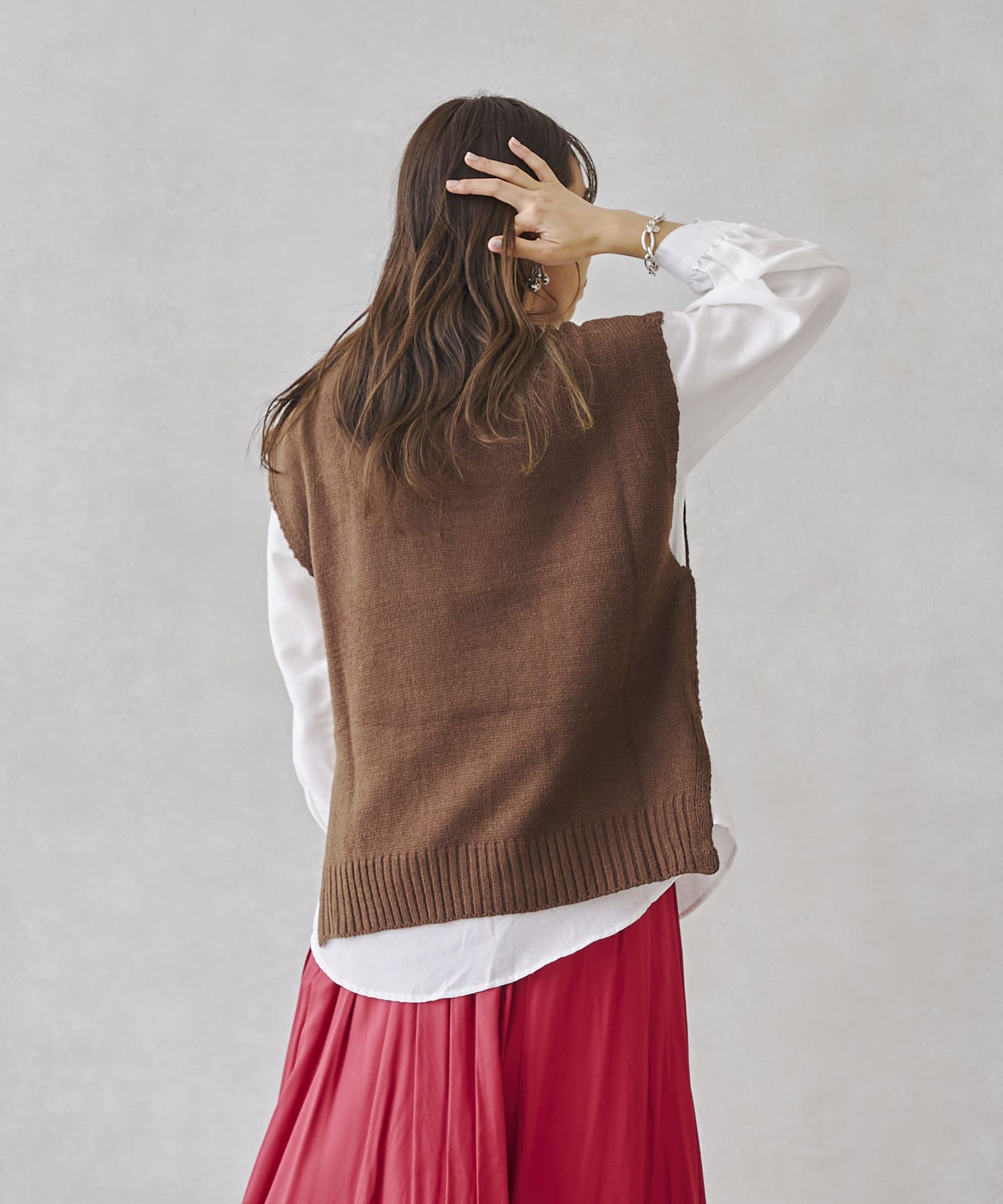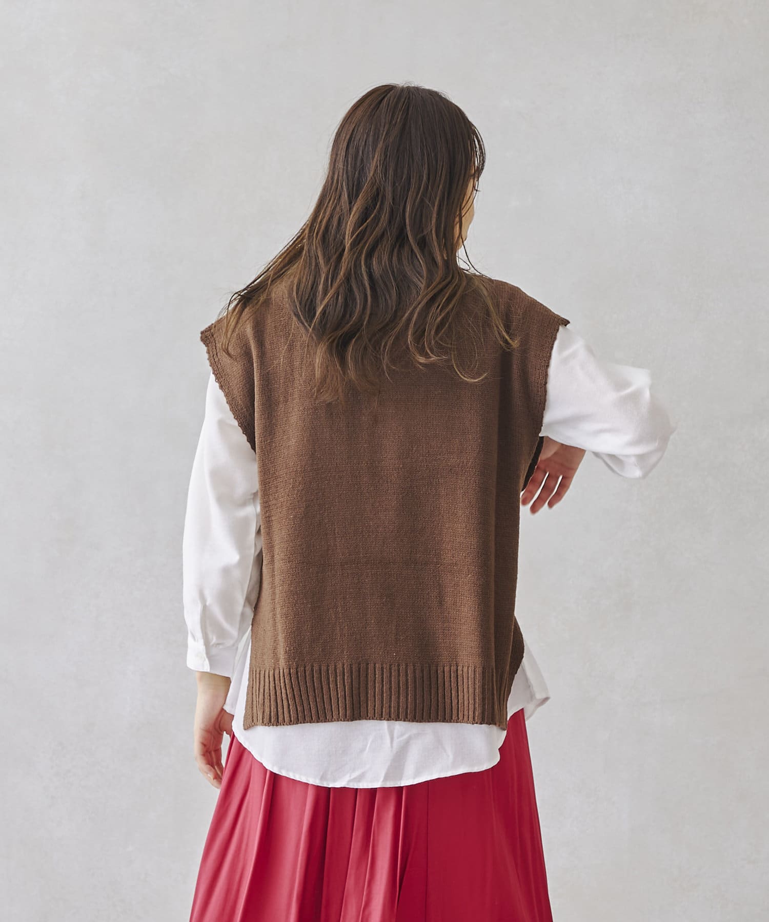 ケーブルニットベストとシャツのセットアイテム。着るだけでトレンドを押さえたコーデに。