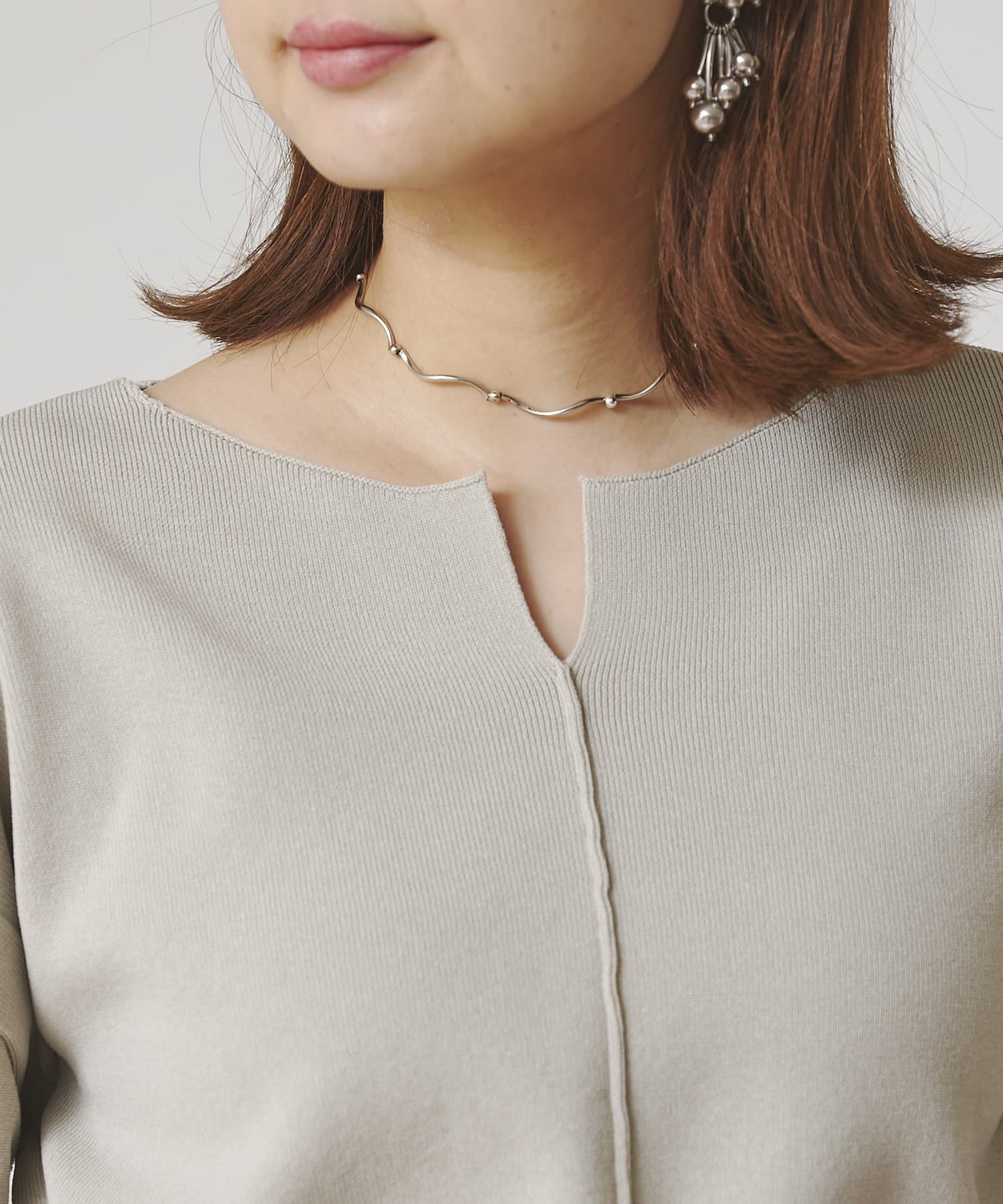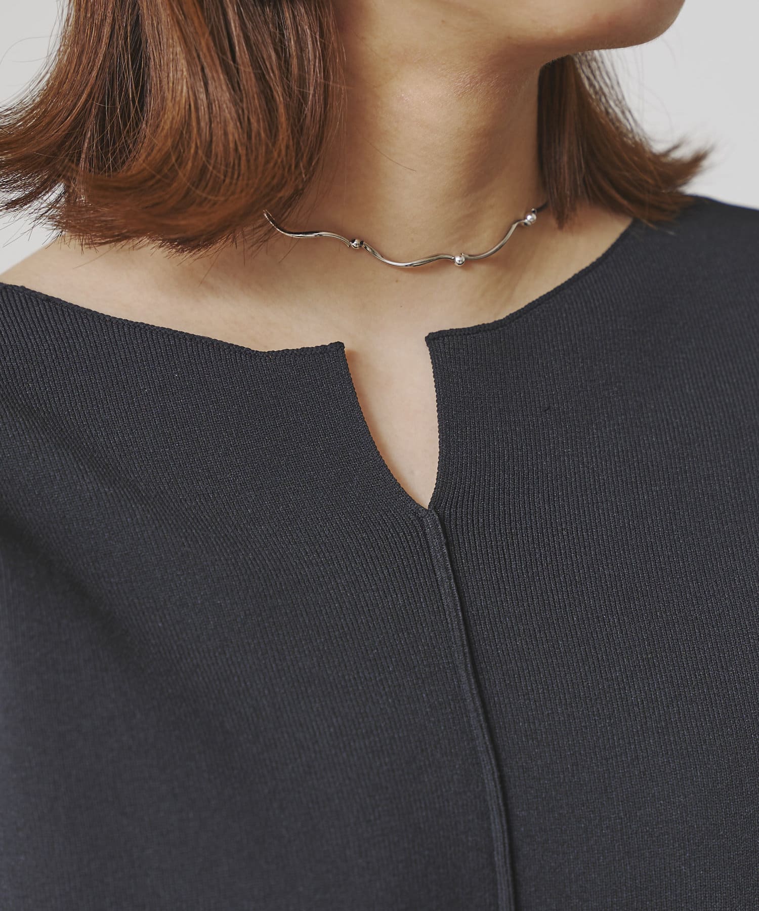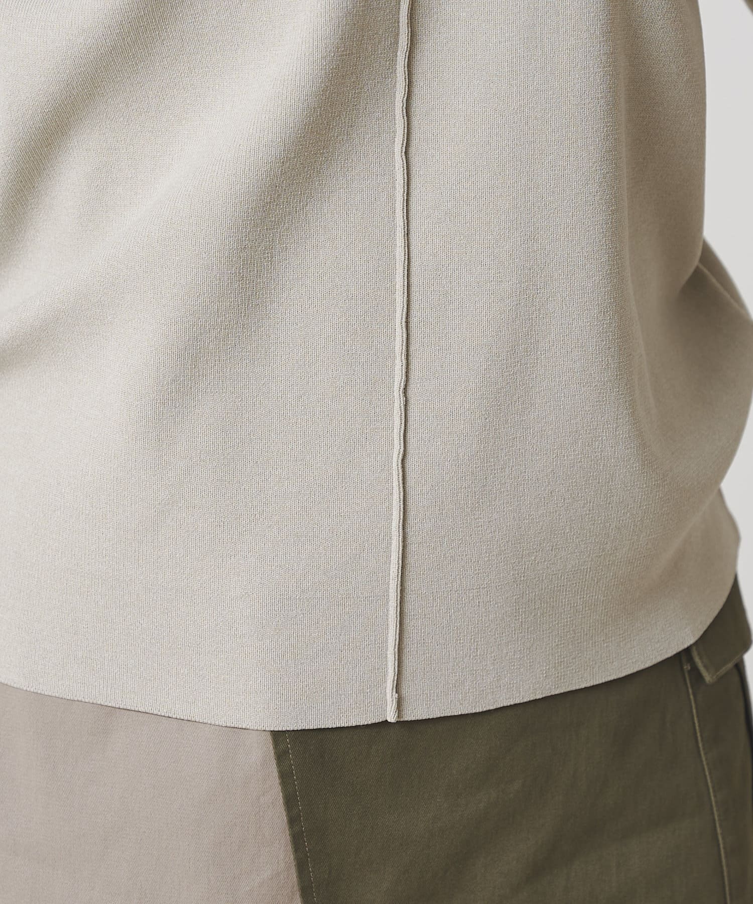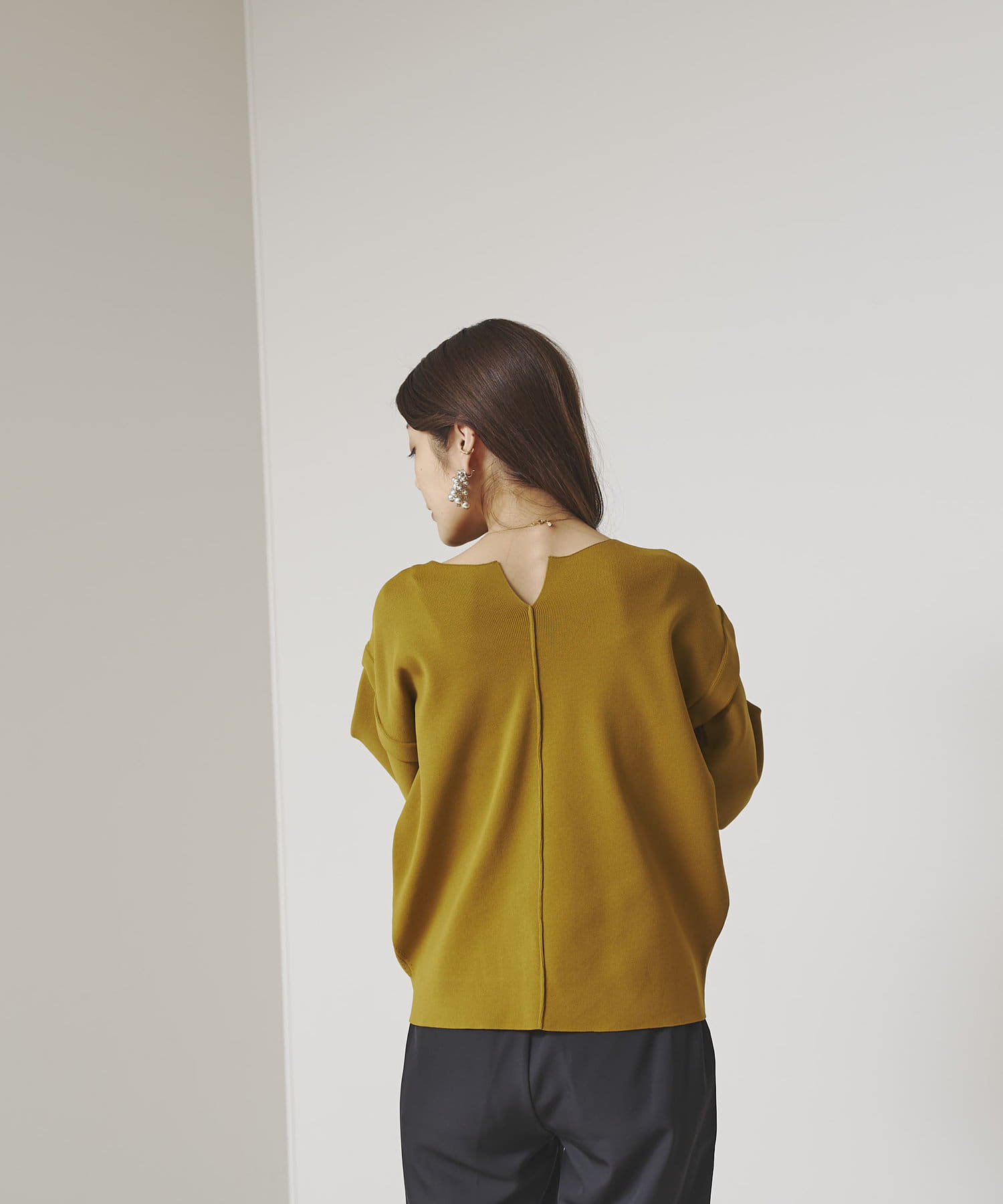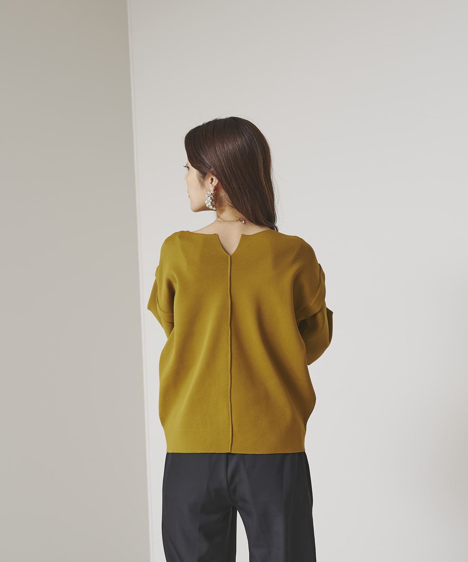 前後2WAYで着用できるデザイン。ショルダータックがシンプルながらポイントになるニット