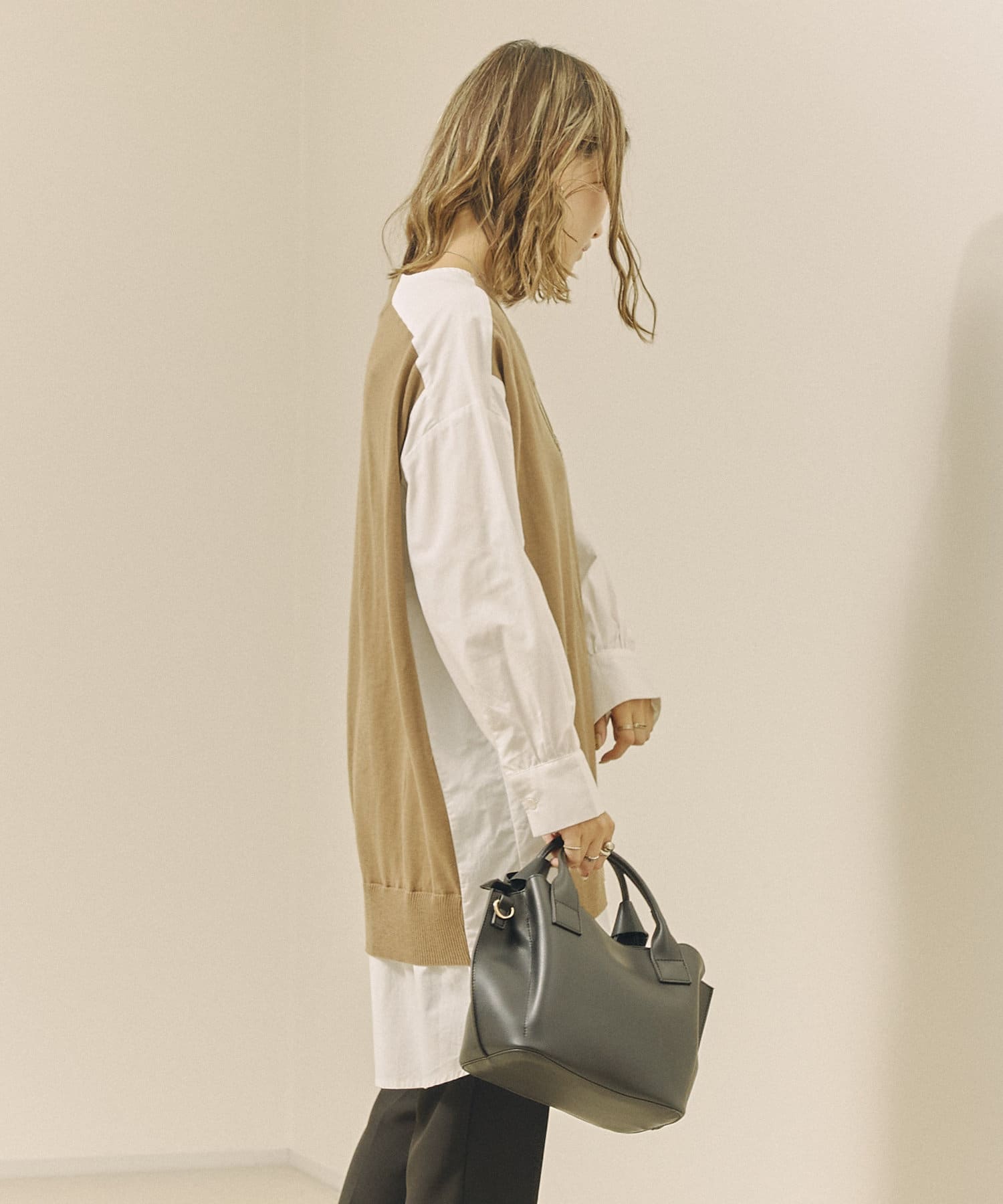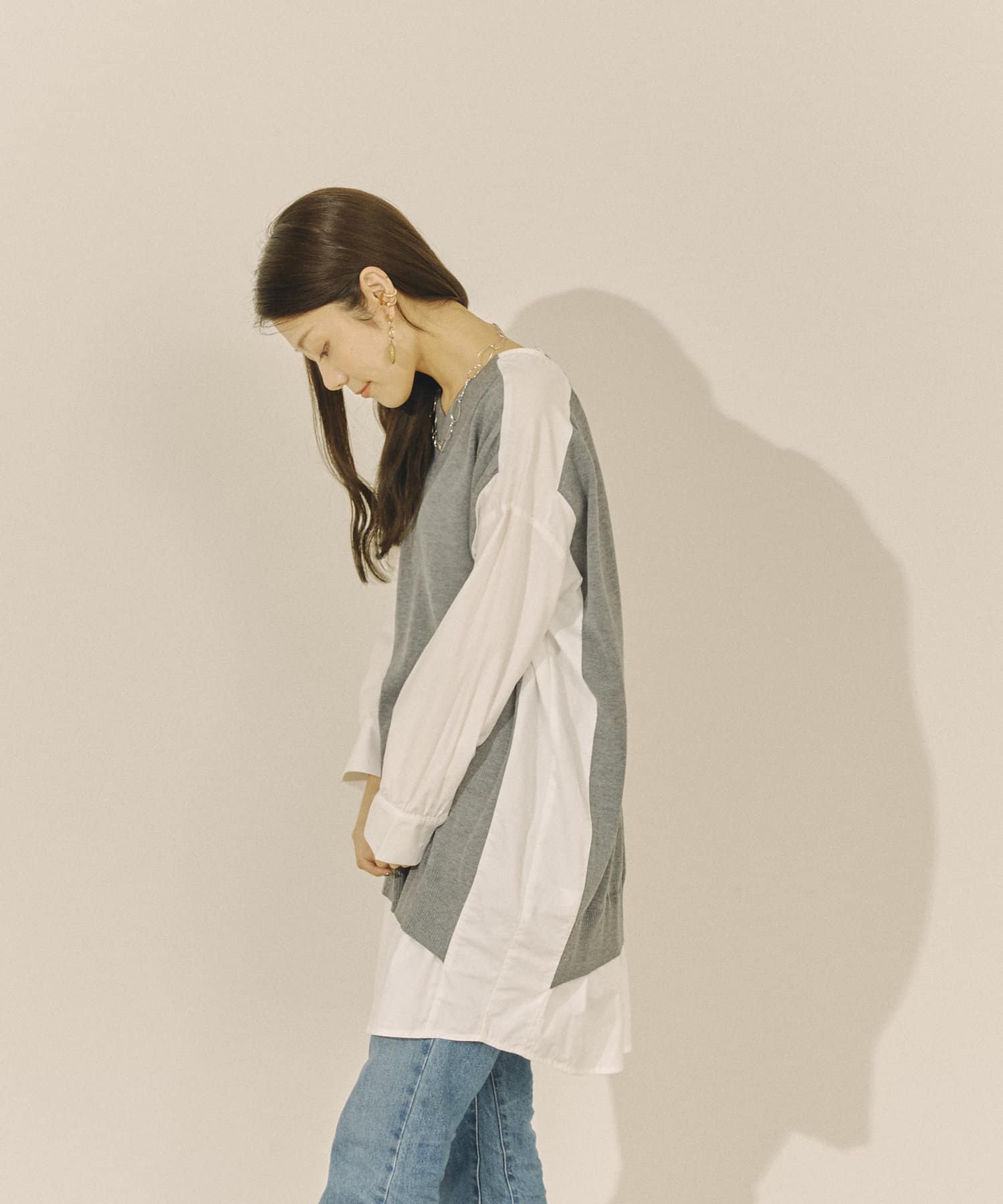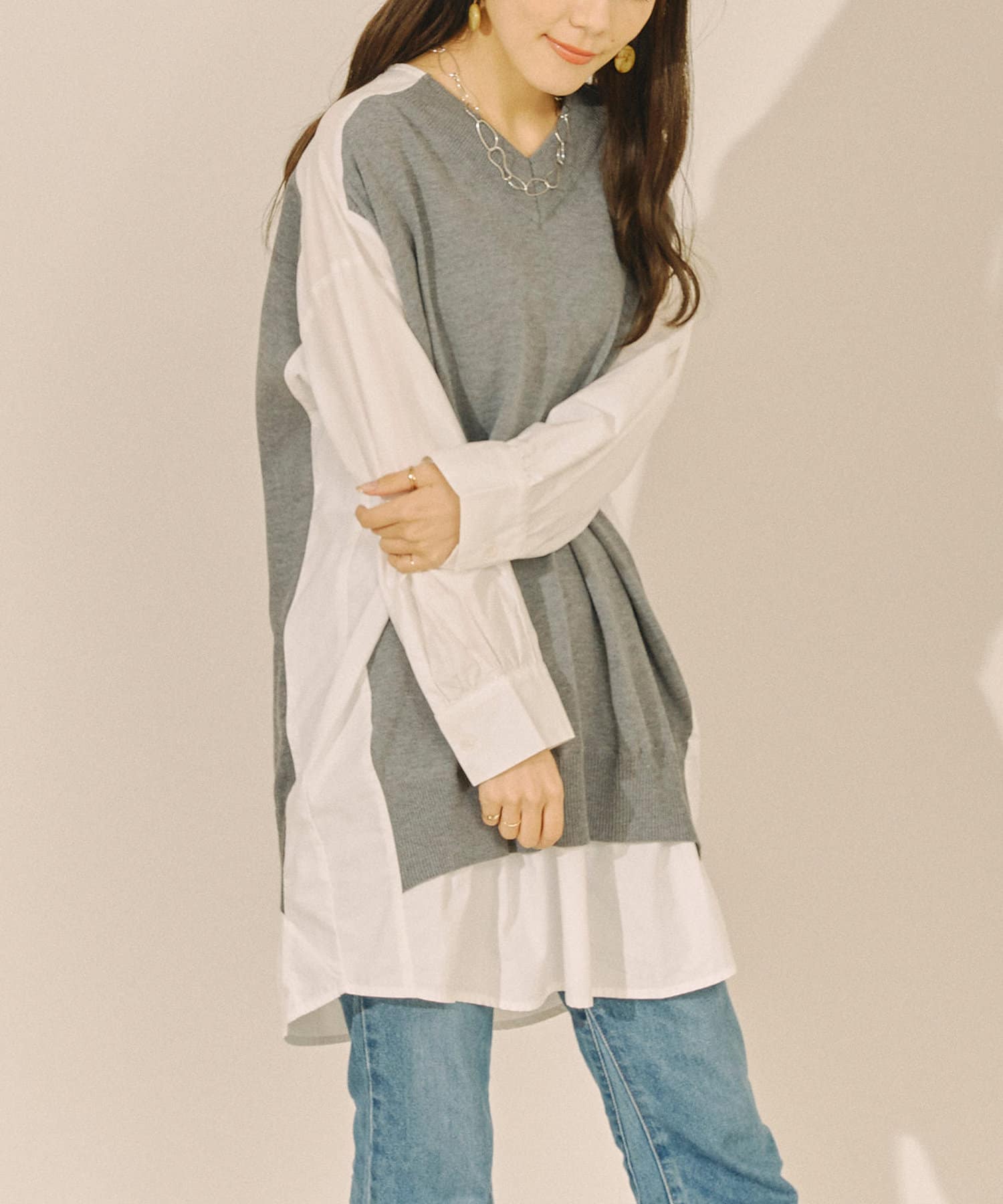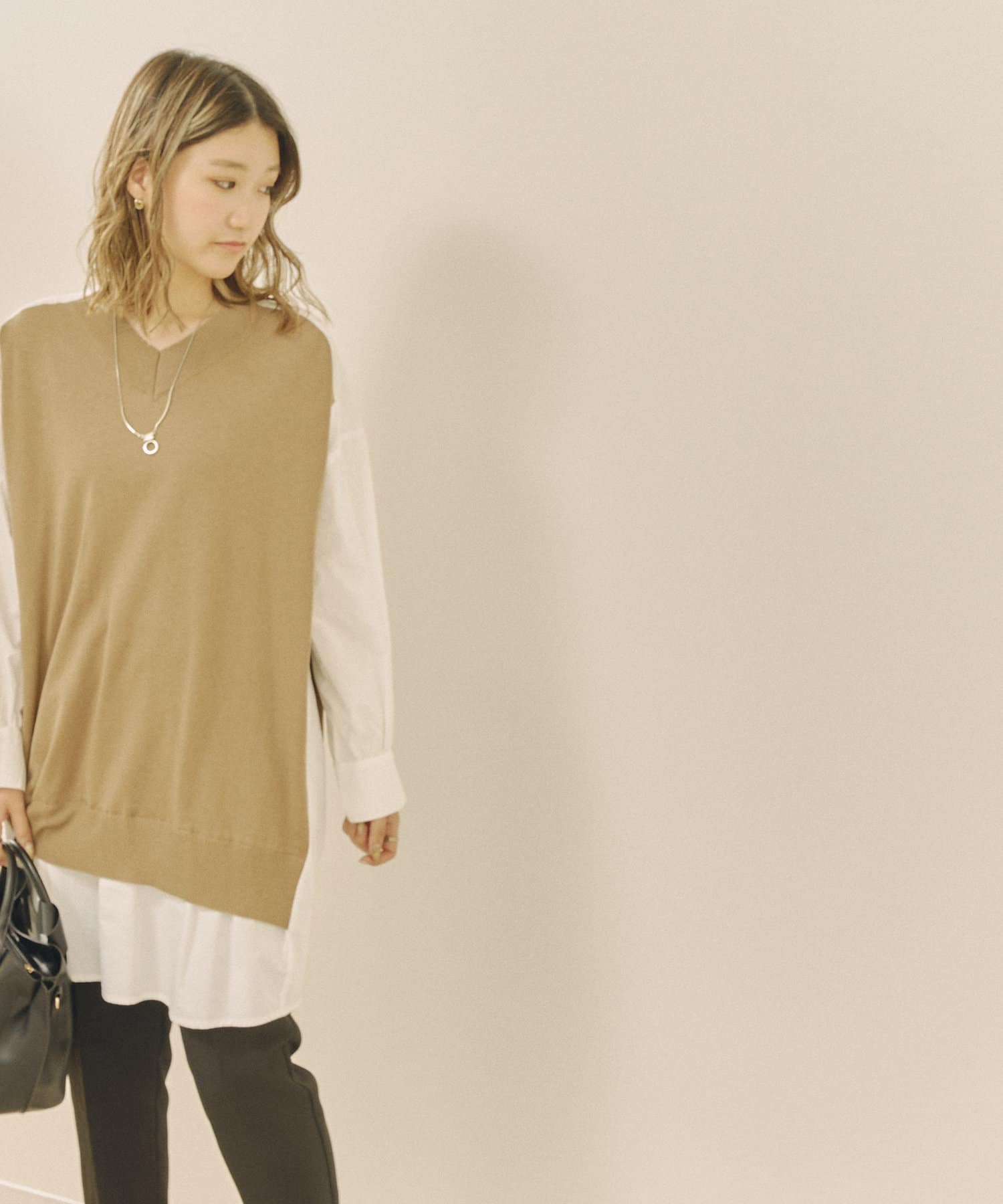 ・ニットとシャツをドッキングさせたデザインで着るだけでこなれた印象に。