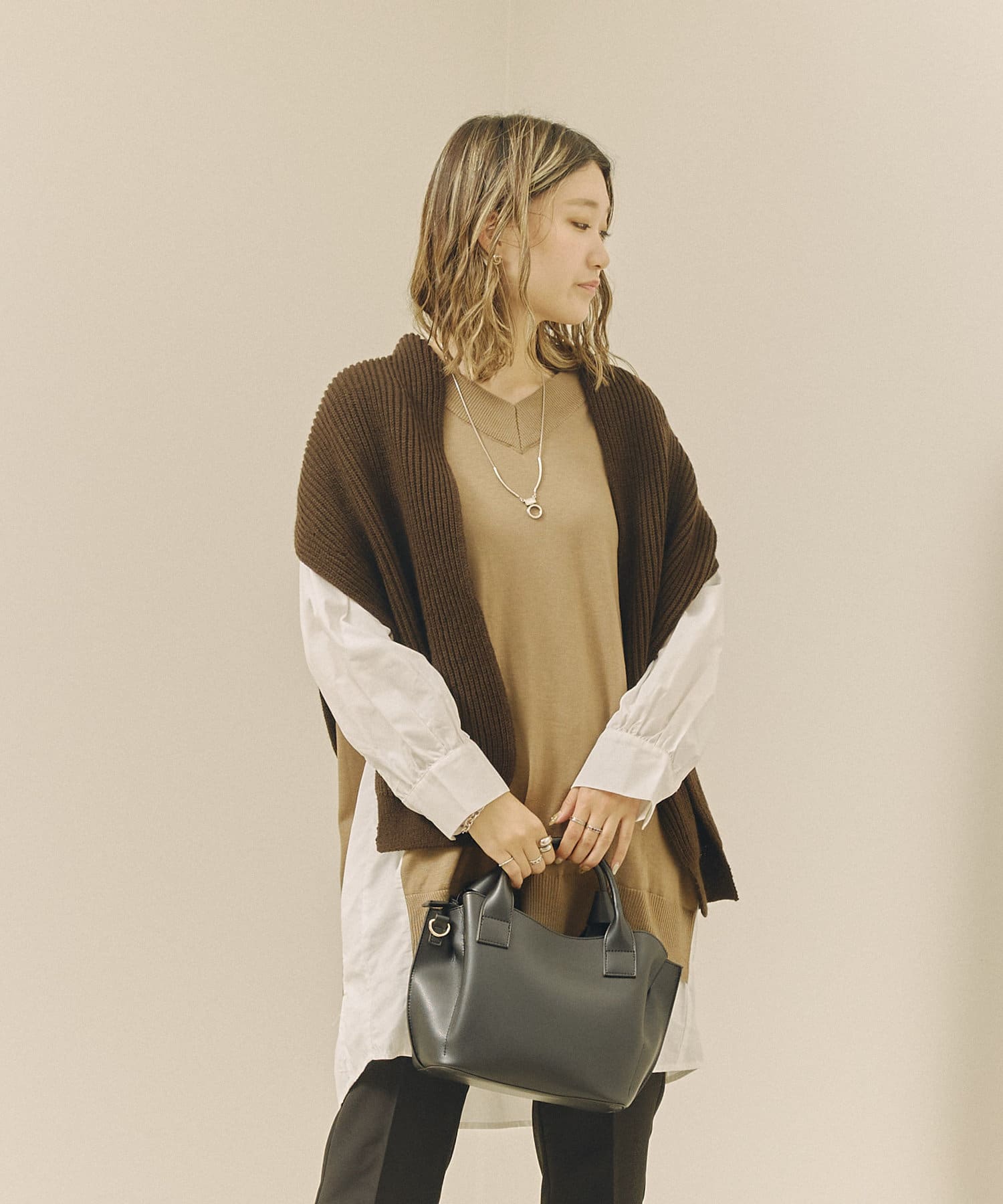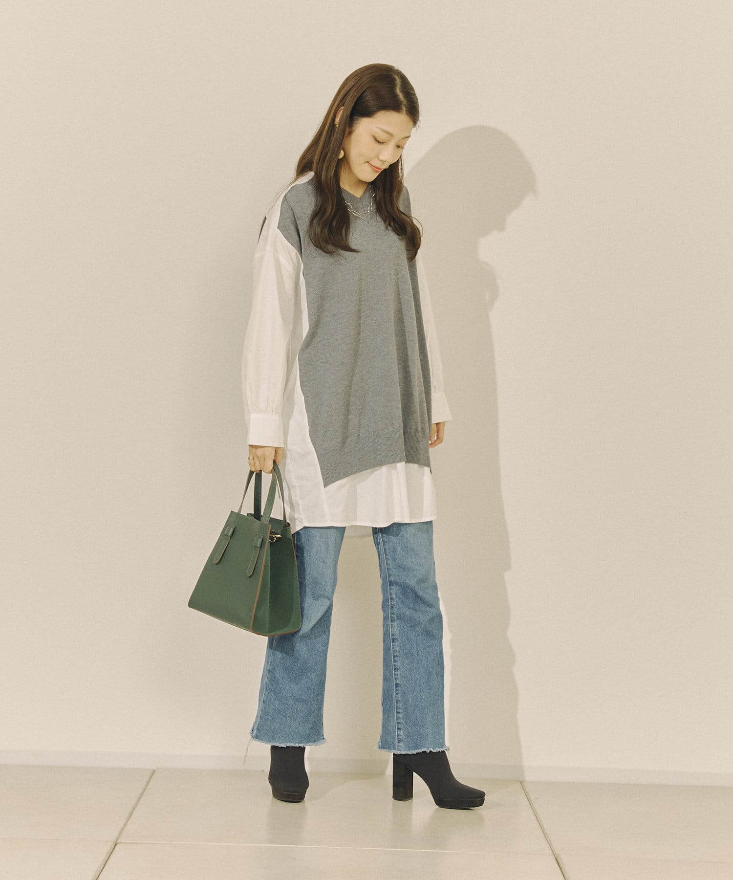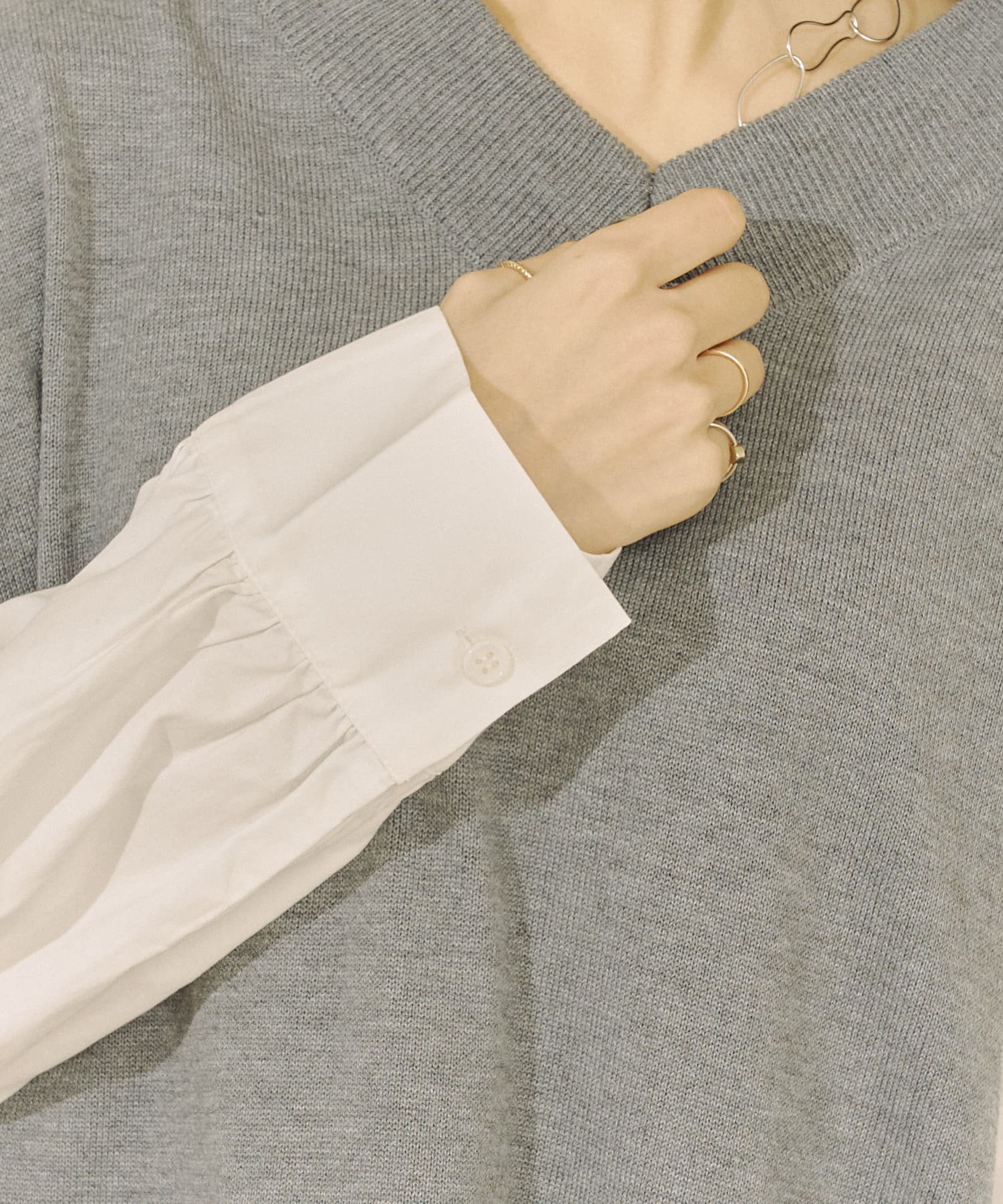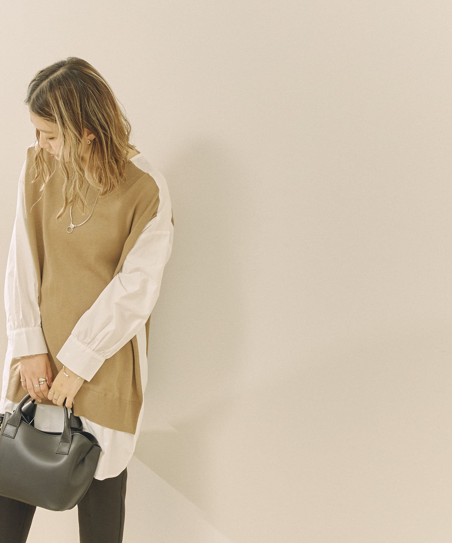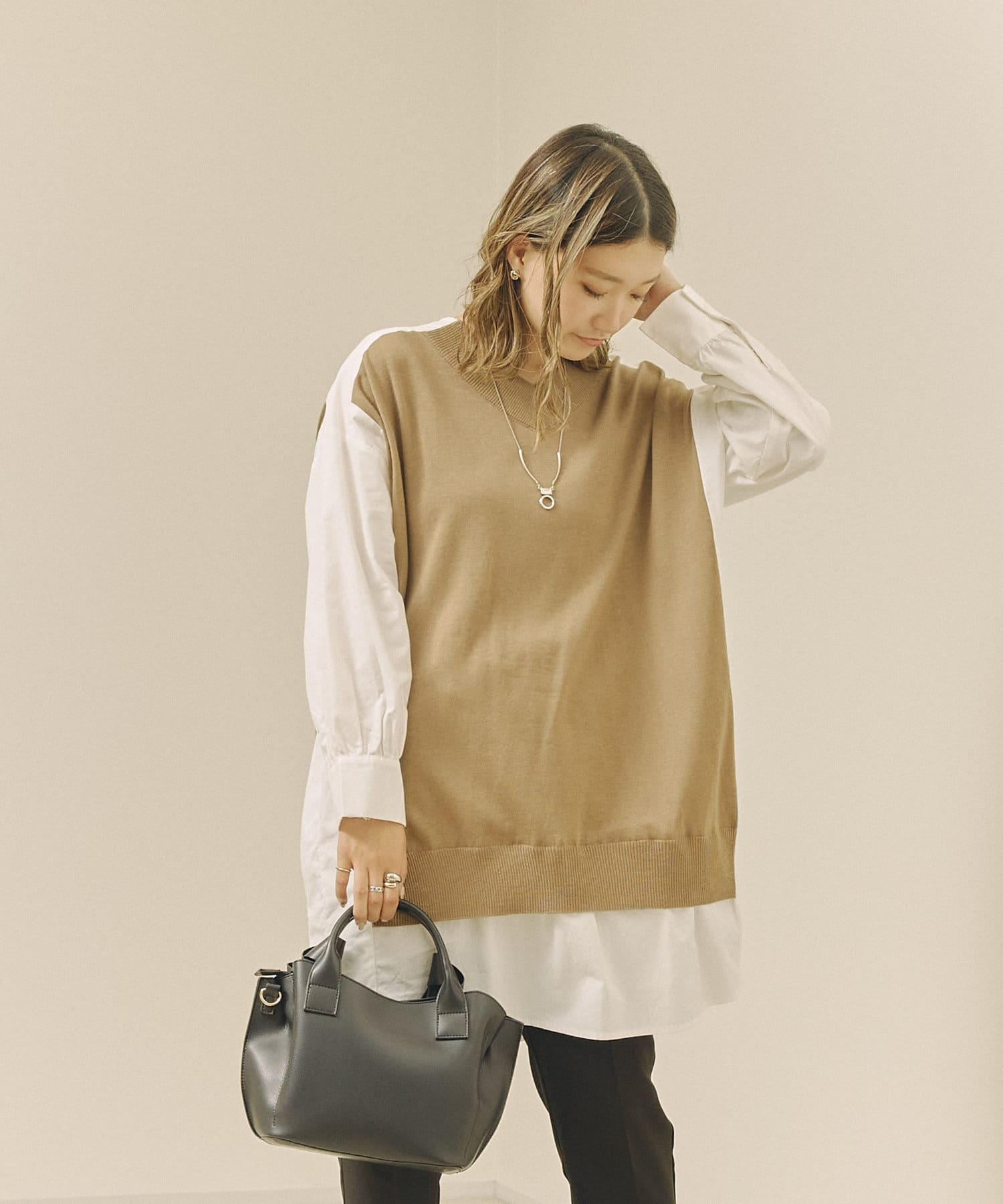 ・ニットとシャツをドッキングさせたデザインで着るだけでこなれた印象に。