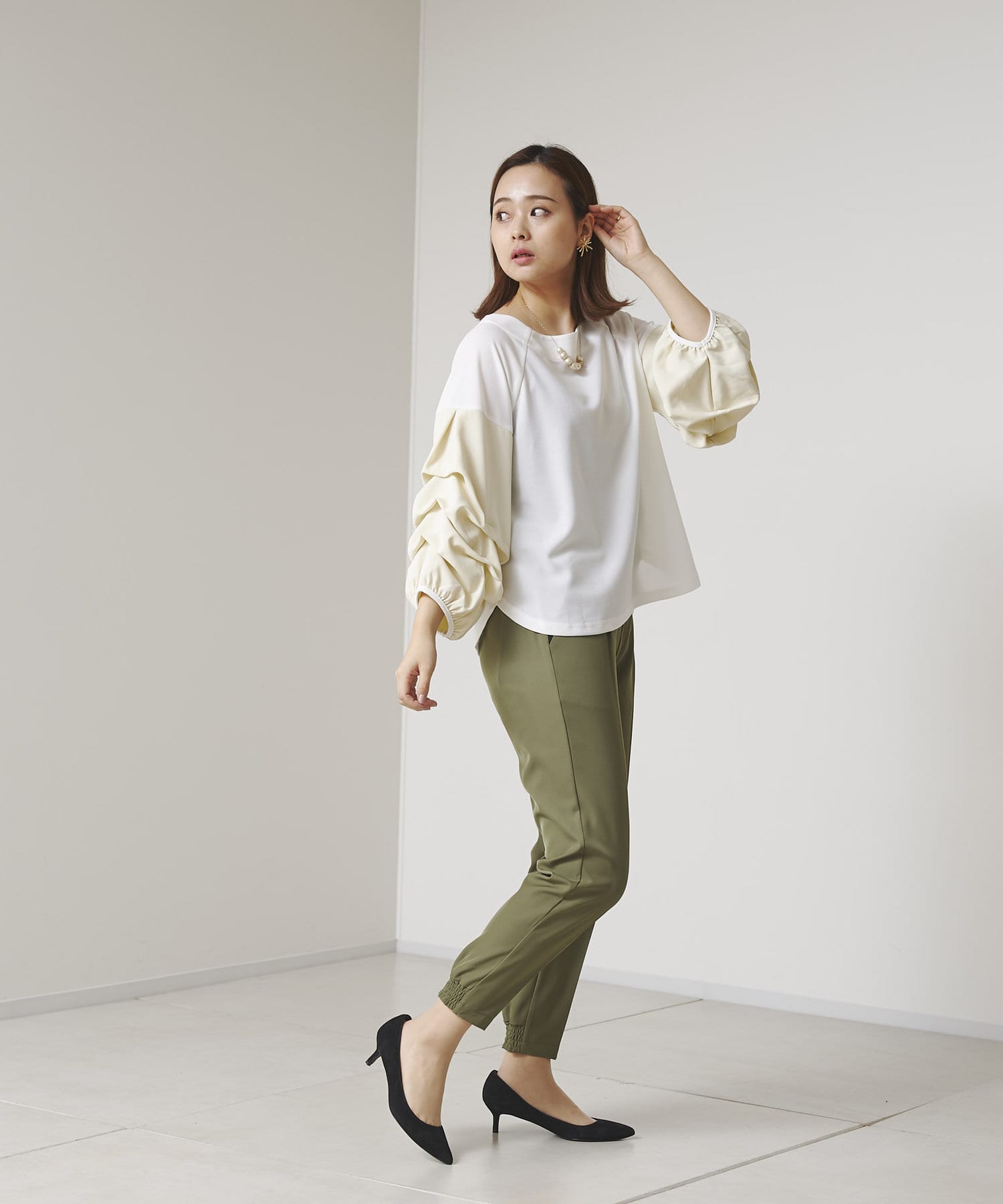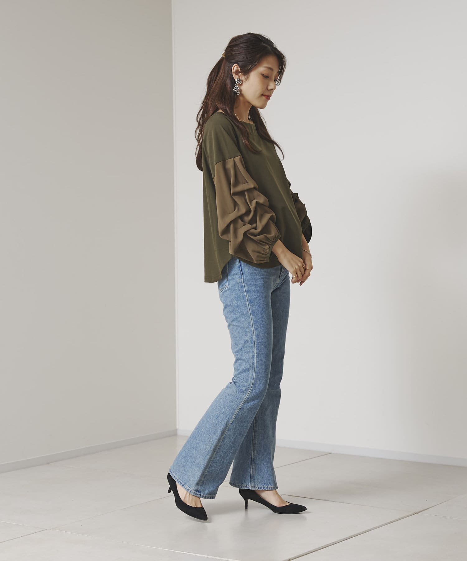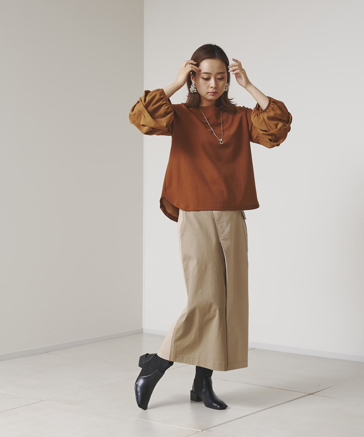 ・同系色の袖切替なので個性的になりすぎず、ボトムも選びません。