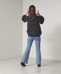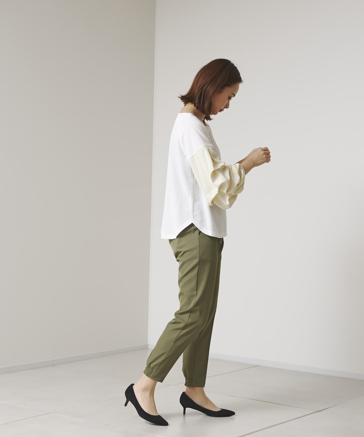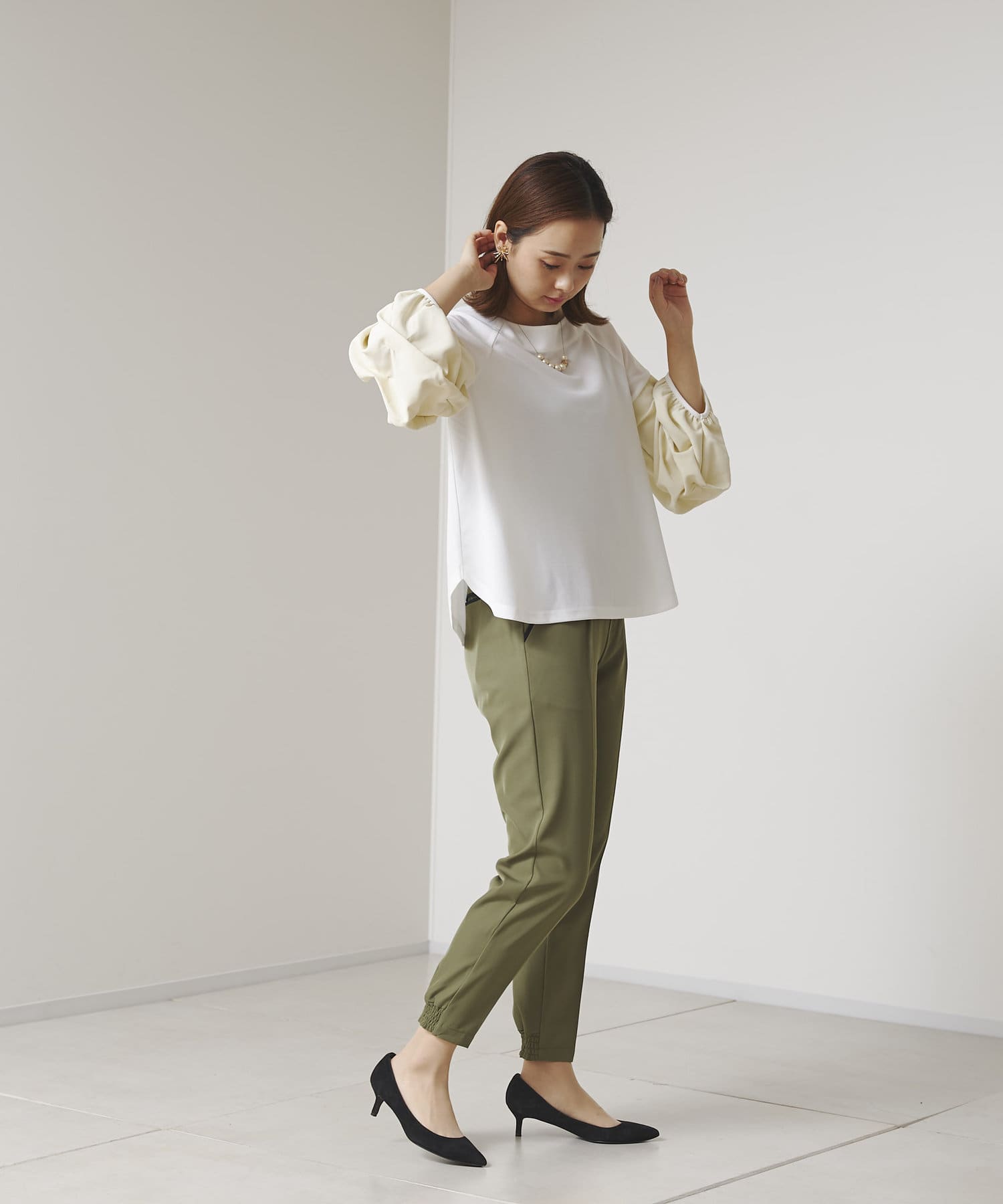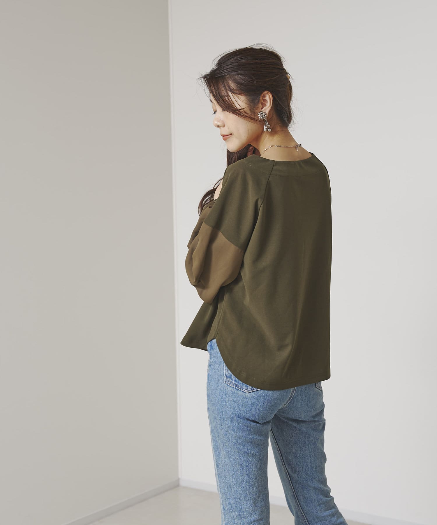 ・同系色の袖切替なので個性的になりすぎず、ボトムも選びません。