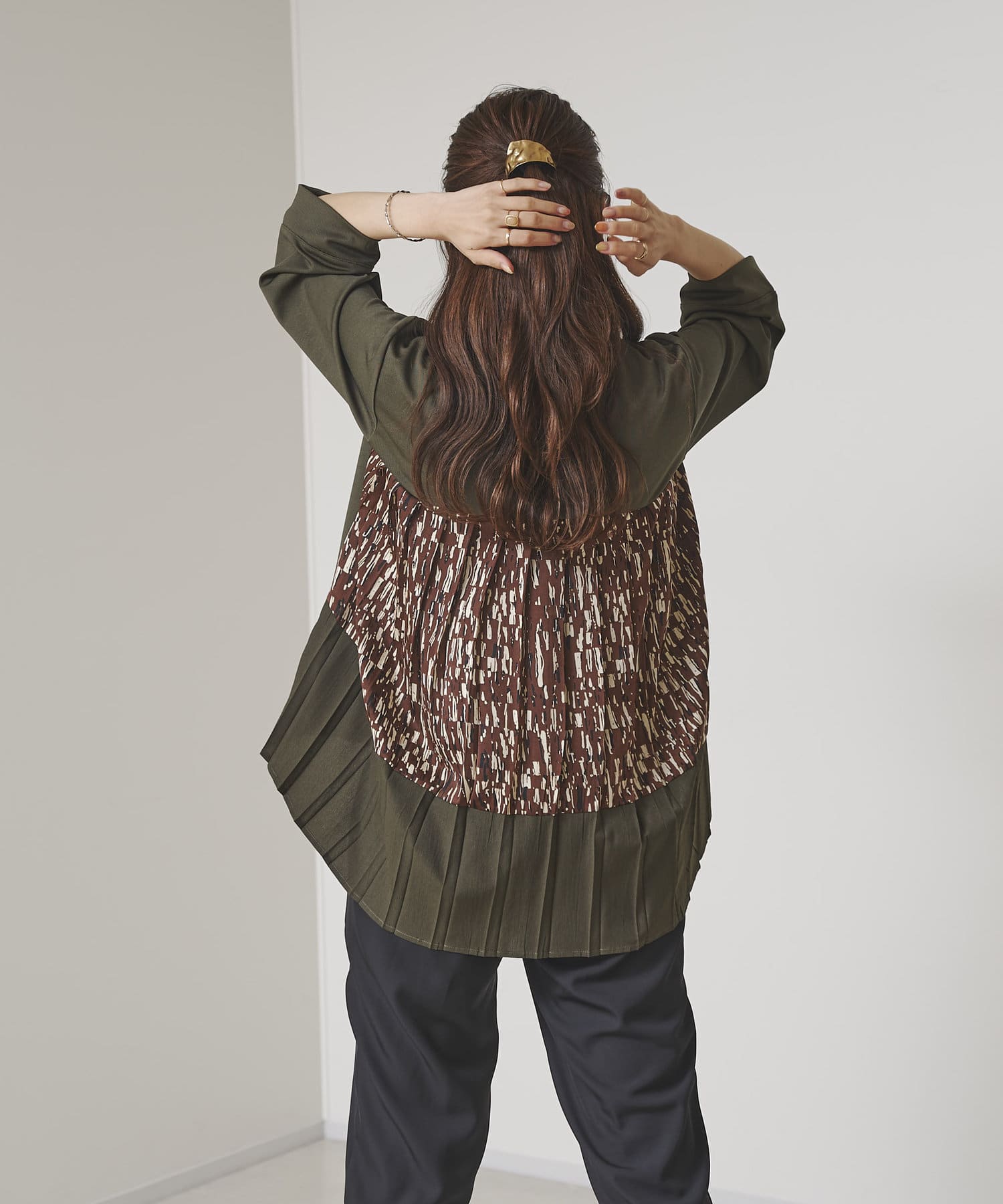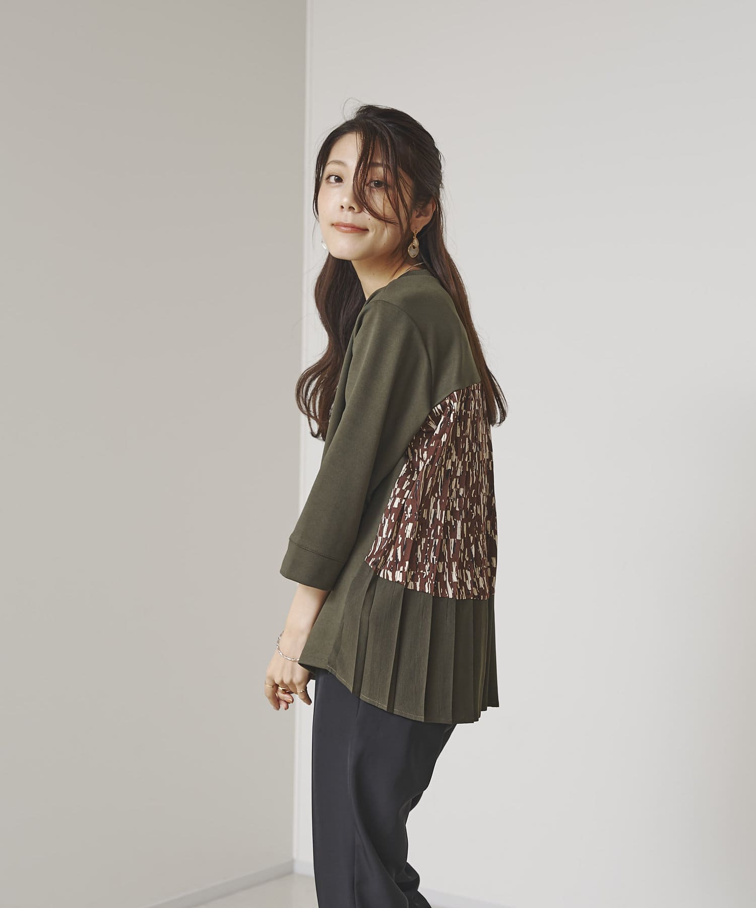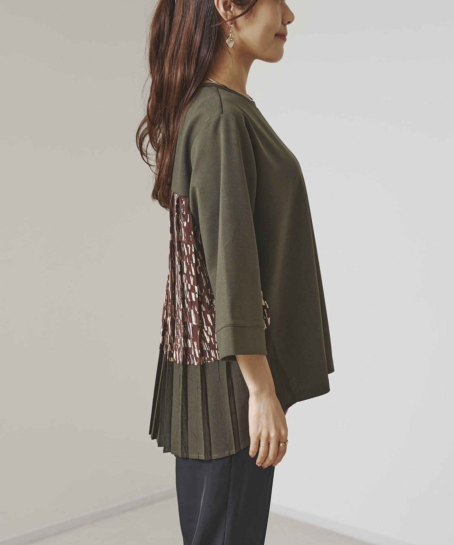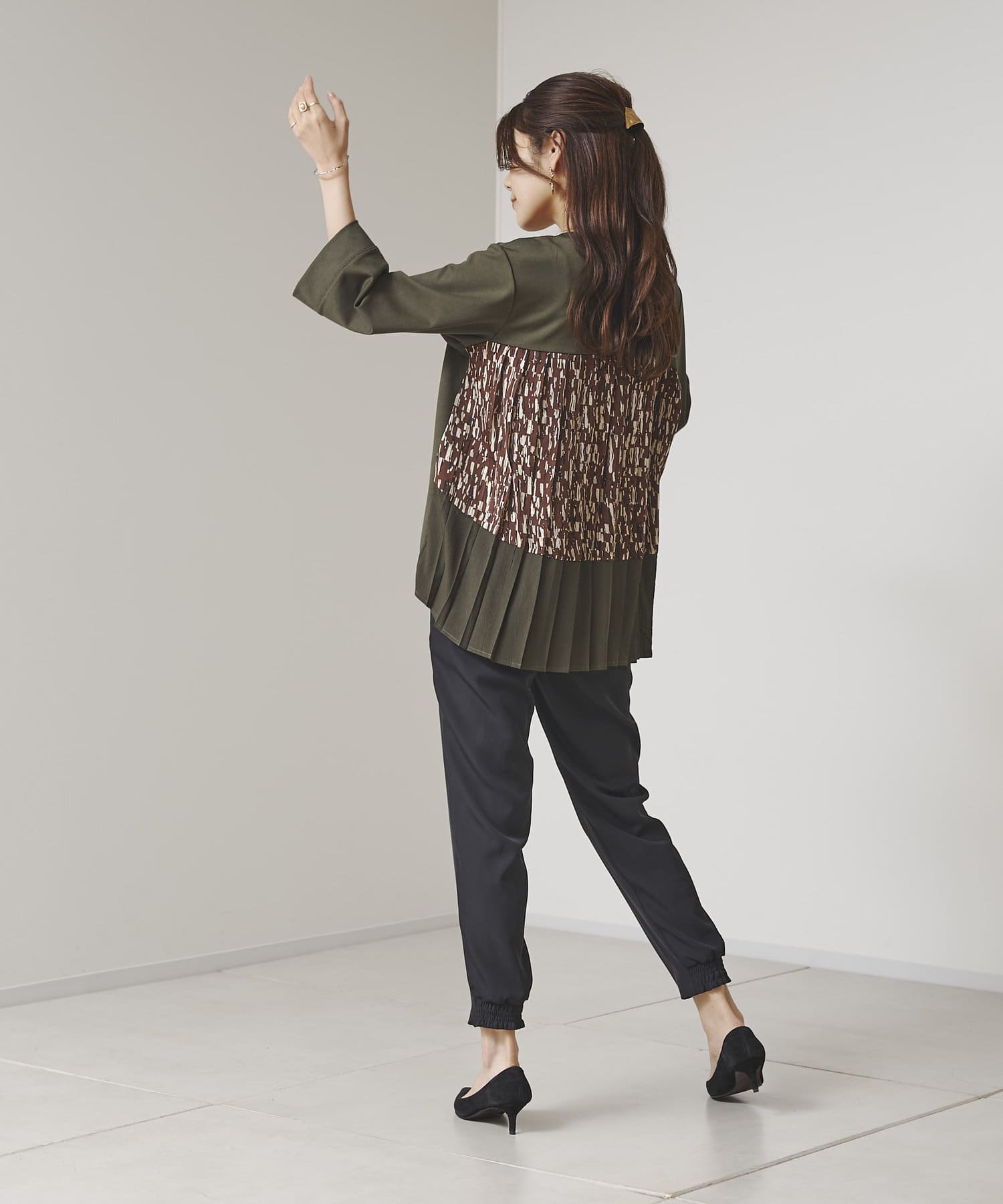 後ろに施されたプリーツデザインが動くたびに揺れて上品な印象に。