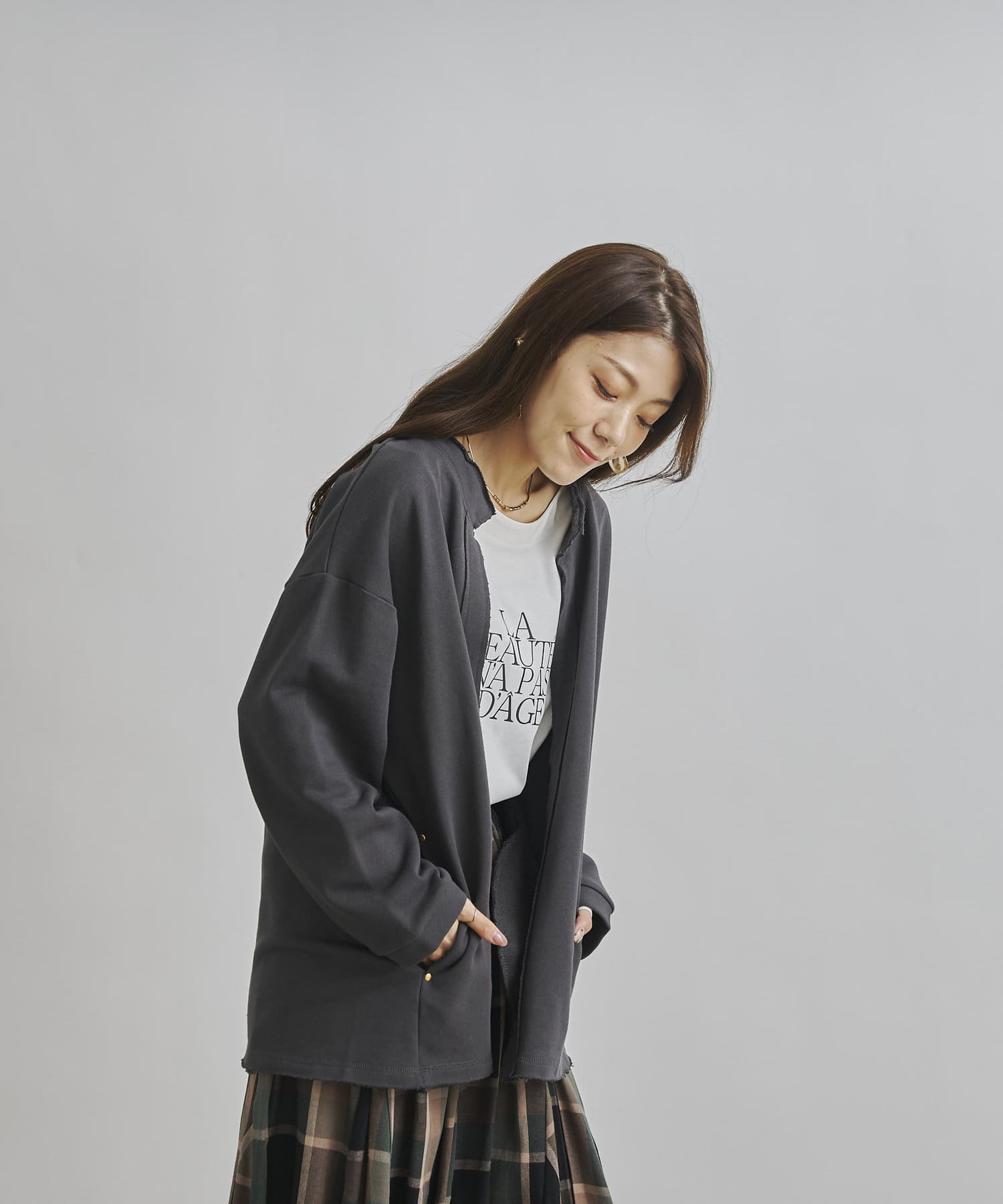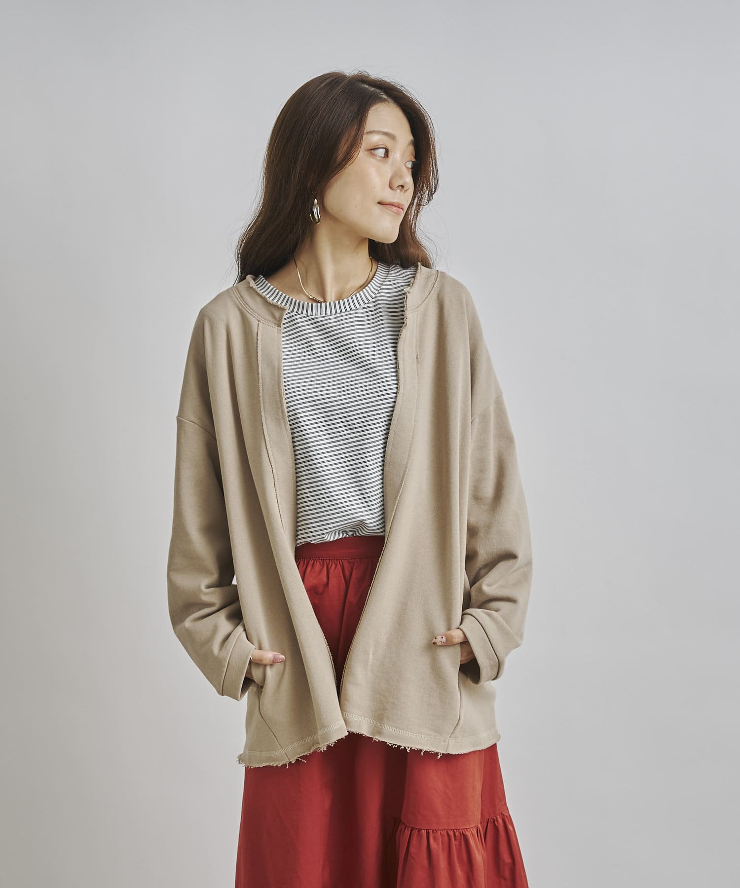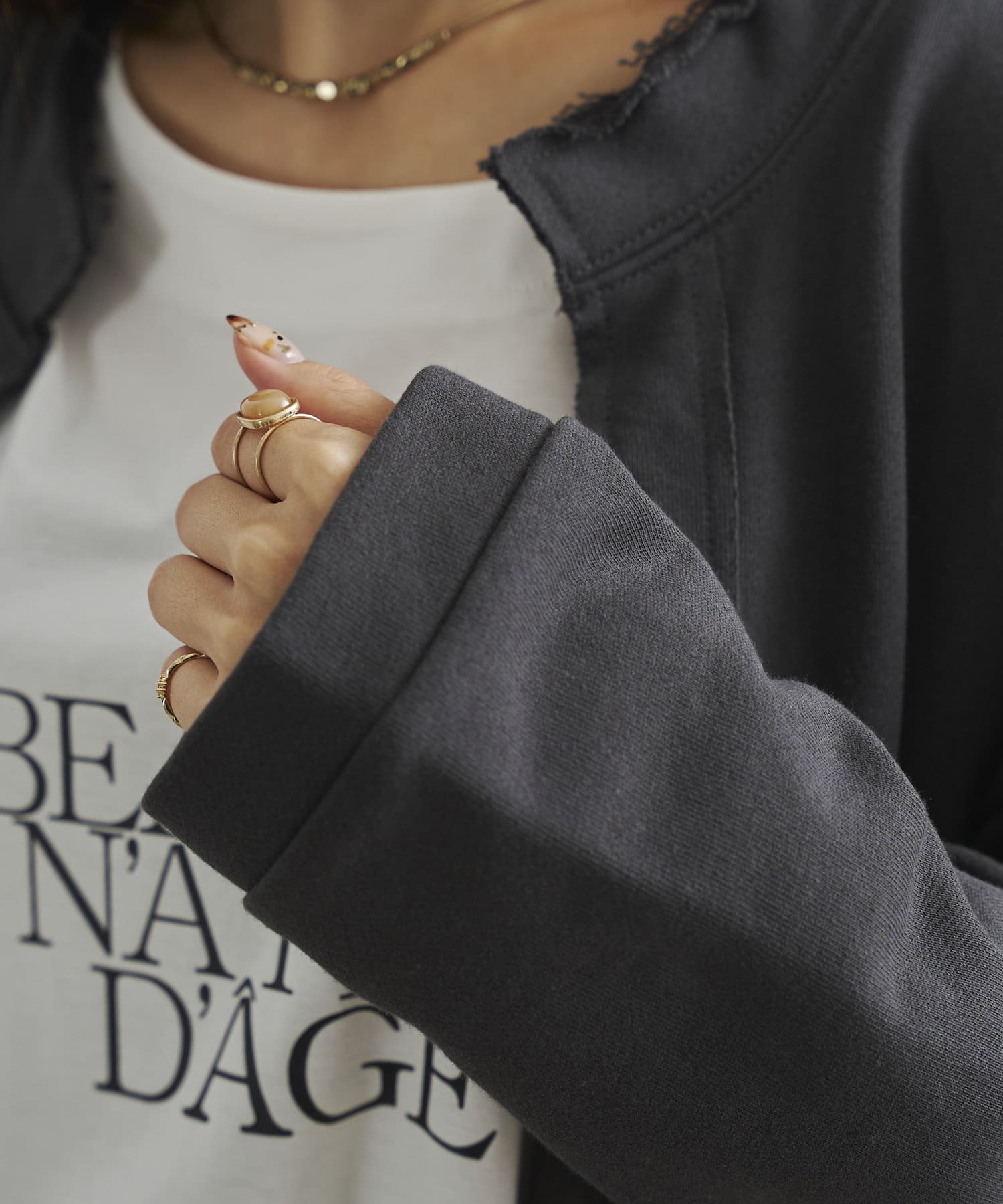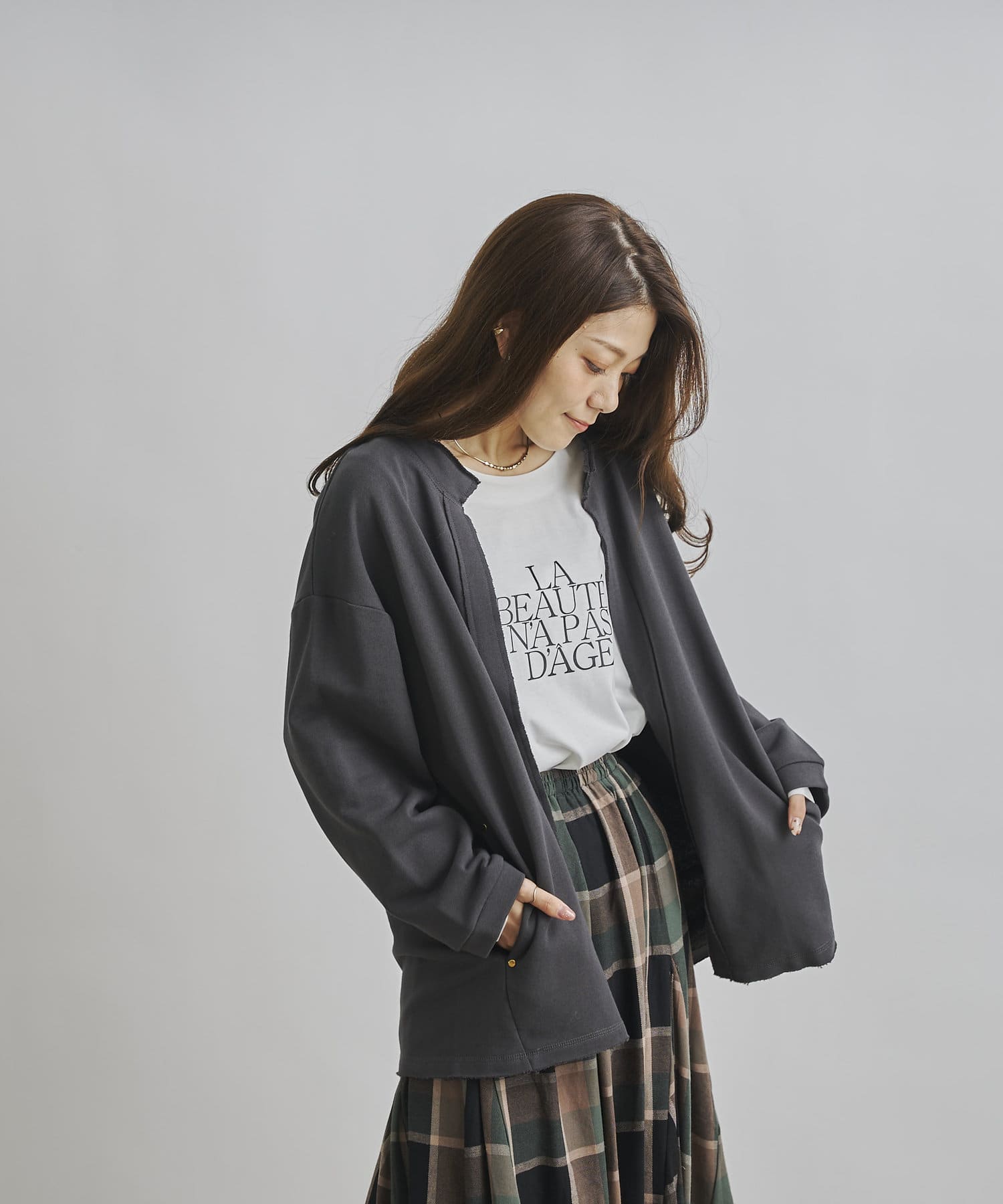 ノーカラーで首元もスッキリ見えるデザイン。カットオフの切りっぱなし風がポイントの