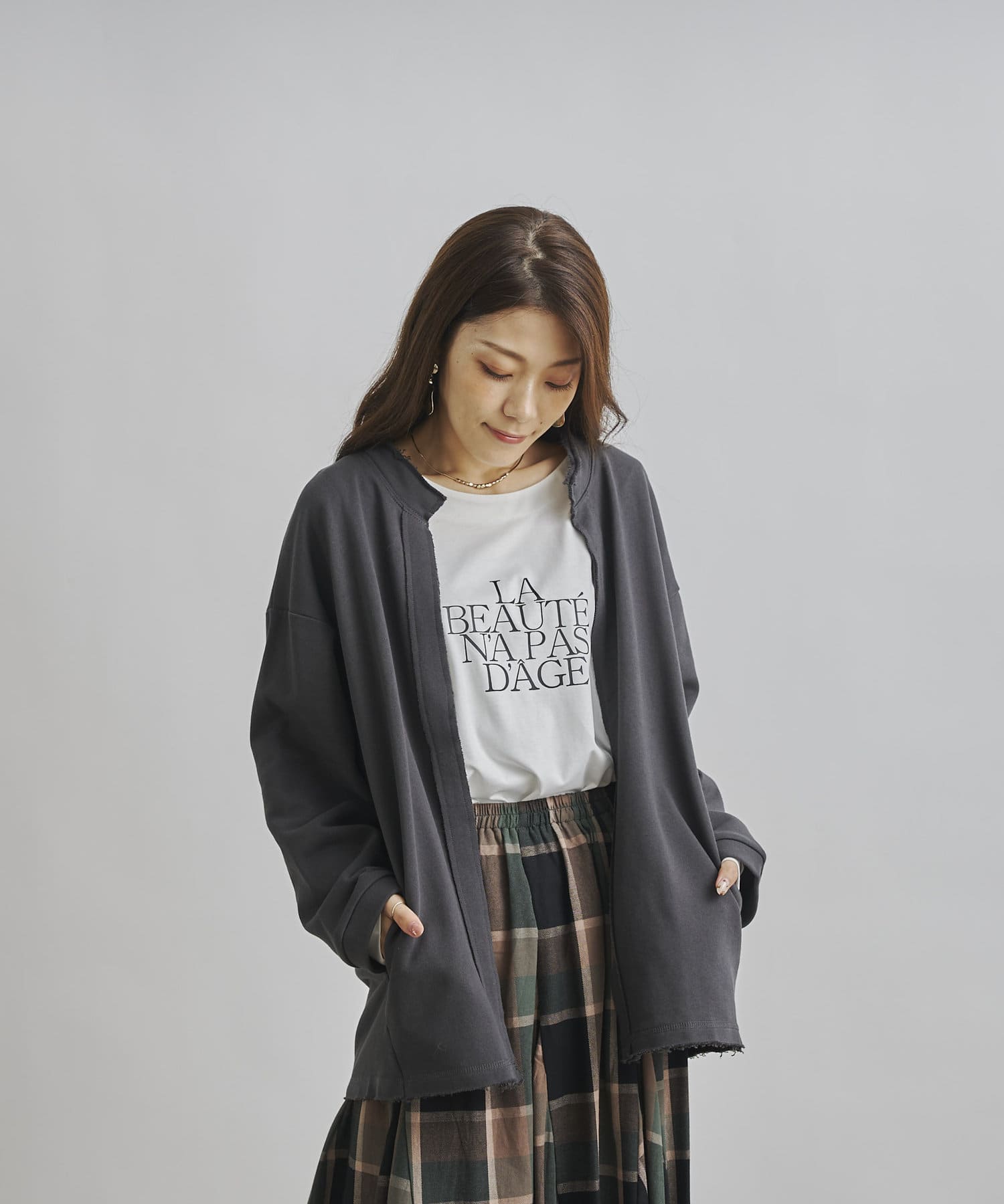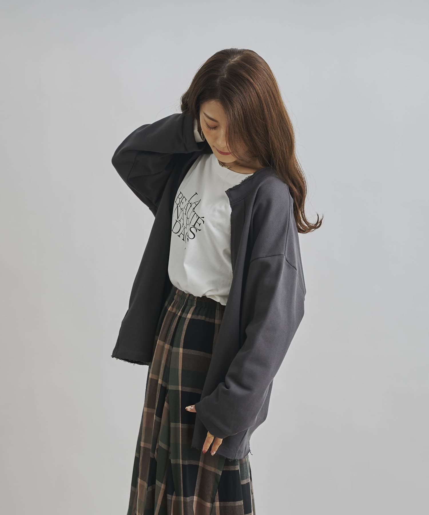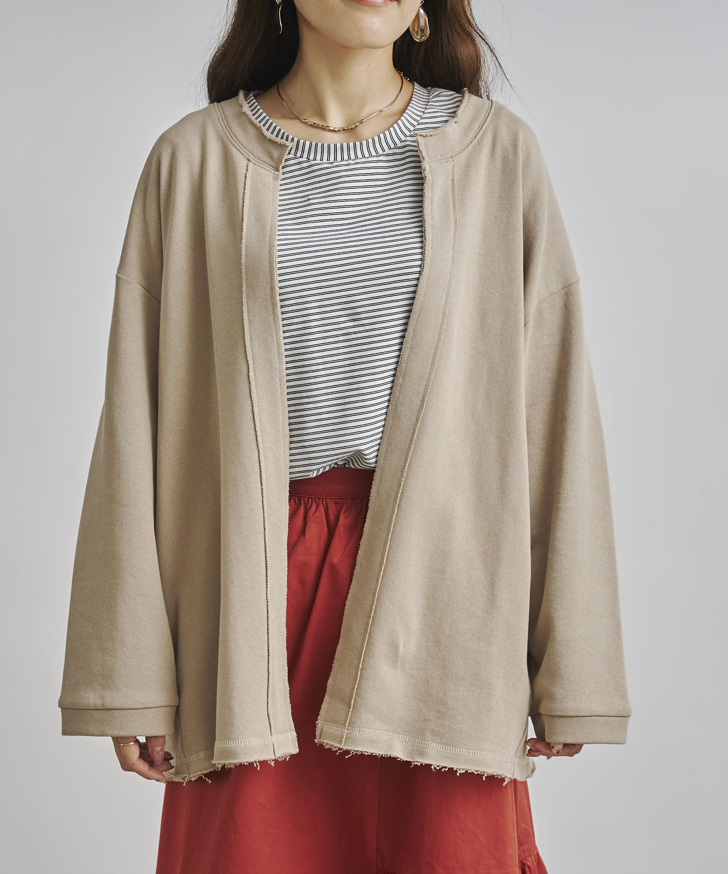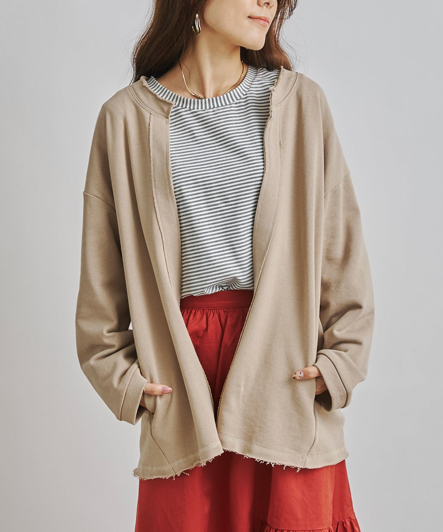 ノーカラーで首元もスッキリ見えるデザイン。カットオフの切りっぱなし風がポイントの