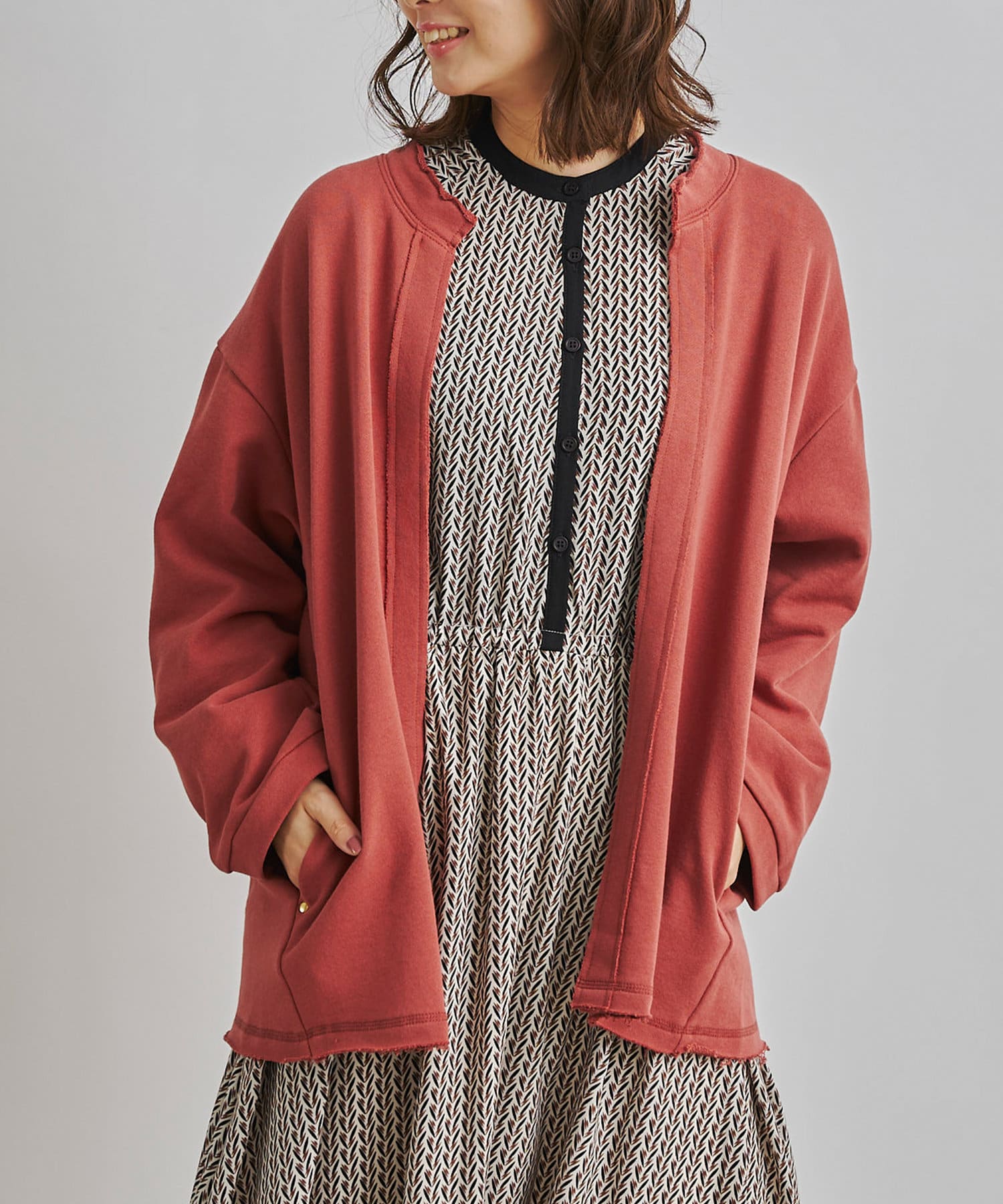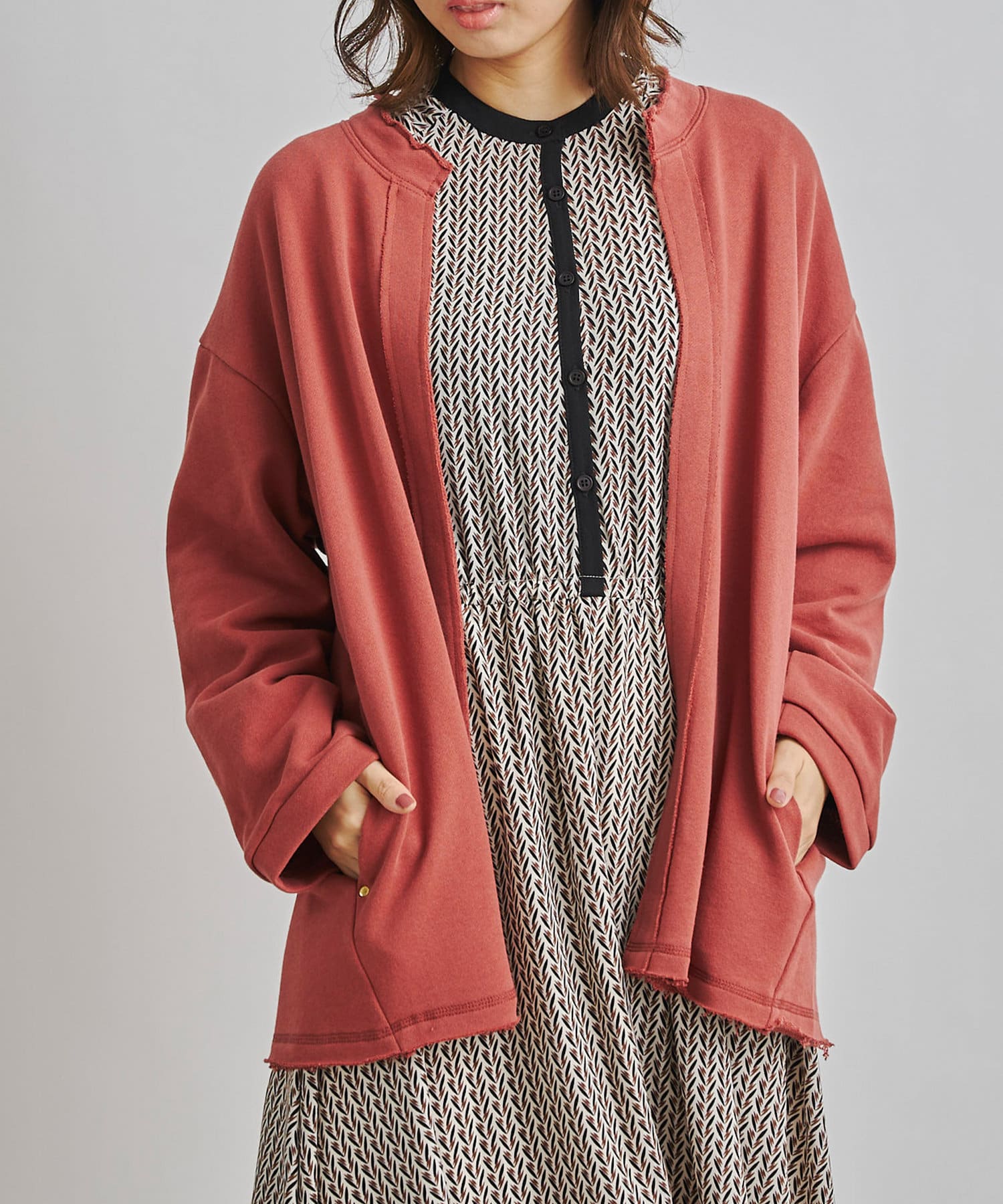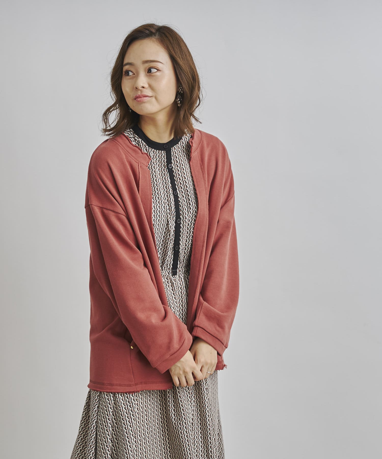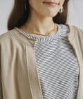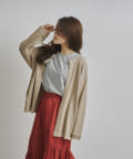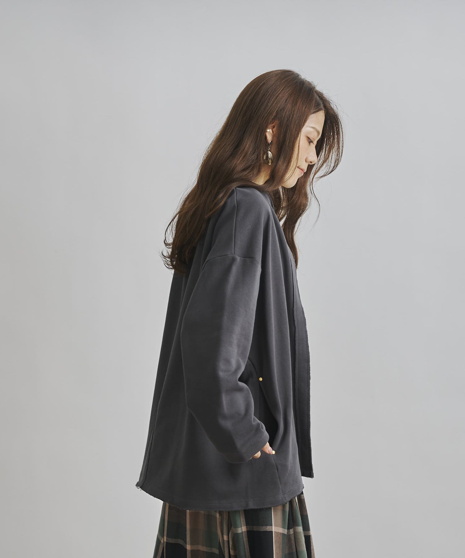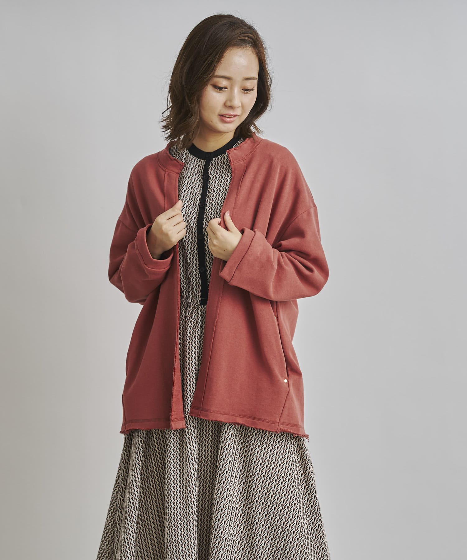 ノーカラーで首元もスッキリ見えるデザイン。カットオフの切りっぱなし風がポイントの