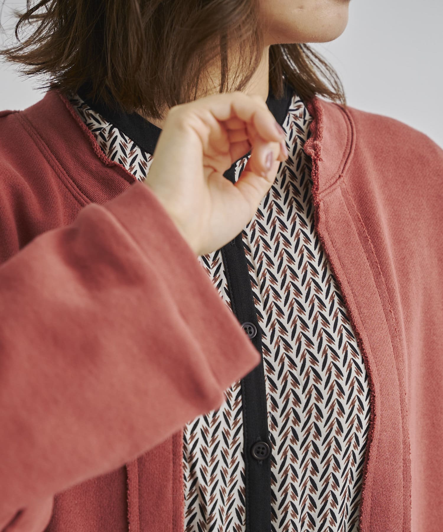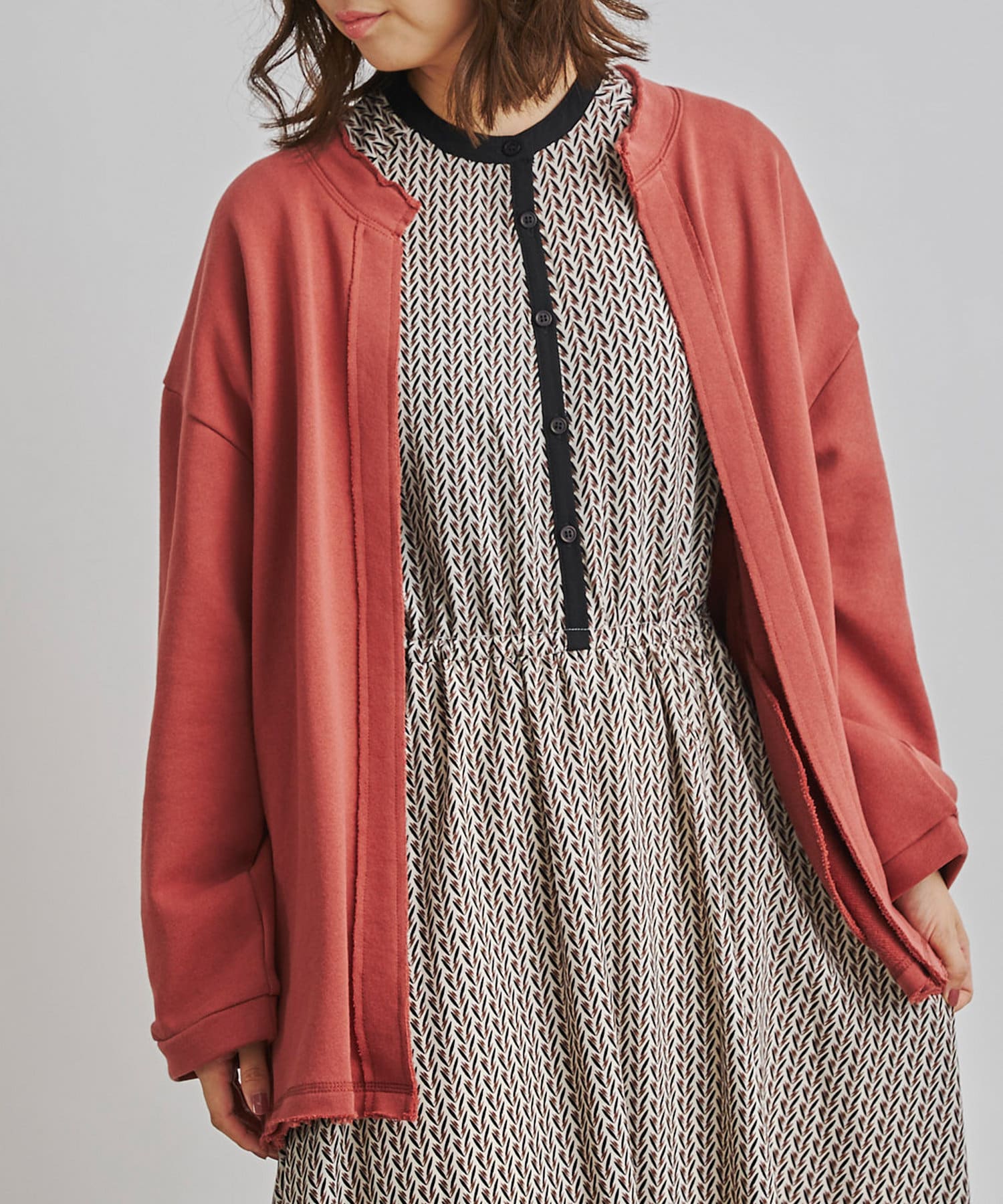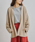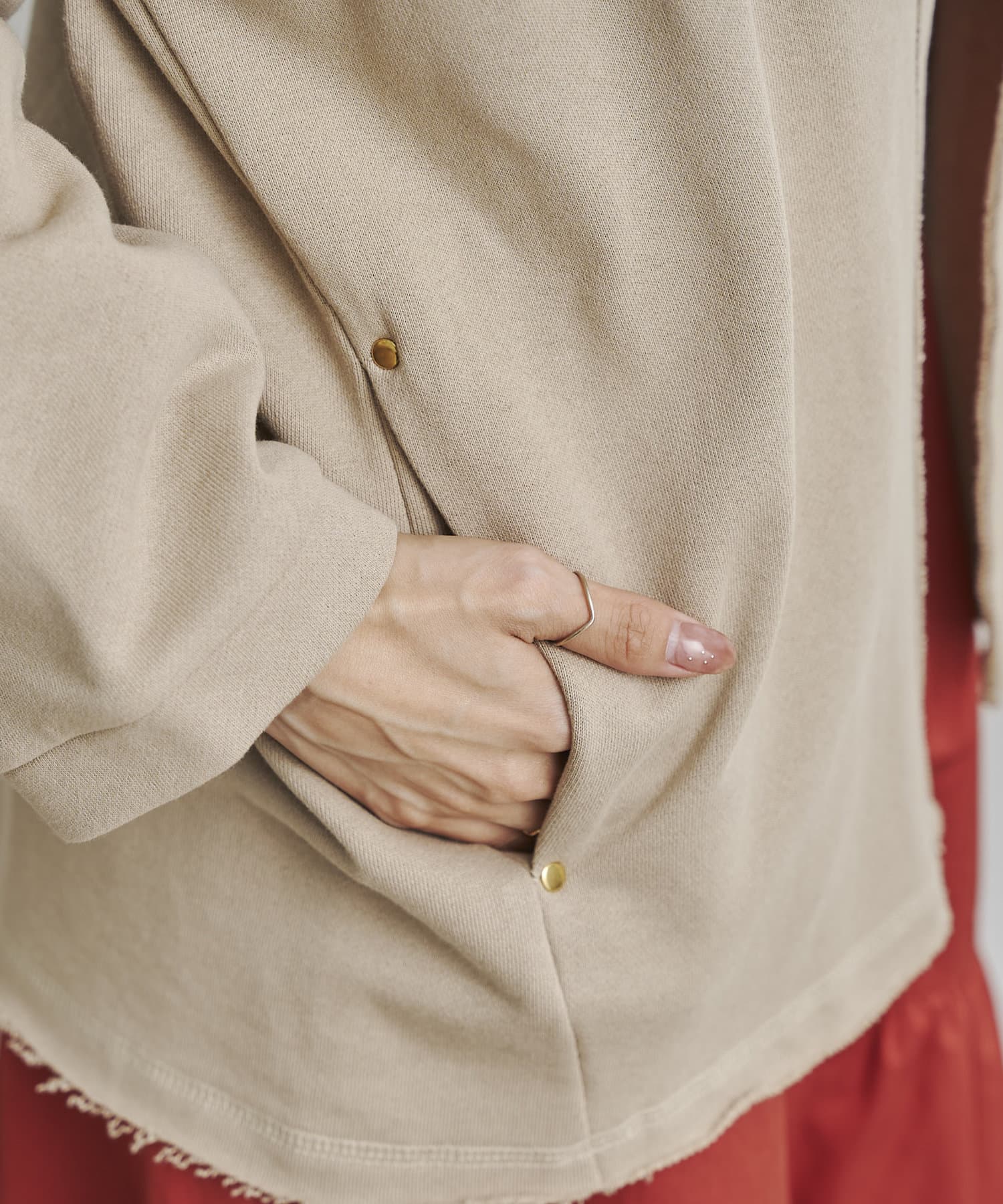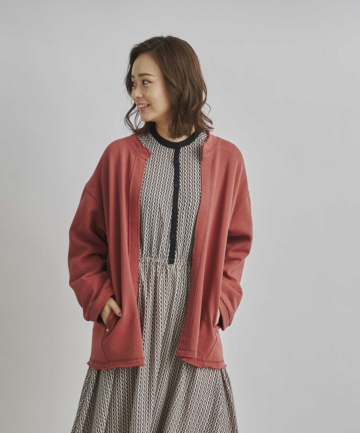 ノーカラーで首元もスッキリ見えるデザイン。カットオフの切りっぱなし風がポイントの