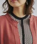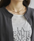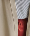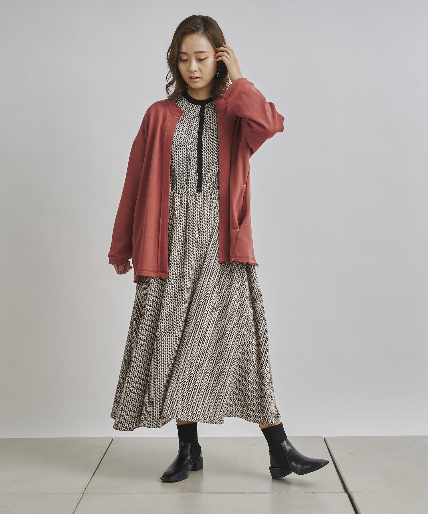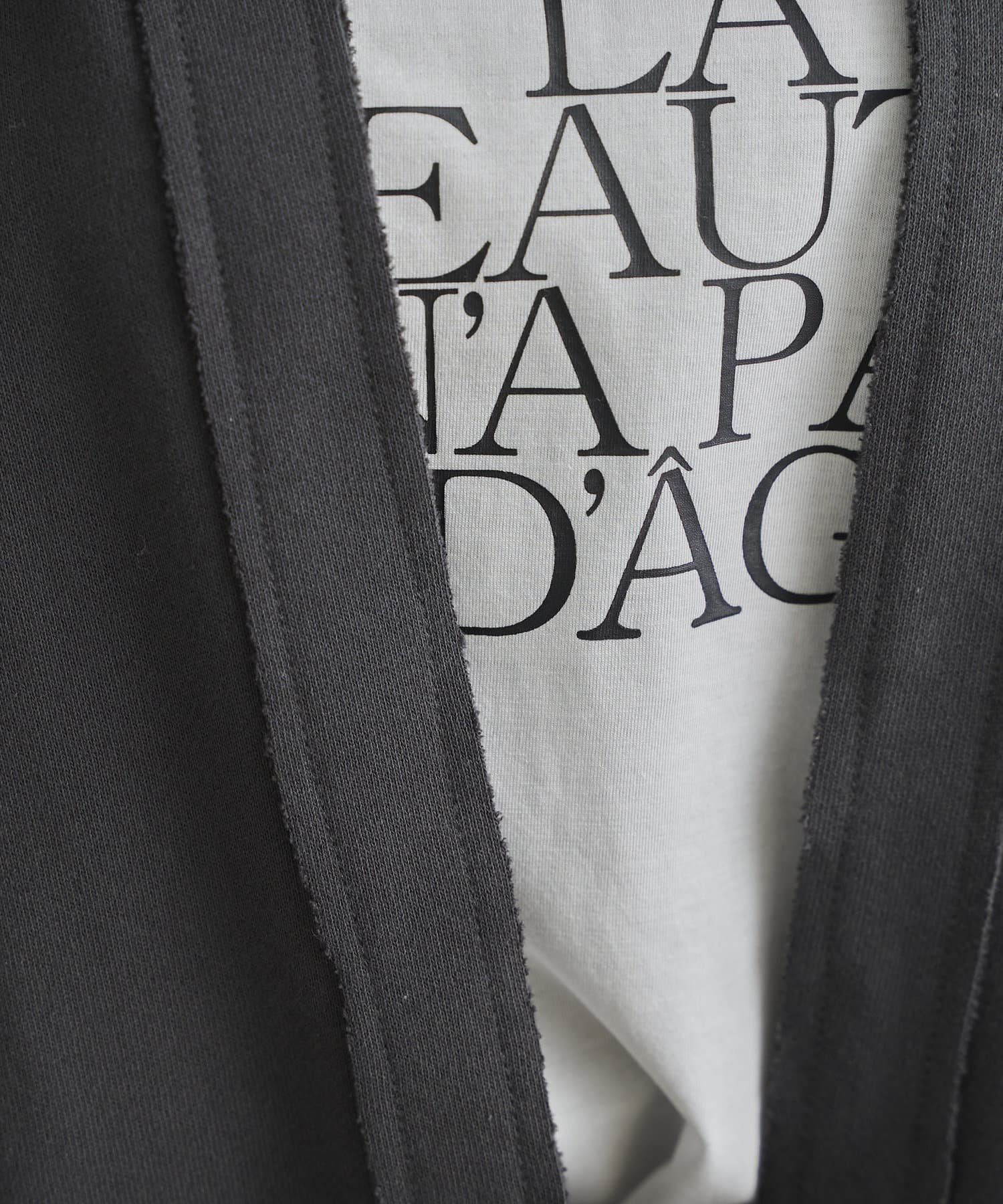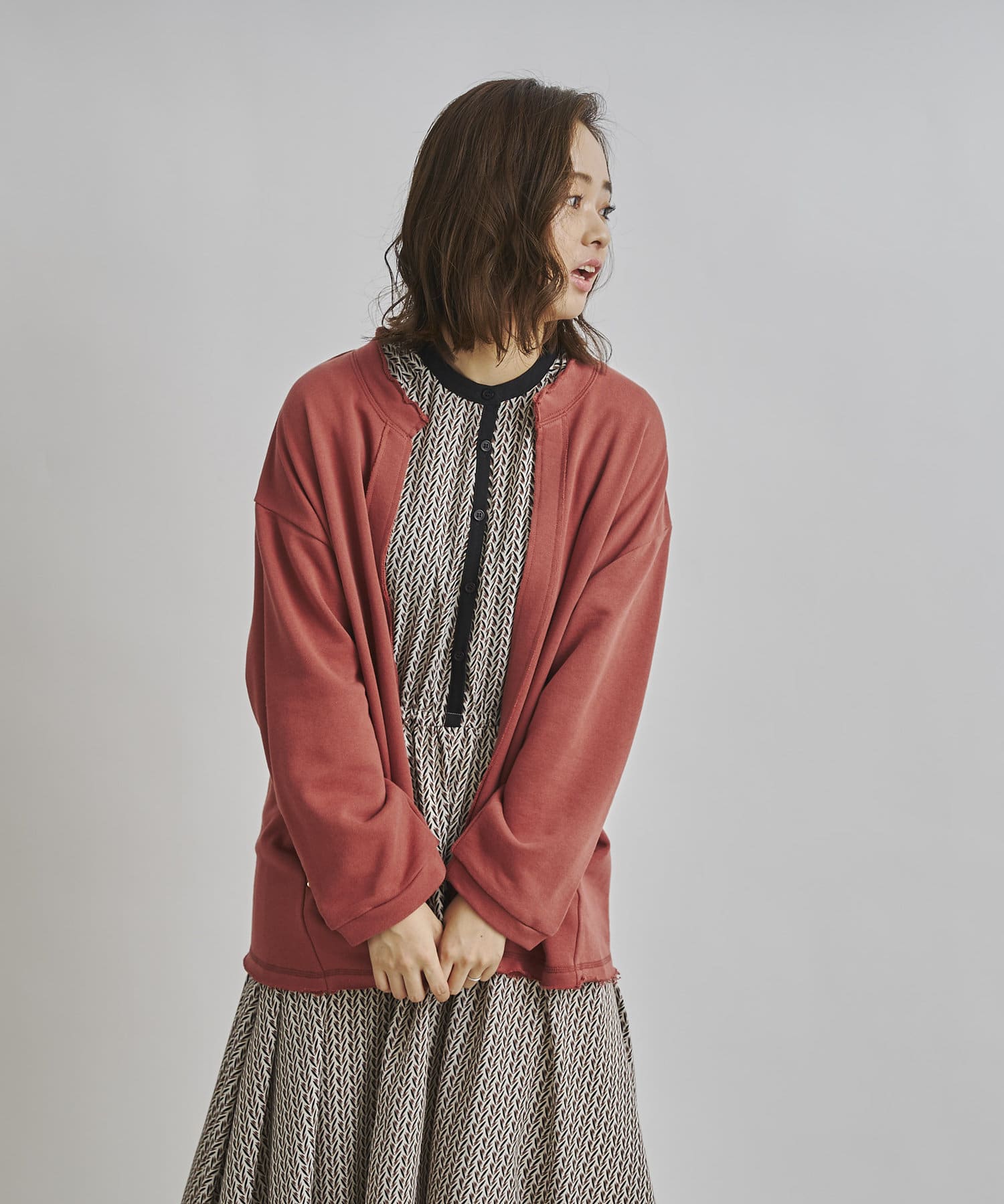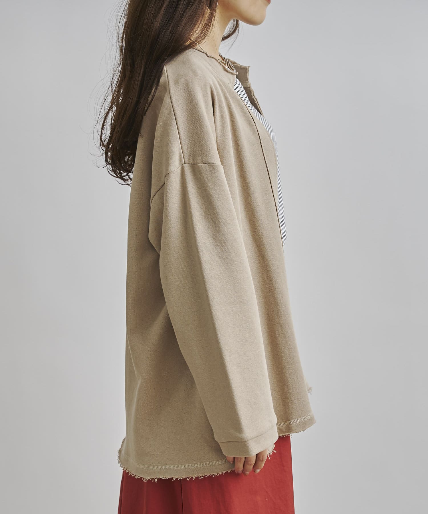 ノーカラーで首元もスッキリ見えるデザイン。カットオフの切りっぱなし風がポイントの