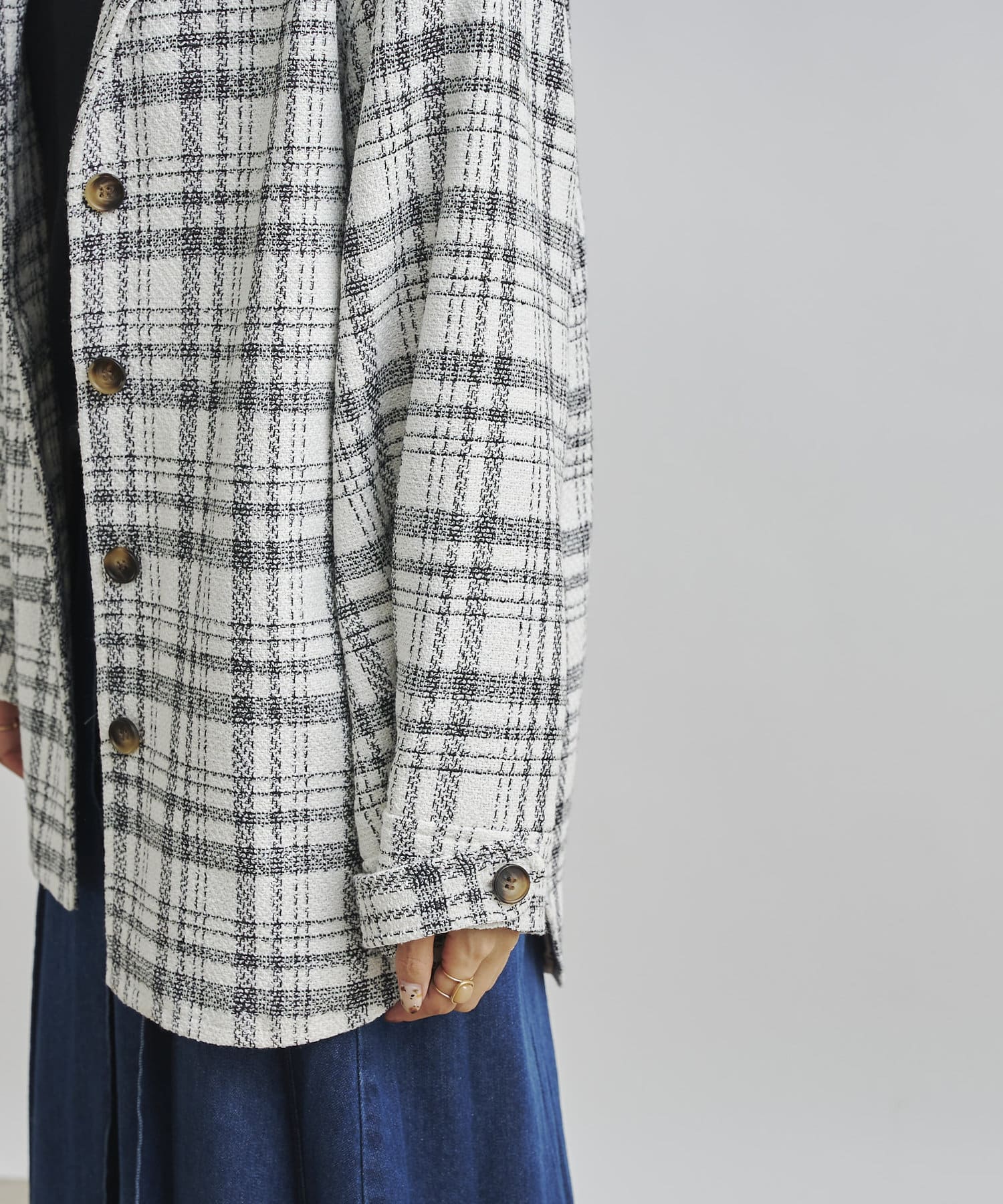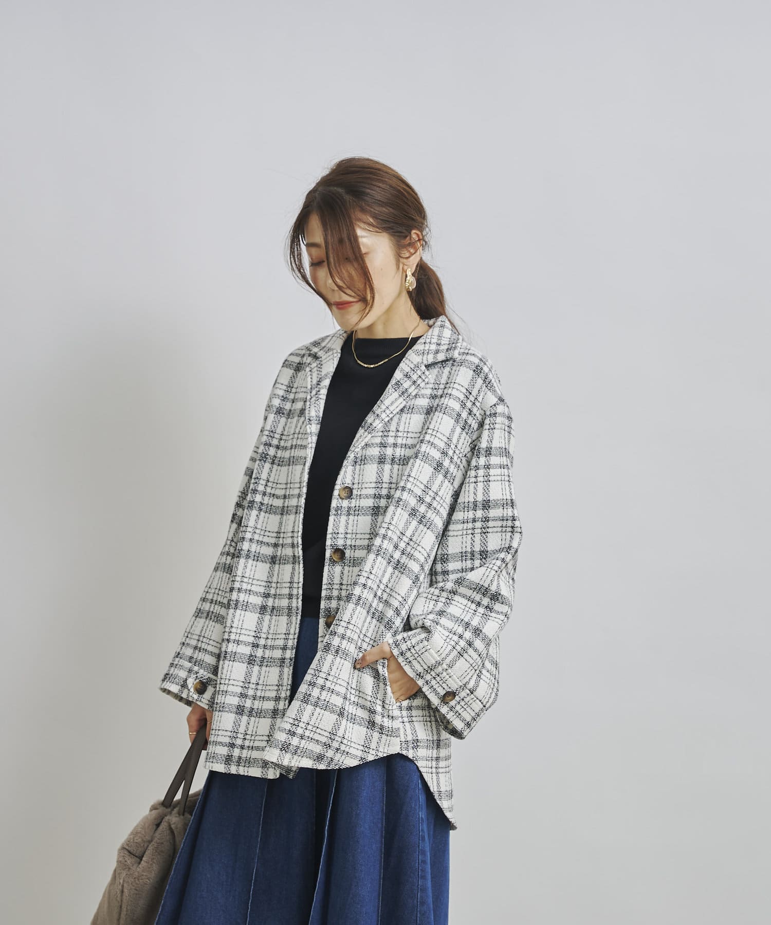 オーバーシルエットでヴィンテージな雰囲気が際立つチェッカ柄ツイードジャケット。