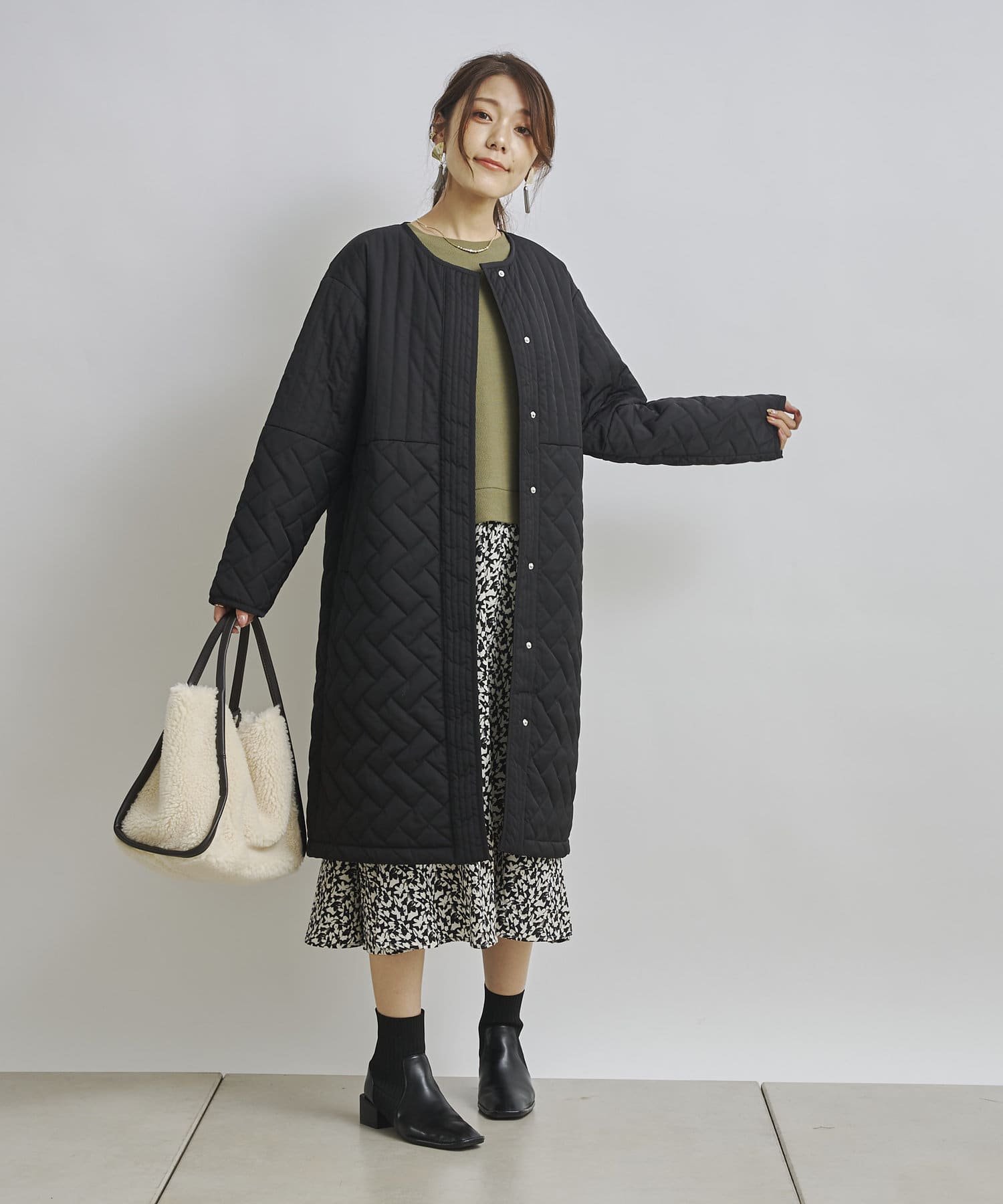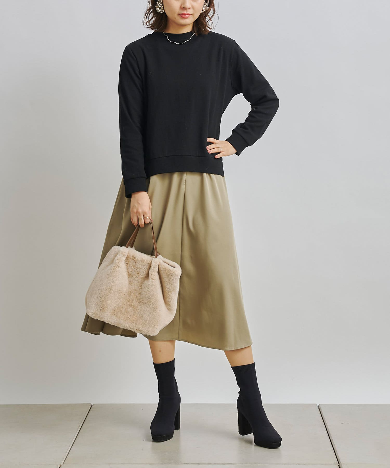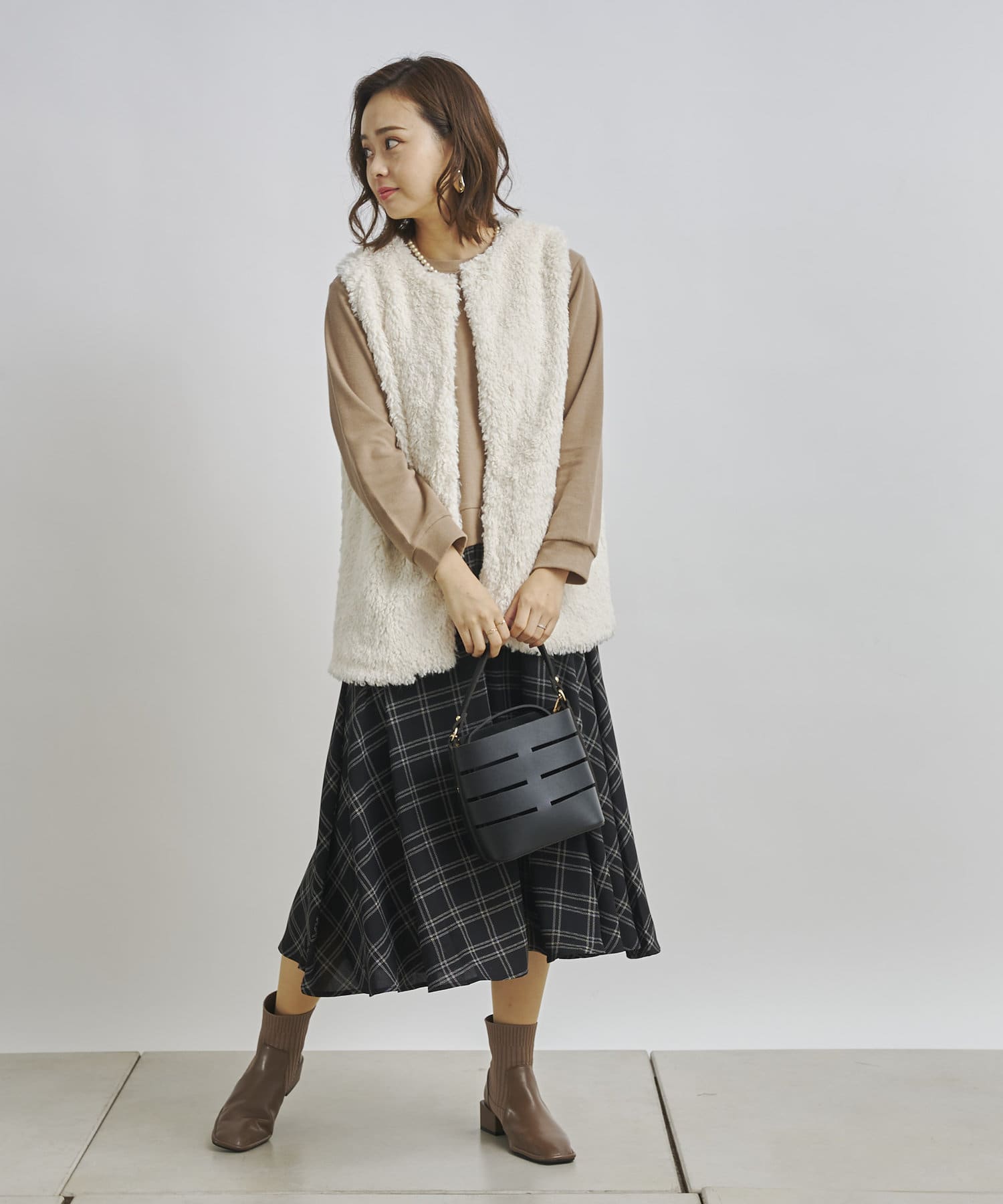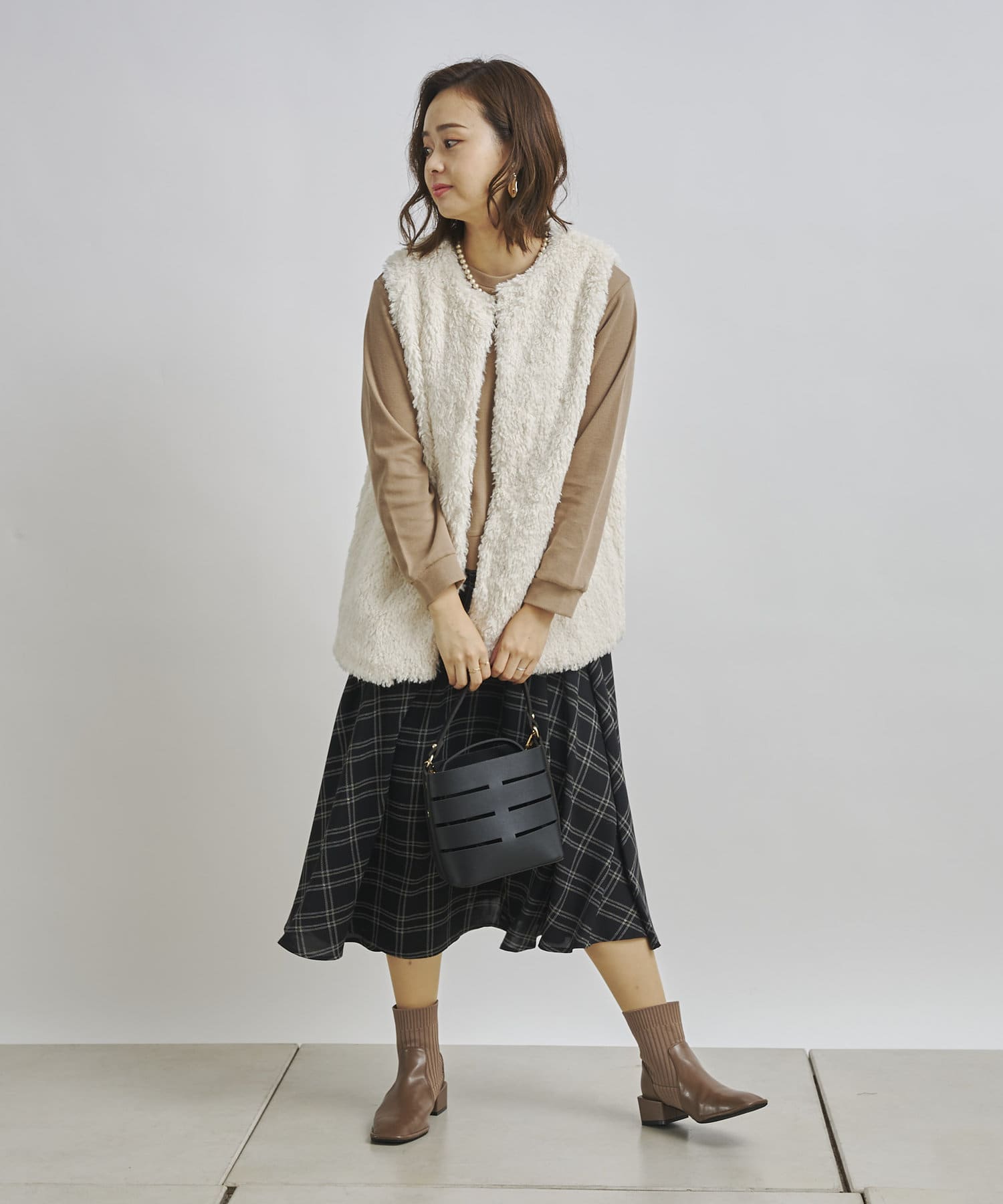 1枚でコーディネートは完成しますがカーディガンや今年らしくファーベストなどと
