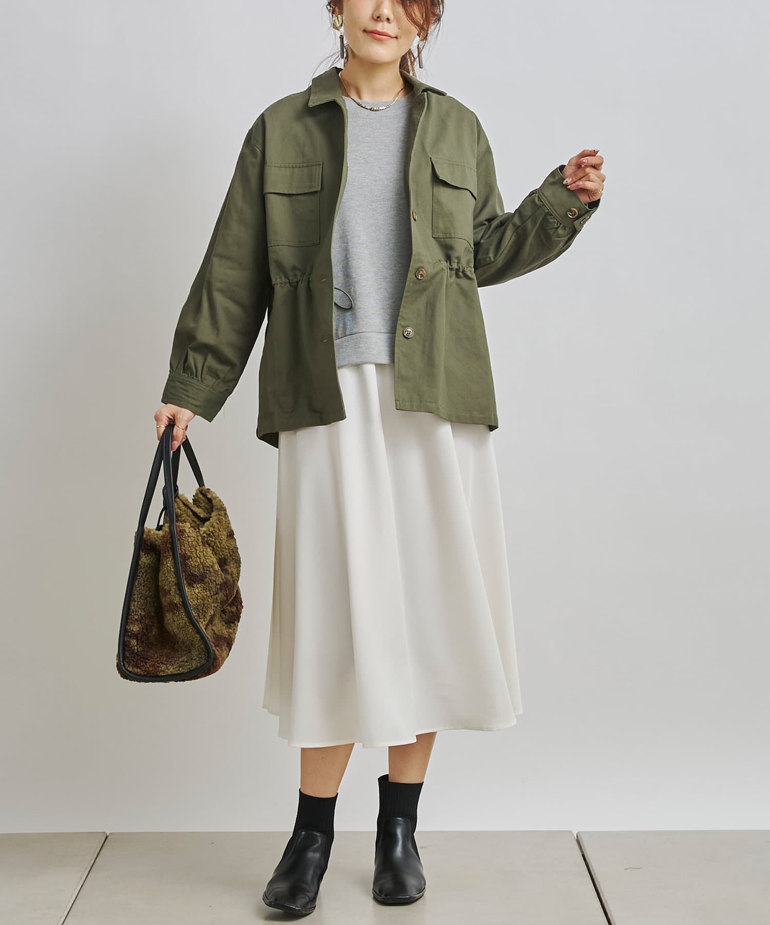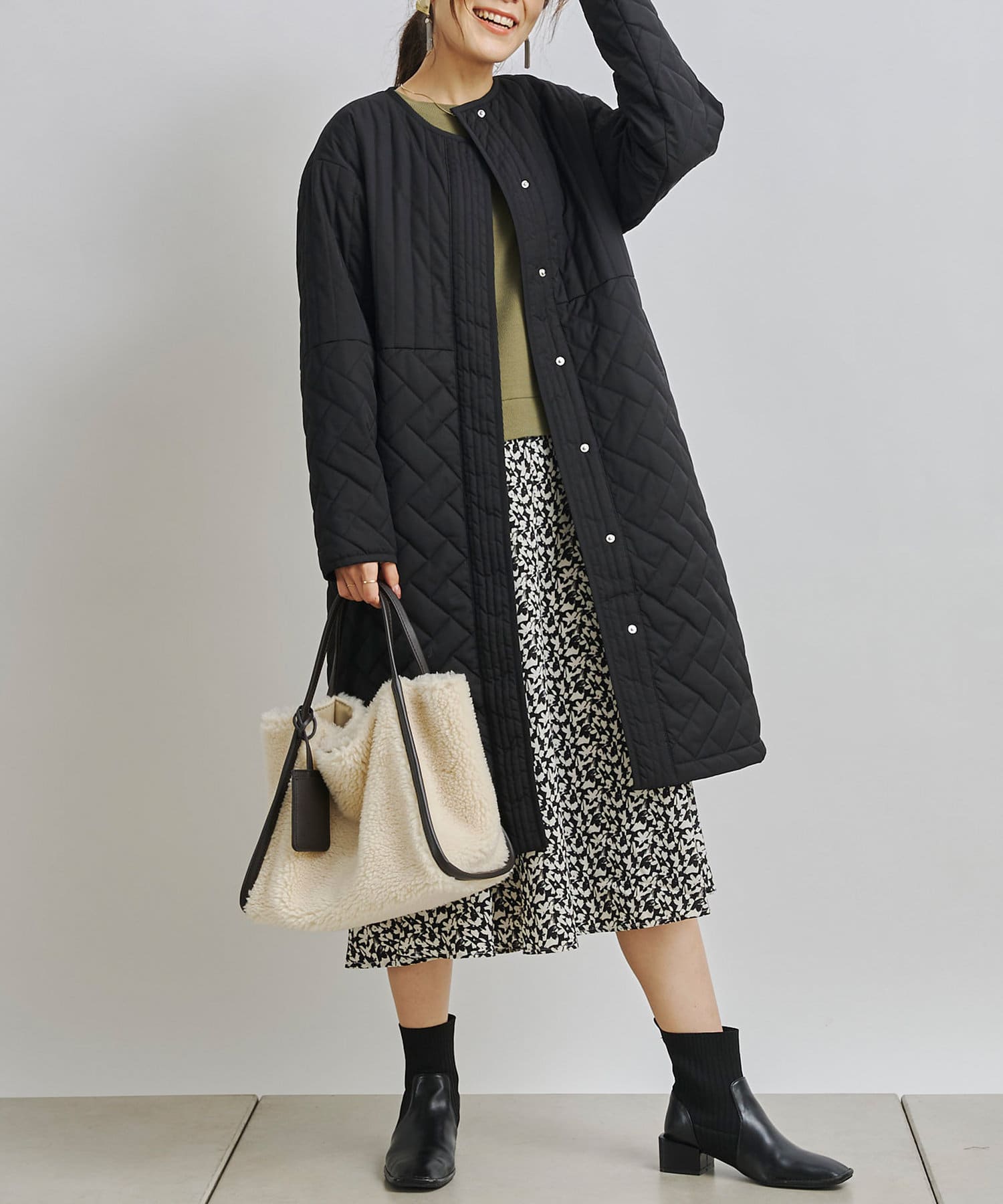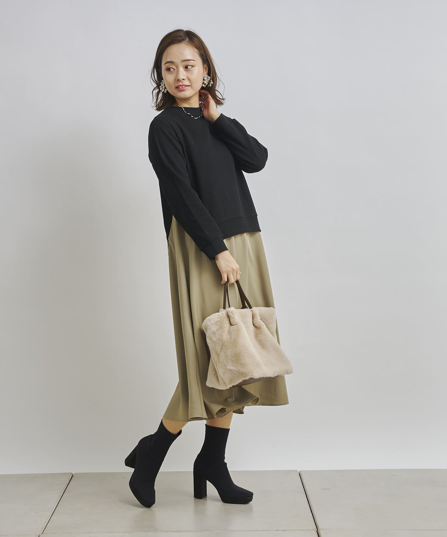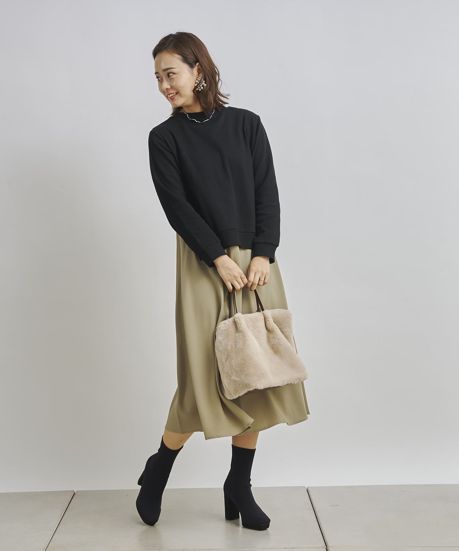 1枚でコーディネートは完成しますがカーディガンや今年らしくファーベストなどと