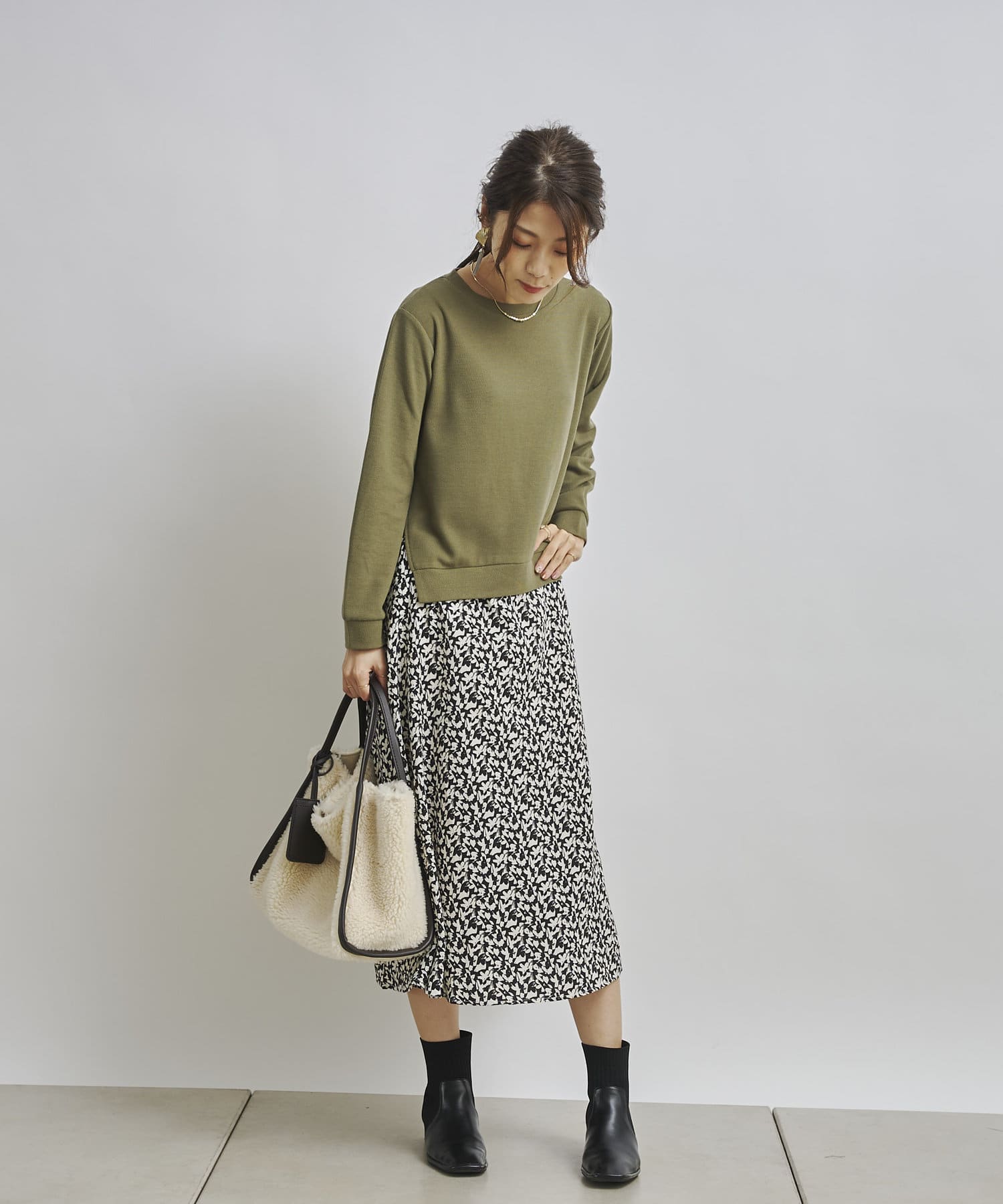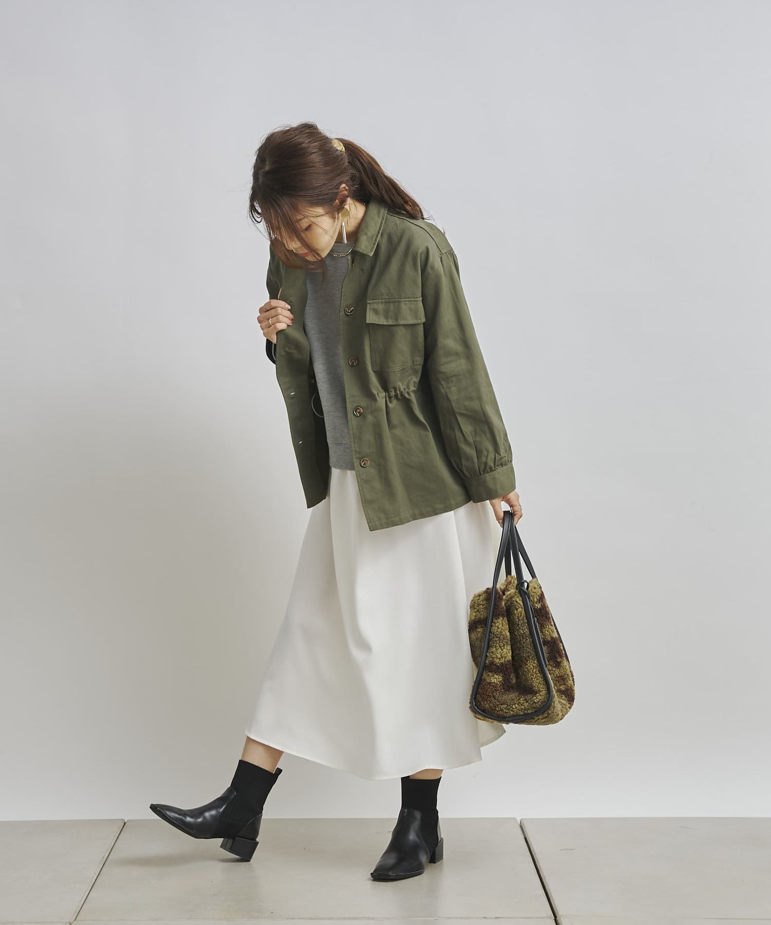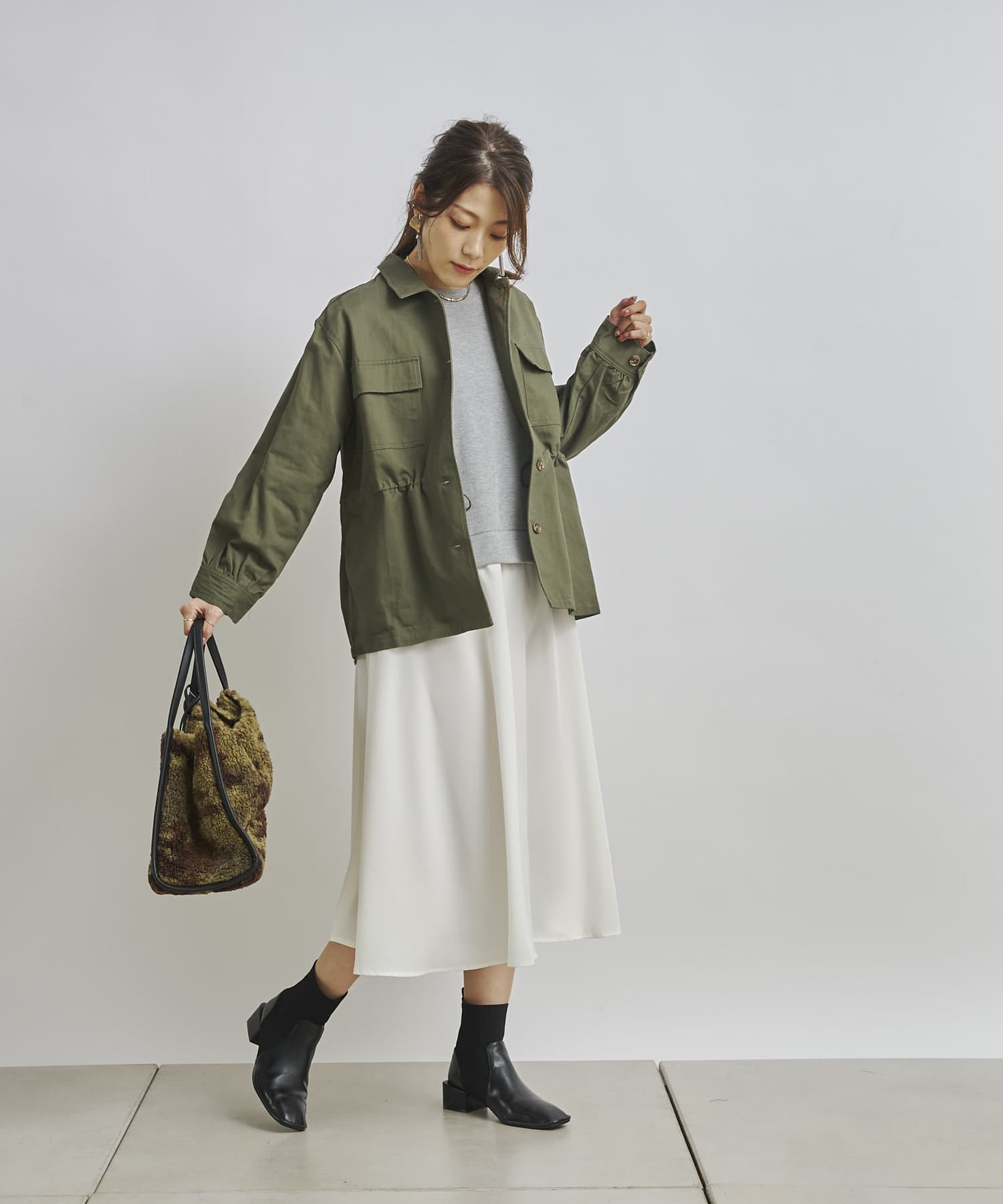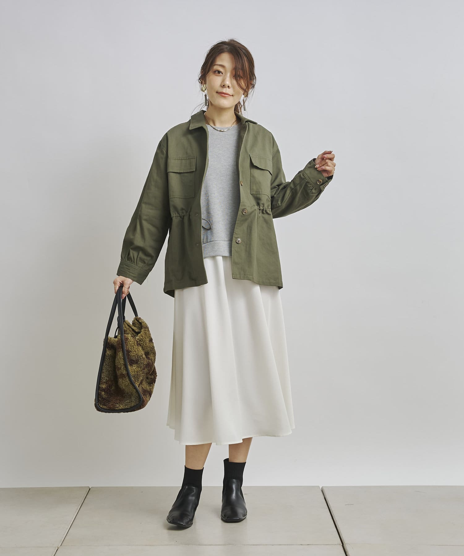 1枚でコーディネートは完成しますがカーディガンや今年らしくファーベストなどと