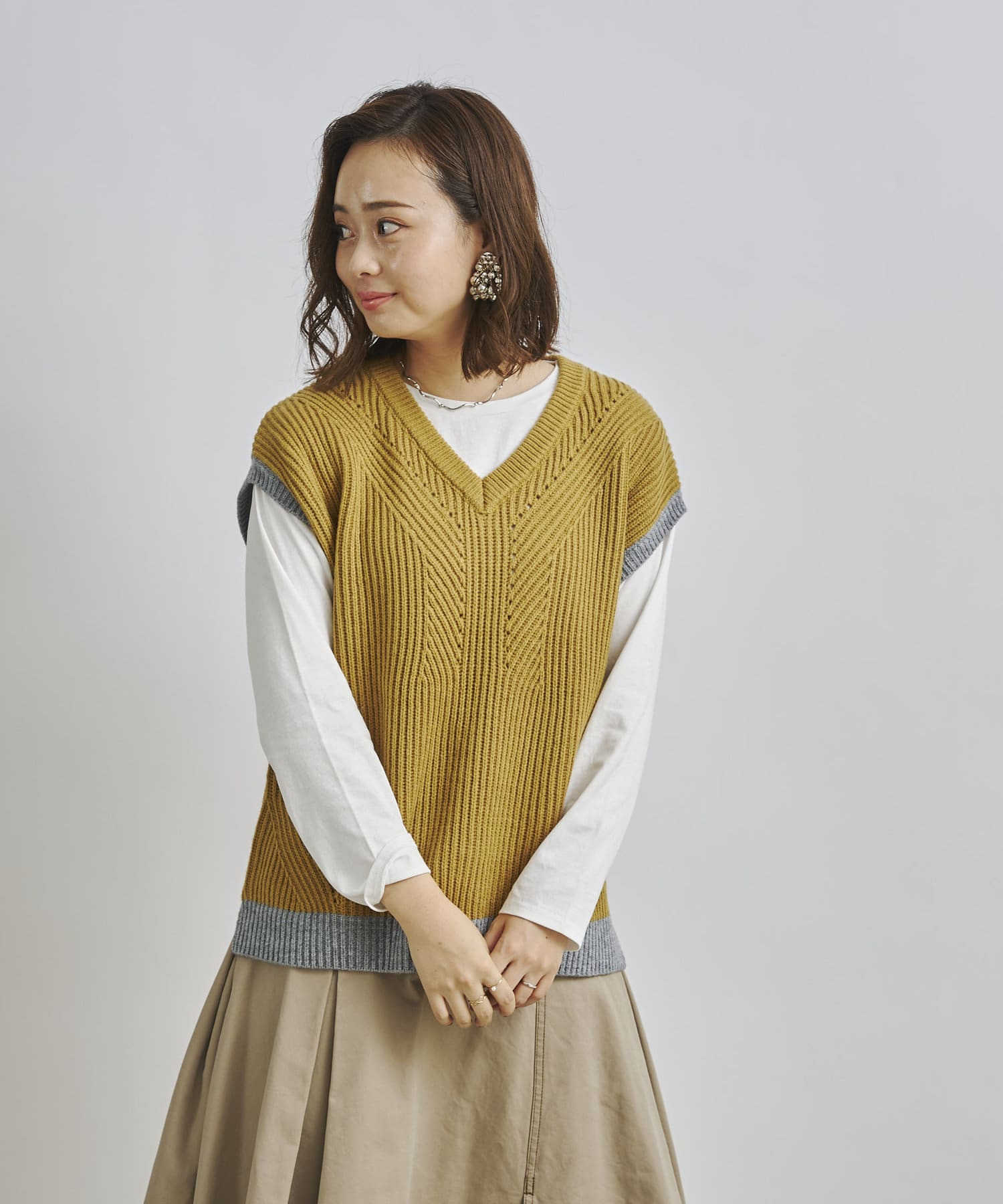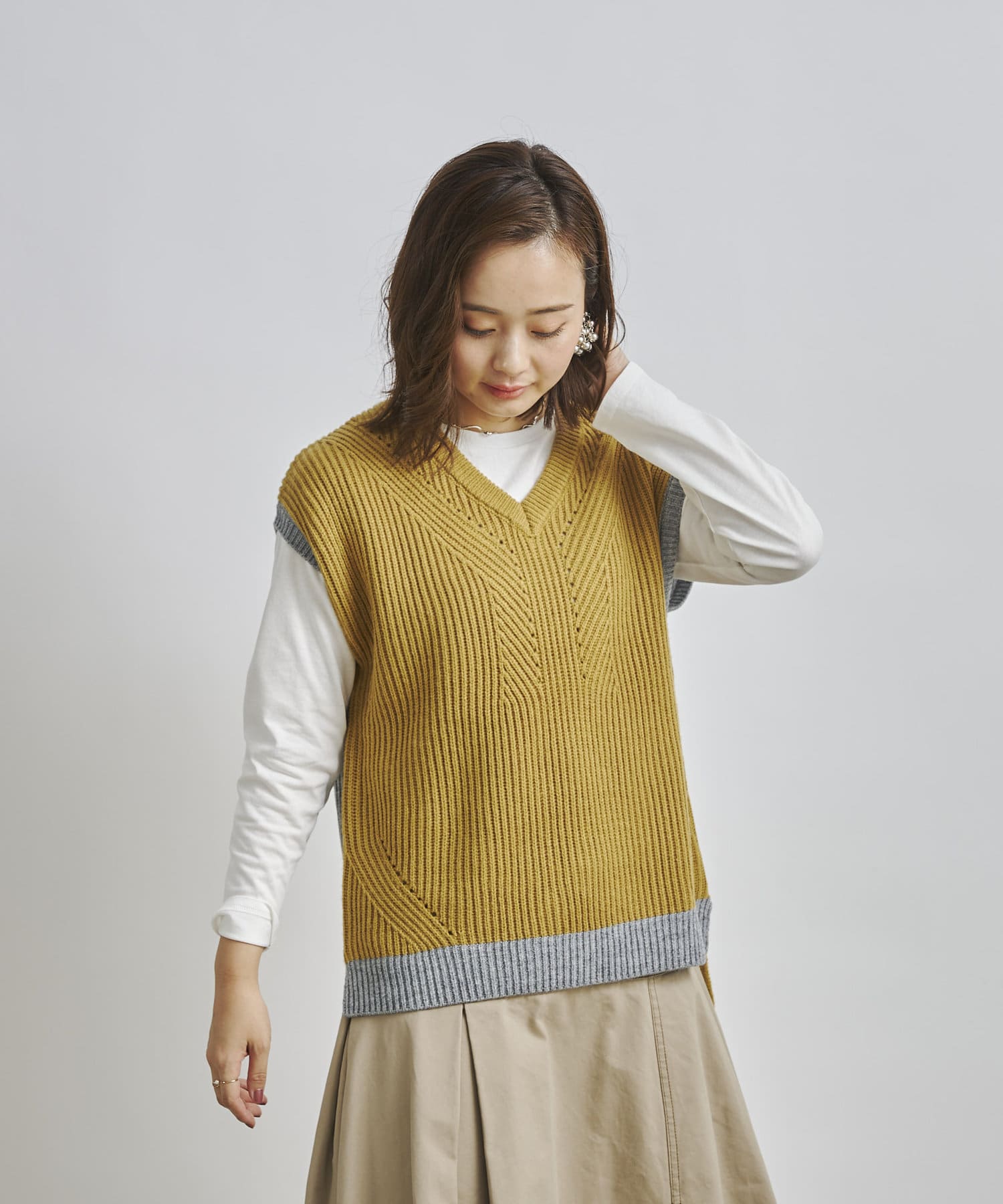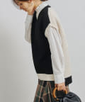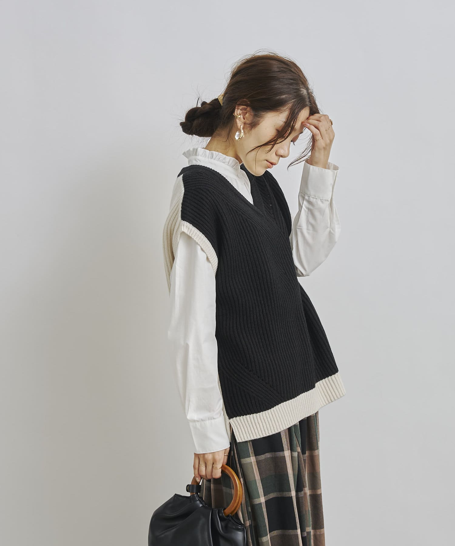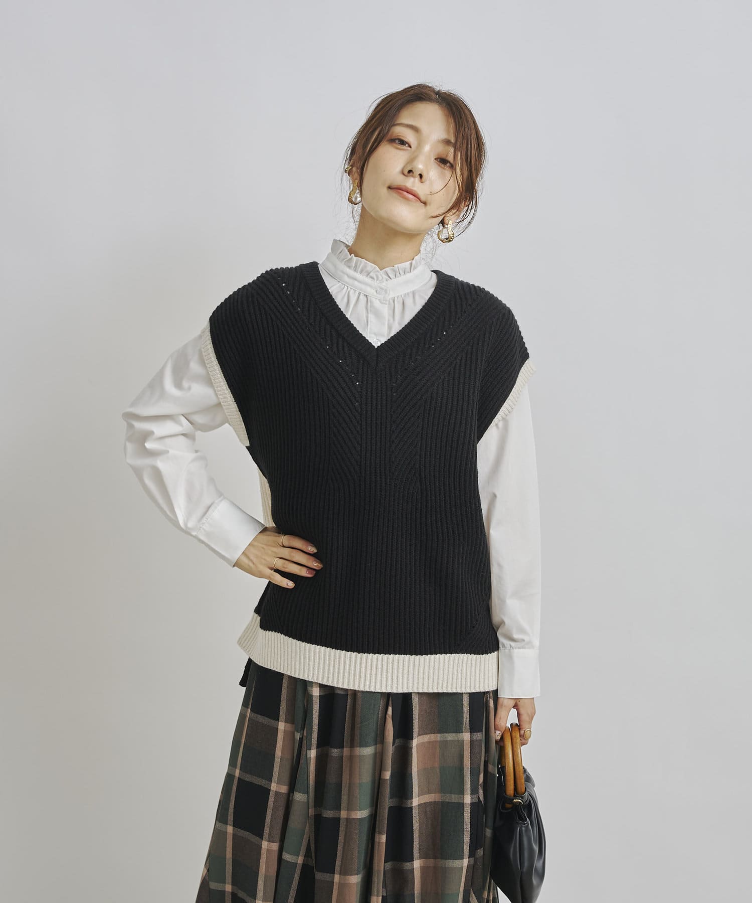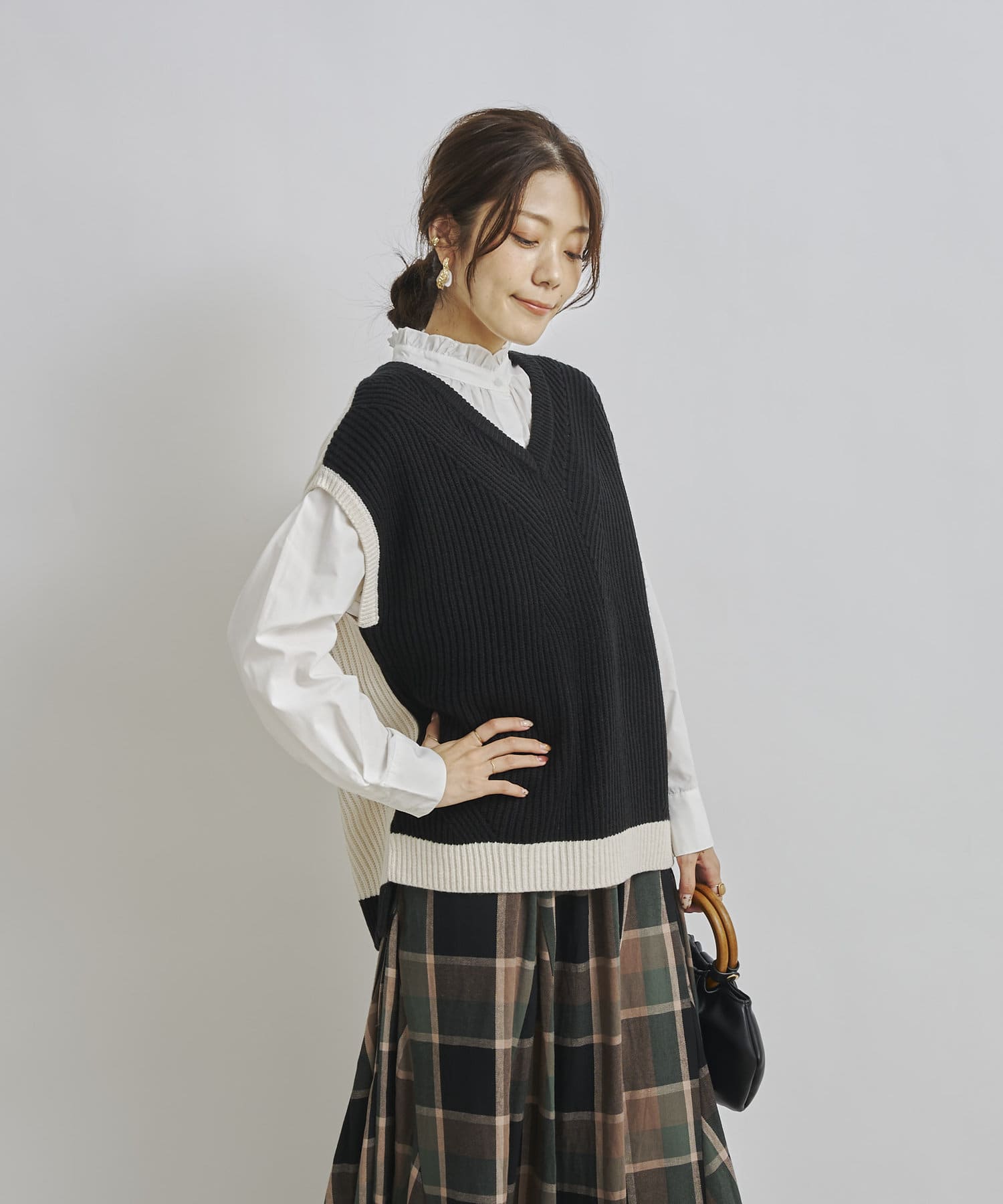 ・バイカラーになった今年らしいニットベスト。レイヤードするだけでこなれた印象に。