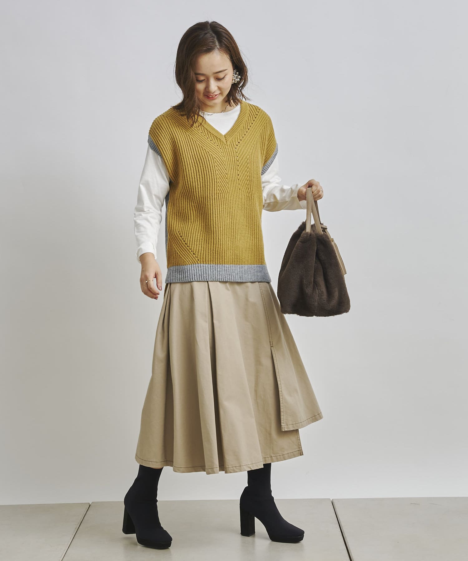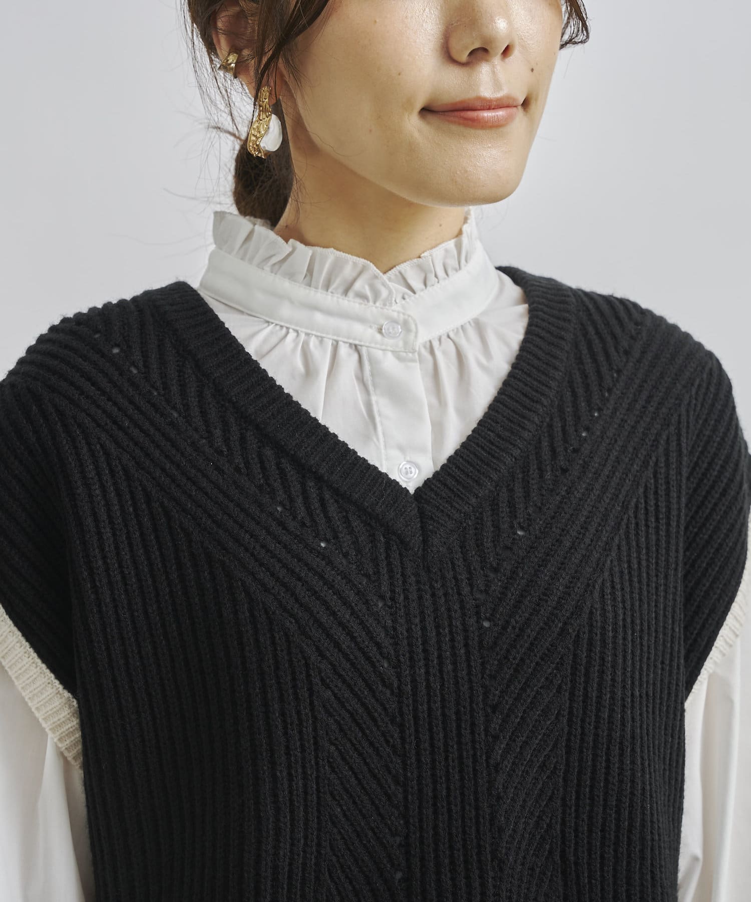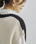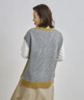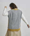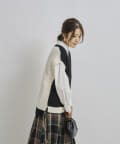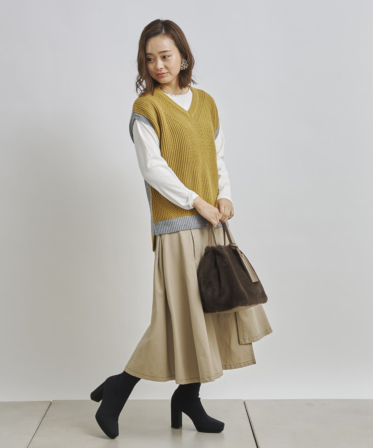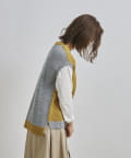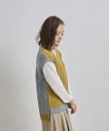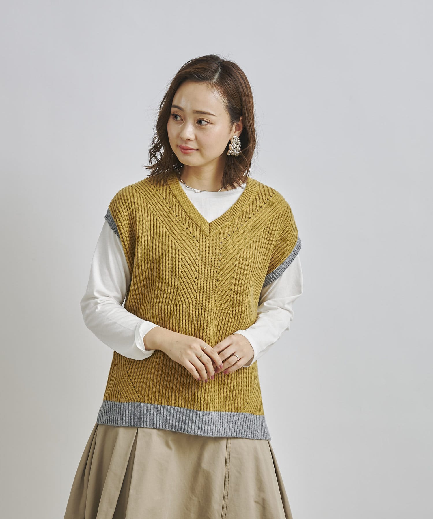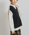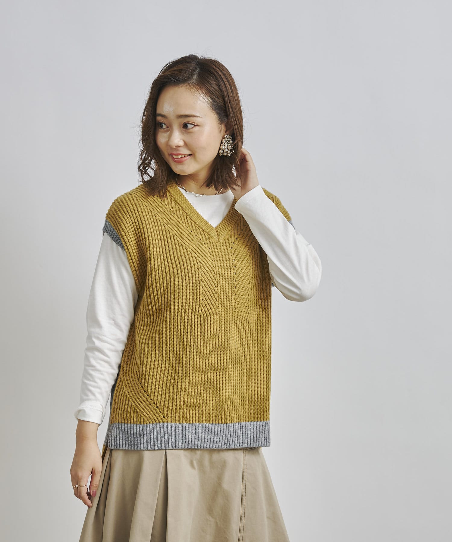 ・バイカラーになった今年らしいニットベスト。レイヤードするだけでこなれた印象に。