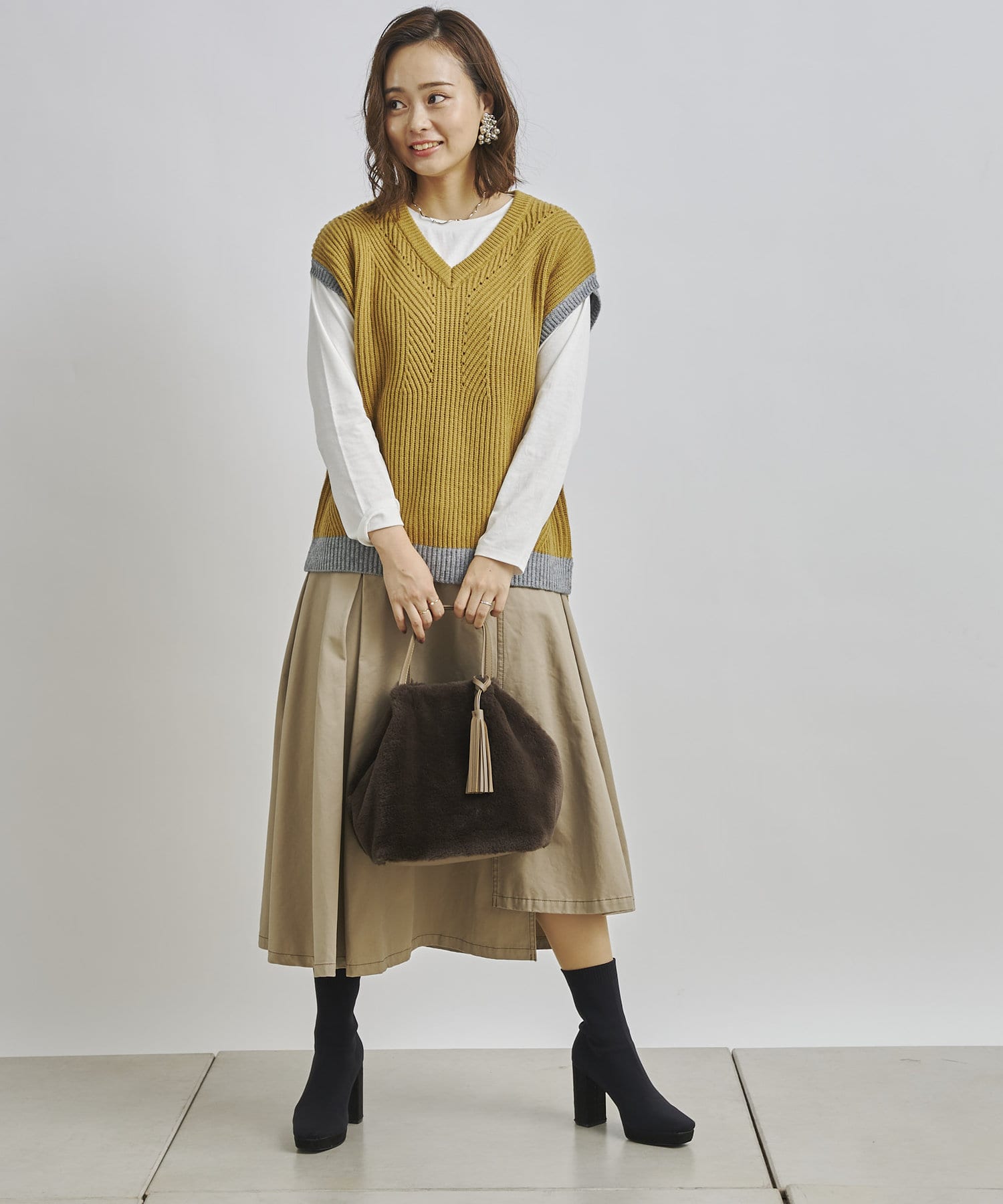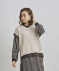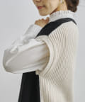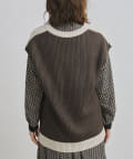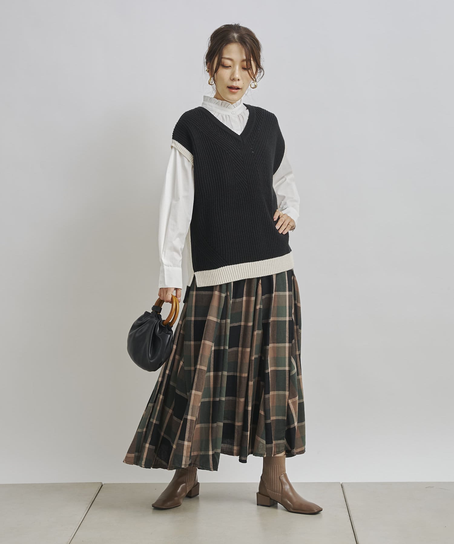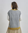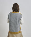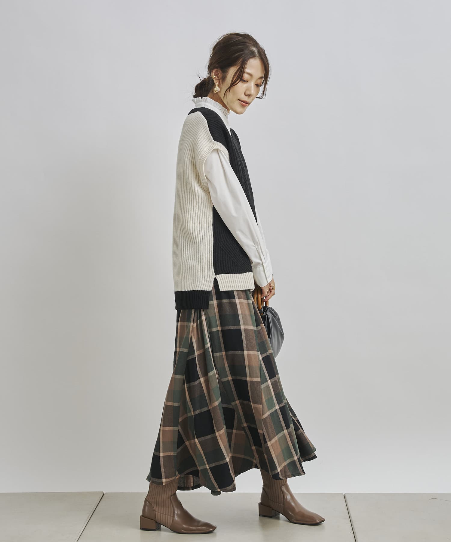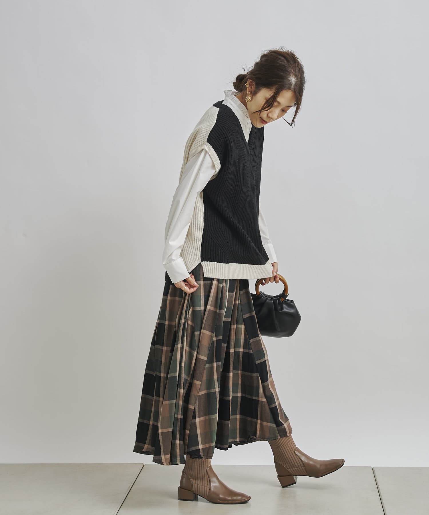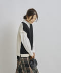 ・バイカラーになった今年らしいニットベスト。レイヤードするだけでこなれた印象に。