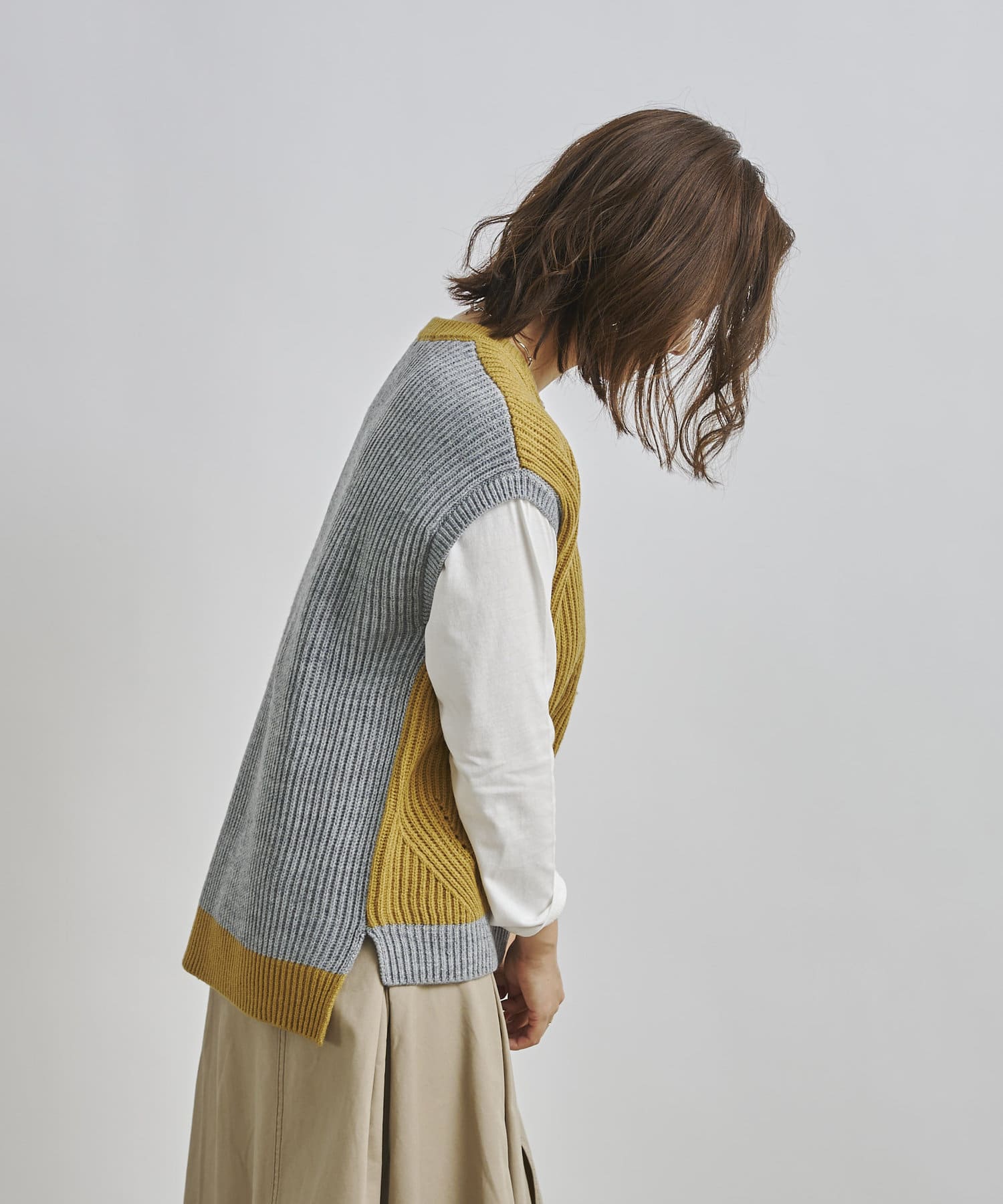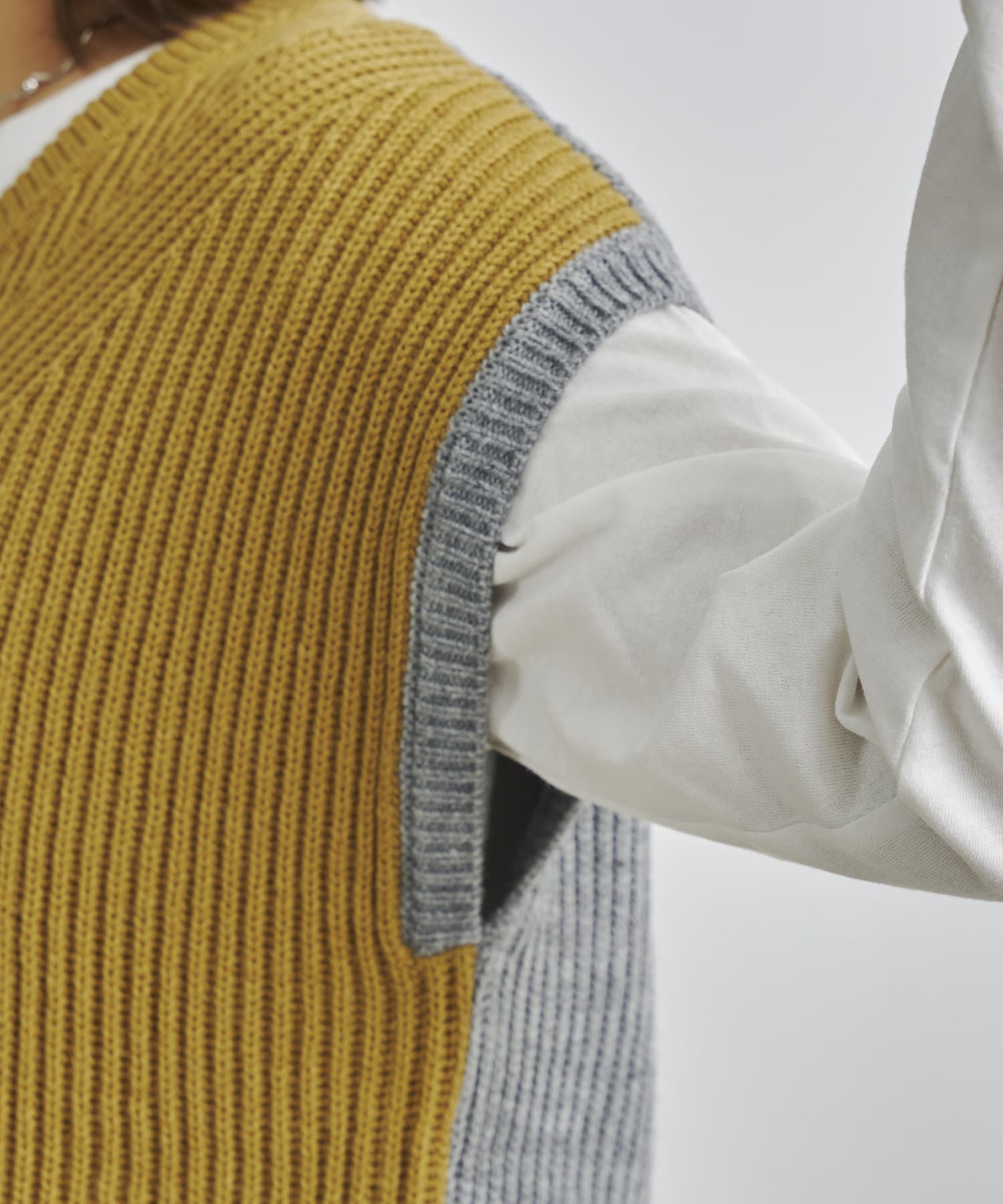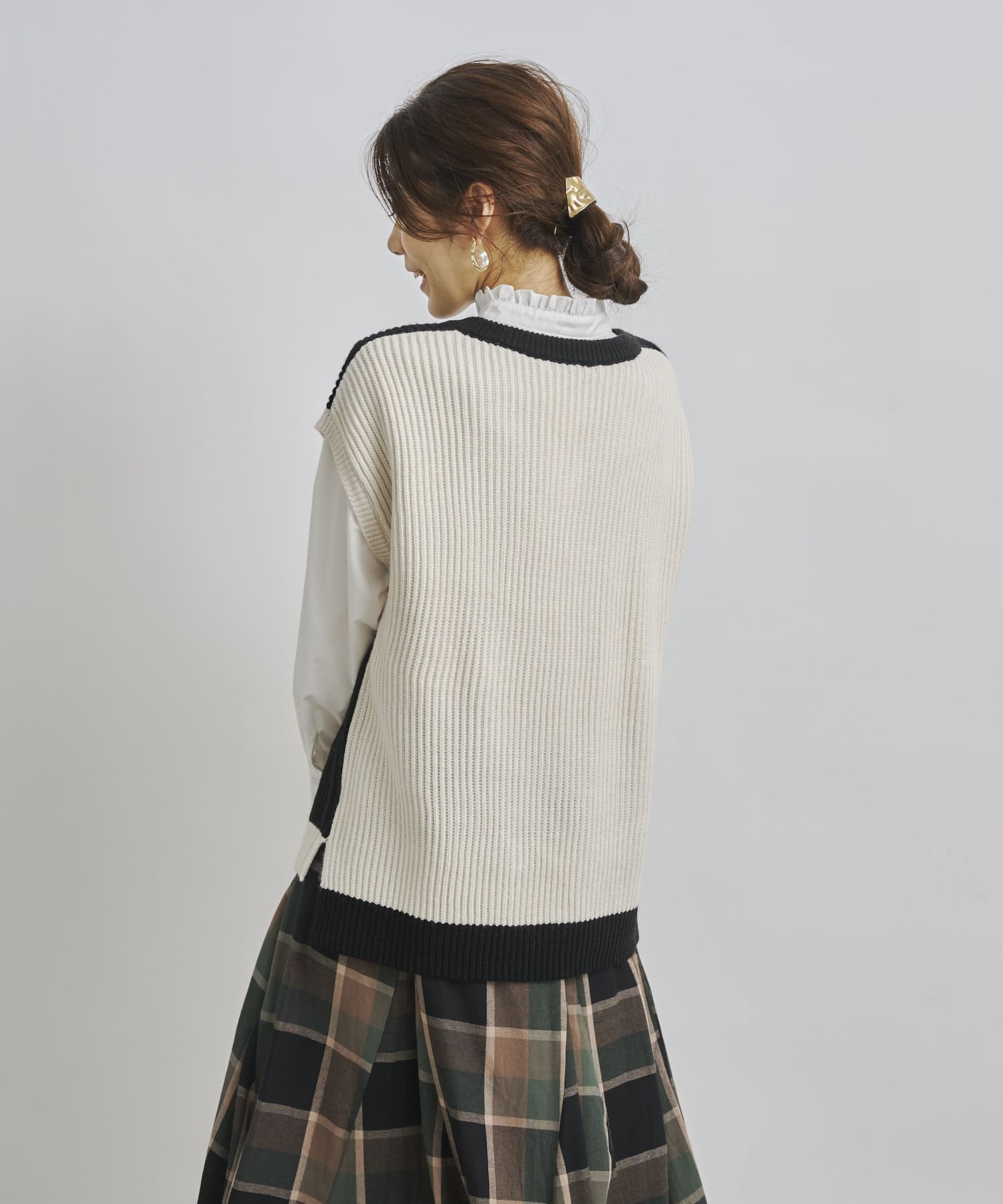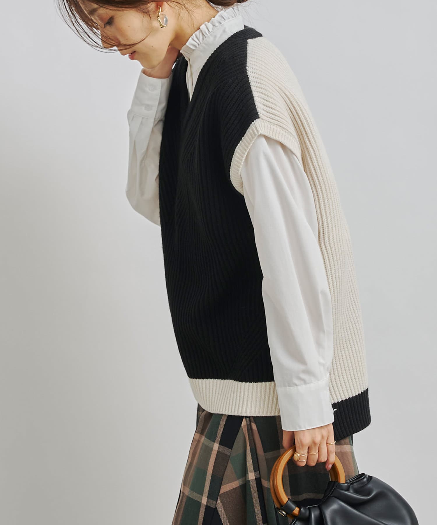 配色のバイカラーデザインのニットベスト 重ねるだけで旬な顔に