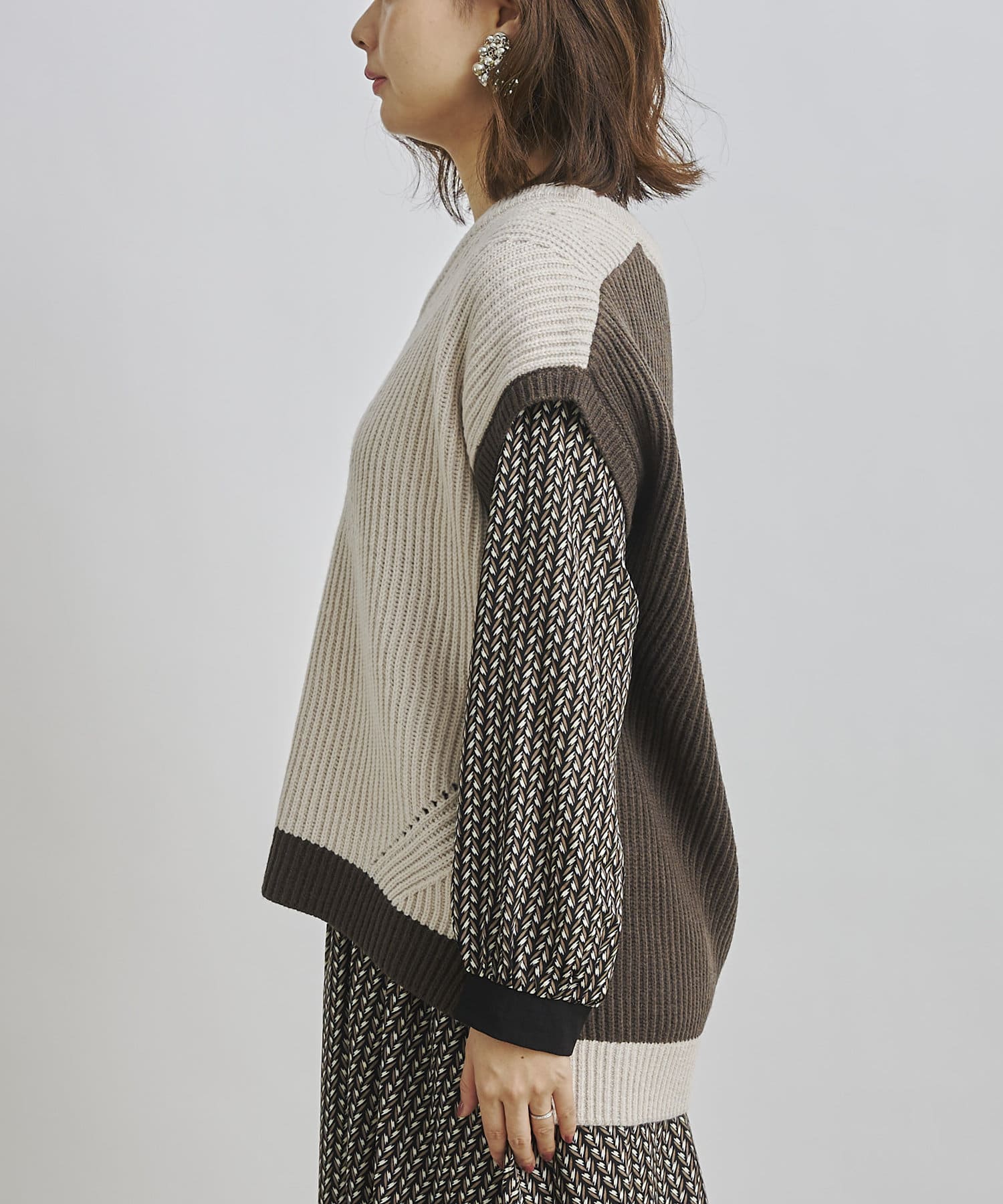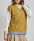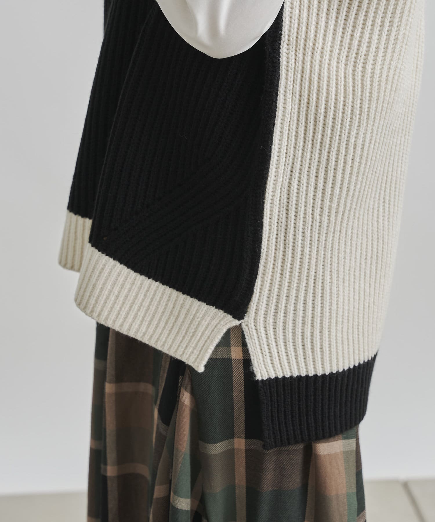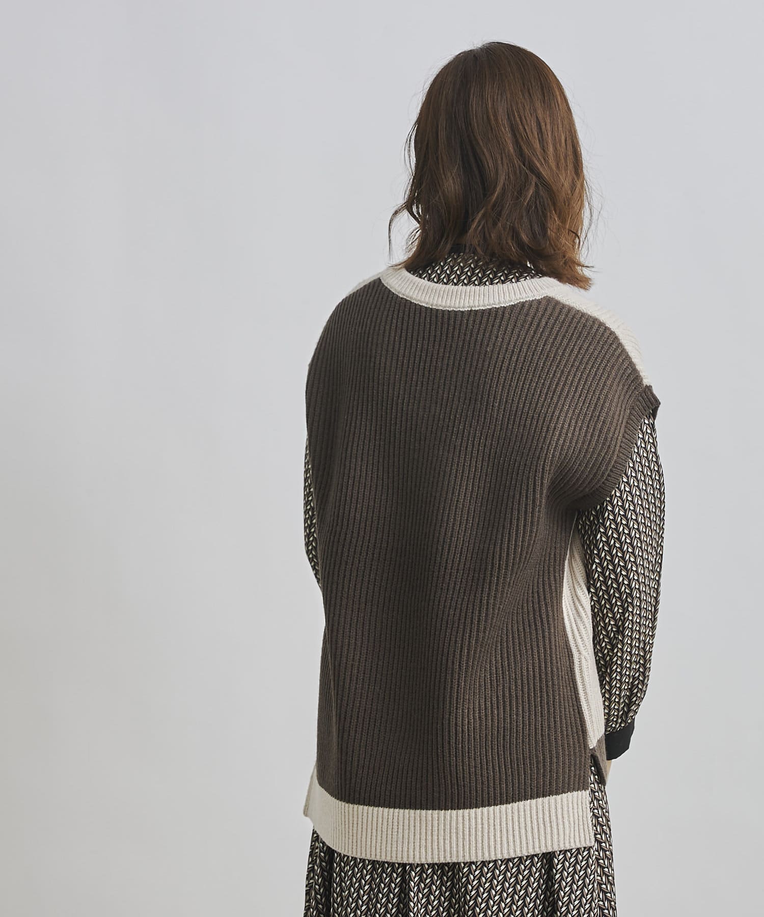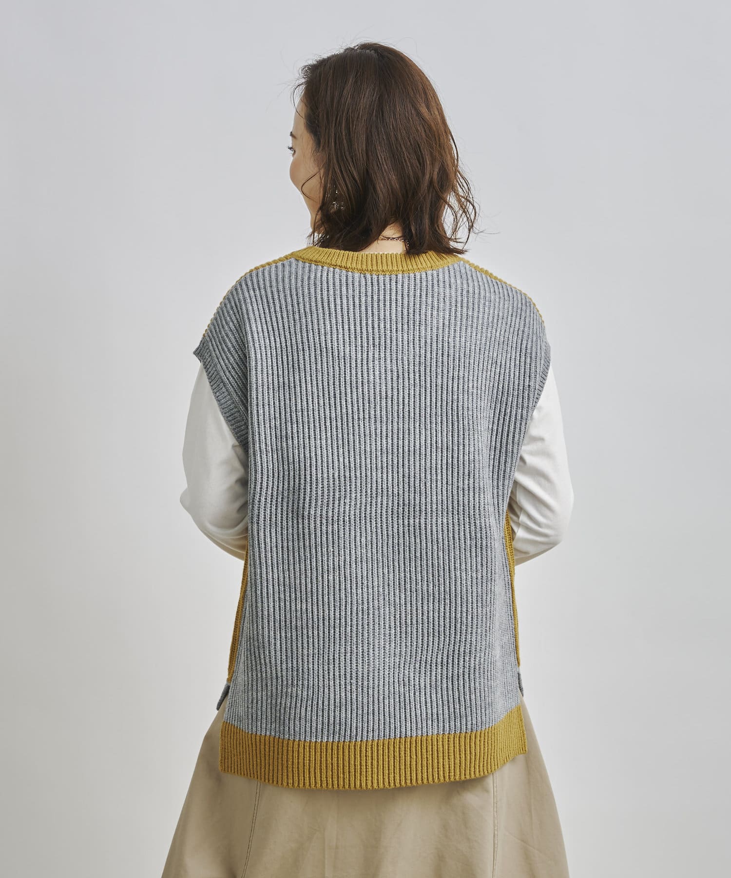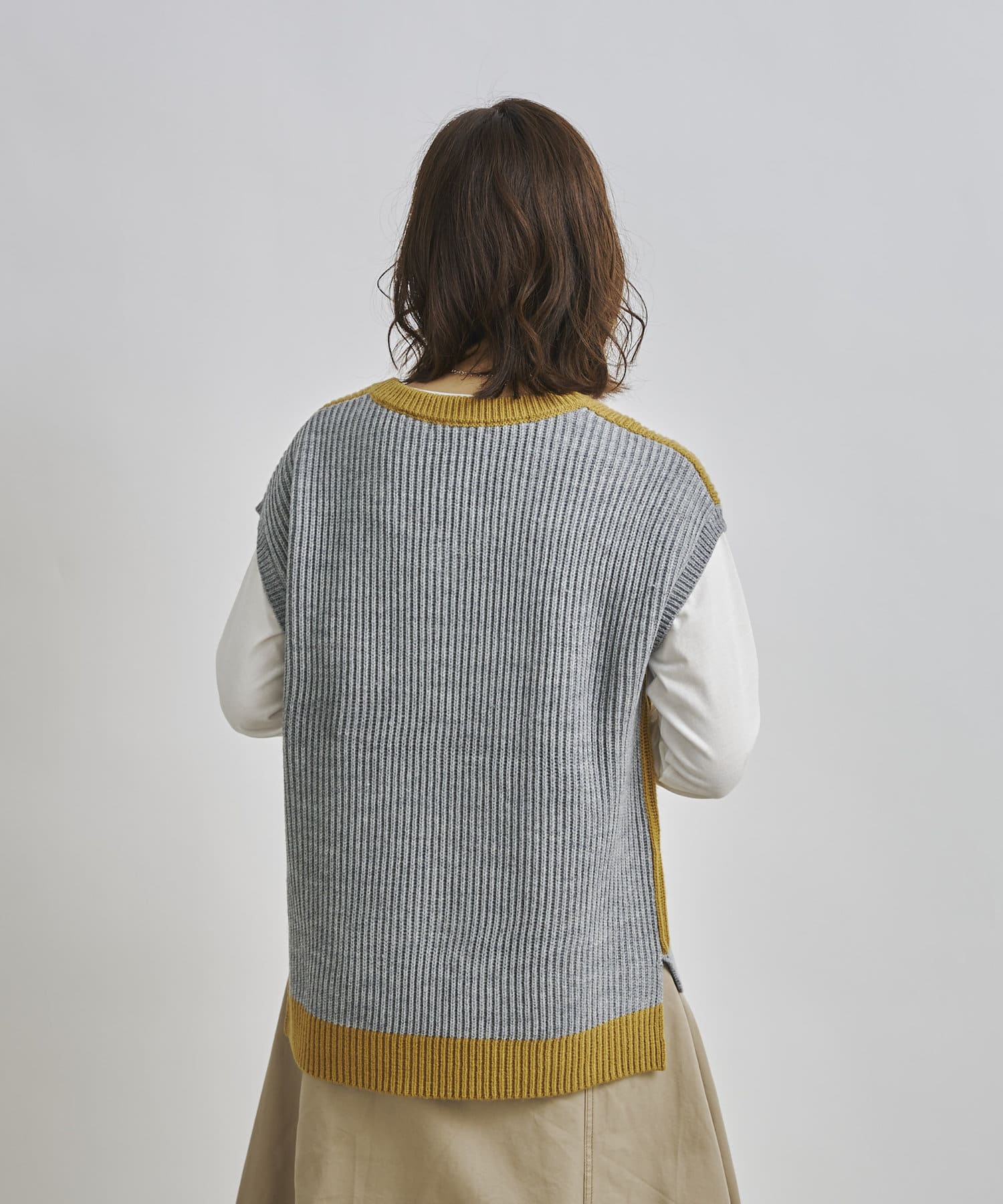 配色のバイカラーデザインのニットベスト 重ねるだけで旬な顔に