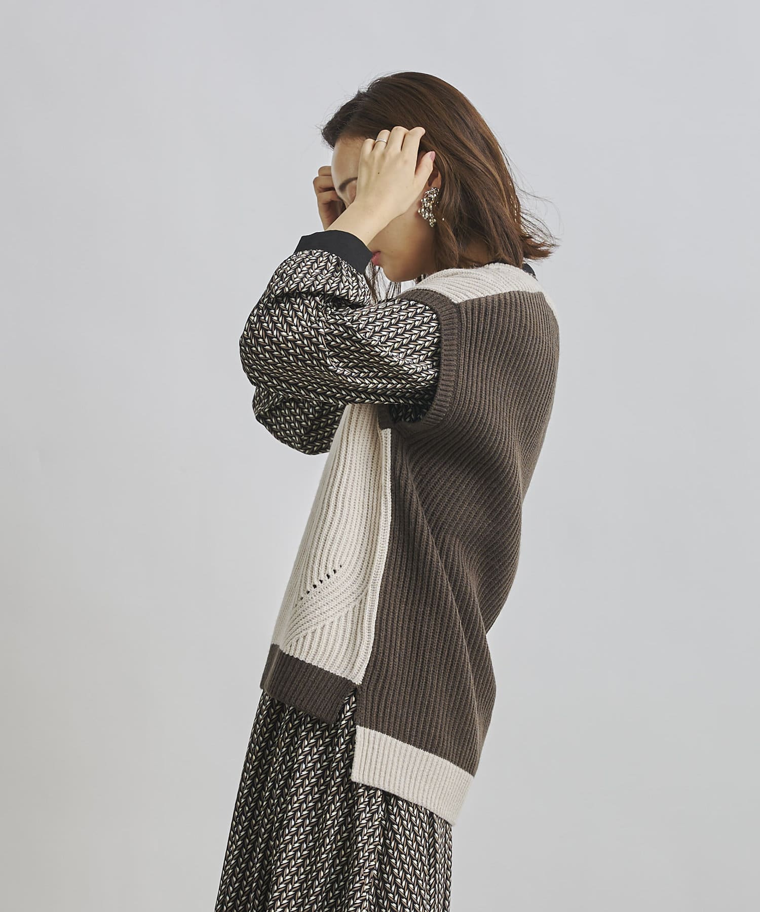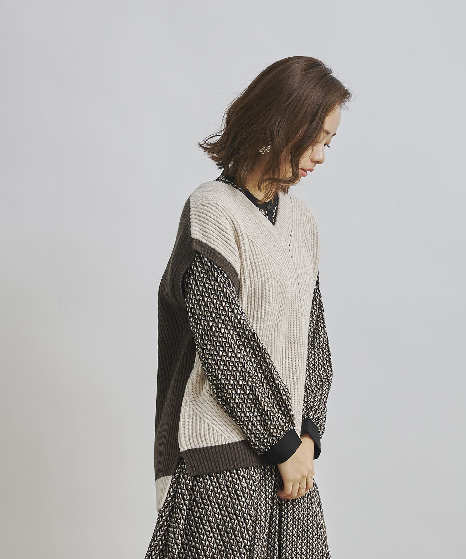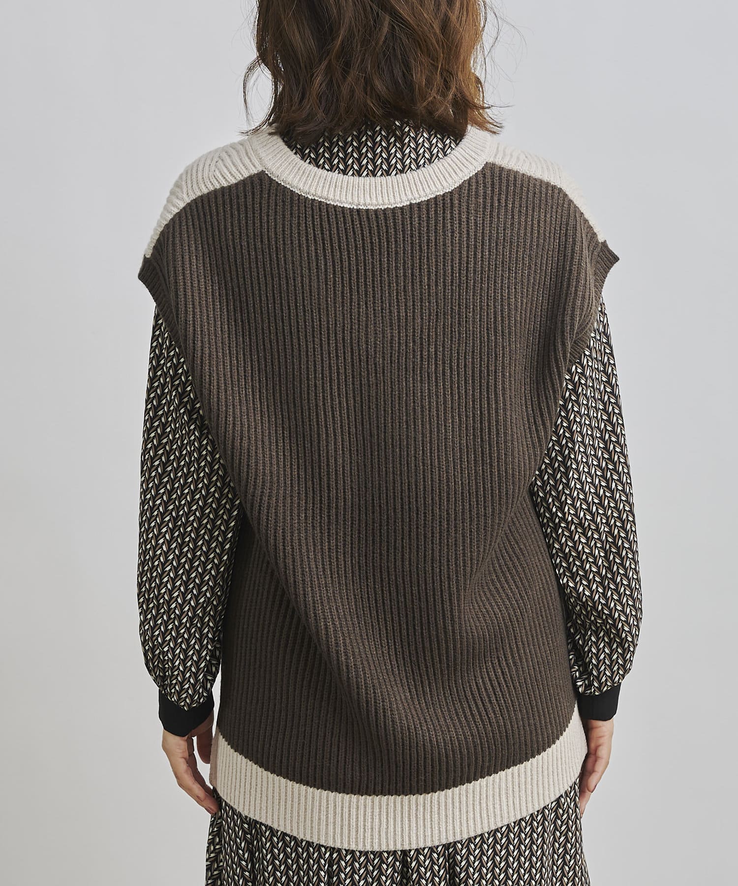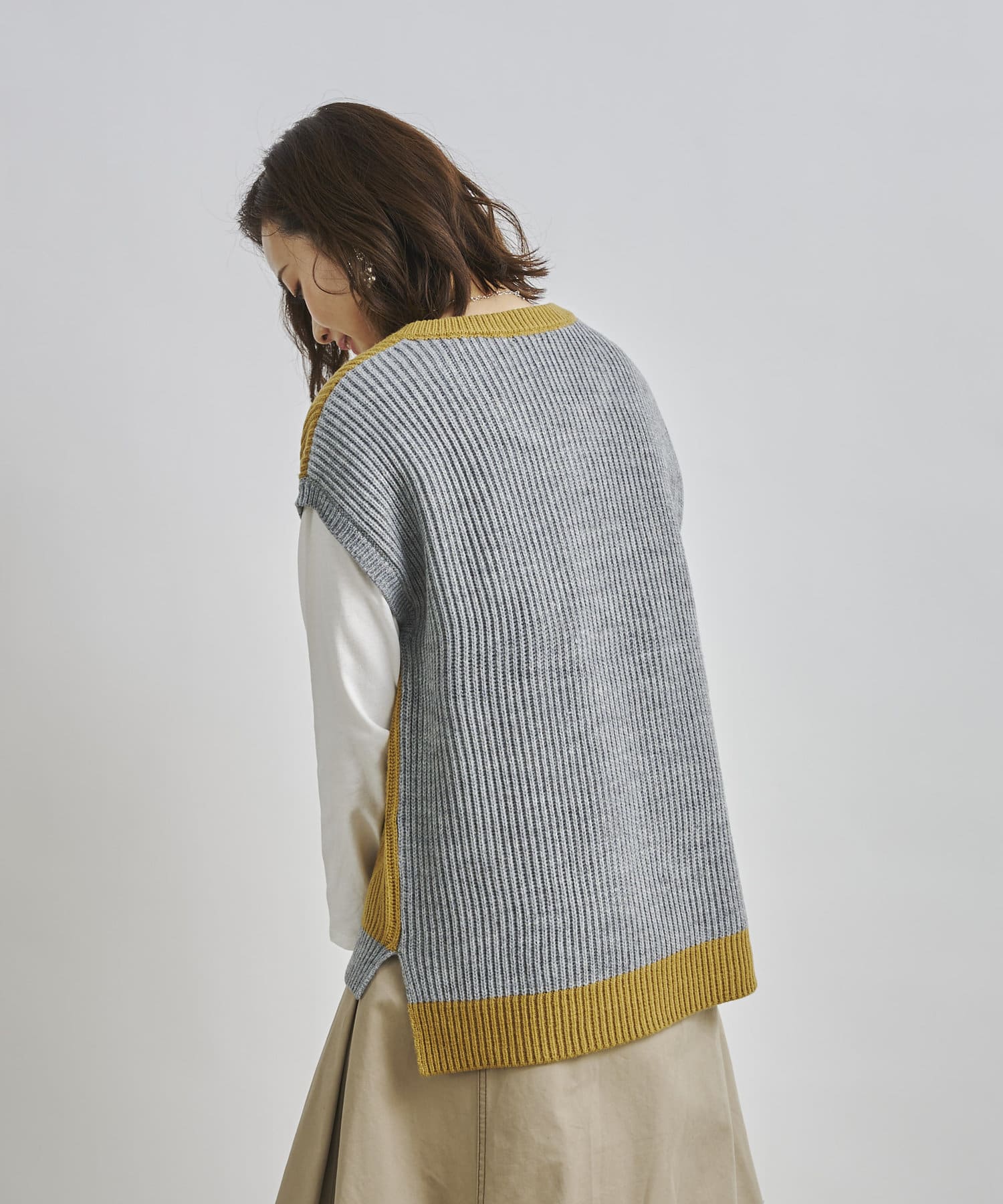 配色のバイカラーデザインのニットベスト 重ねるだけで旬な顔に