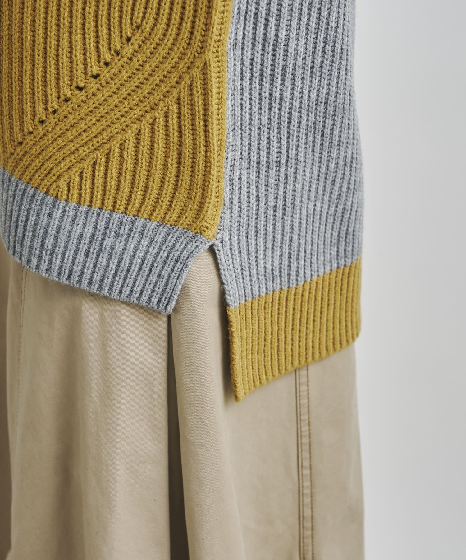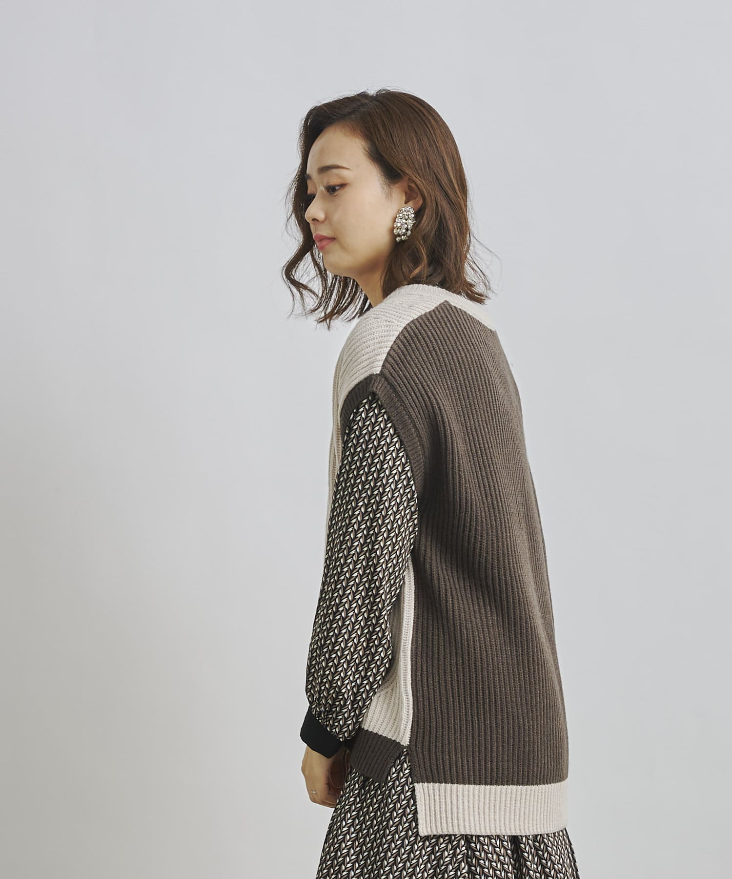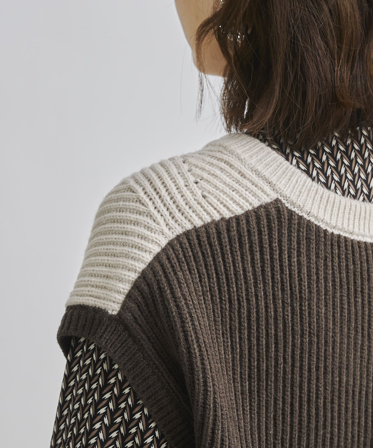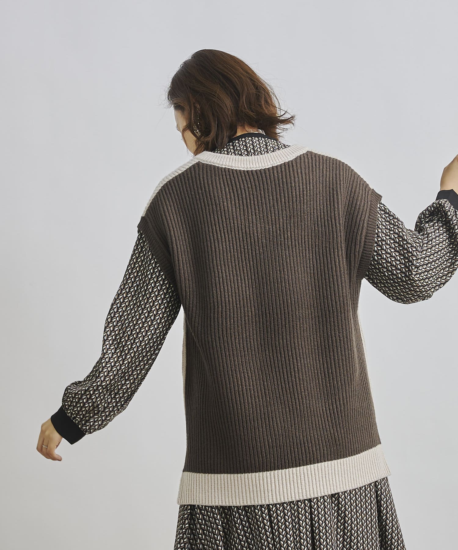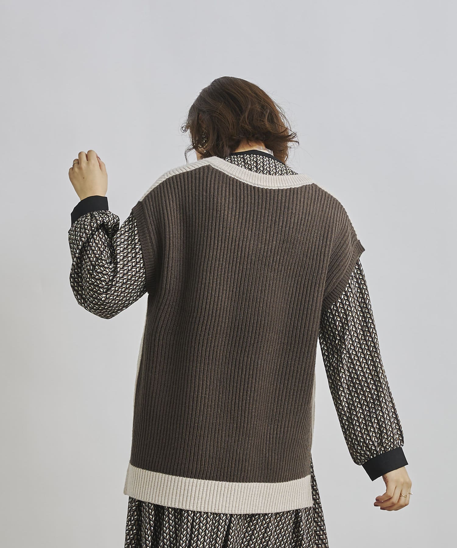 配色のバイカラーデザインのニットベスト 重ねるだけで旬な顔に