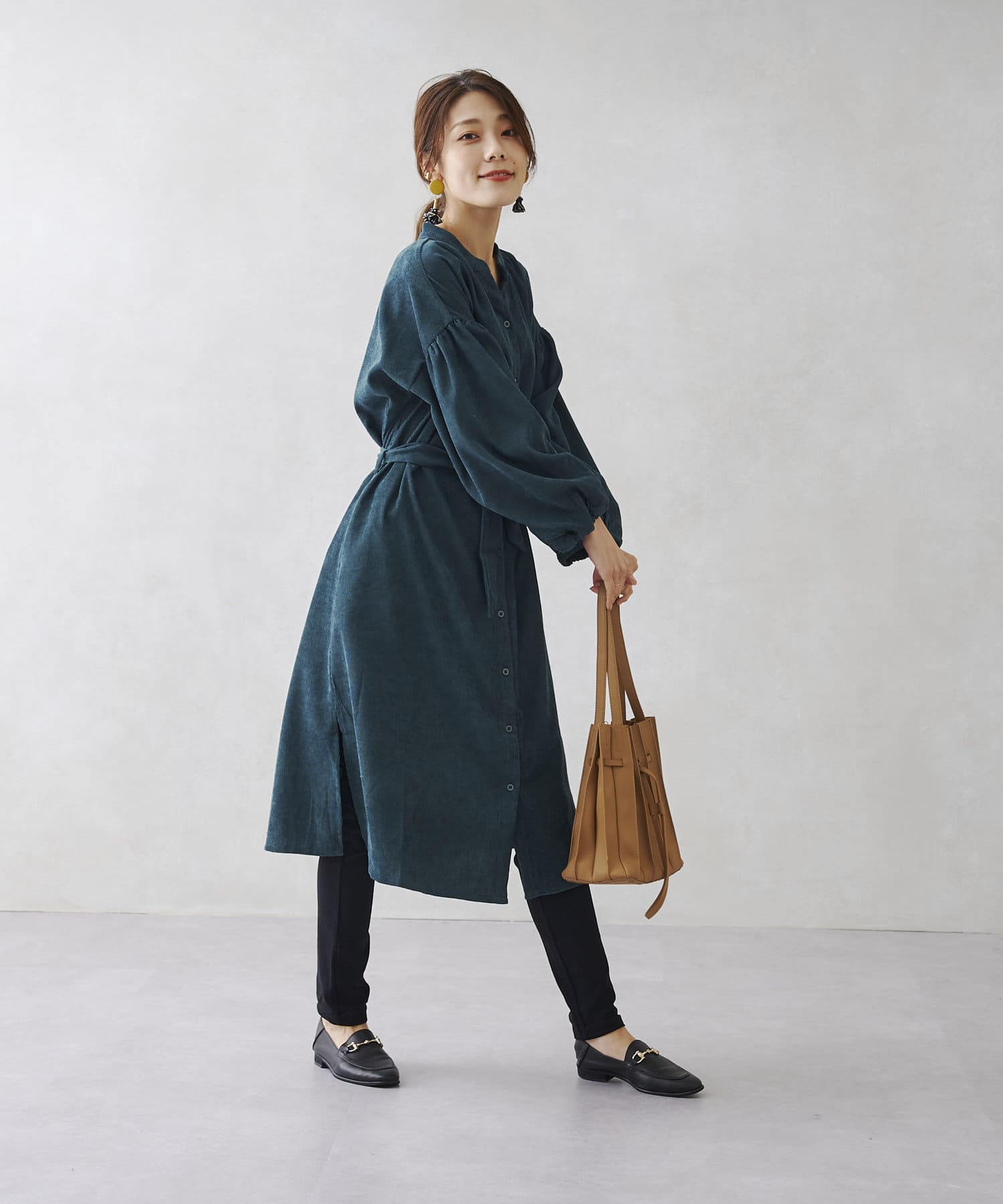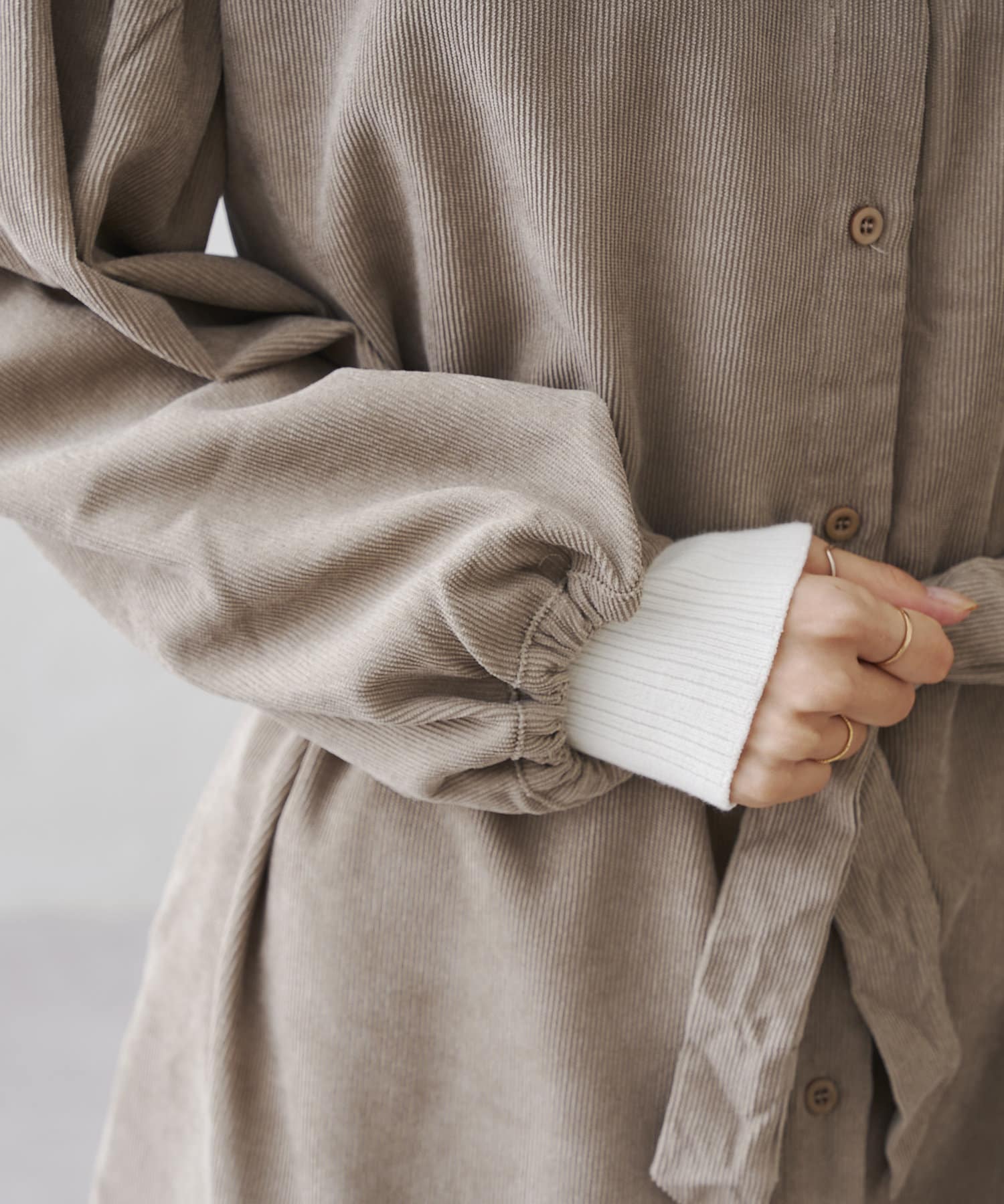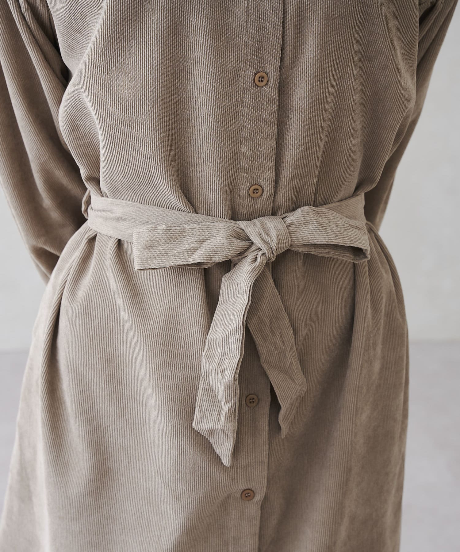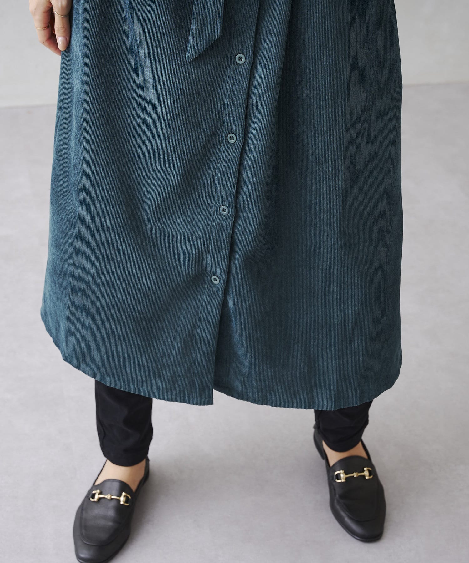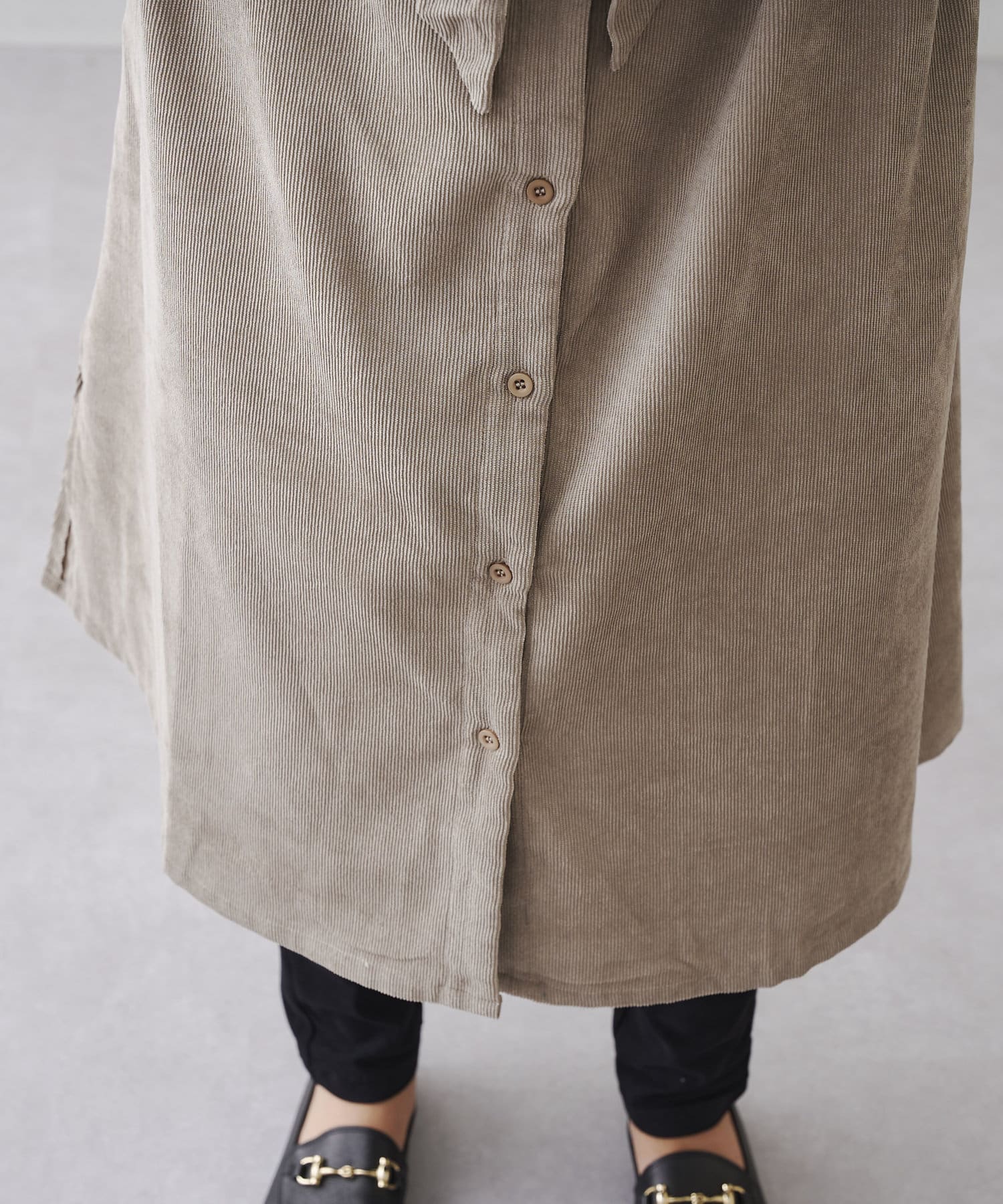 ・細コーデュロイのカジュアルになりすぎないコーデュロイシャツワンピー―ス
