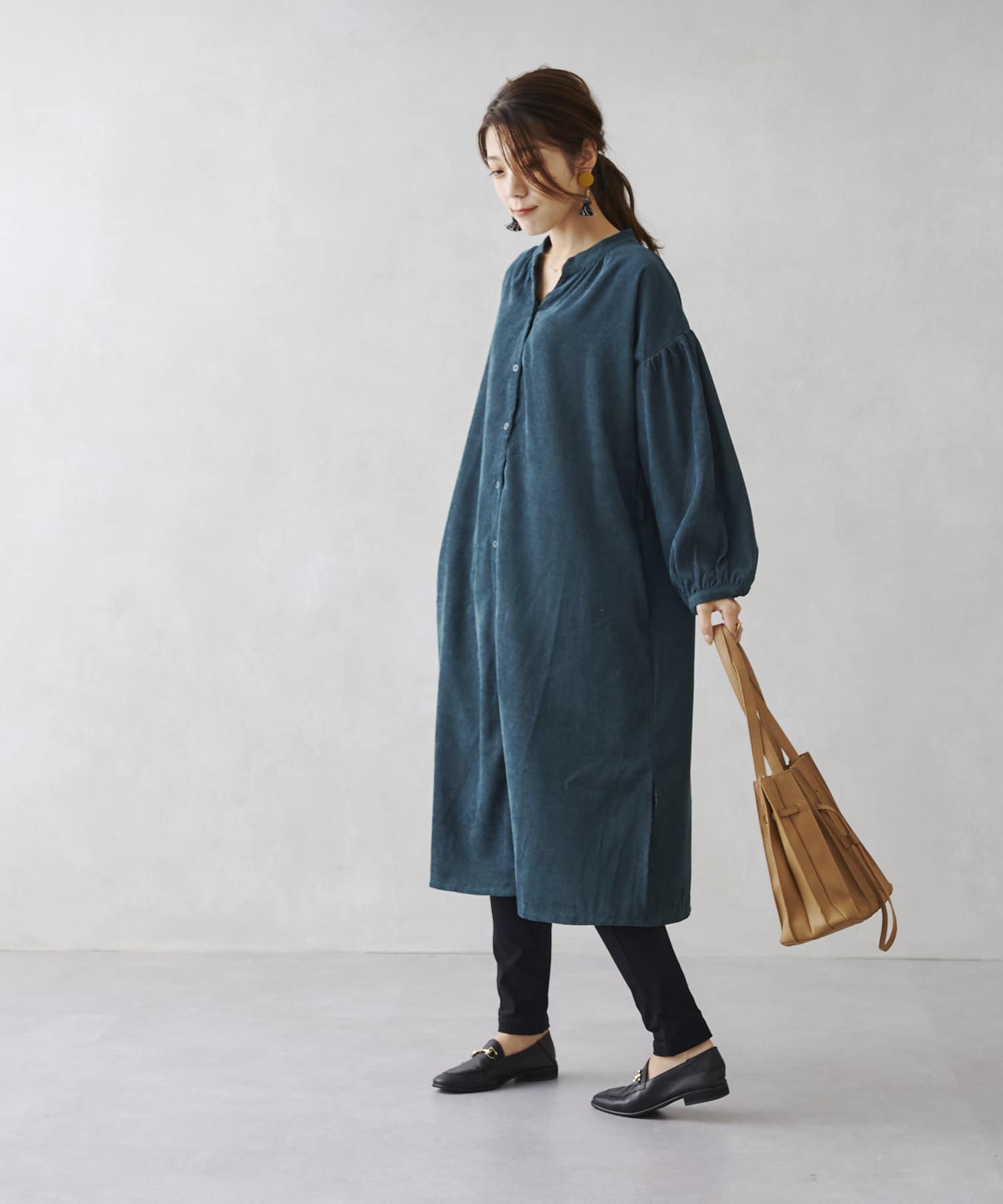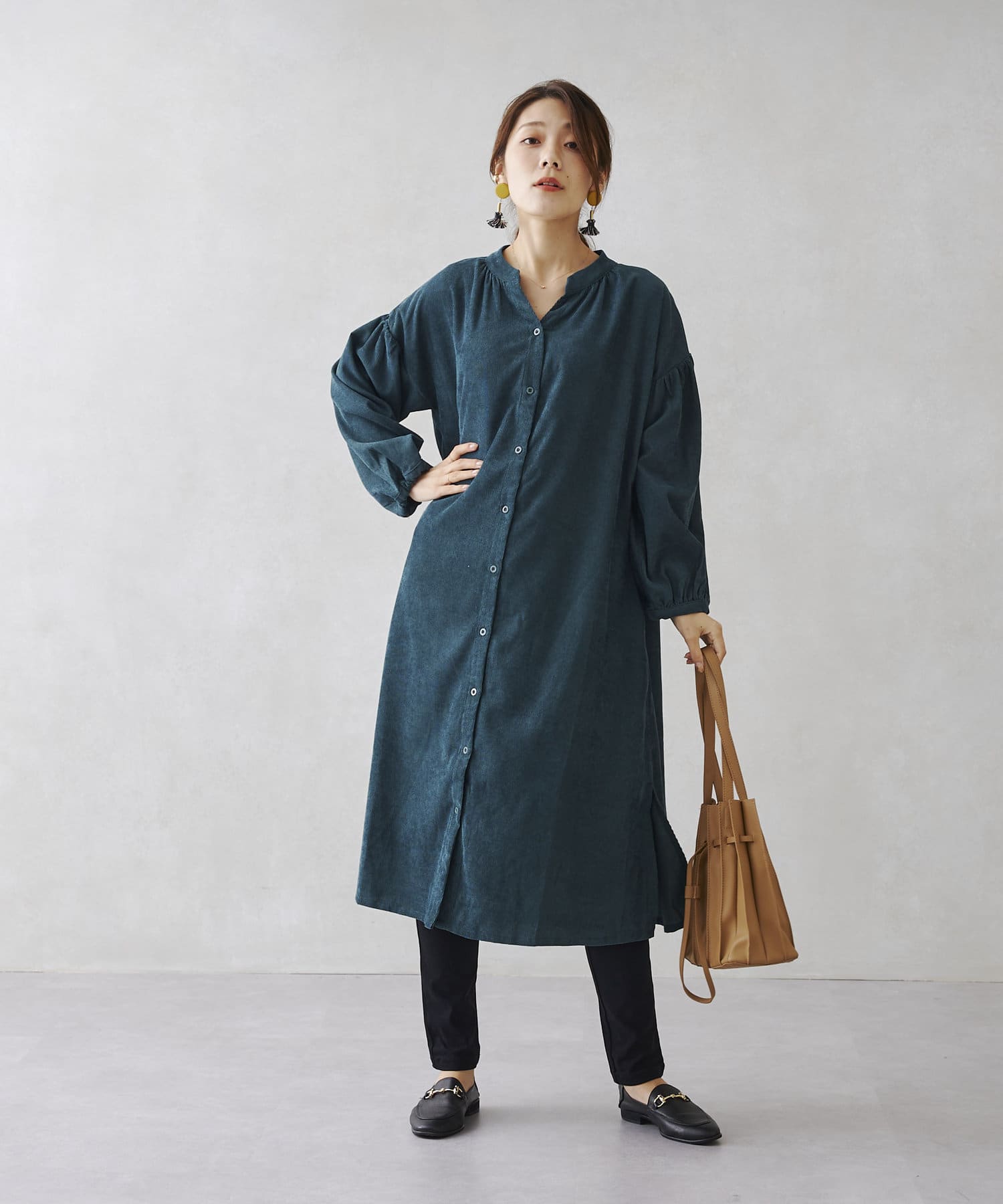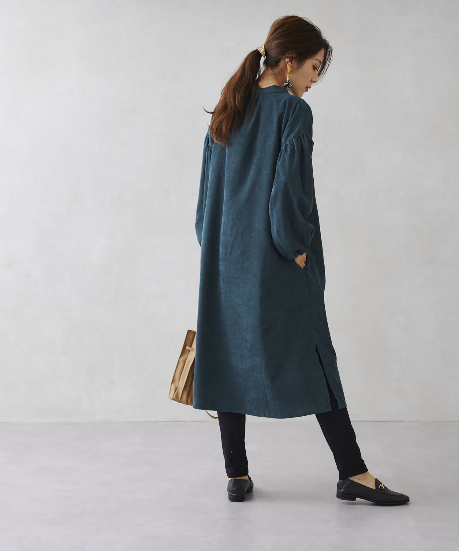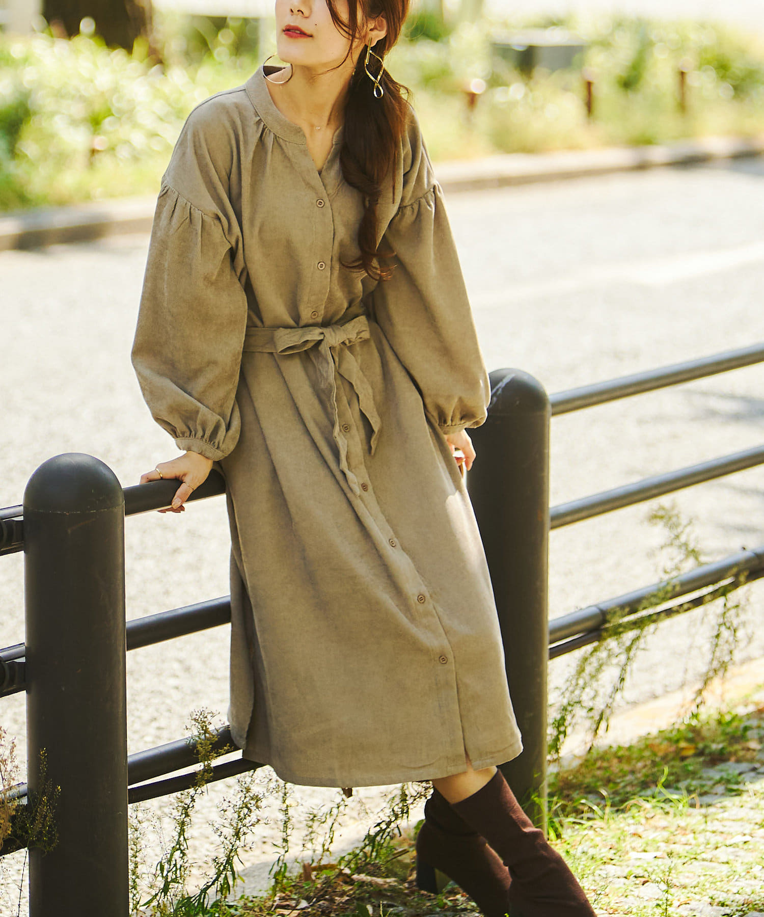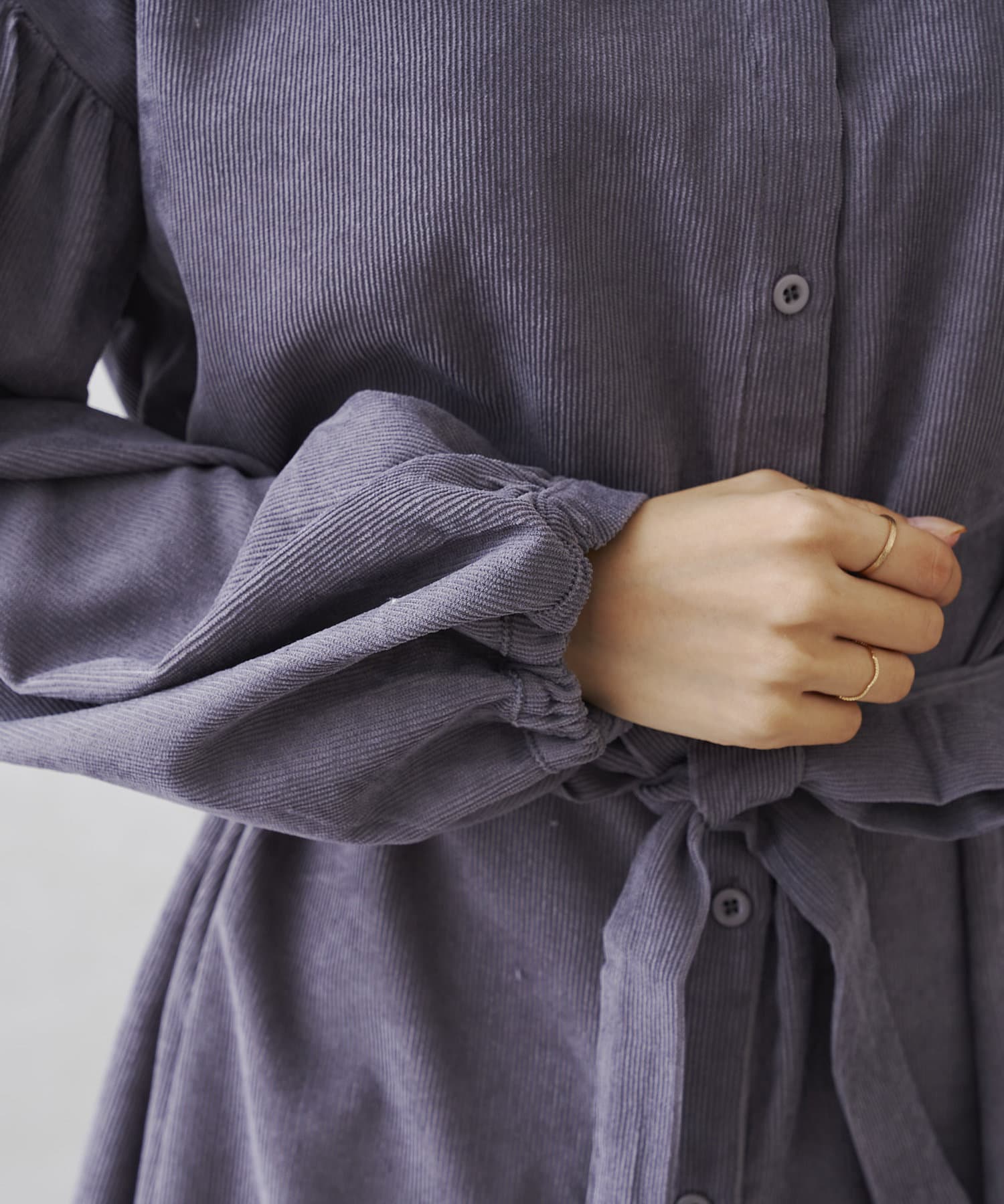 ・細コーデュロイのカジュアルになりすぎないコーデュロイシャツワンピー―ス
