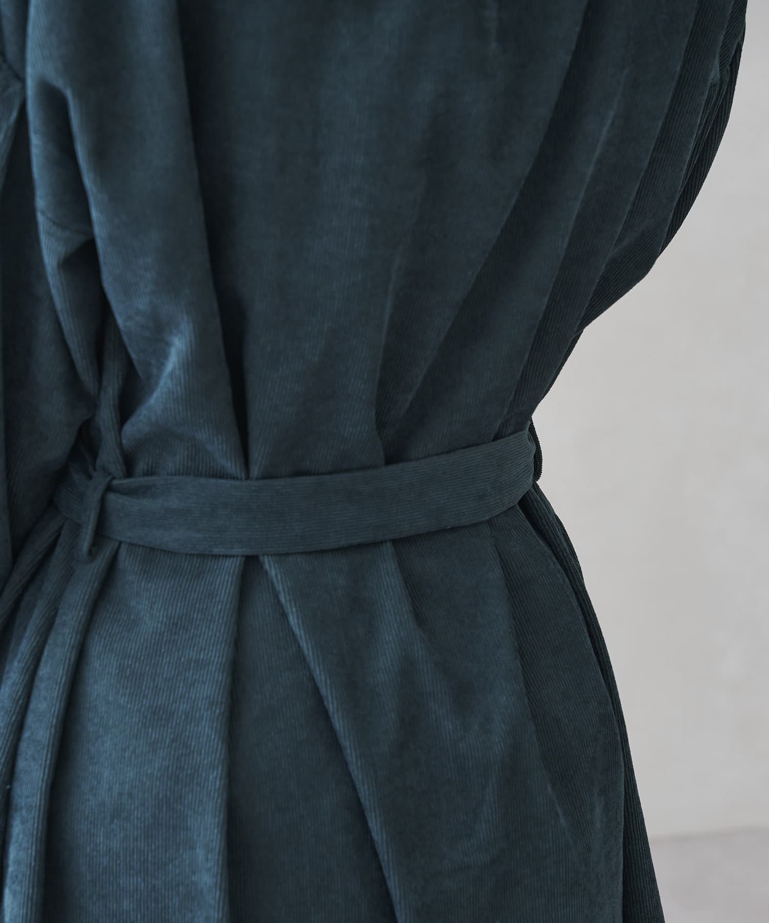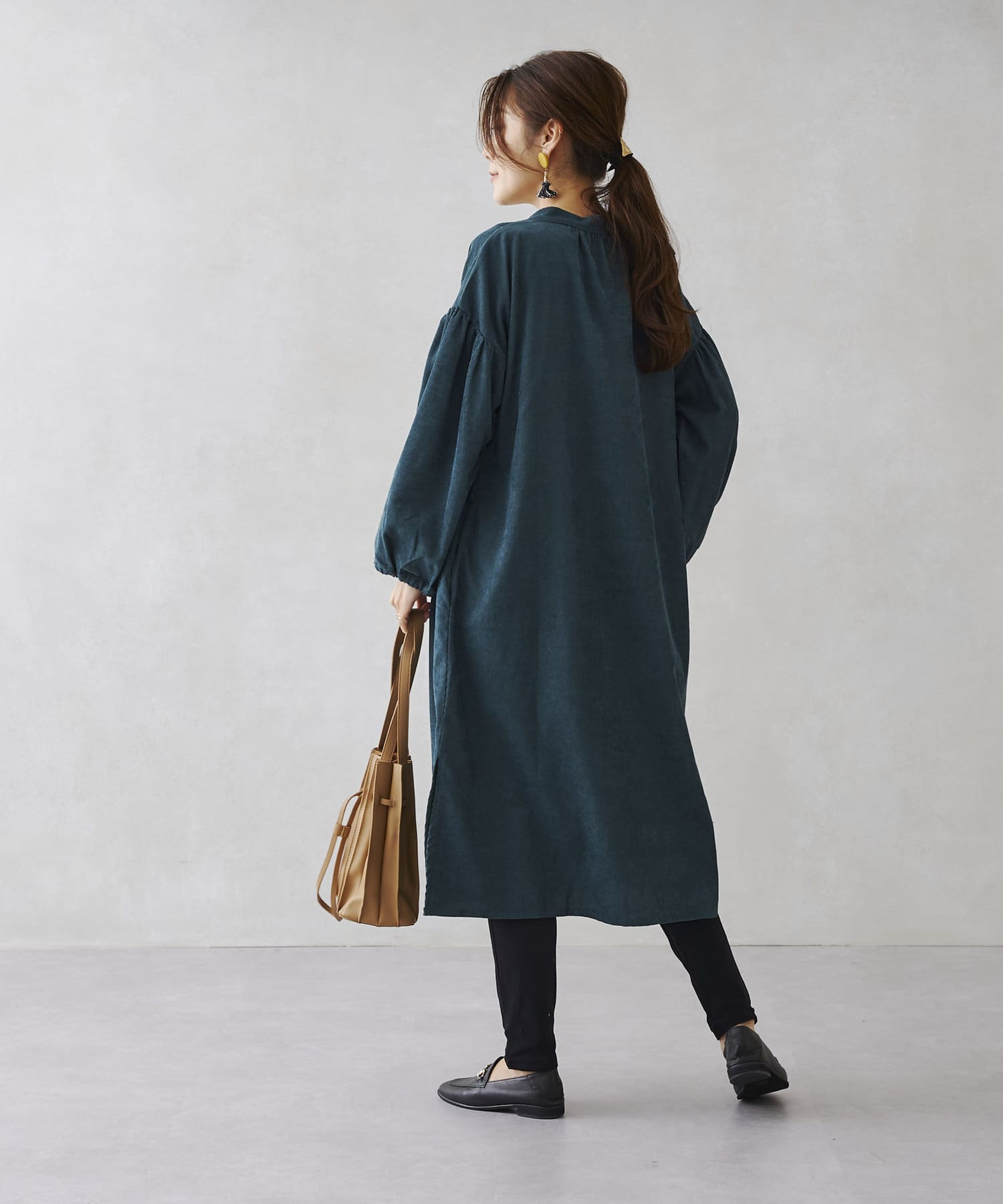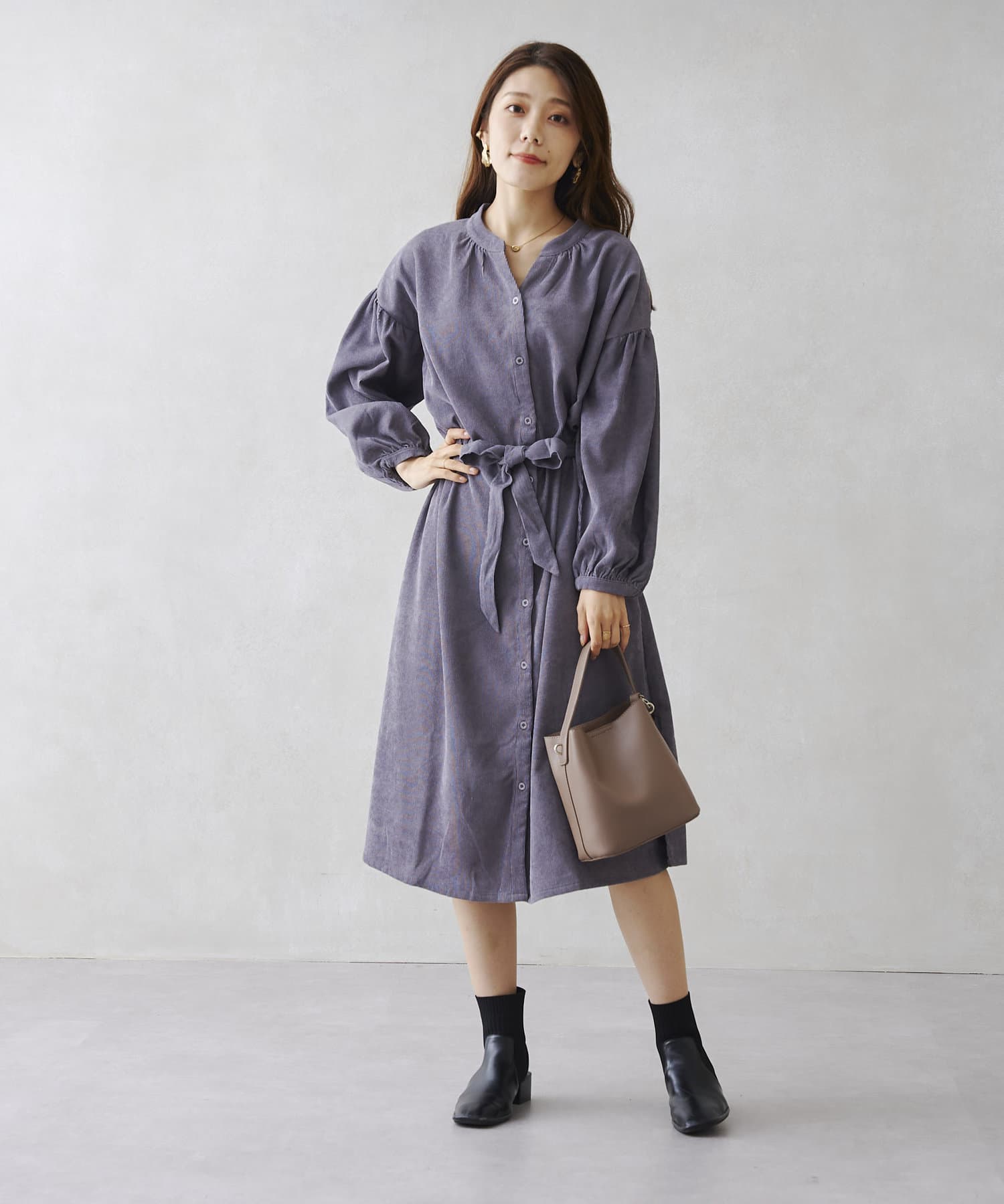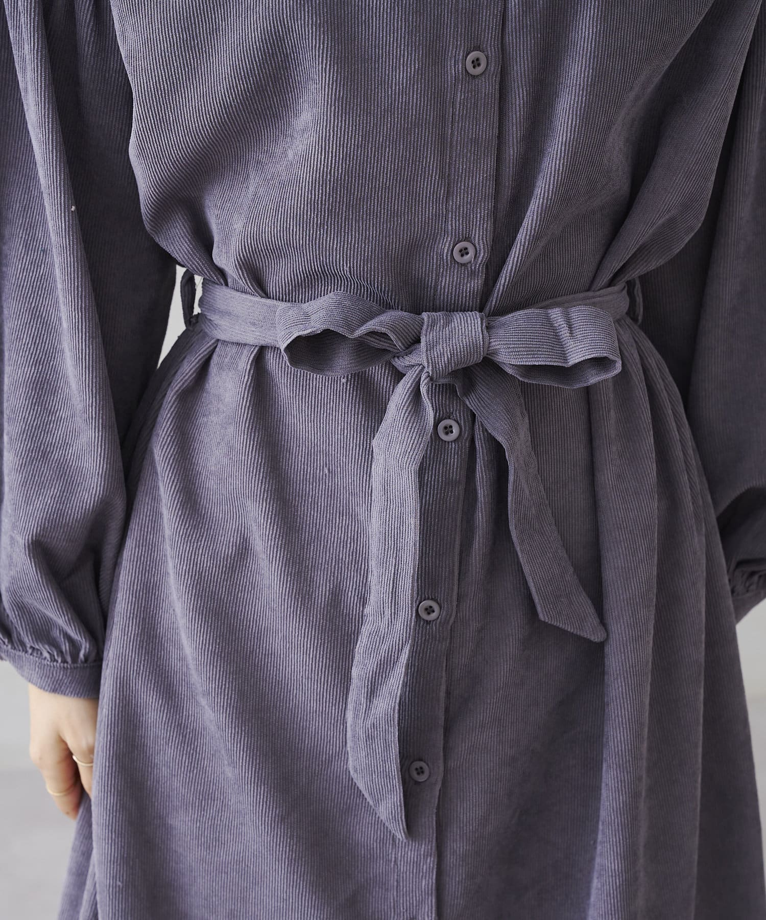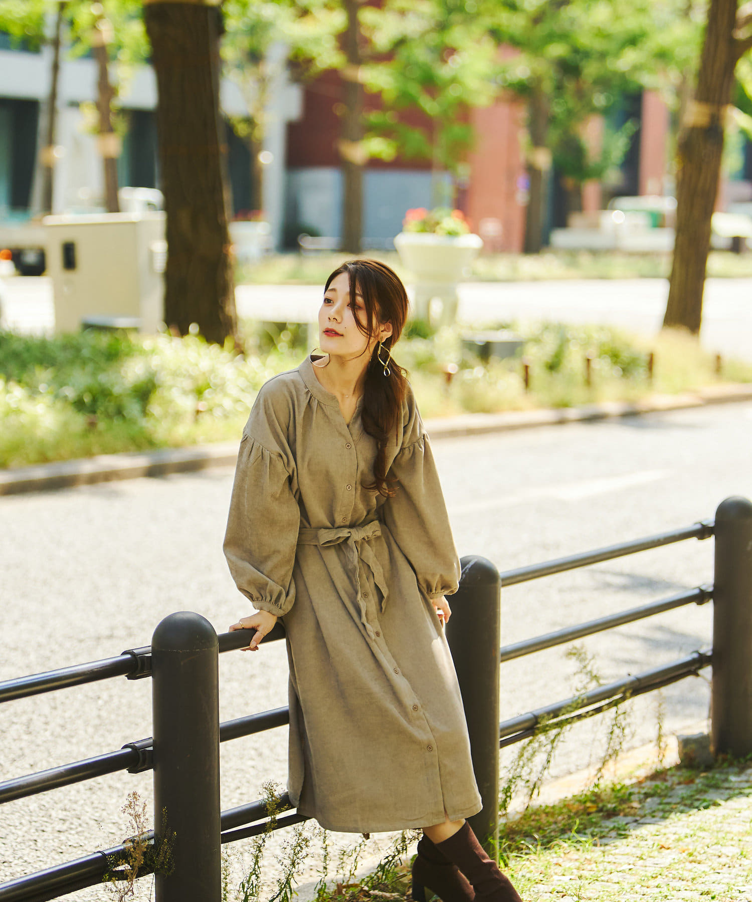 ・細コーデュロイのカジュアルになりすぎないコーデュロイシャツワンピー―ス