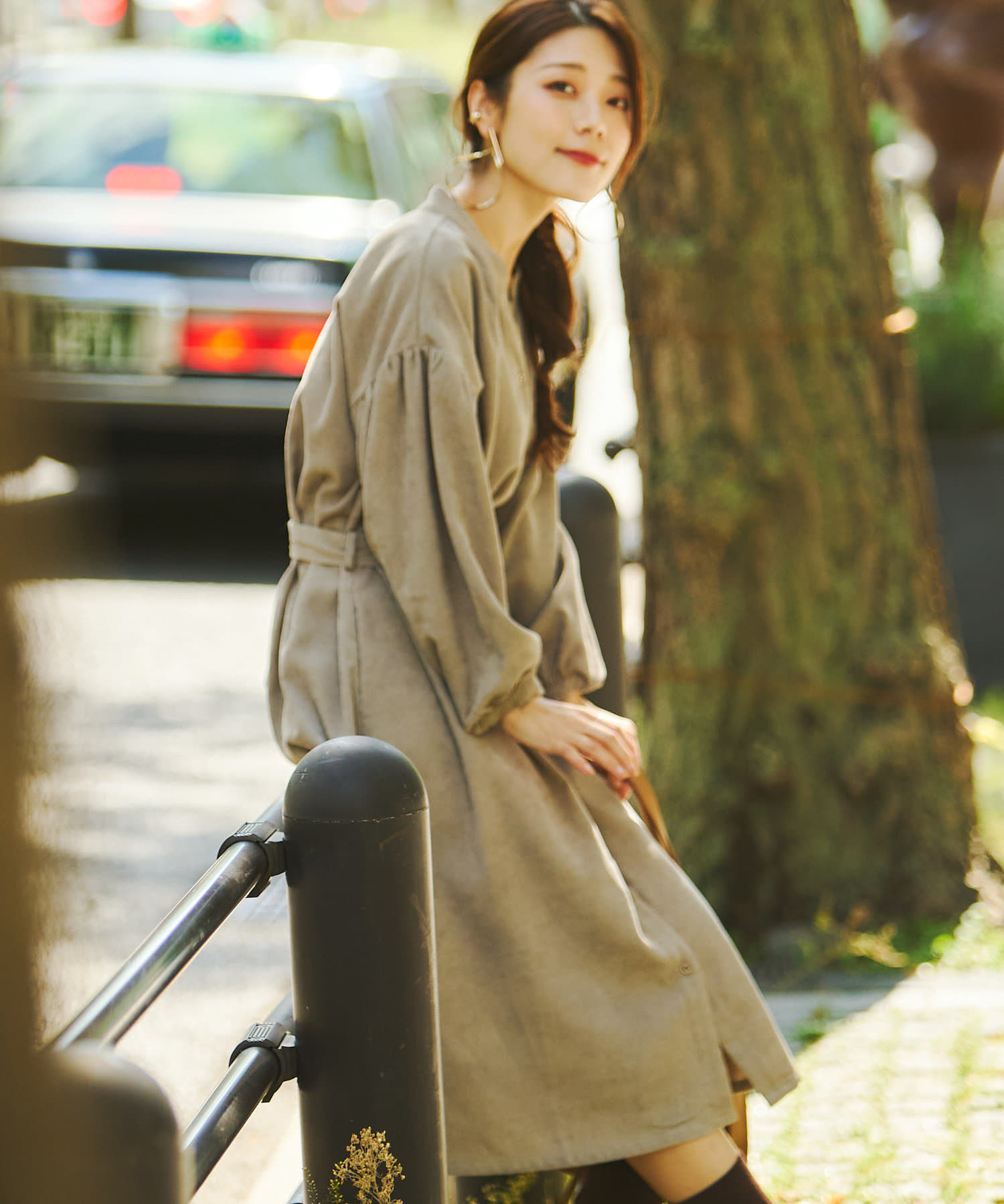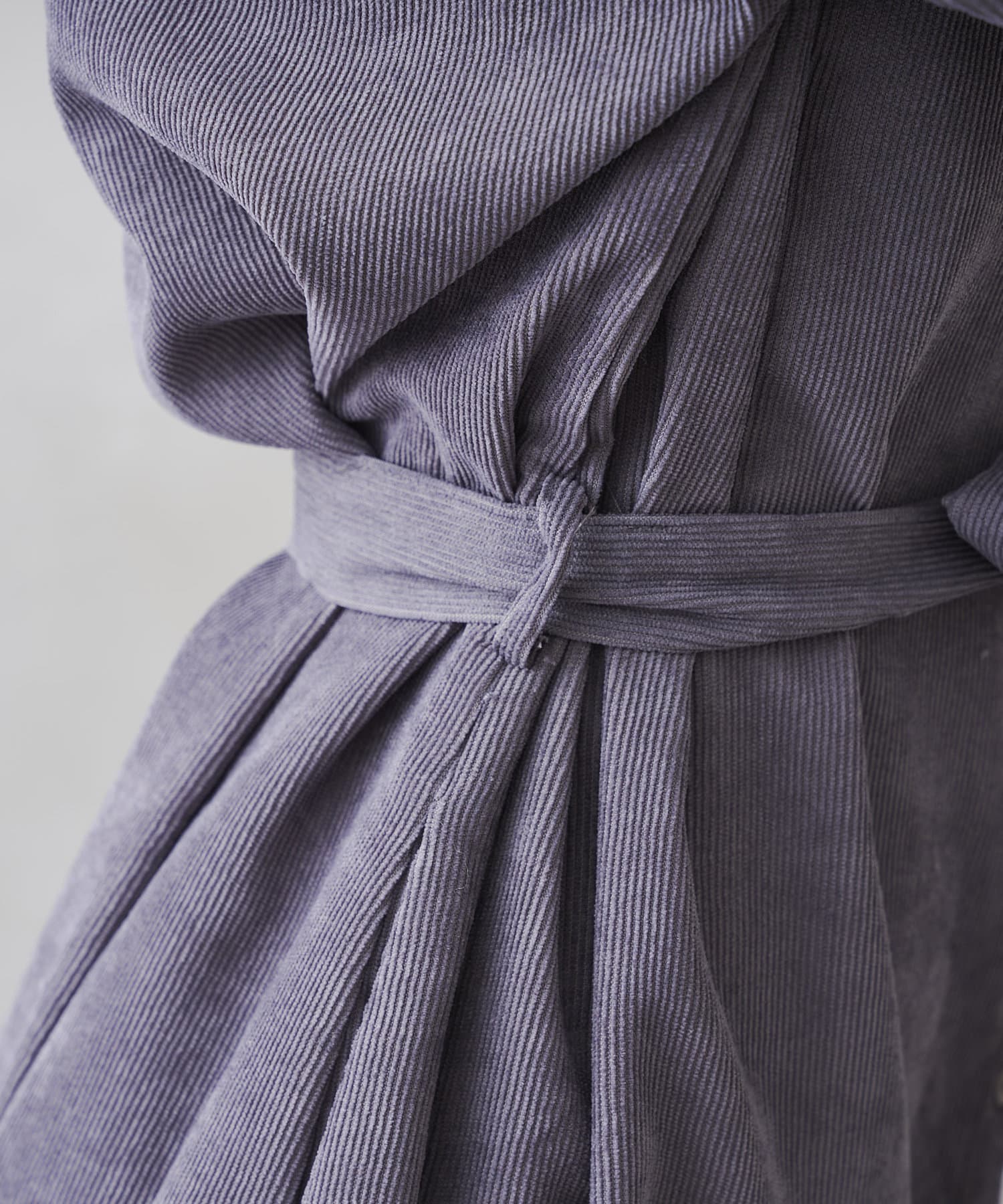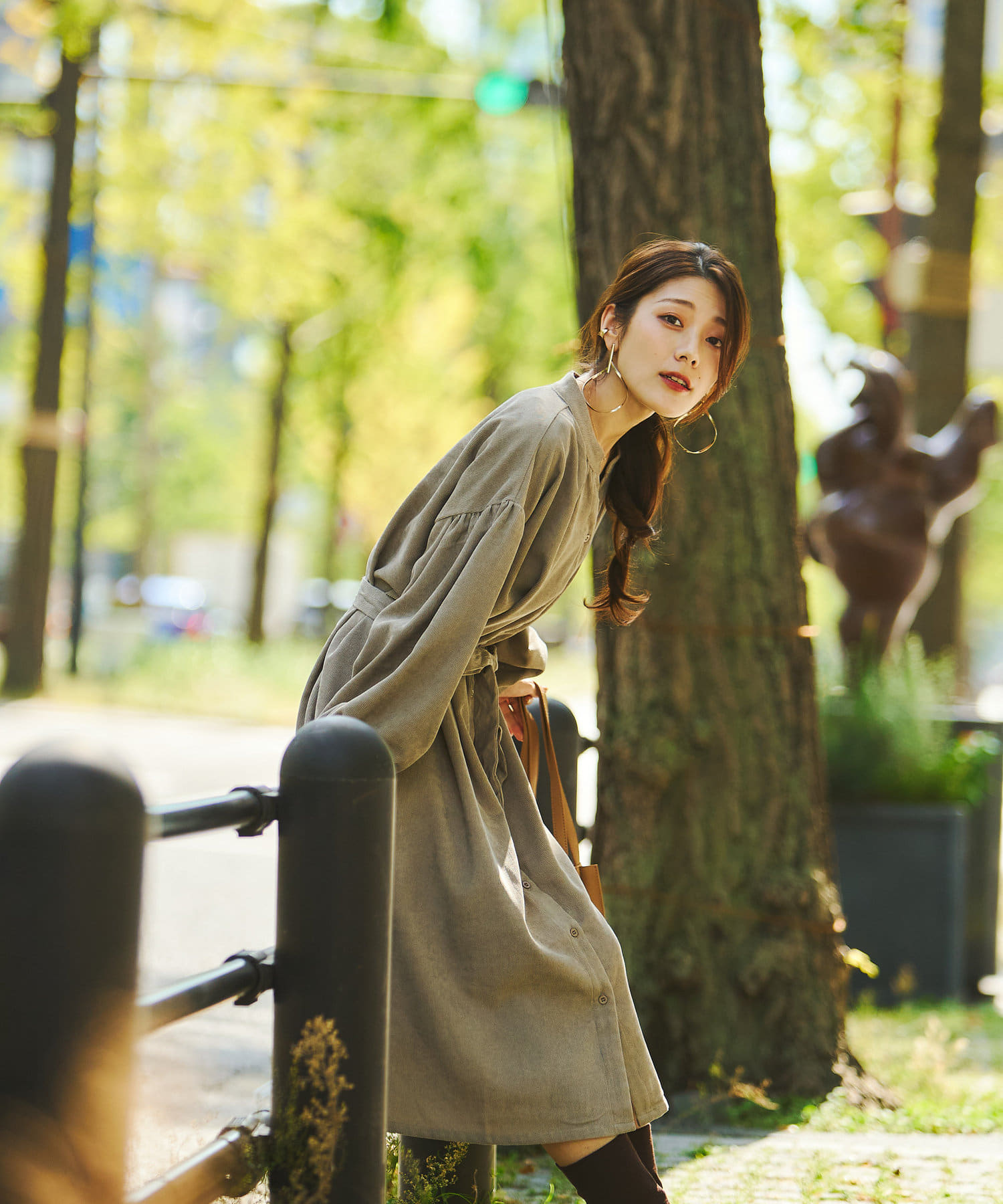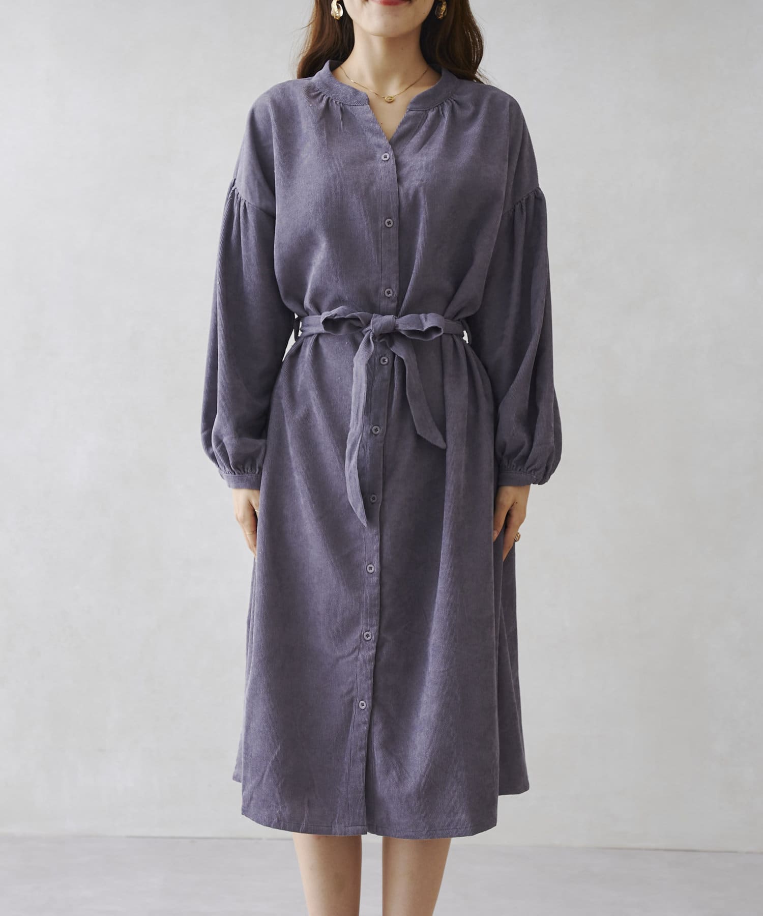 ・細コーデュロイのカジュアルになりすぎないコーデュロイシャツワンピー―ス