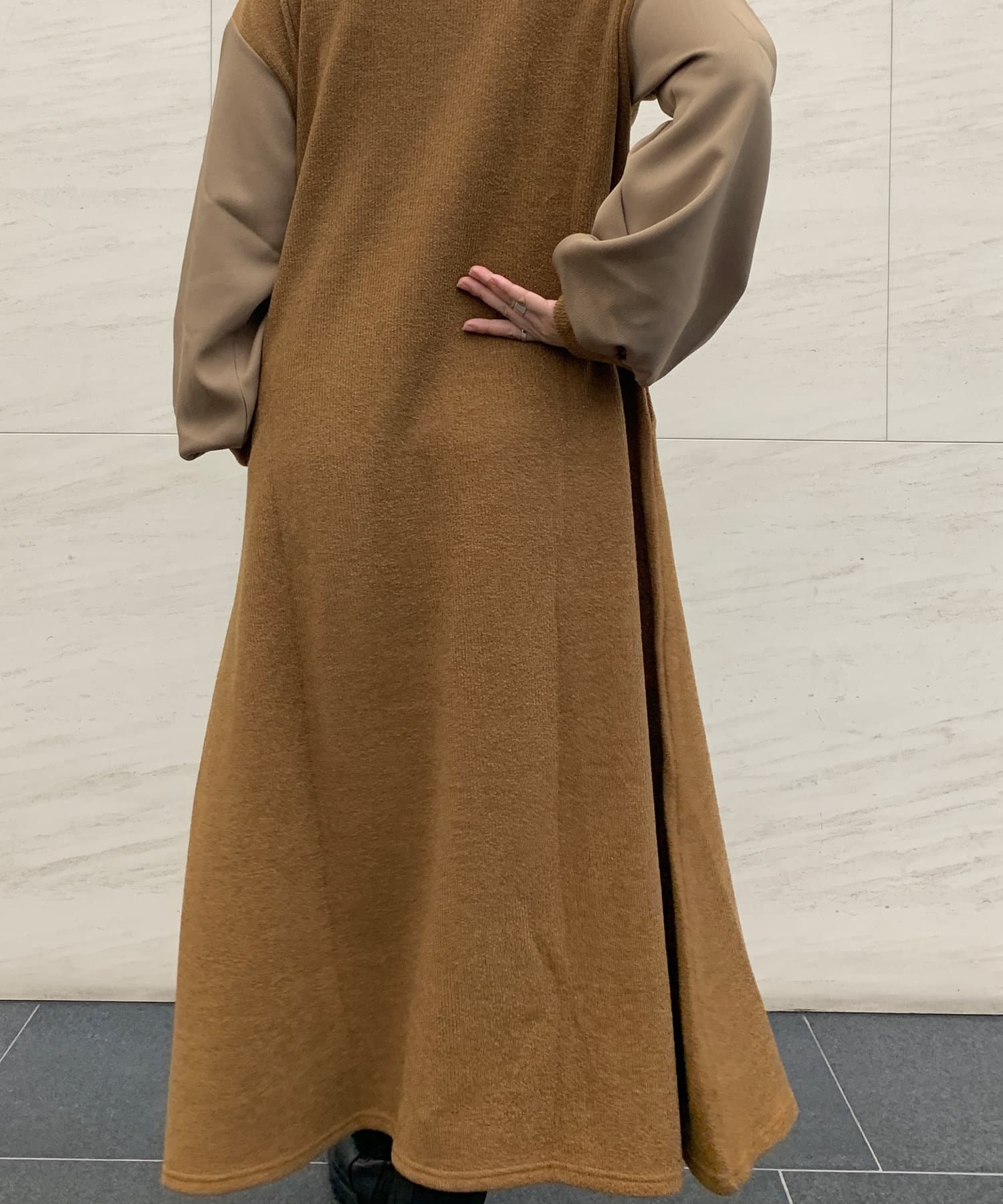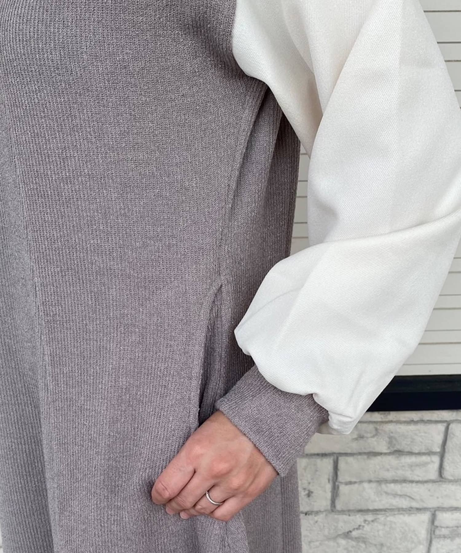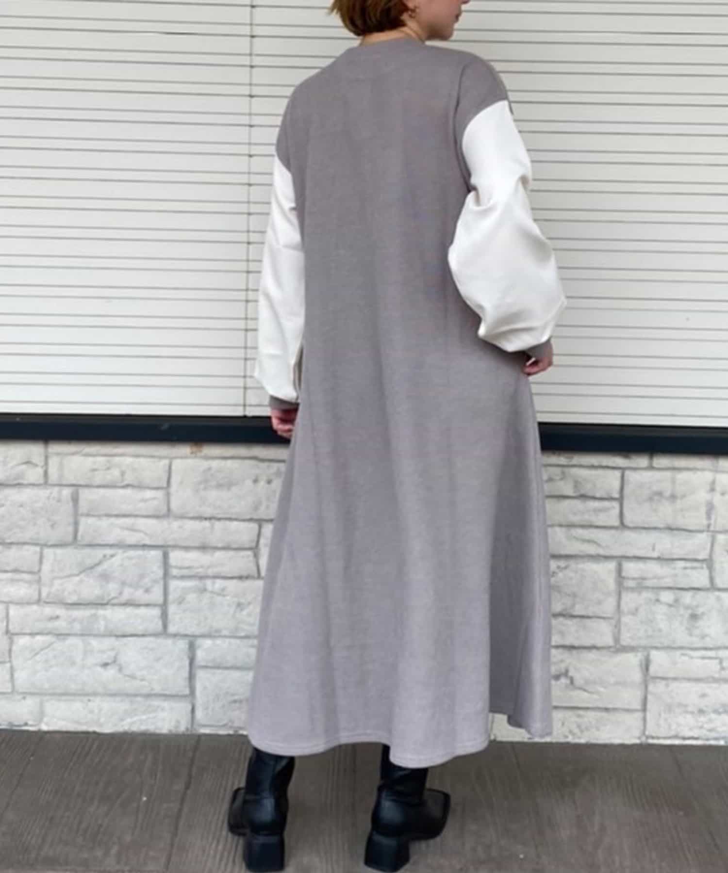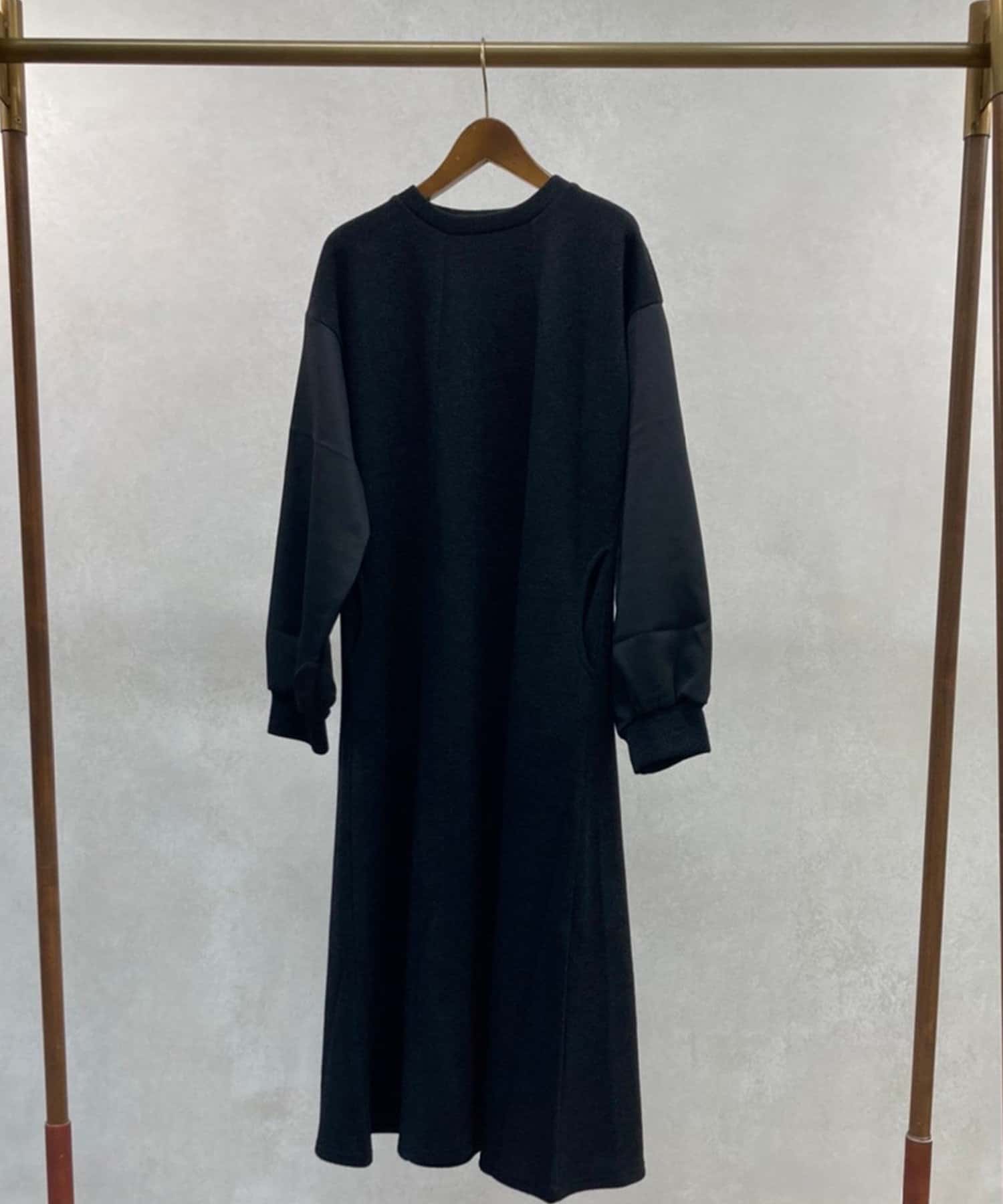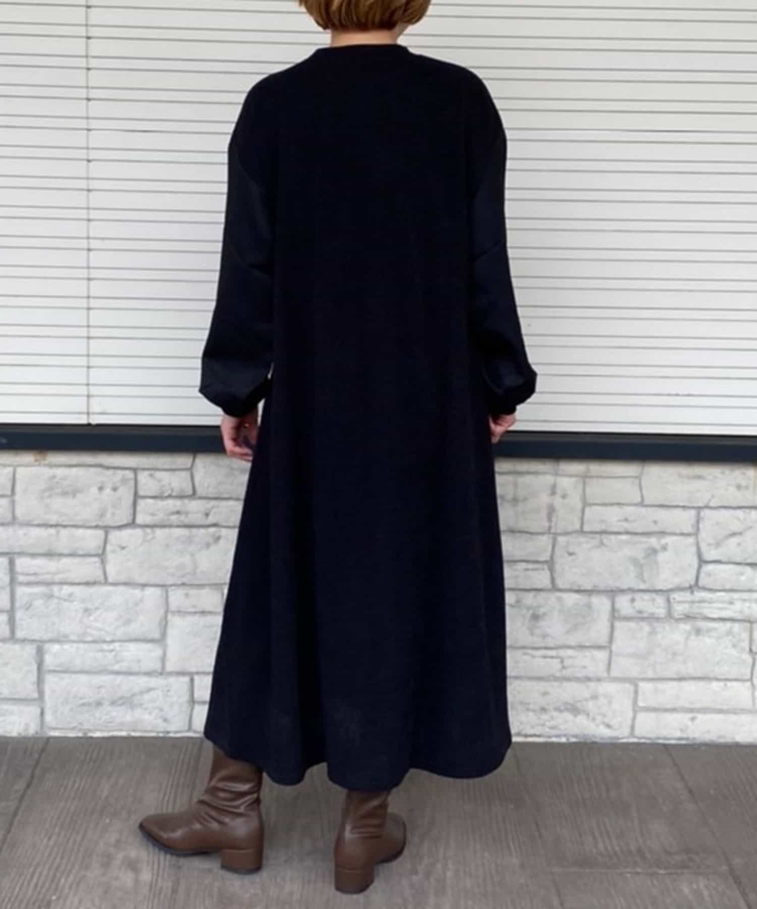 ・袖は布帛になっているのでアウターを羽織る季節にもレイヤードしやすいワンピース。