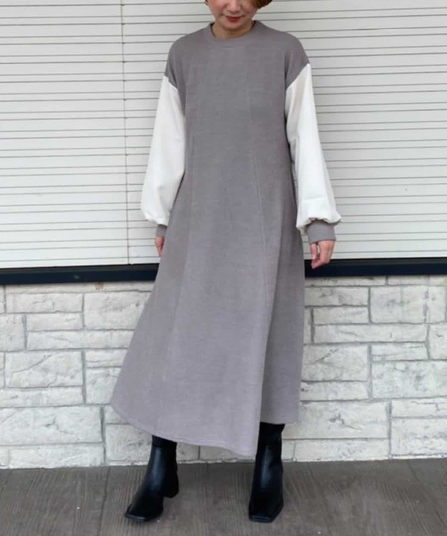 体型カバーに嬉しいAラインワンピース。袖の布帛切替が柔らかい雰囲気をプラスしてくれる