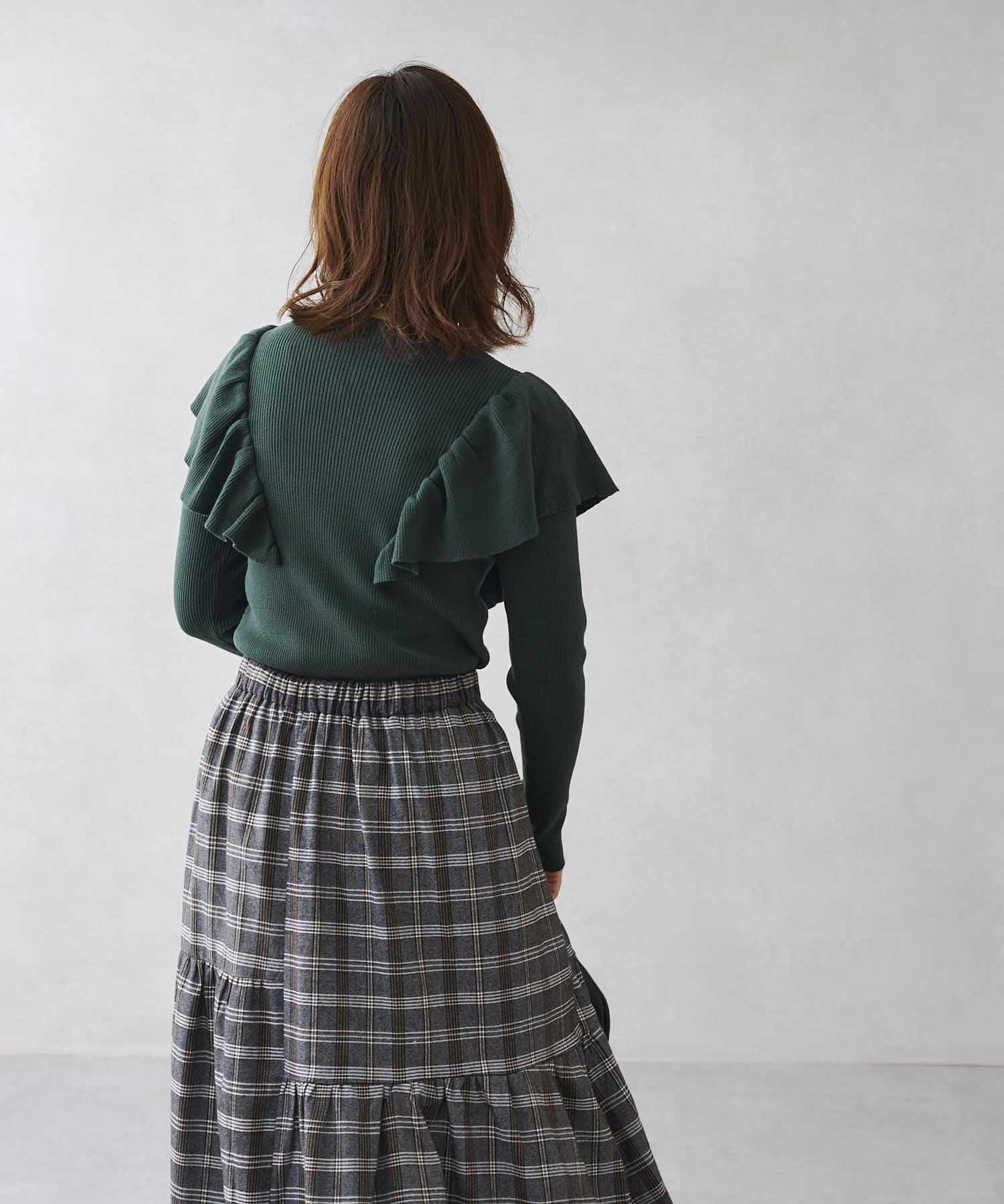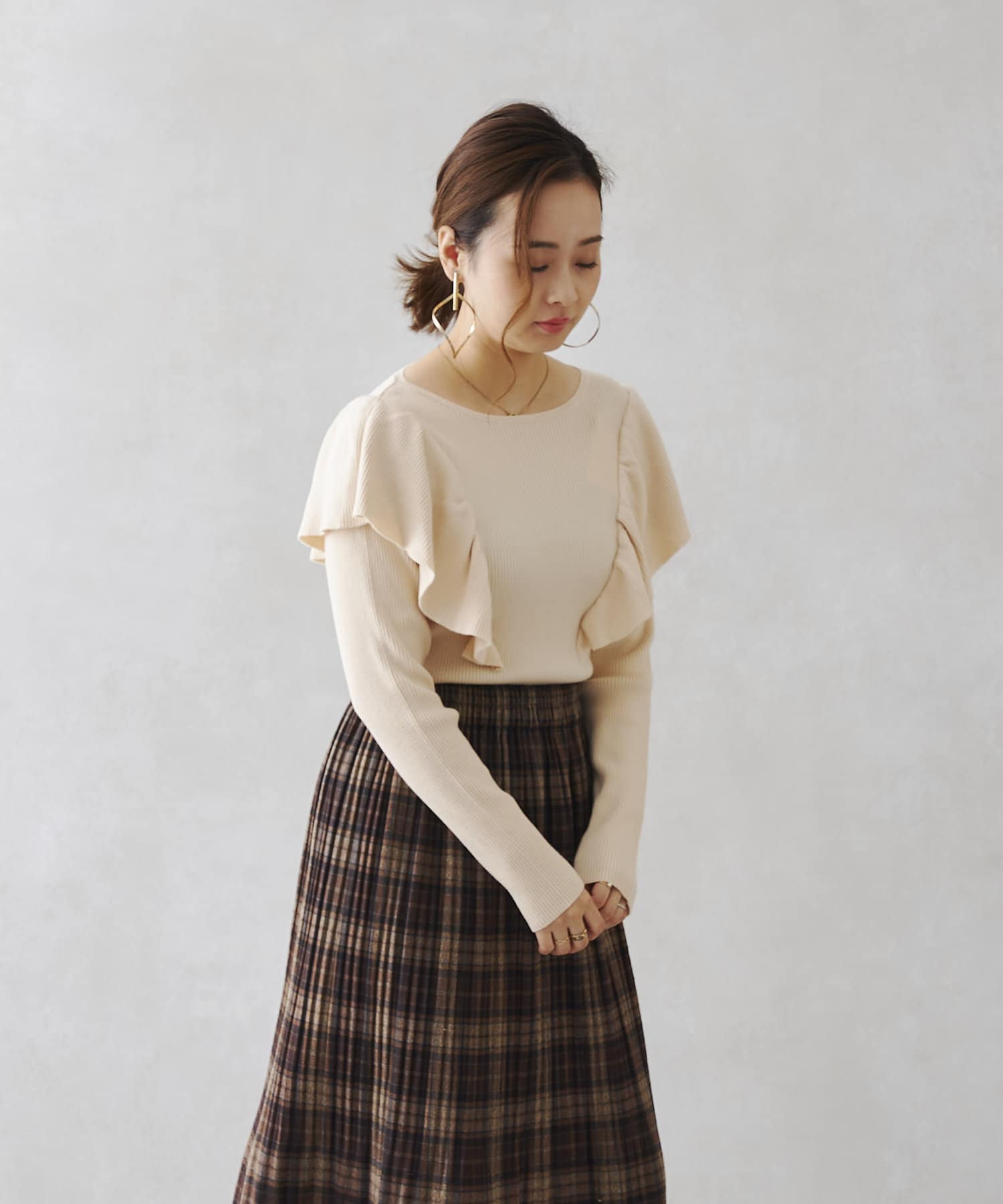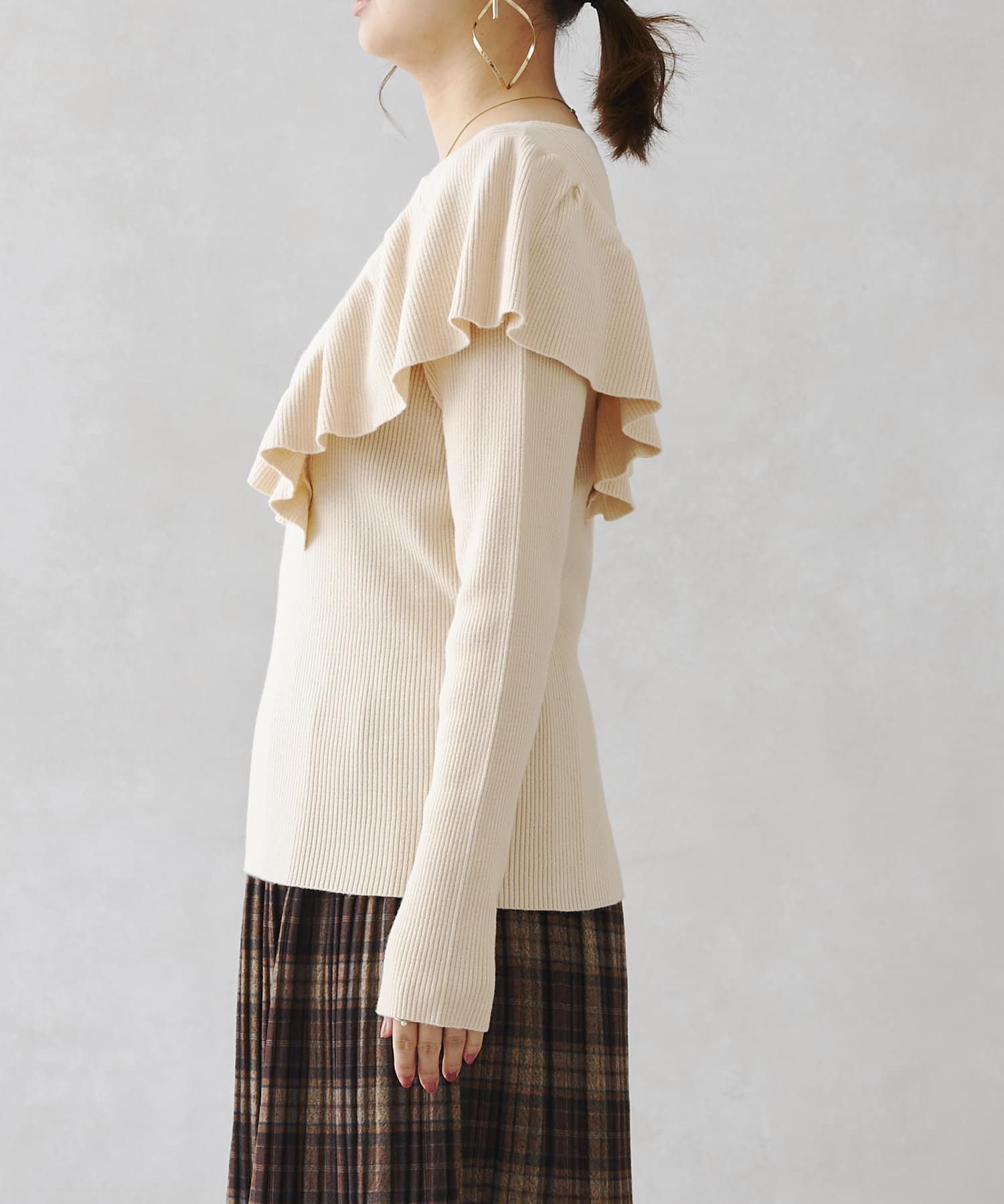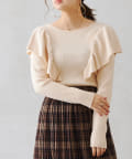シンプルなニットにフリルを施された1着。かわいくなりすぎないので