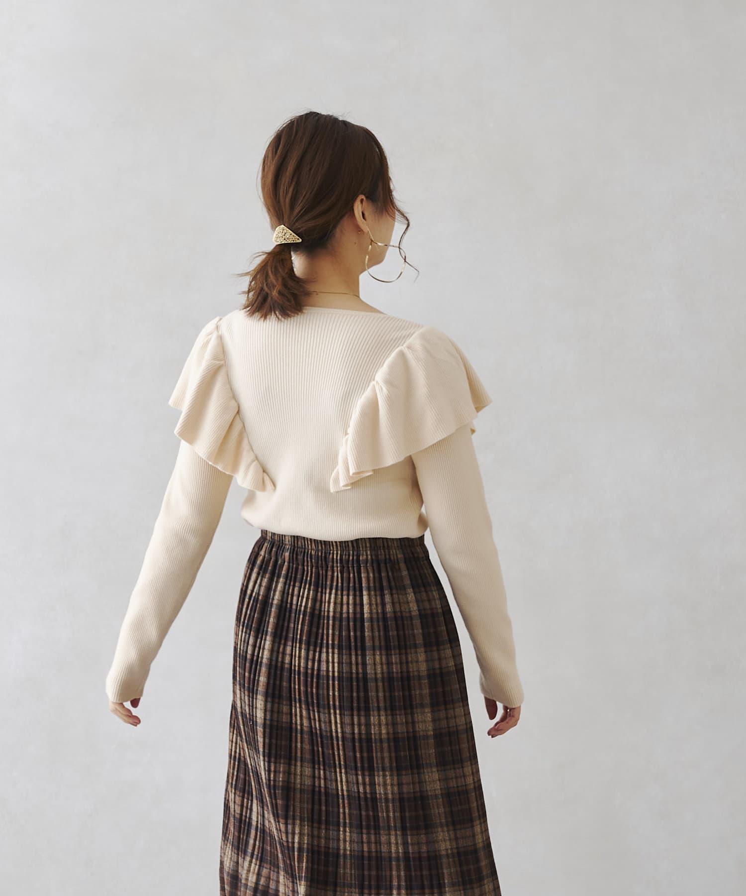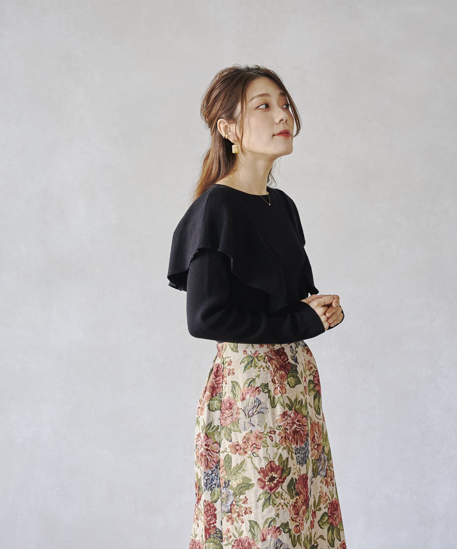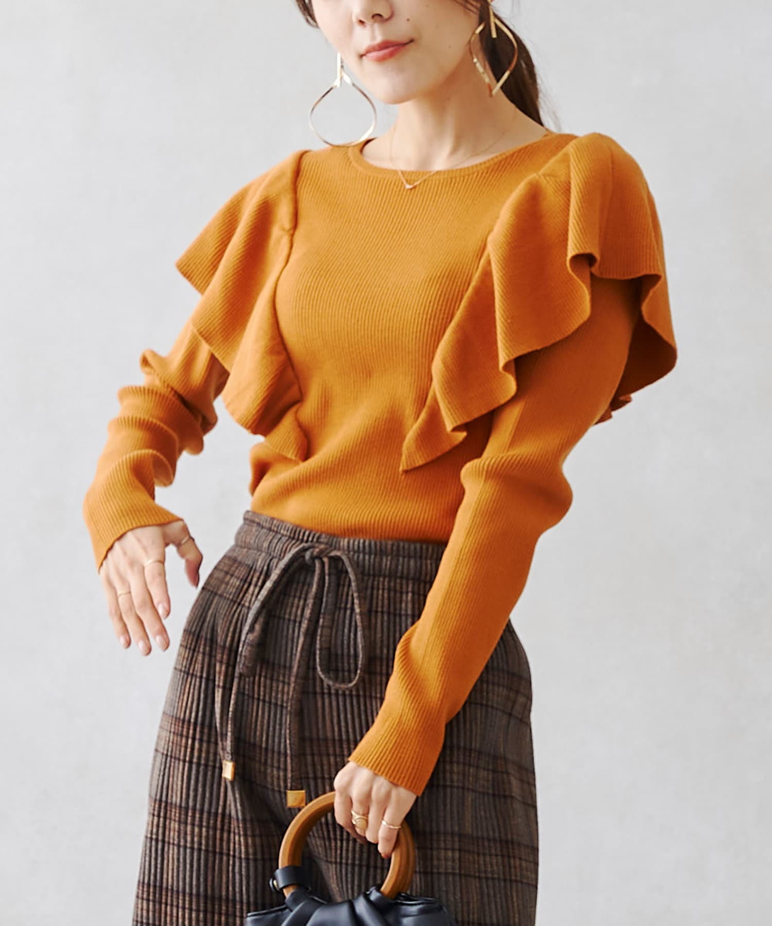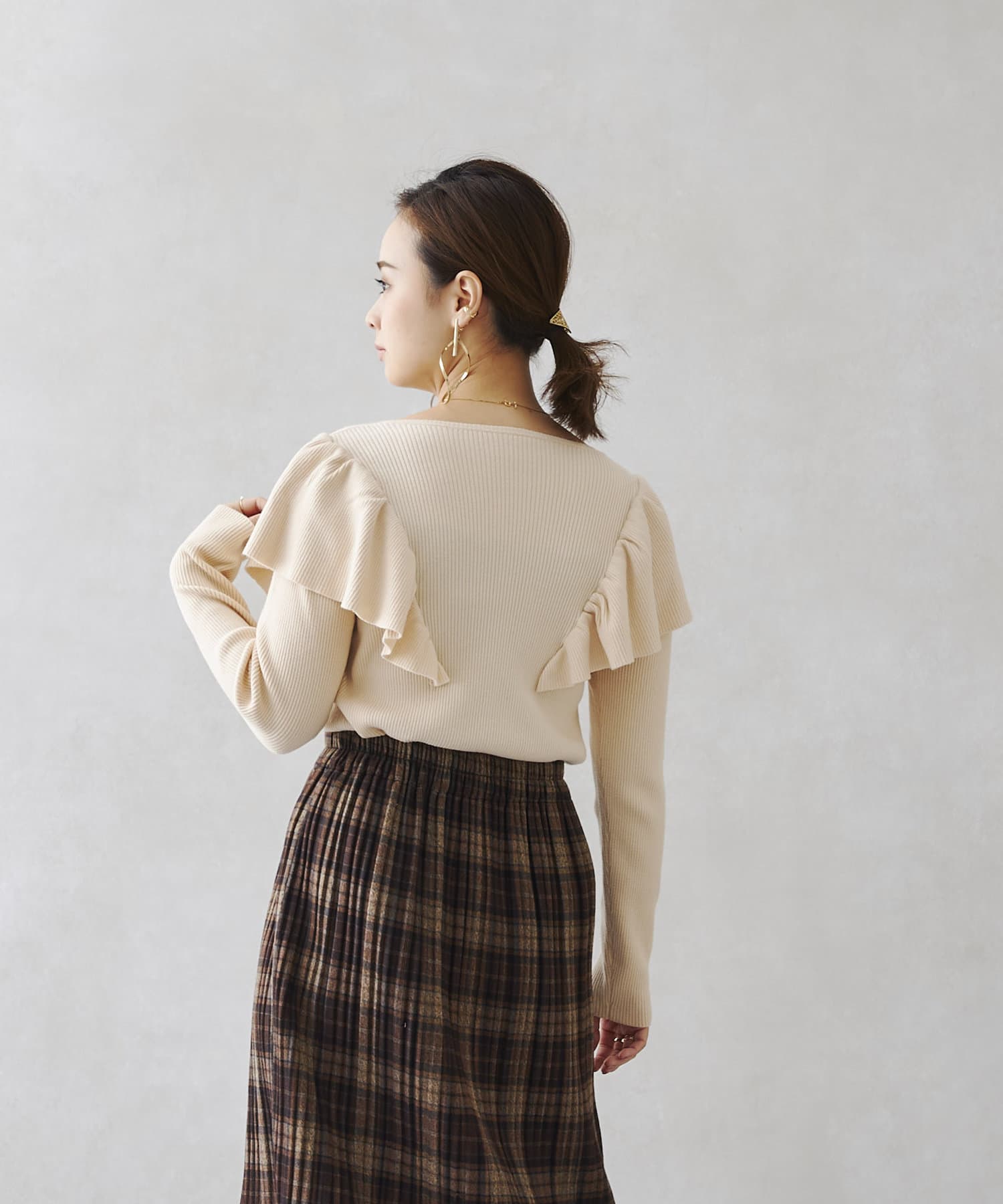 肩にフリルを施した今季注目のオトナフェミニンなニット