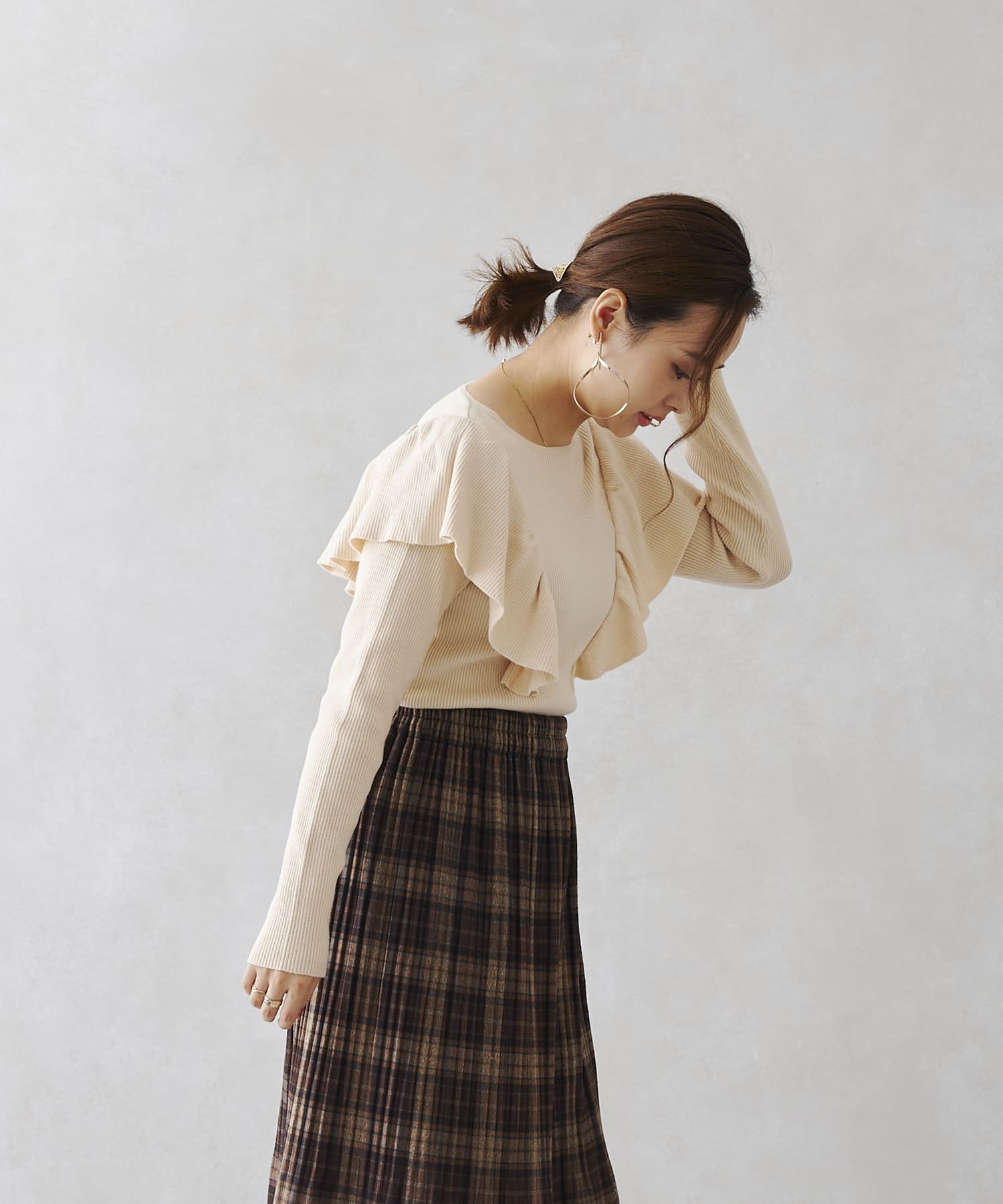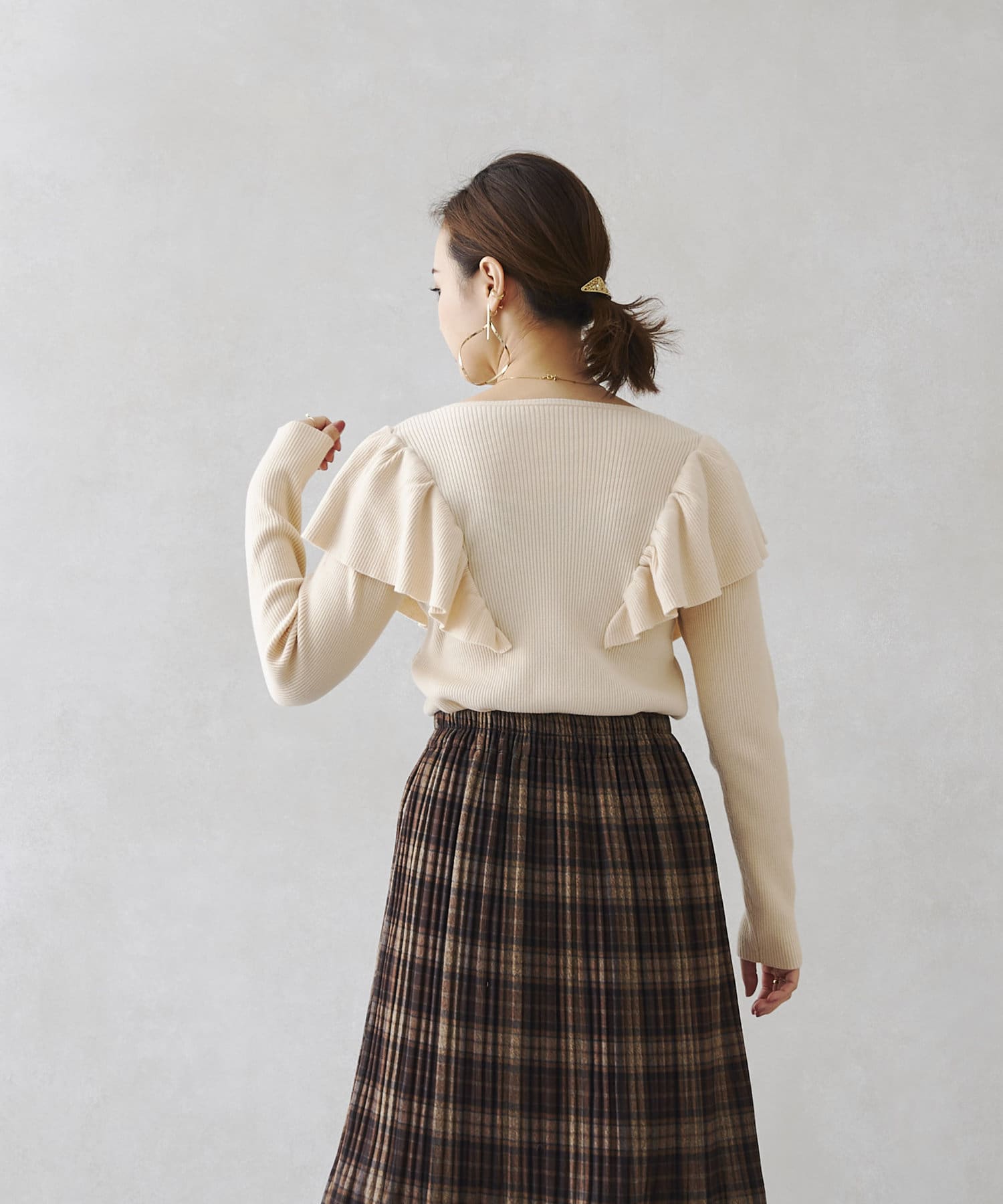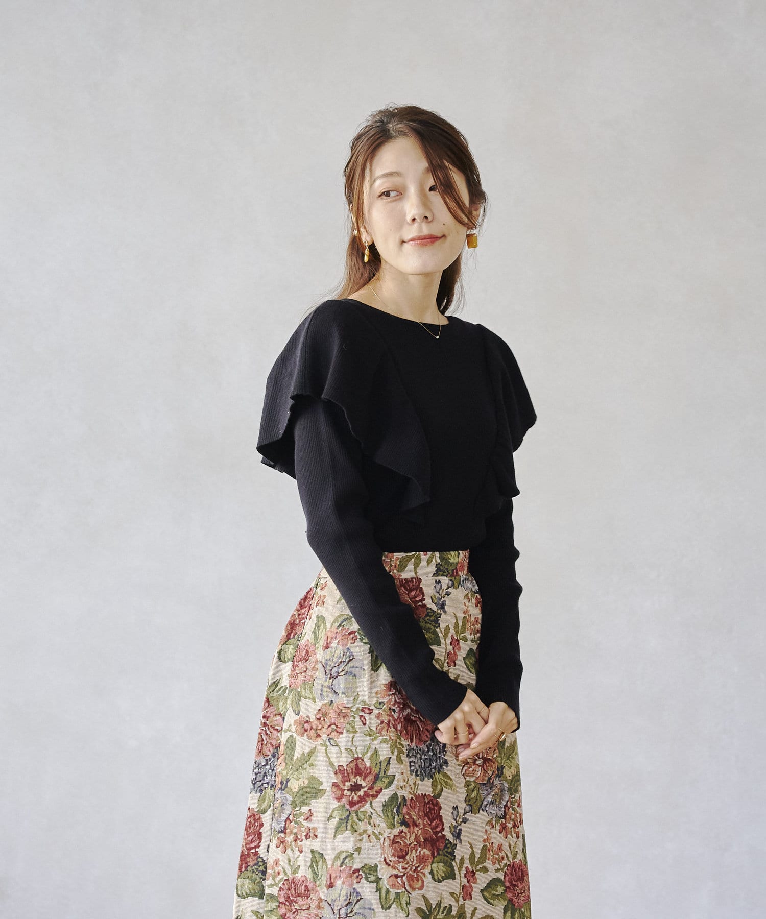 肩にフリルを施した今季注目のオトナフェミニンなニット