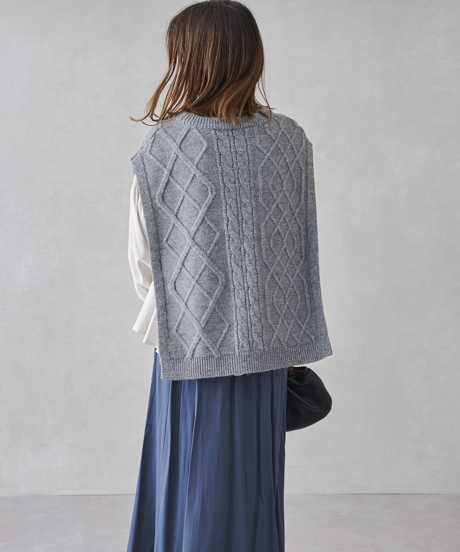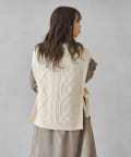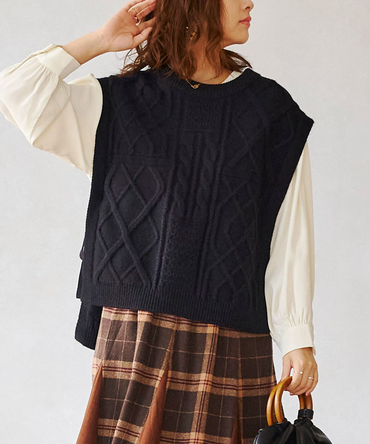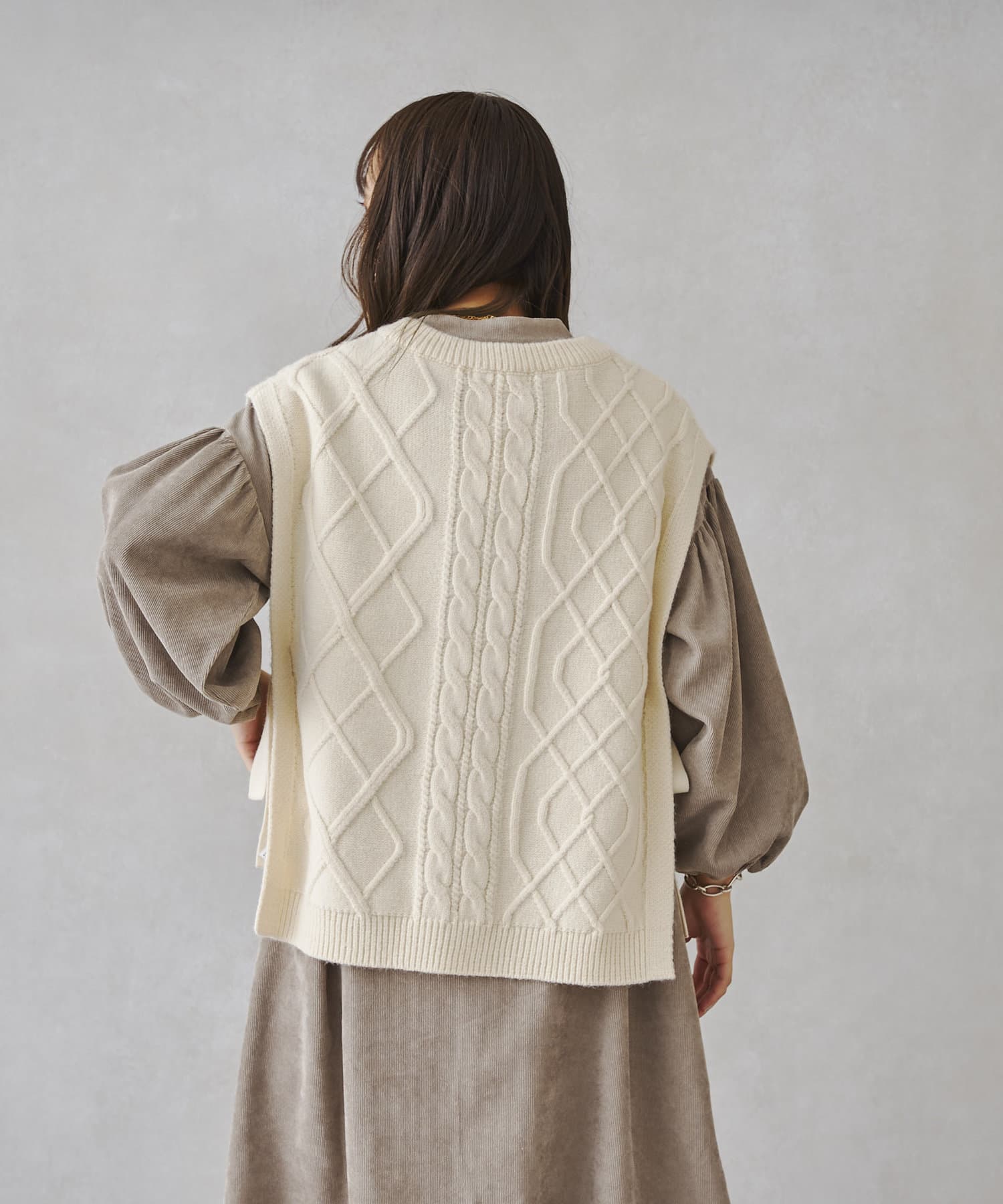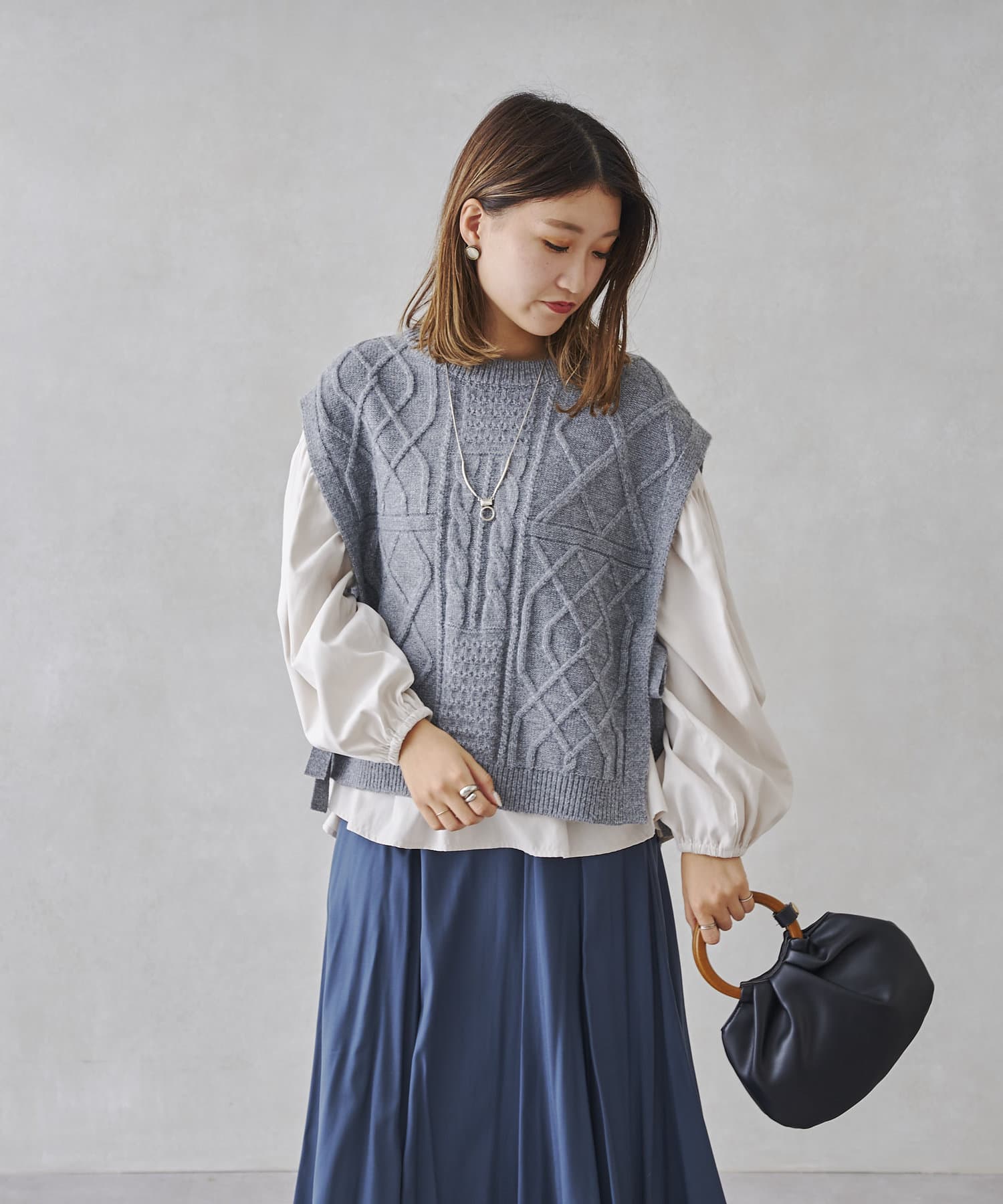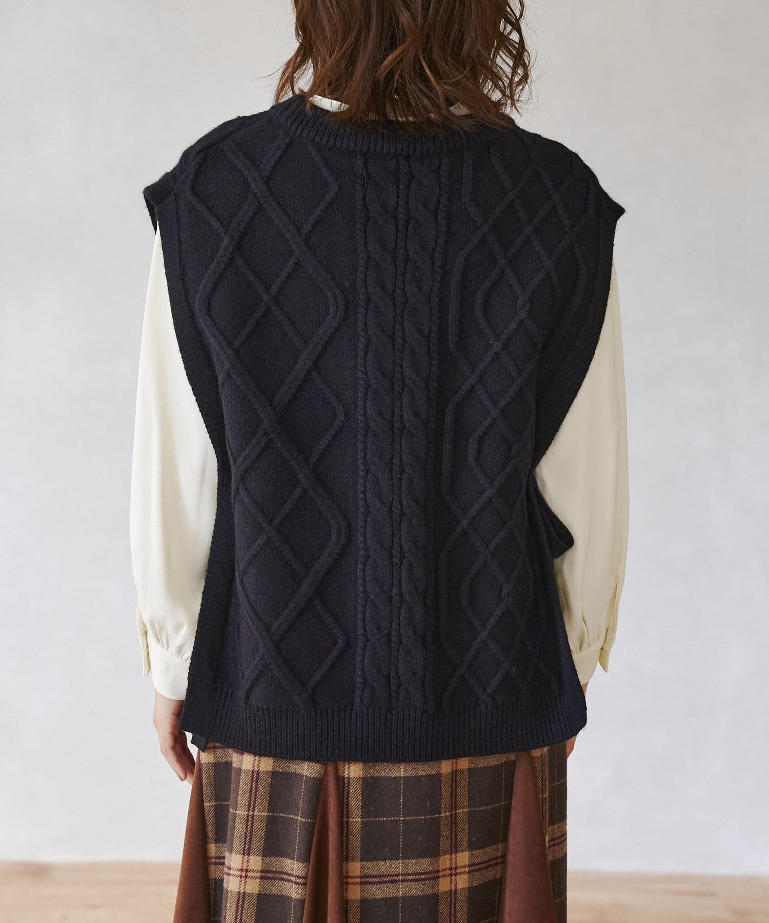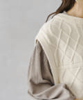 ・ケーブル編みのニットベスト。厚みが出すぎないのでスッキリお使いできます。