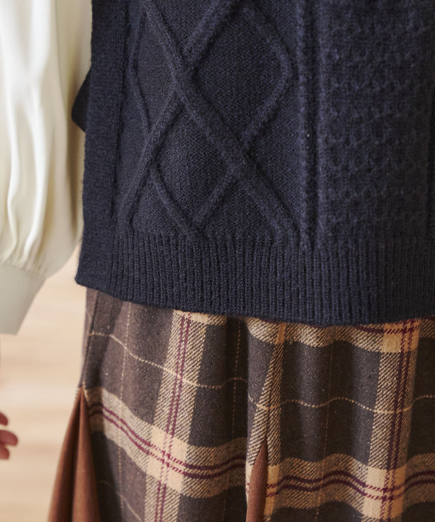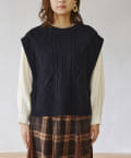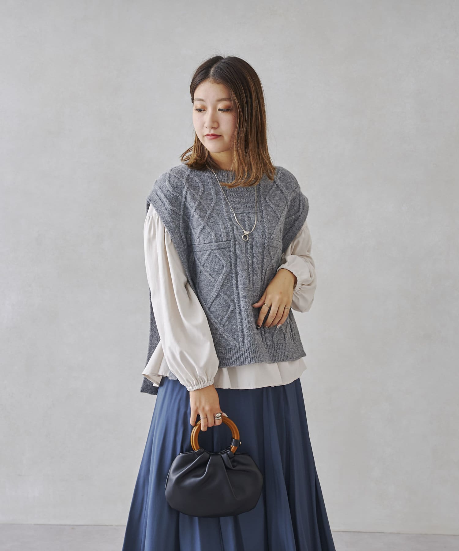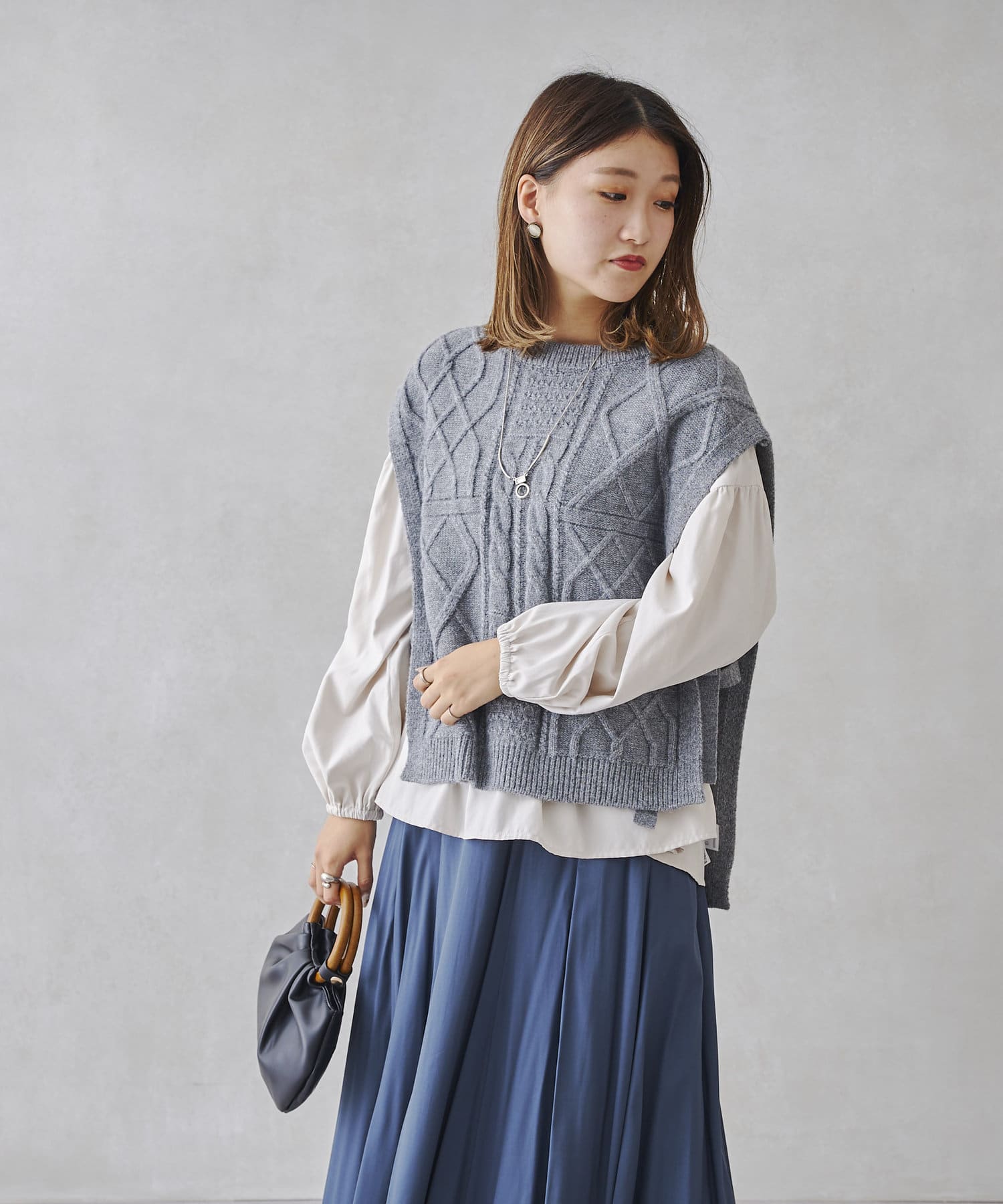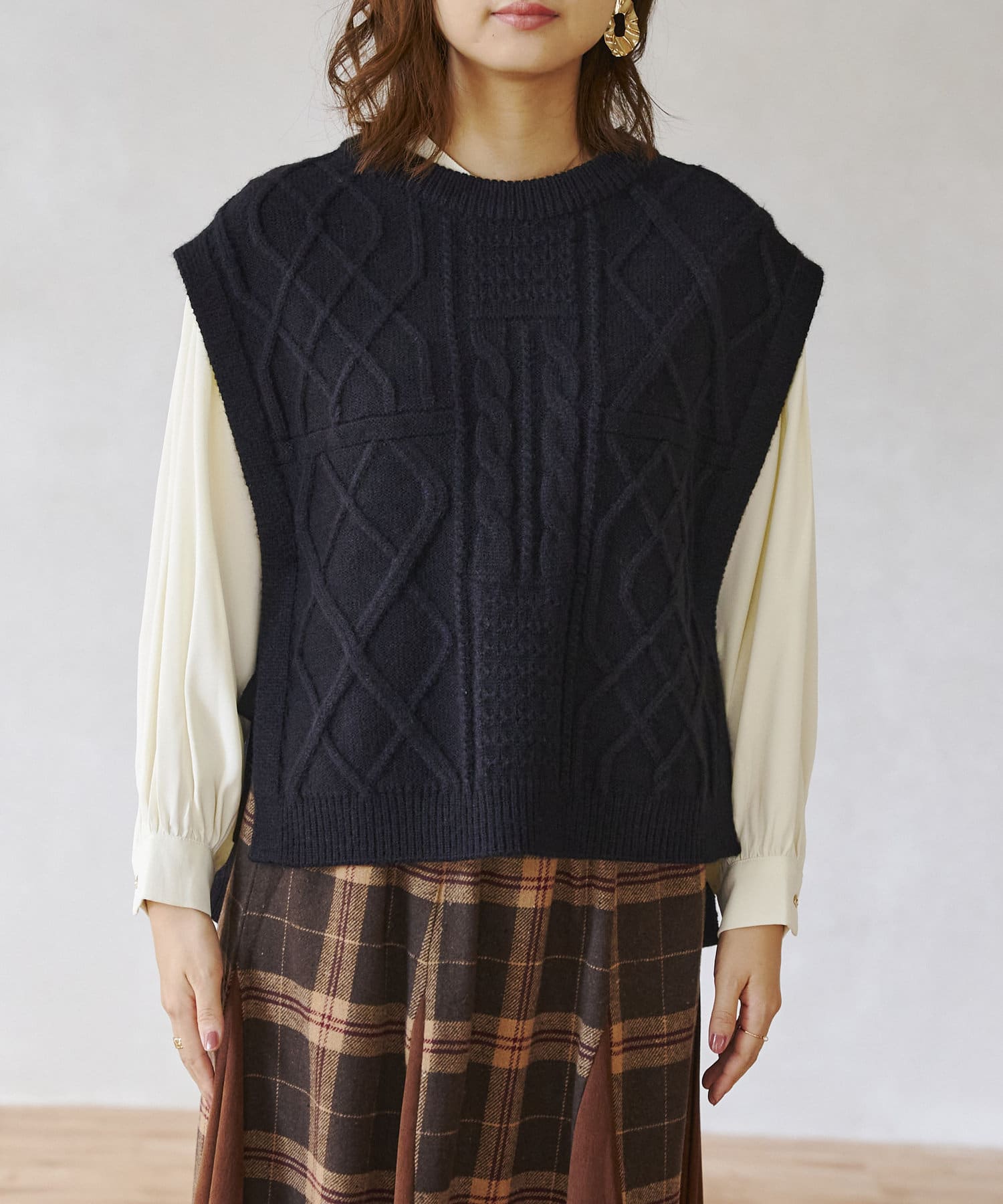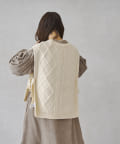 ・ケーブル編みのニットベスト。厚みが出すぎないのでスッキリお使いできます。