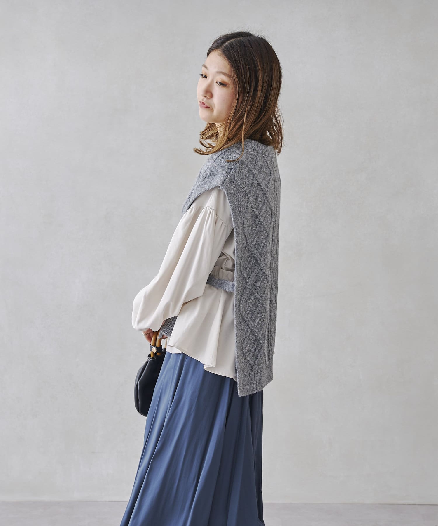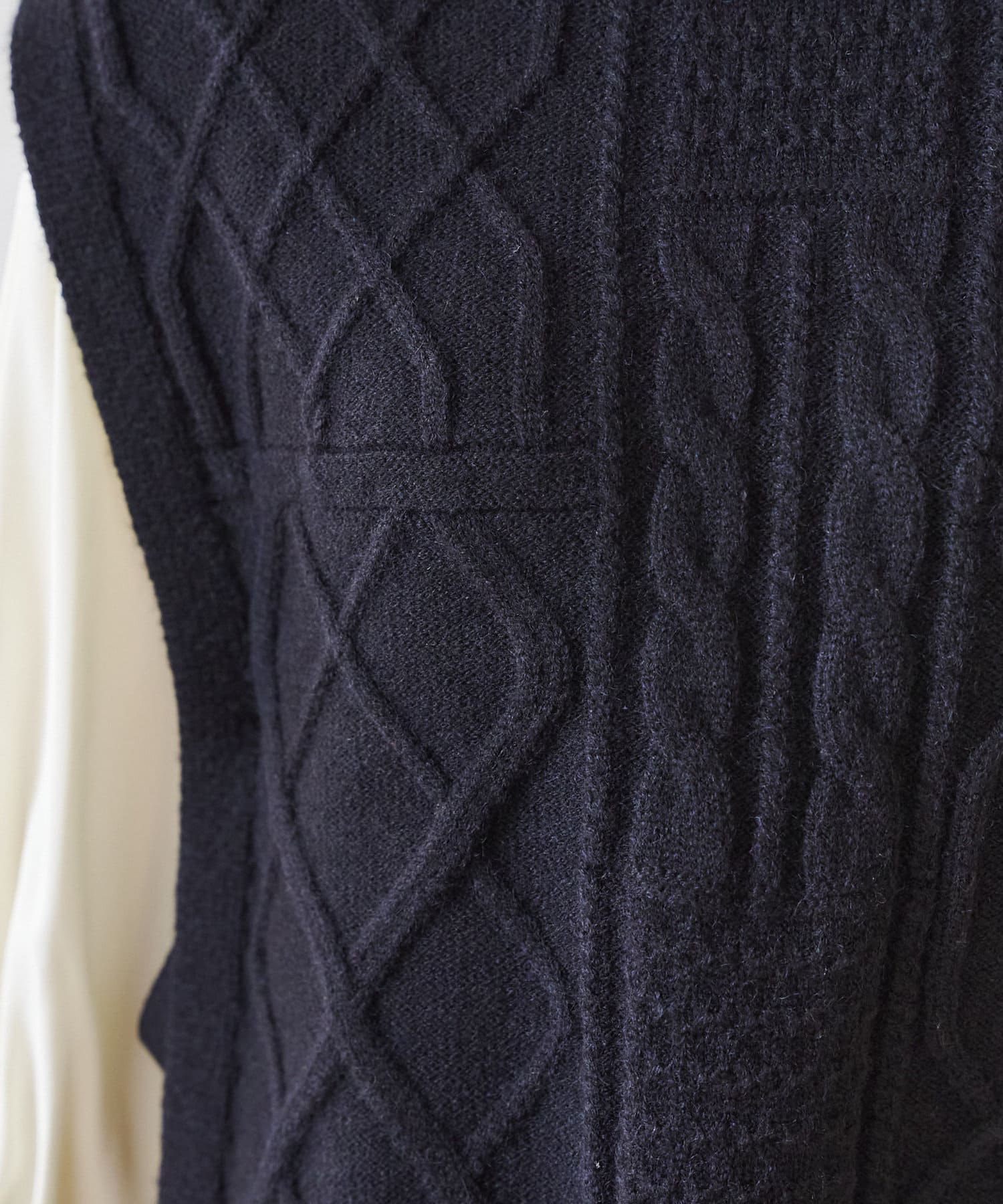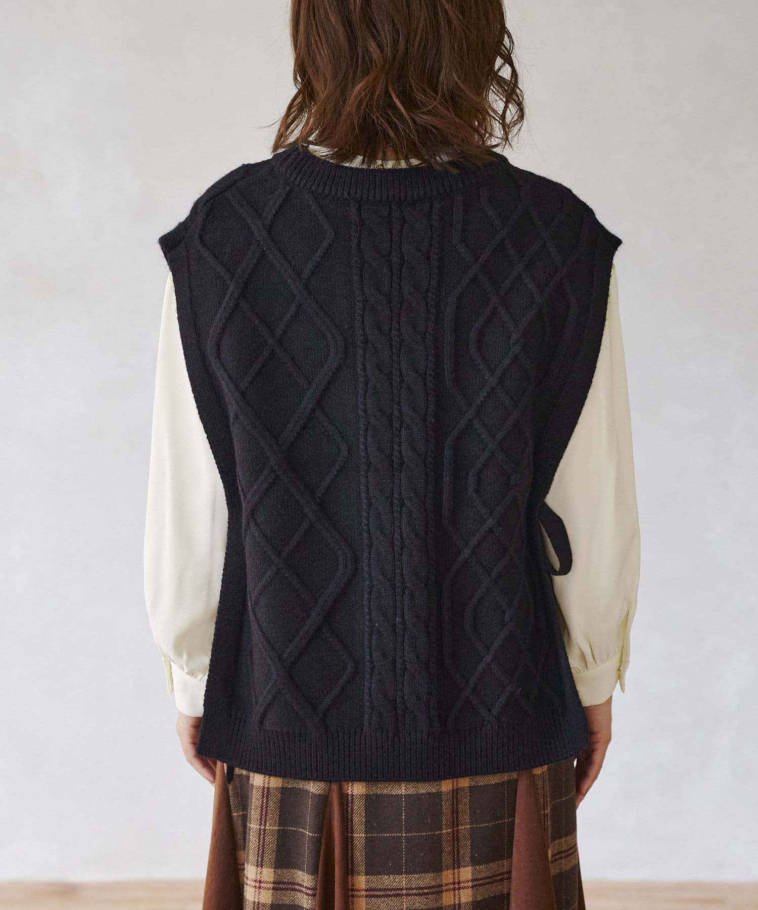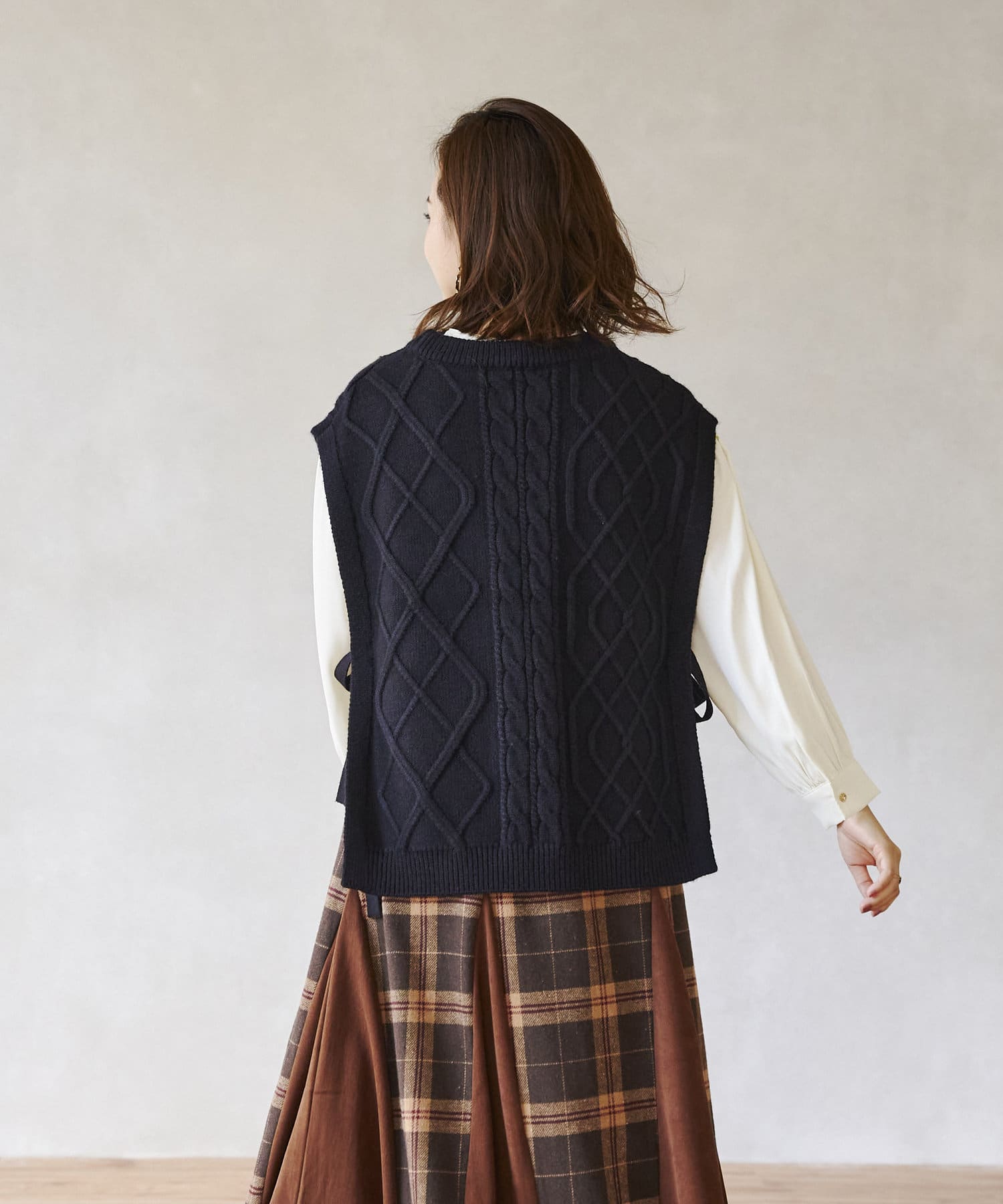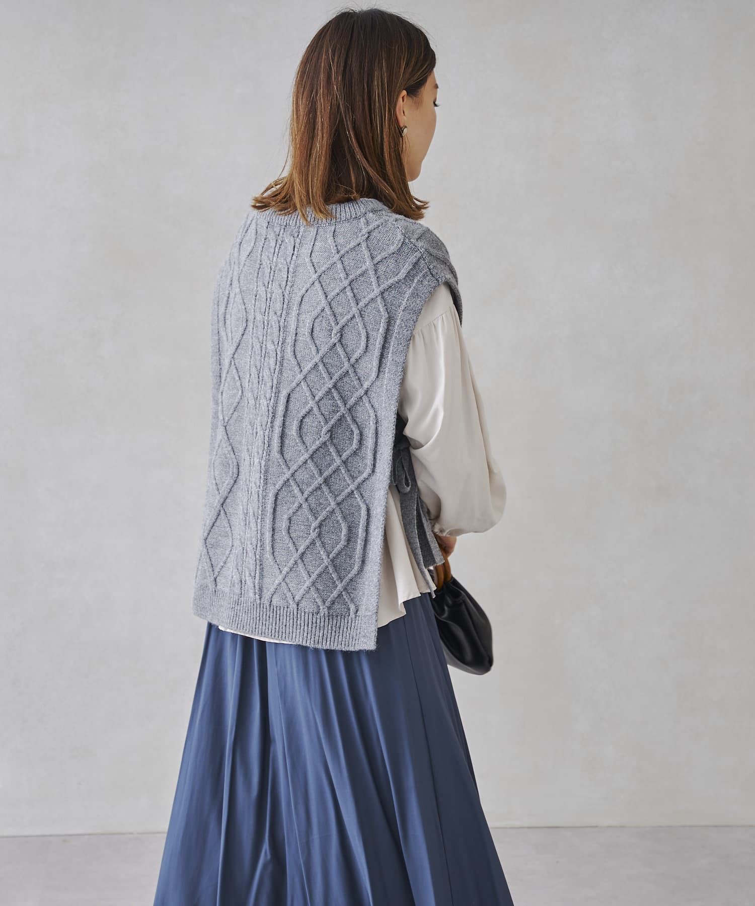 ・ケーブル編みのニットベスト。厚みが出すぎないのでスッキリお使いできます。