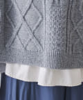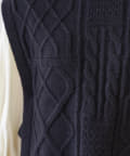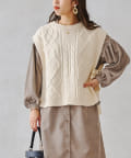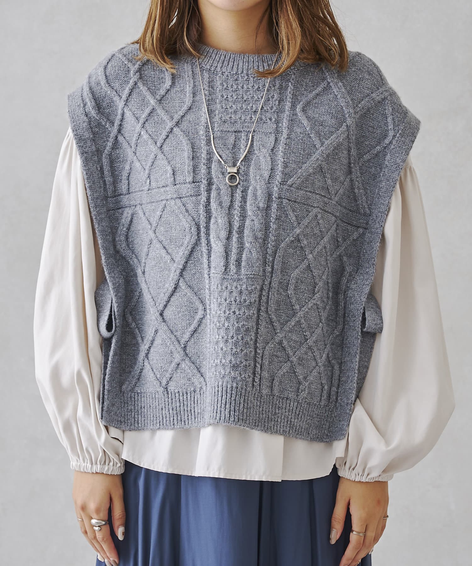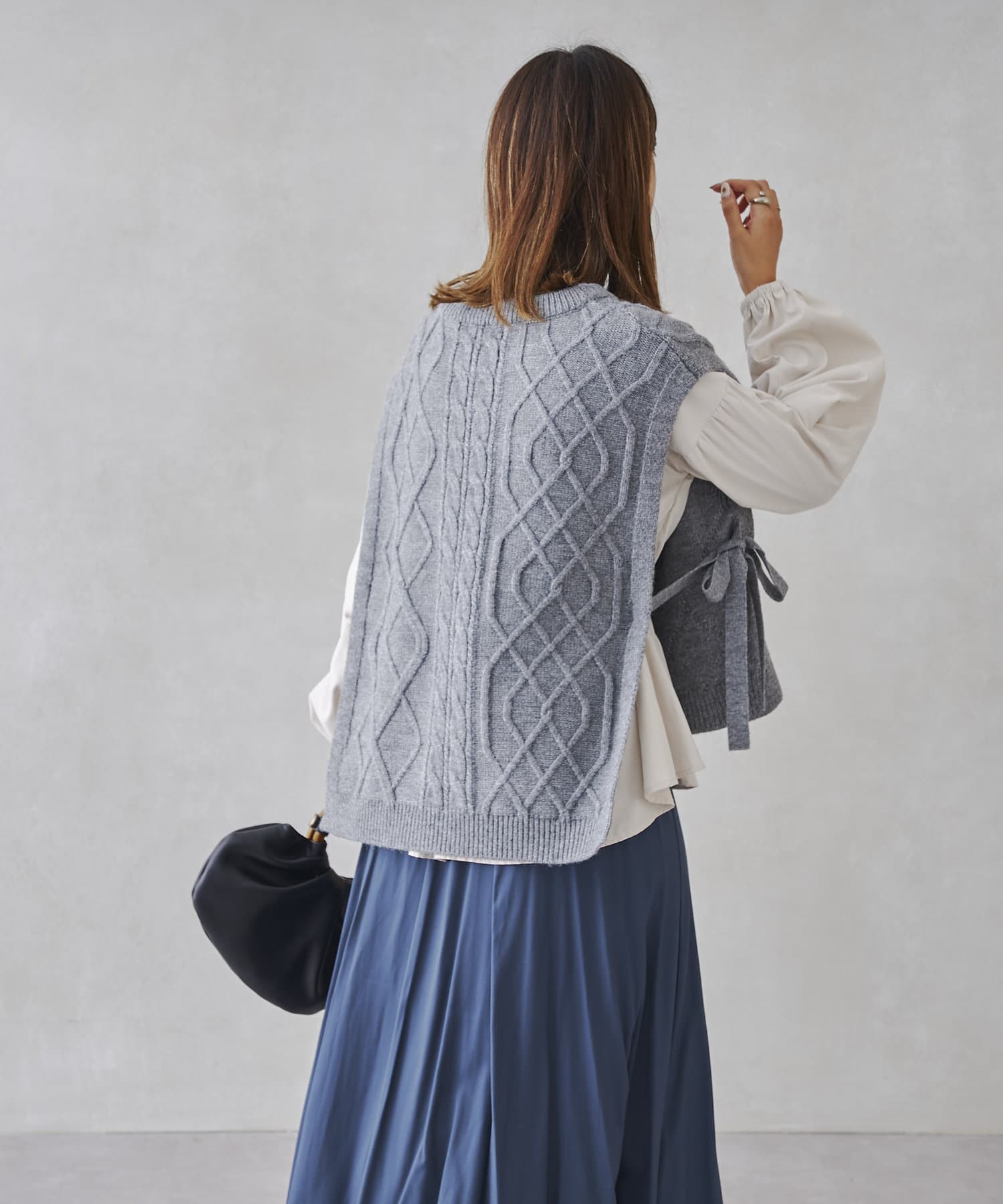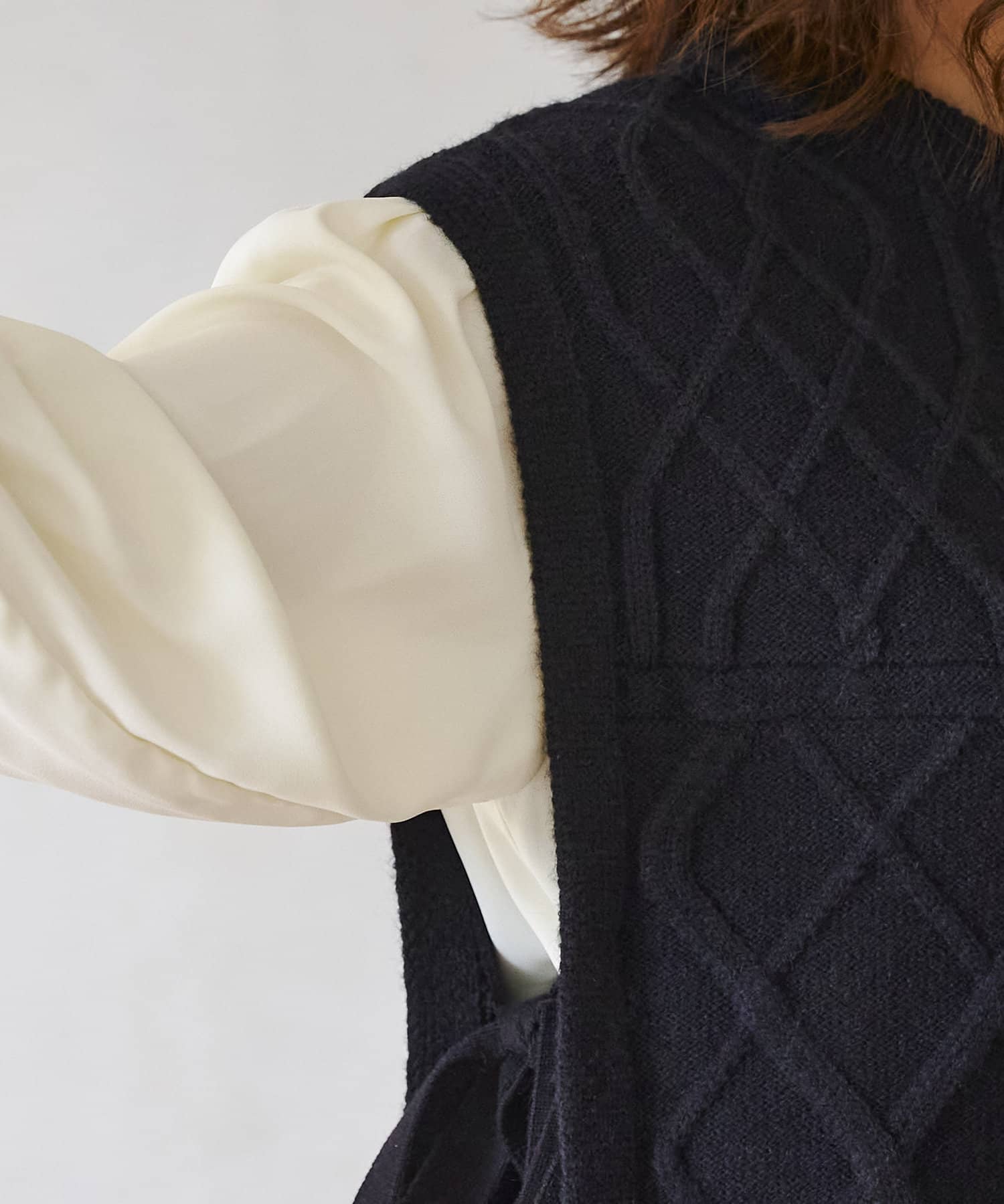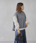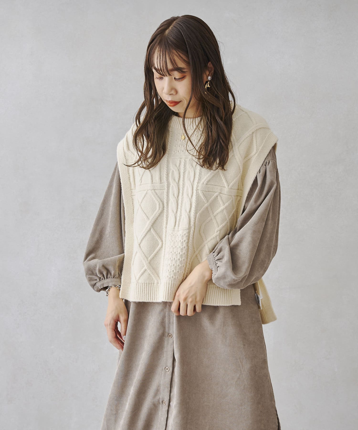 ・ケーブル編みのニットベスト。厚みが出すぎないのでスッキリお使いできます。