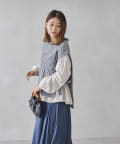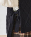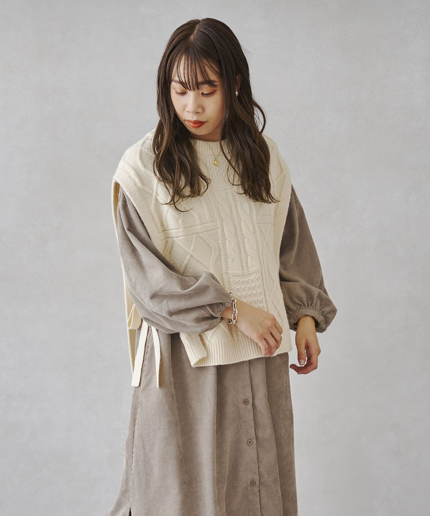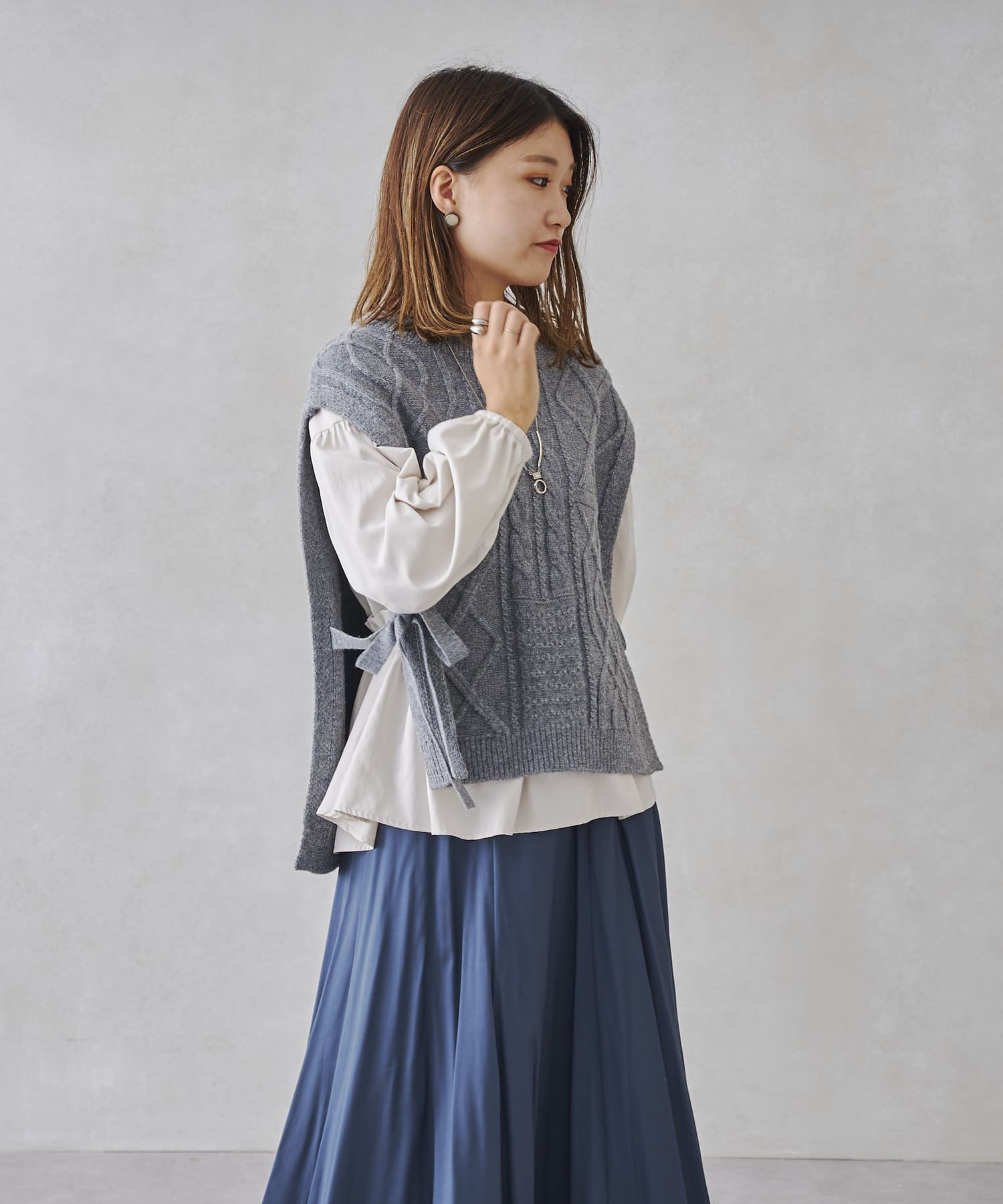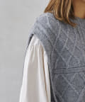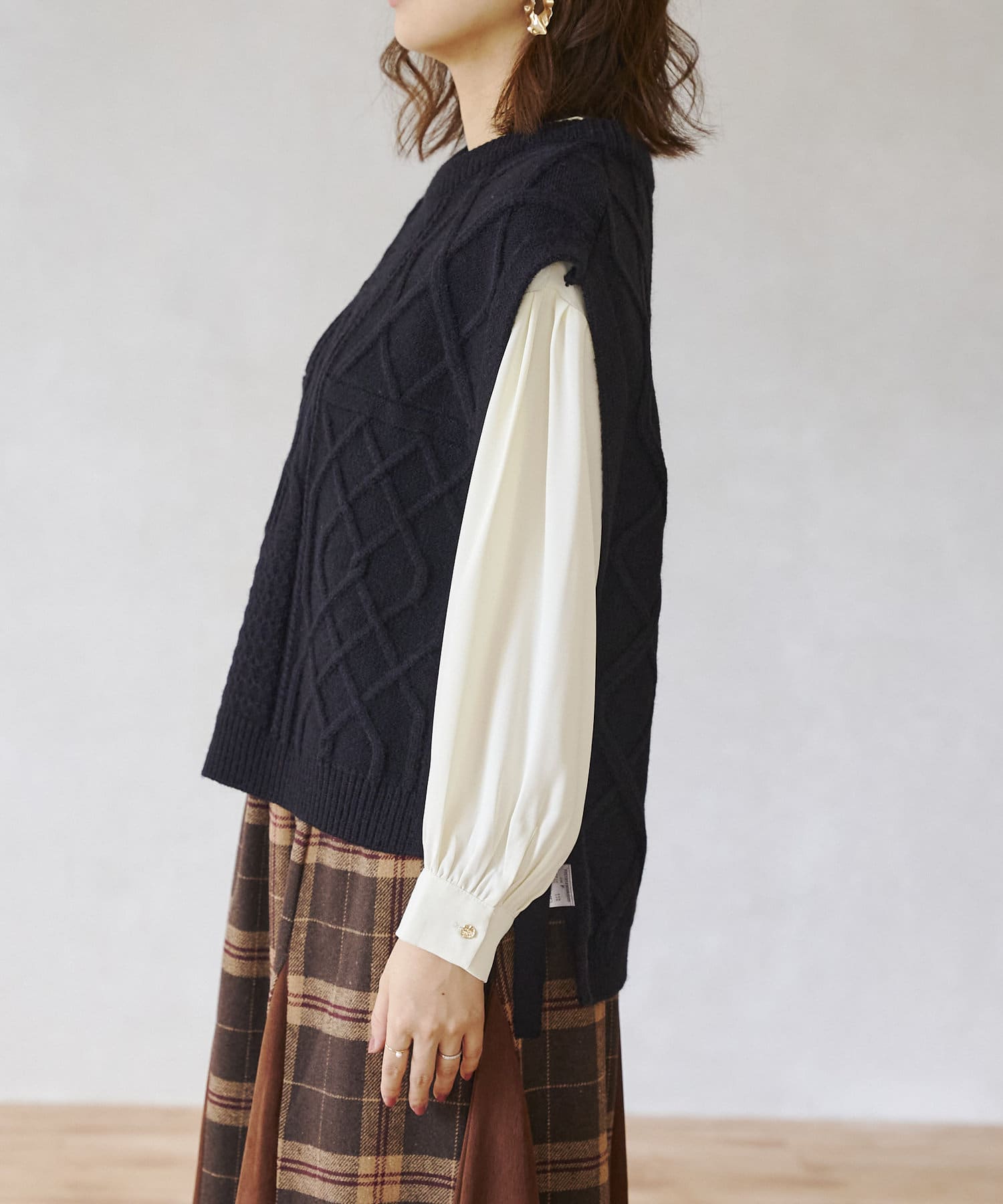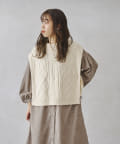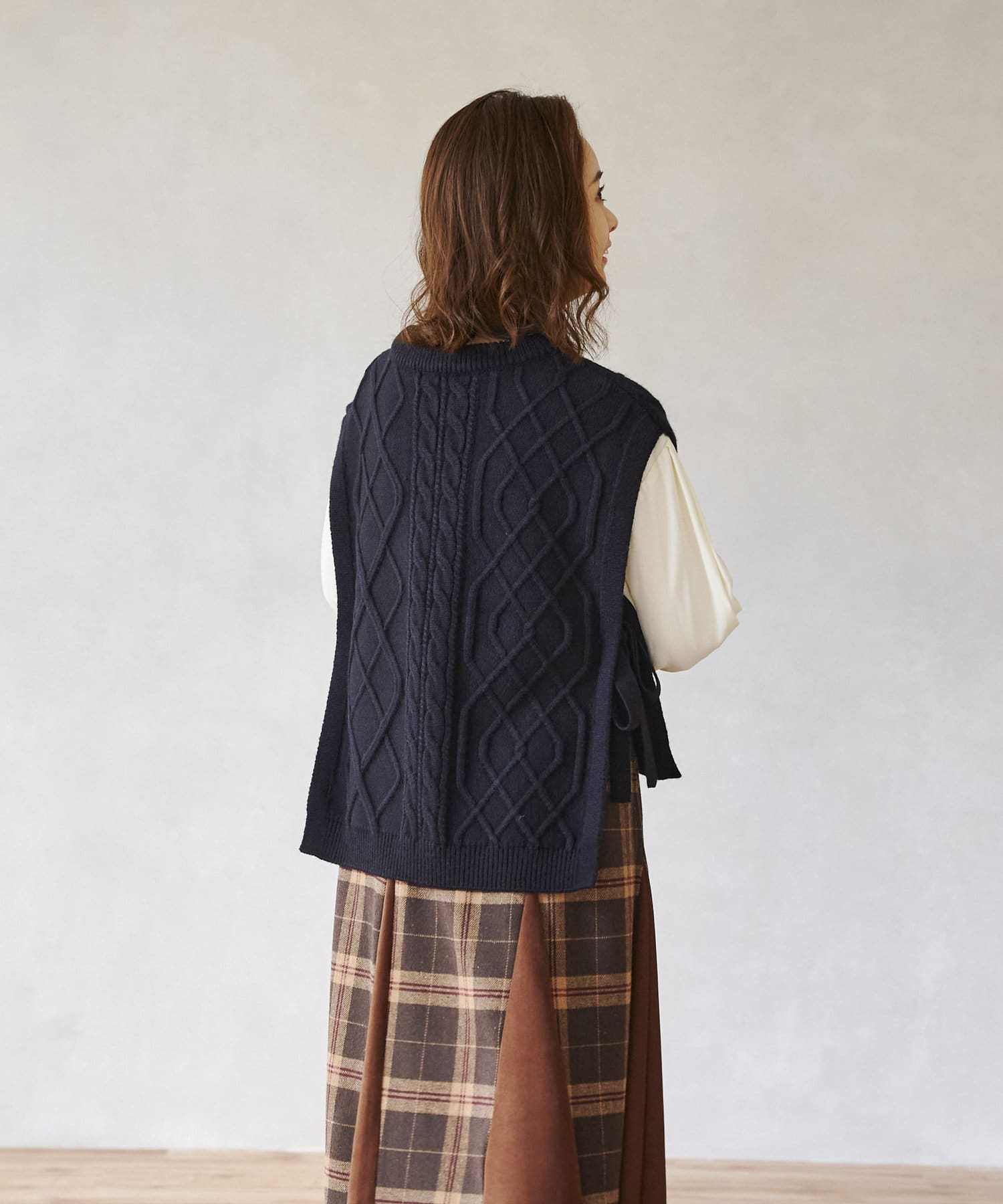 ・ケーブル編みのニットベスト。厚みが出すぎないのでスッキリお使いできます。