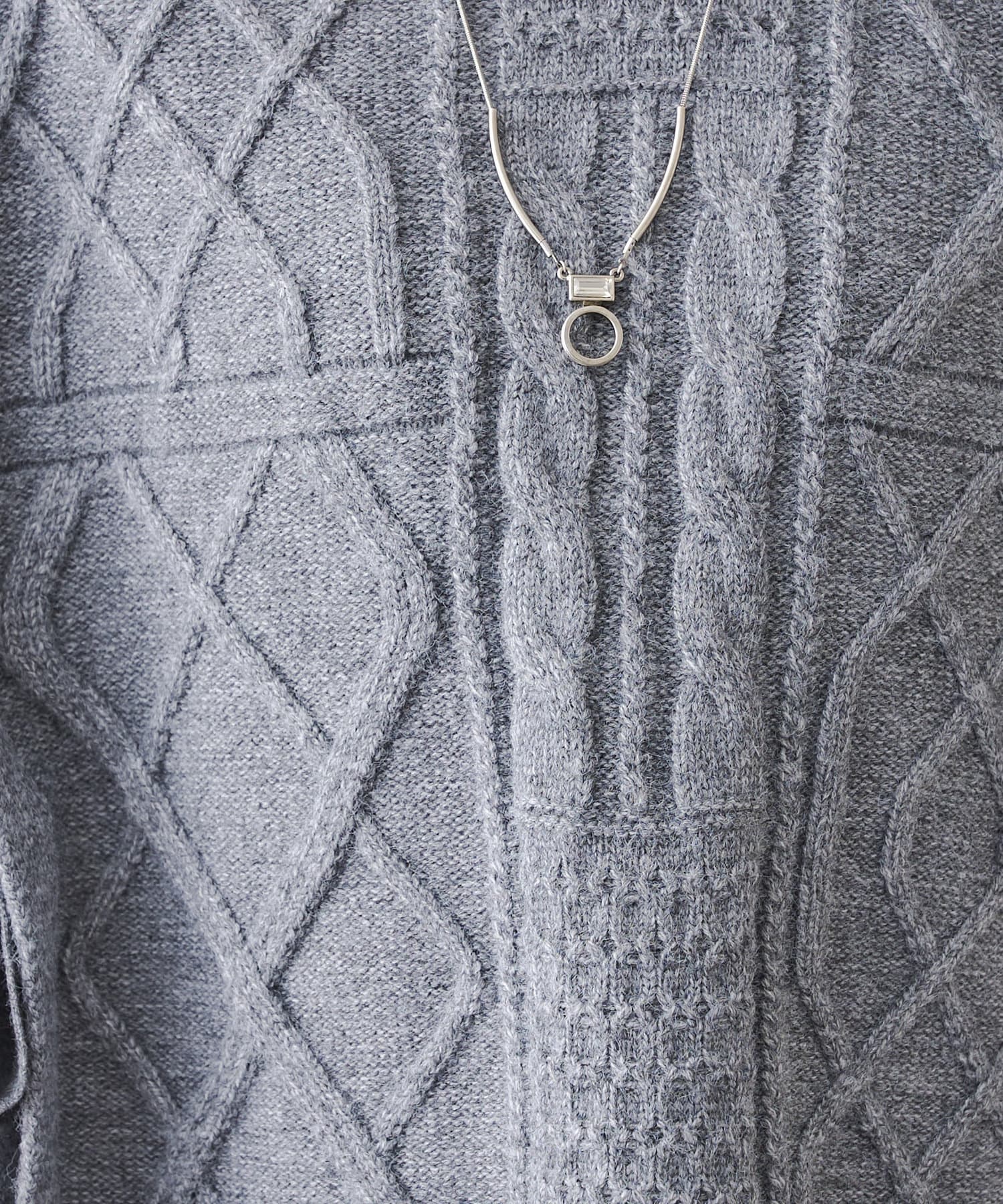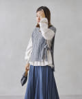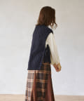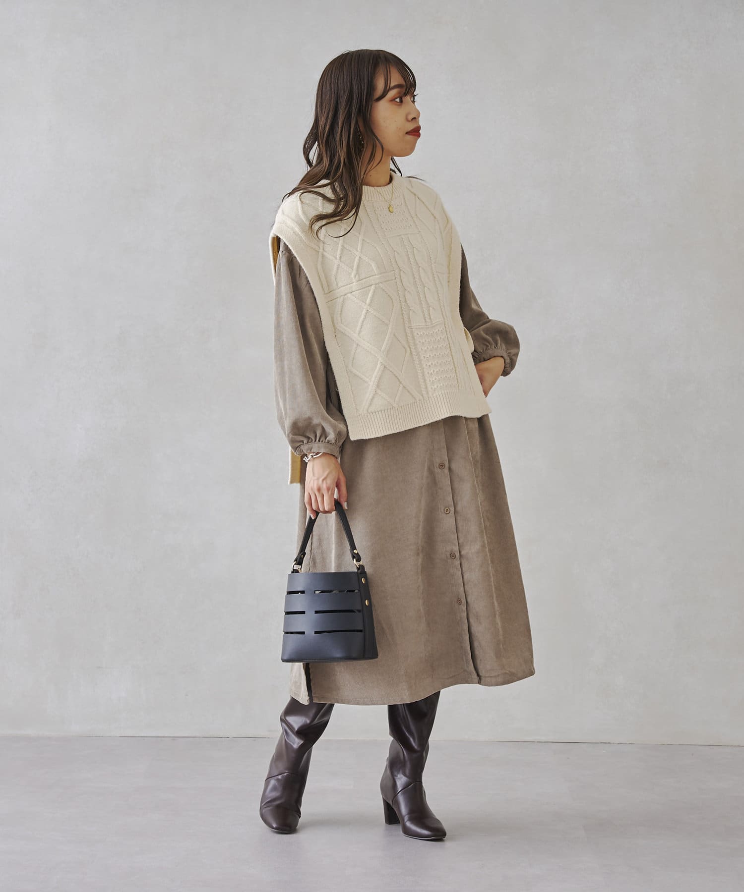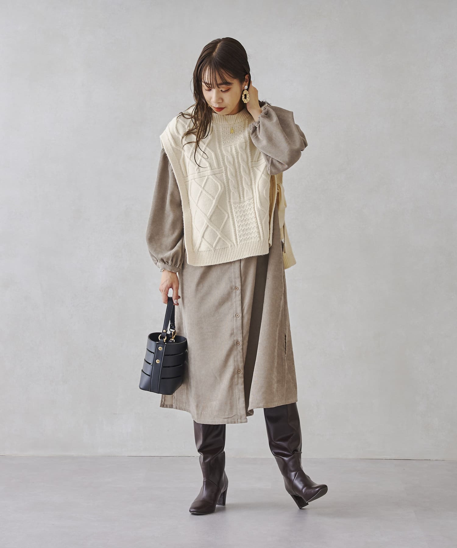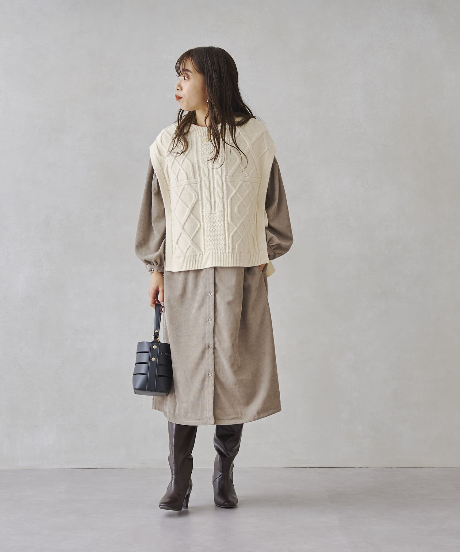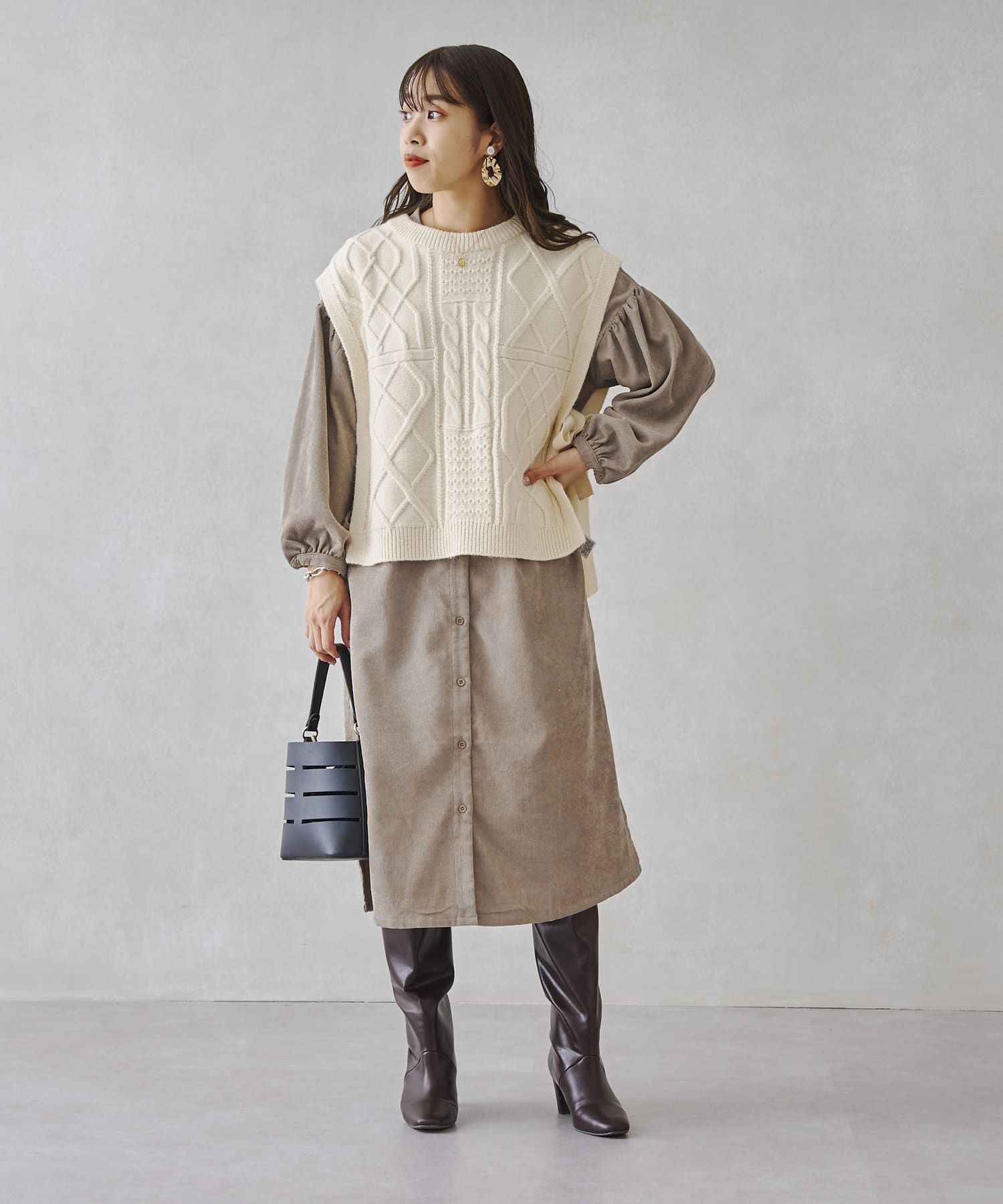 ・ケーブル編みのニットベスト。厚みが出すぎないのでスッキリお使いできます。