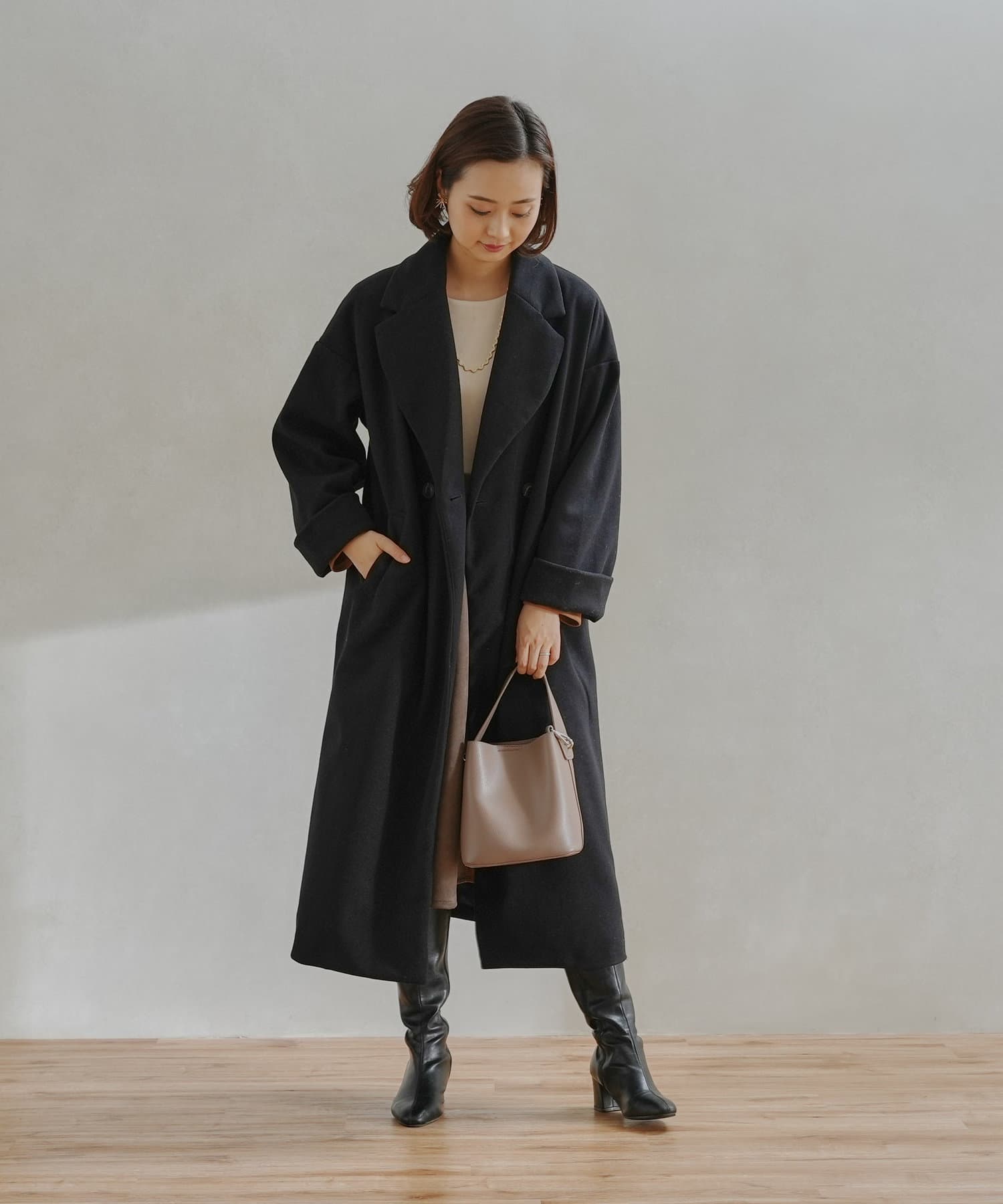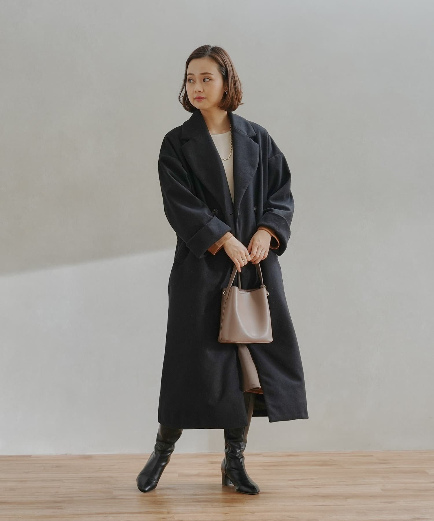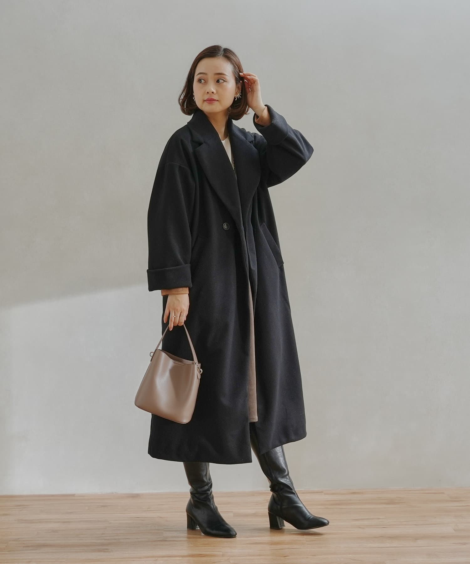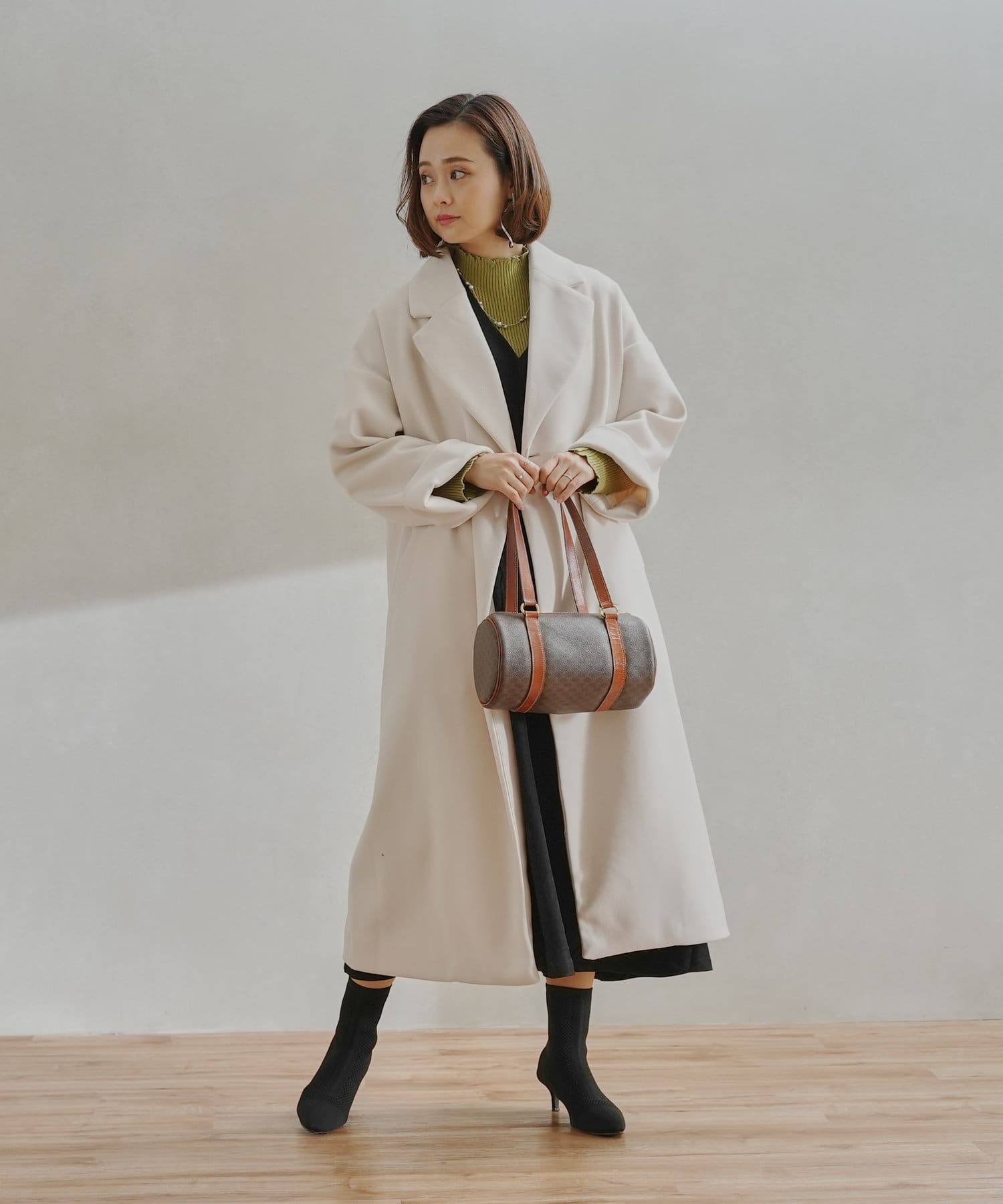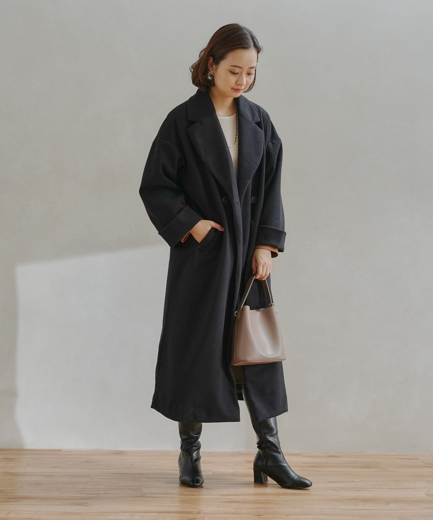 シンプルなデザインがお仕事にも休日にも頼れるフェイクウールコート