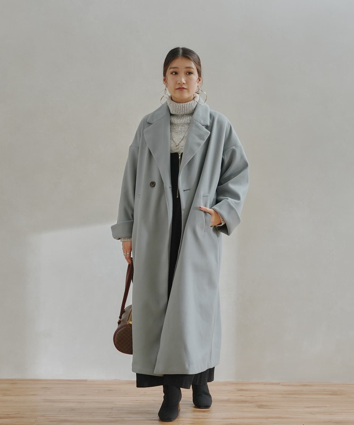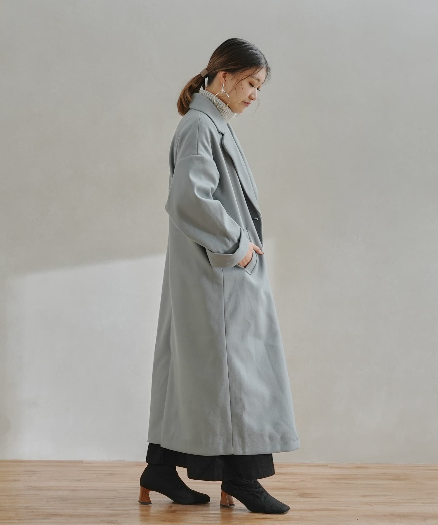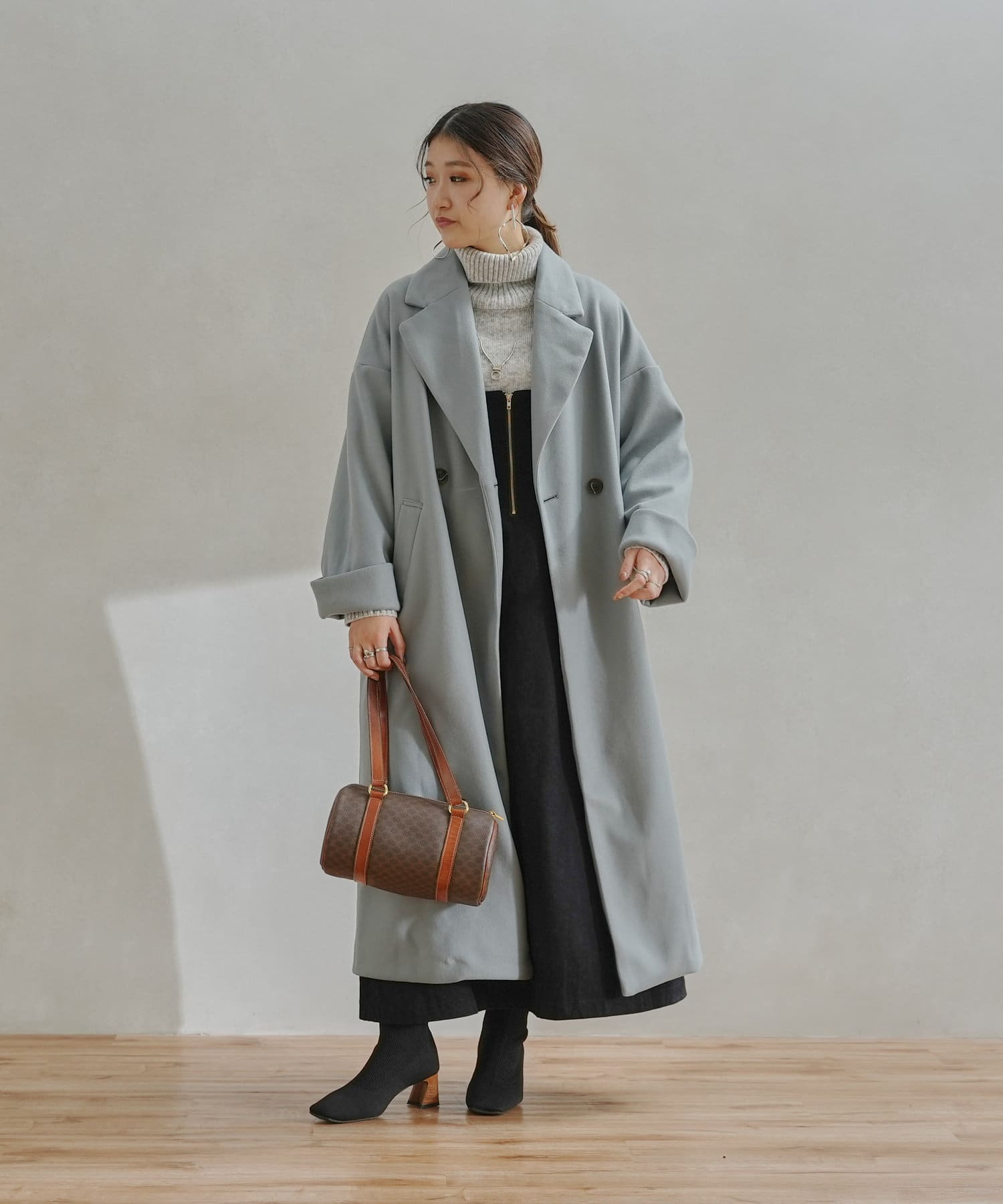 襟元が開くチェスターコートのデザインなので、冬はタートルネックとの相性が◎