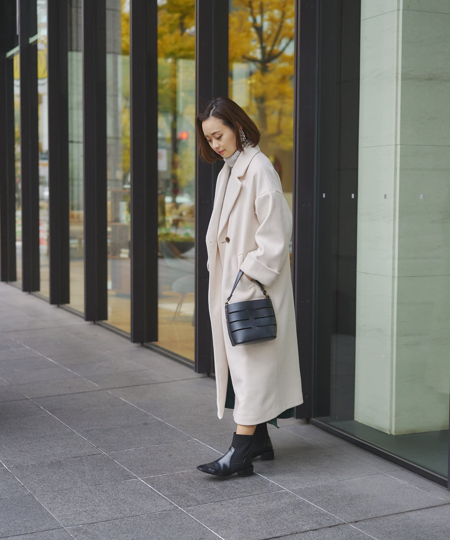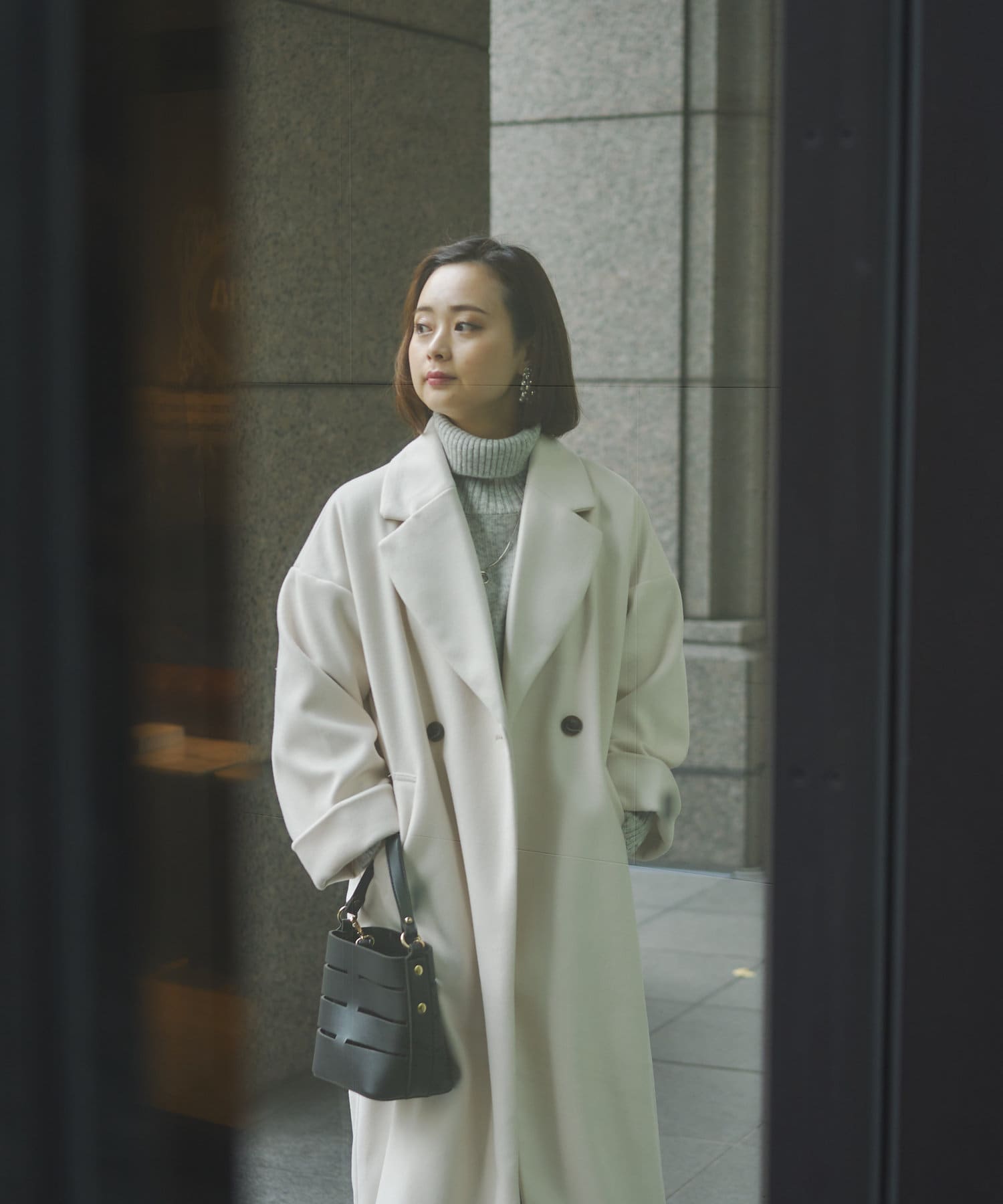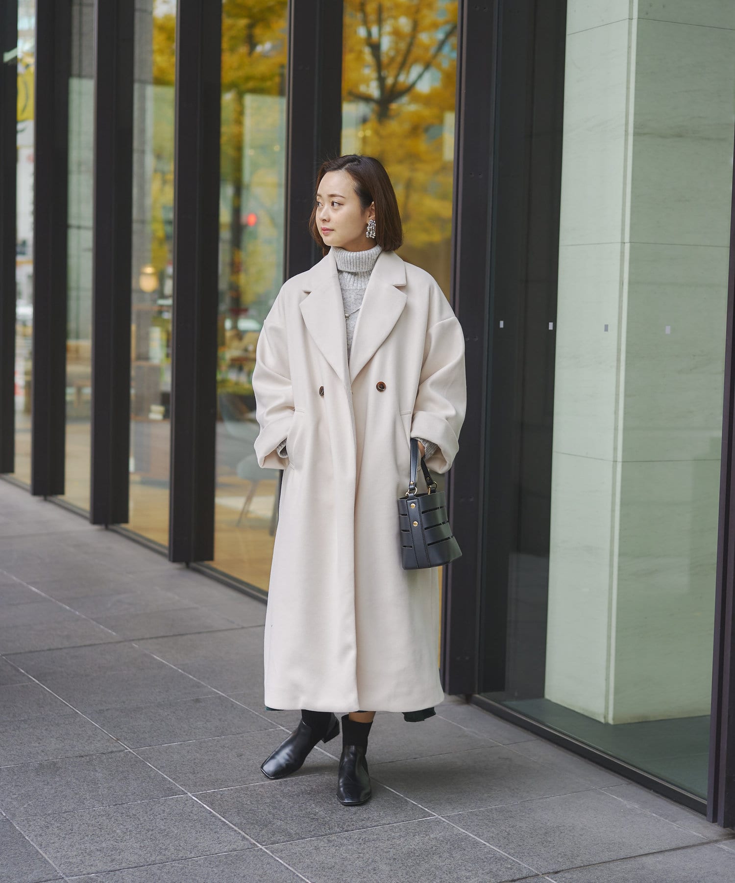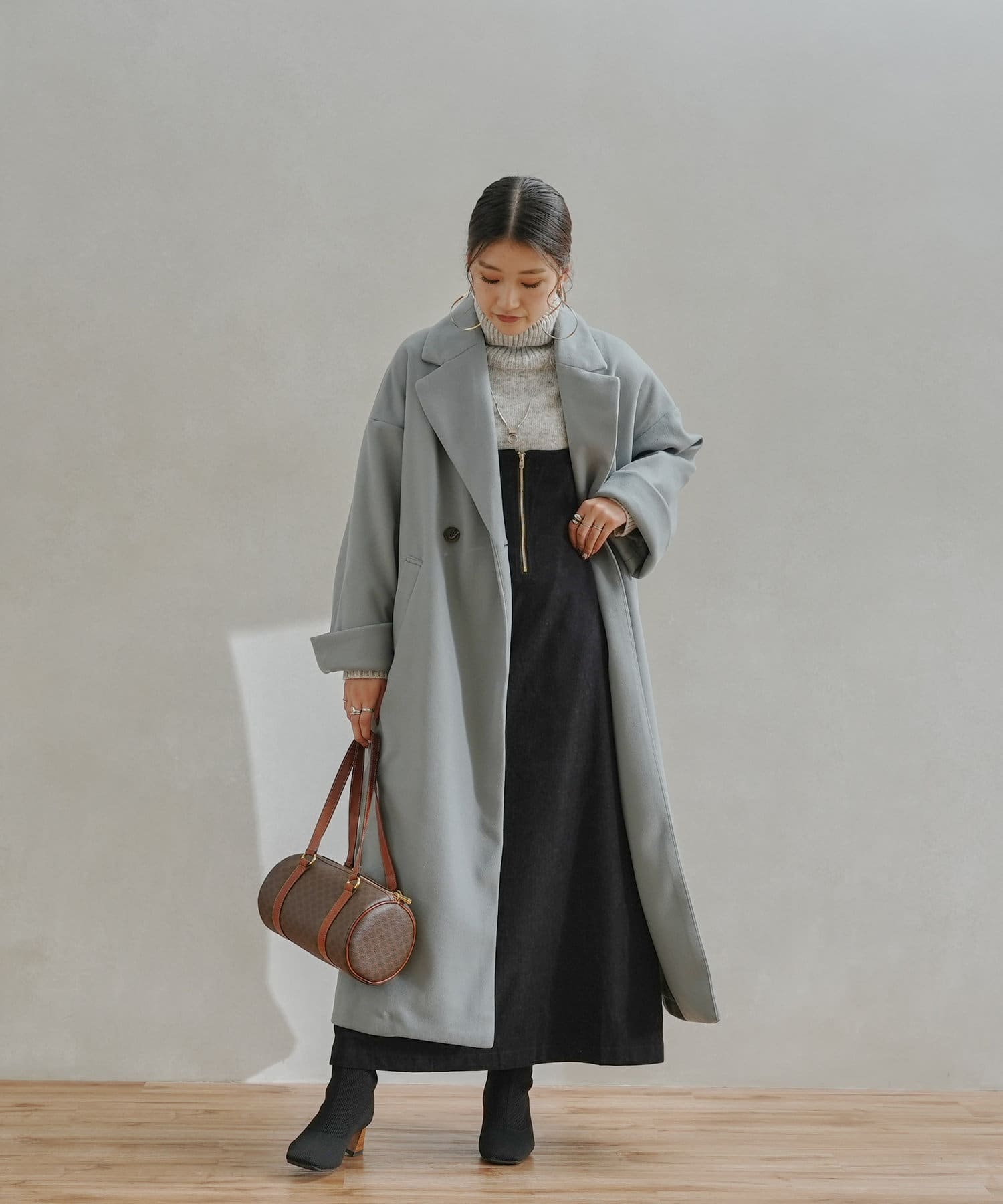 襟元が開くチェスターコートのデザインなので、冬はタートルネックとの相性が◎