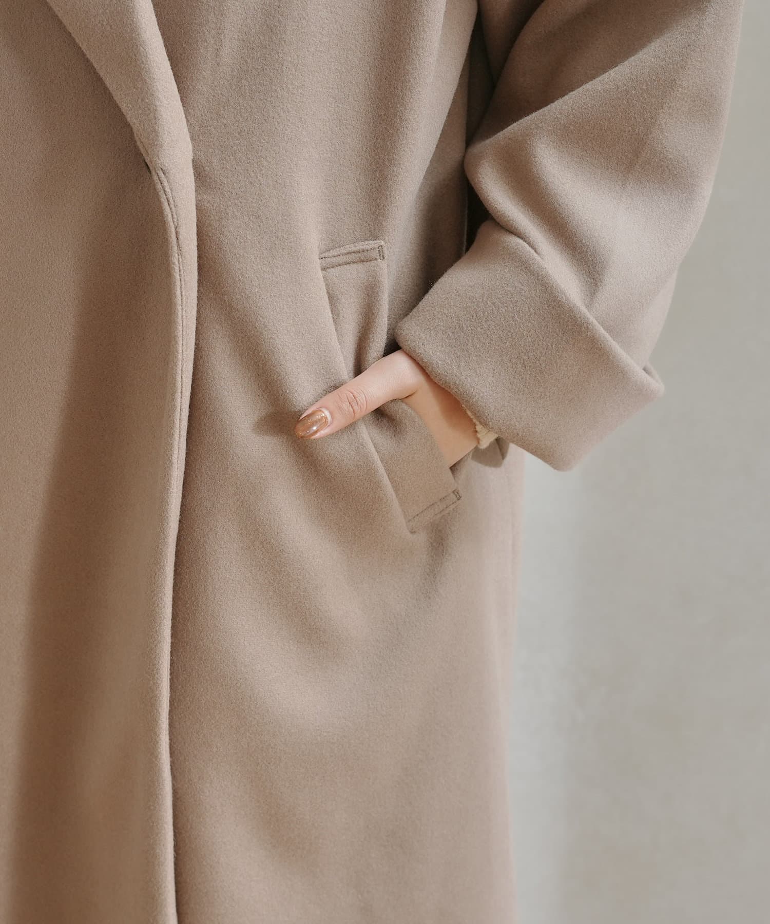 ポリエステルのフェイクウール素材。軽くてストレスフリーな羽織心地です。