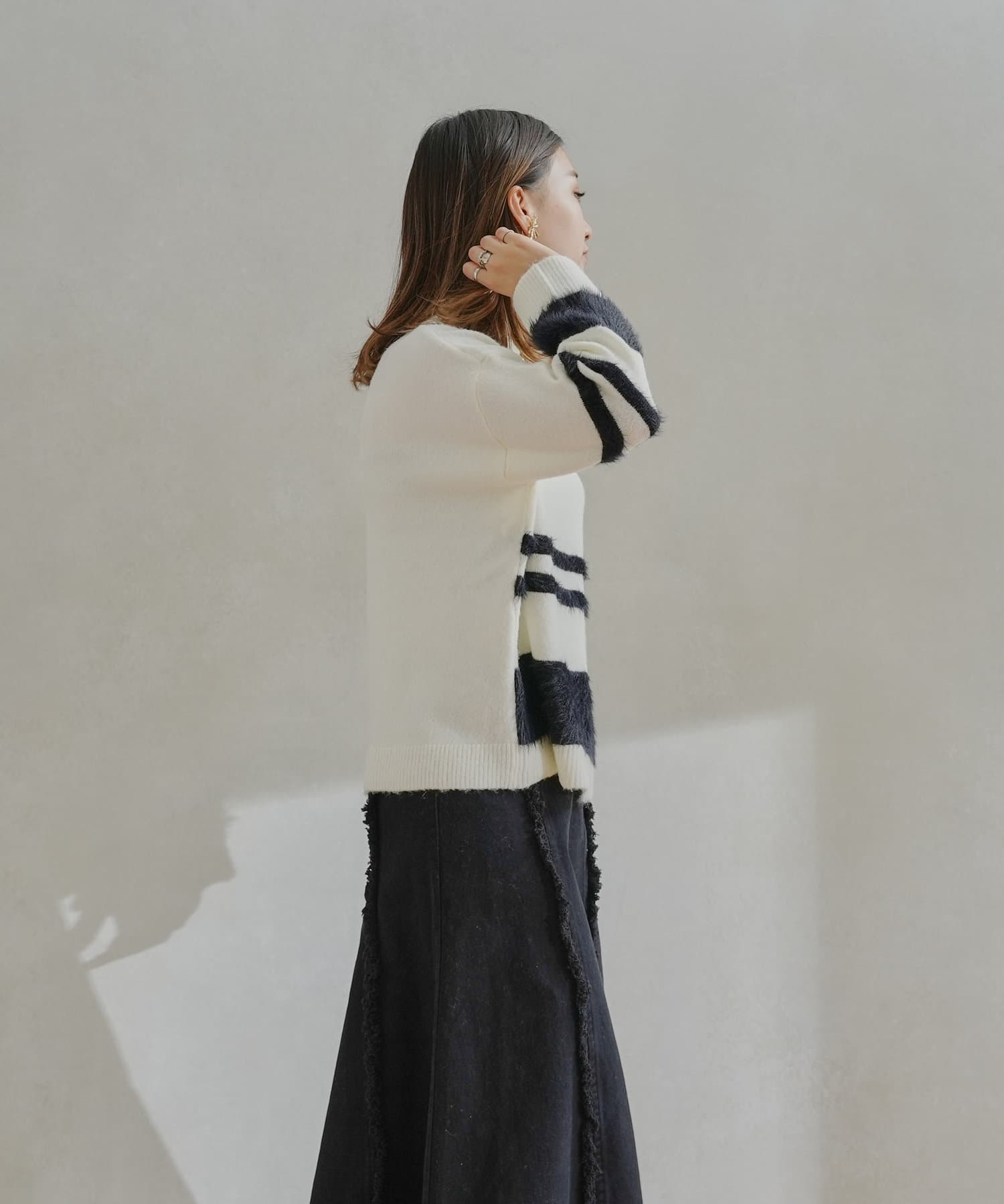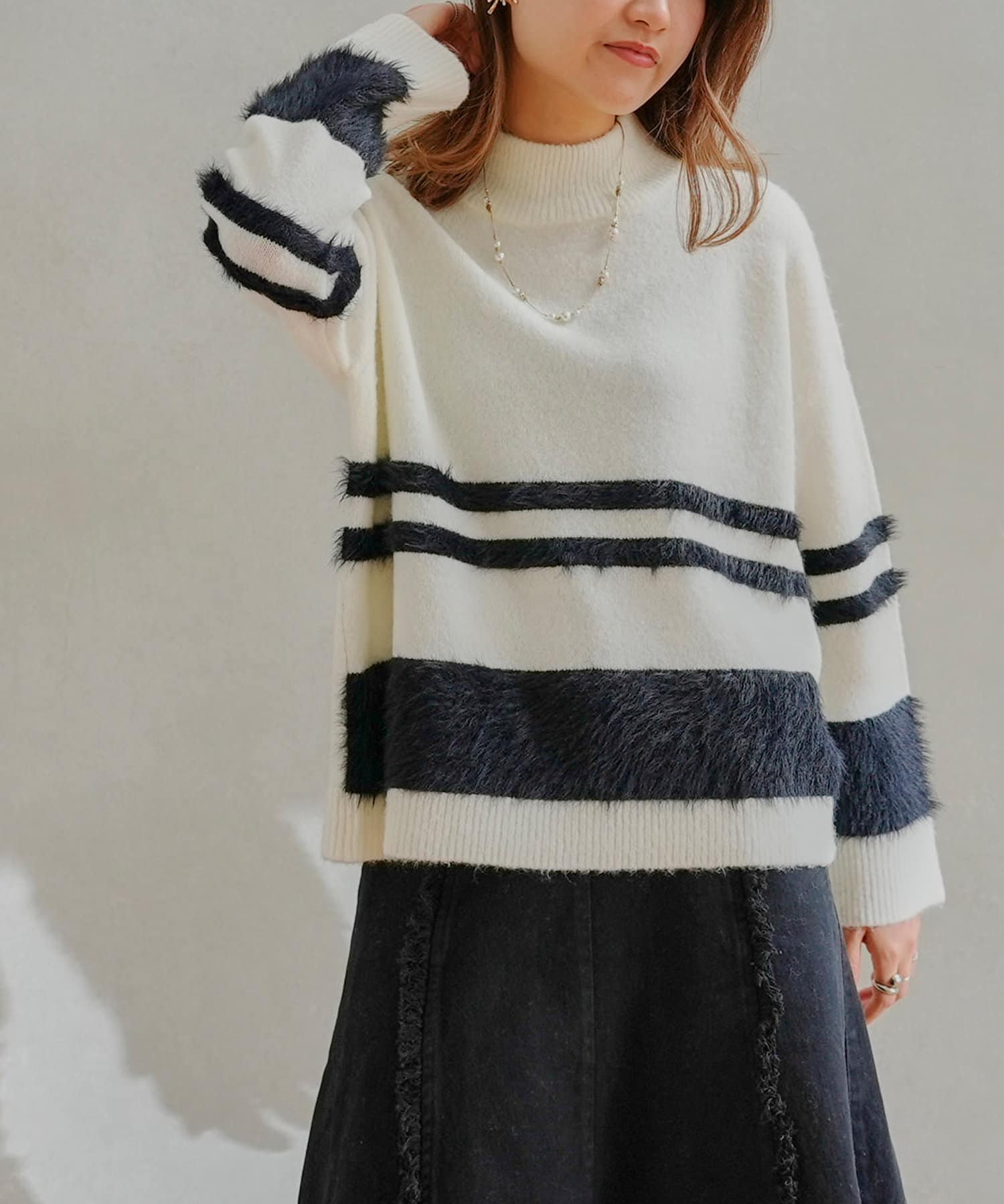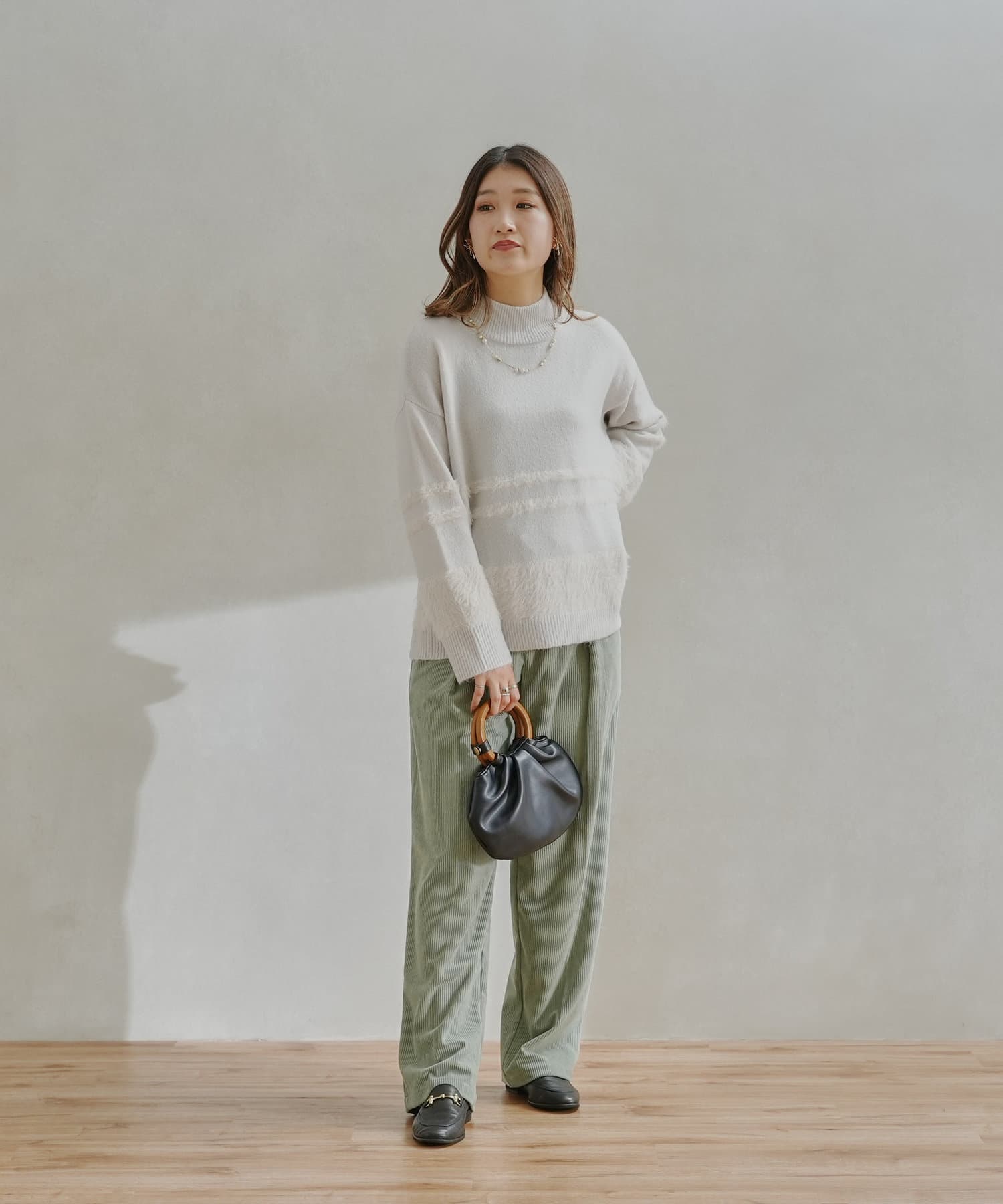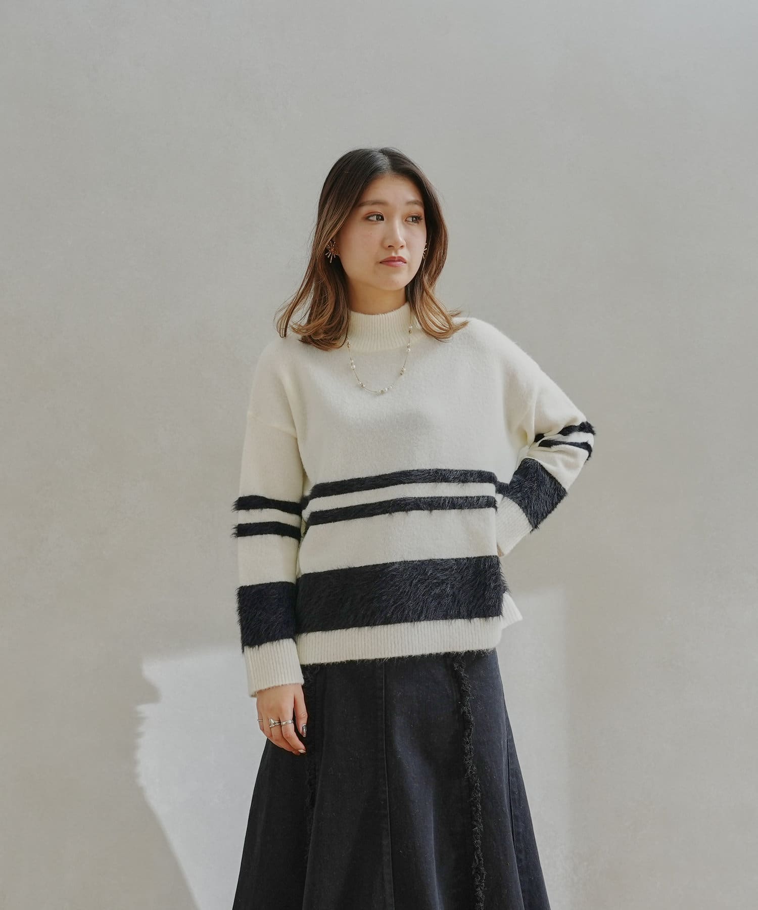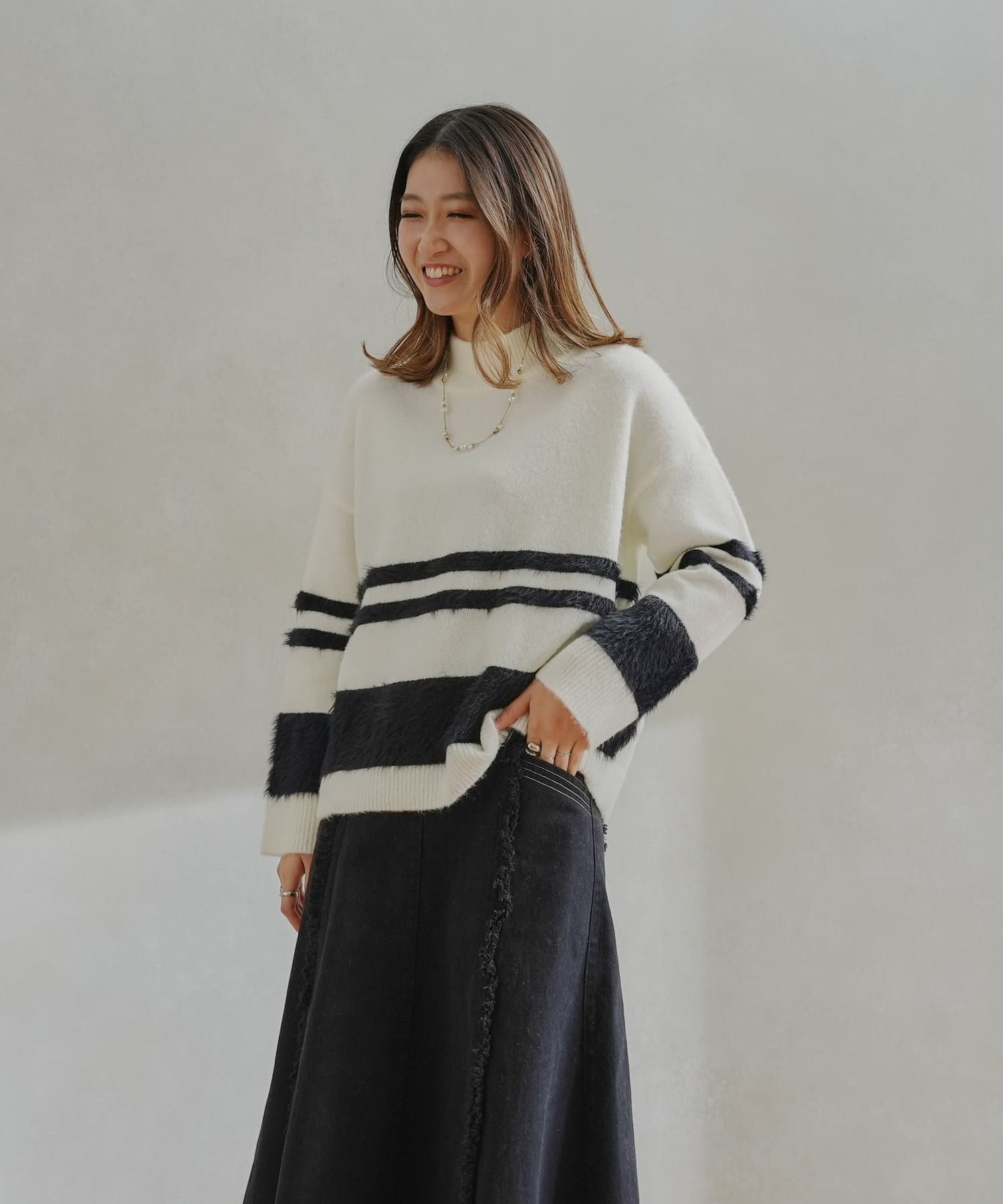 ・部分使いのラインのシャギーニットがボーダー見えしてコーディネートのアクセントを