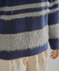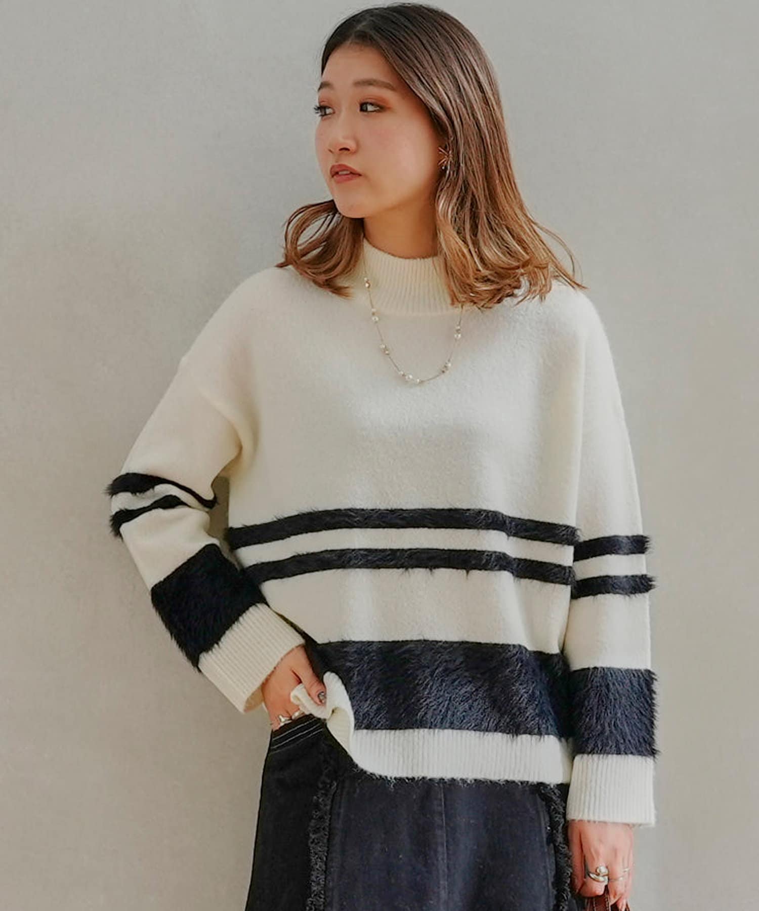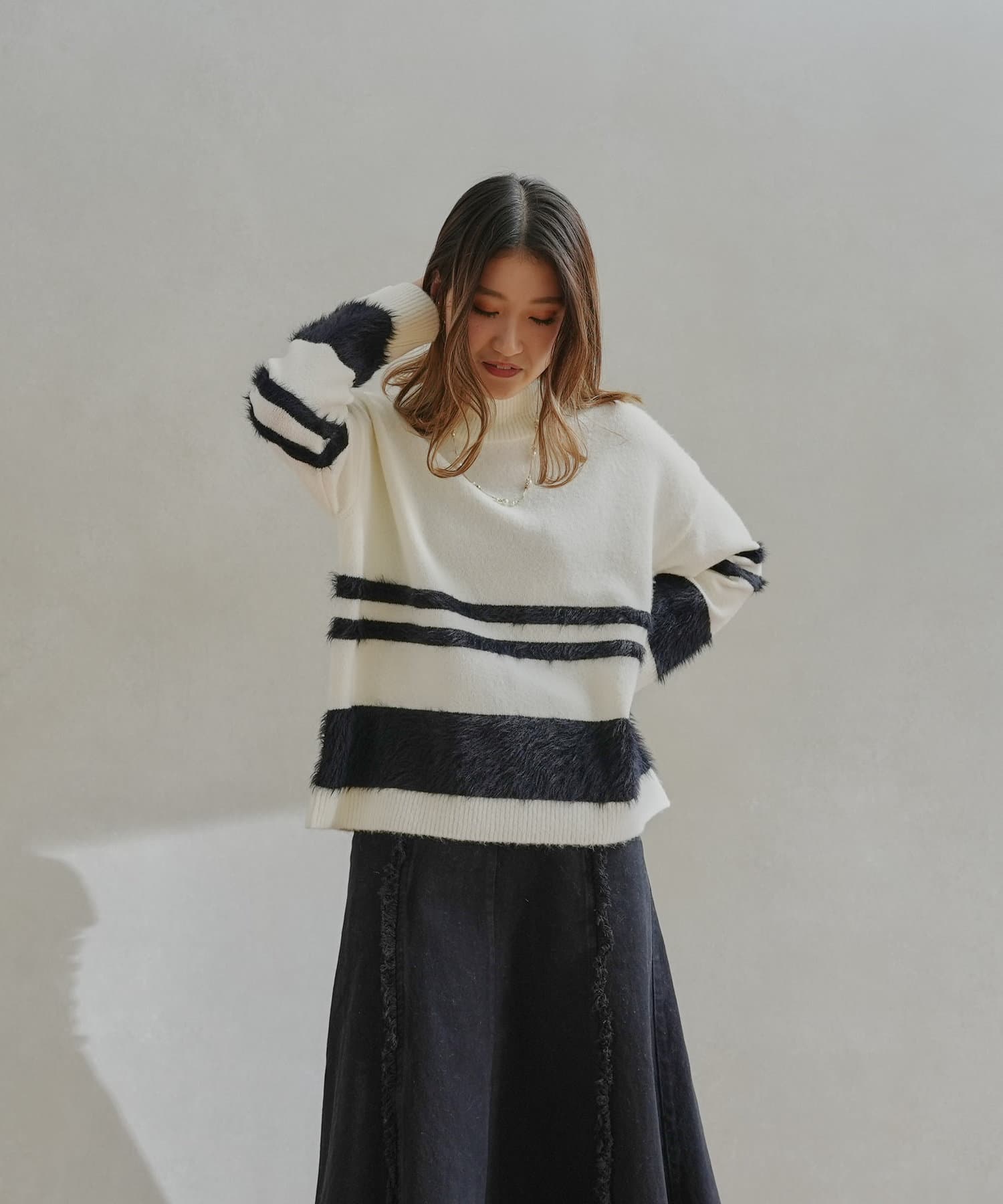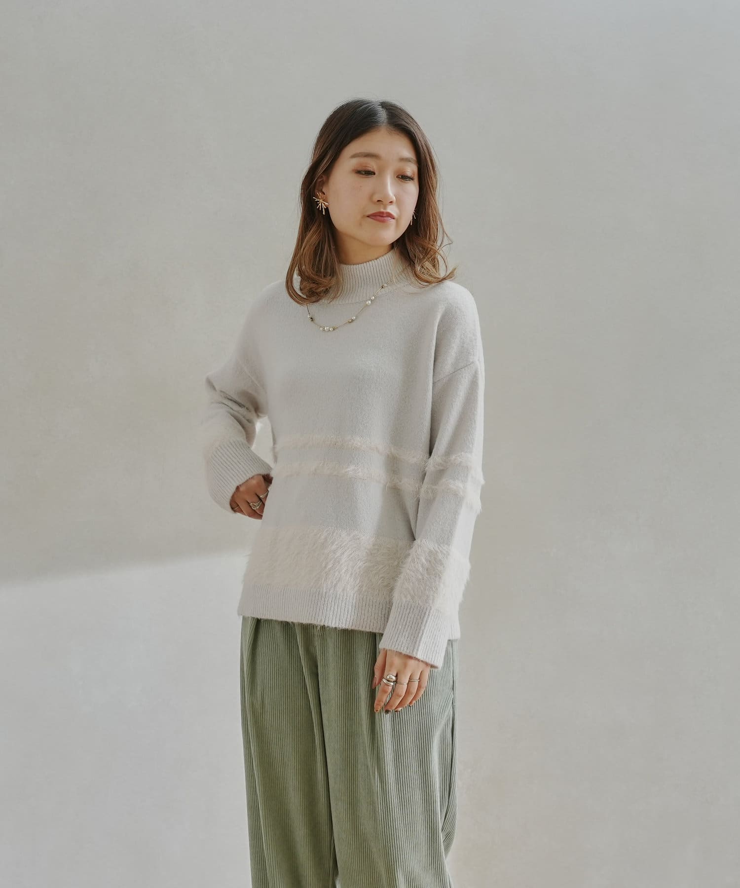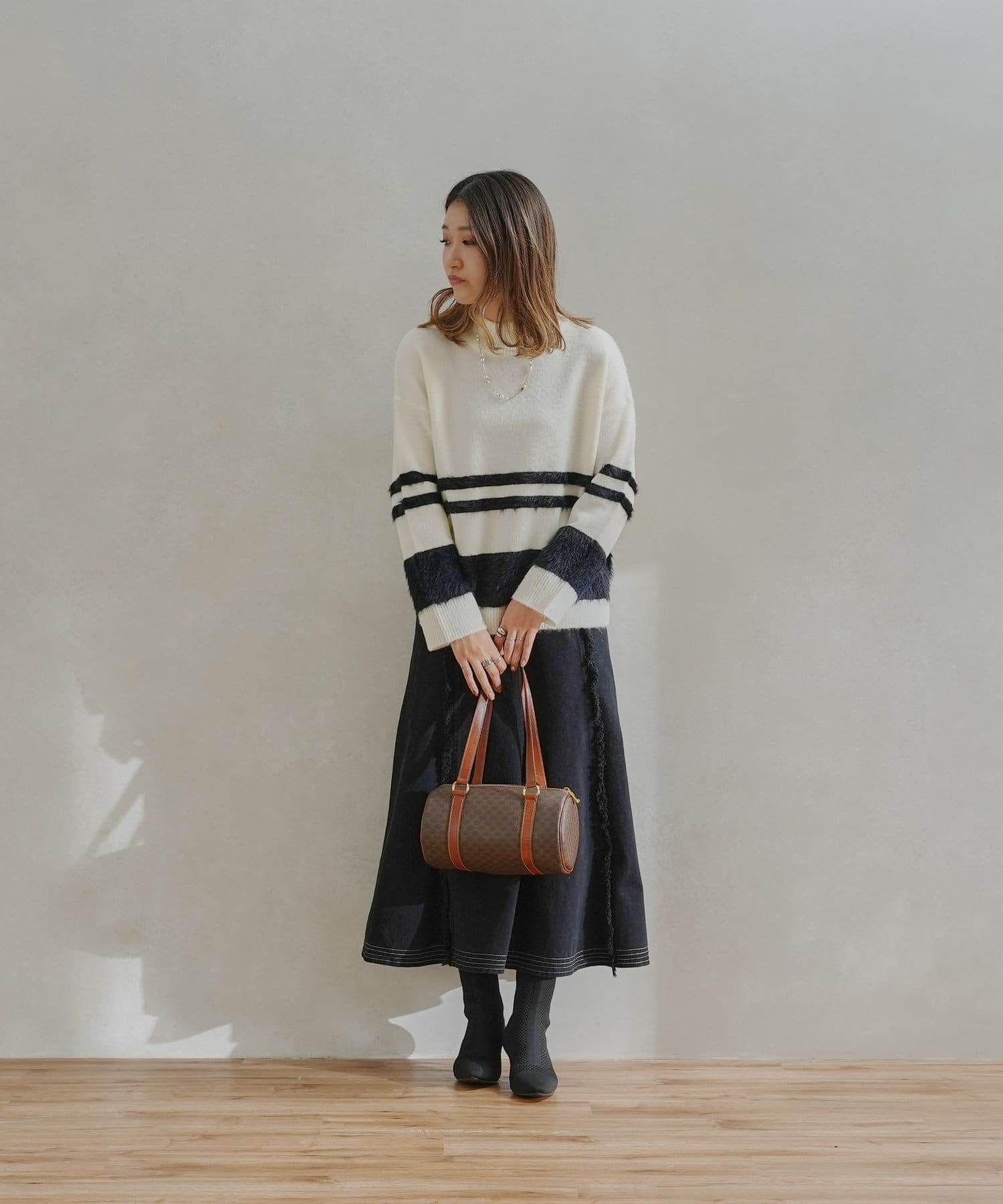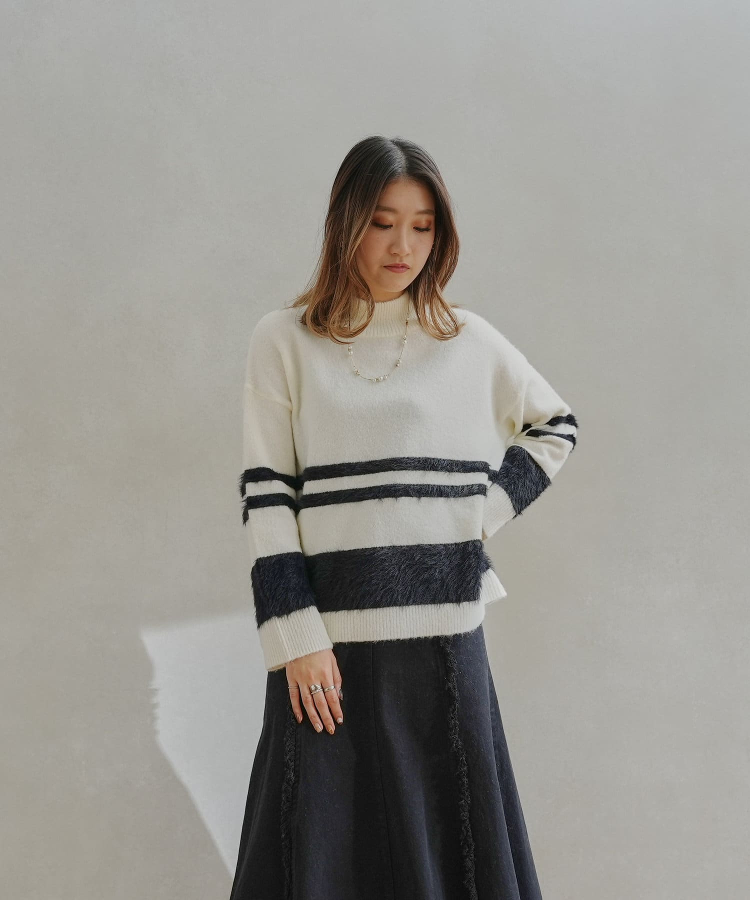 ・部分使いのラインのシャギーニットがボーダー見えしてコーディネートのアクセントを