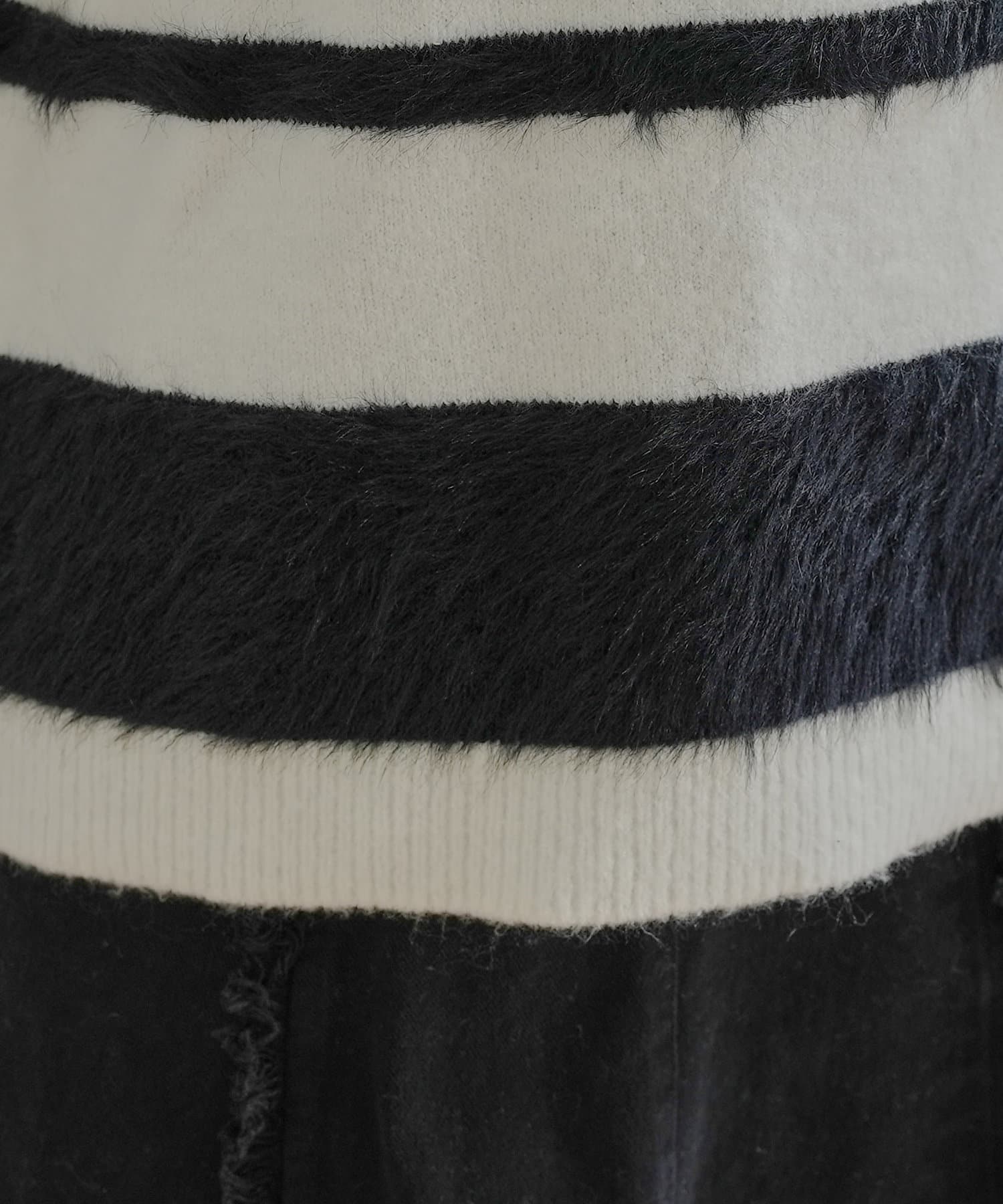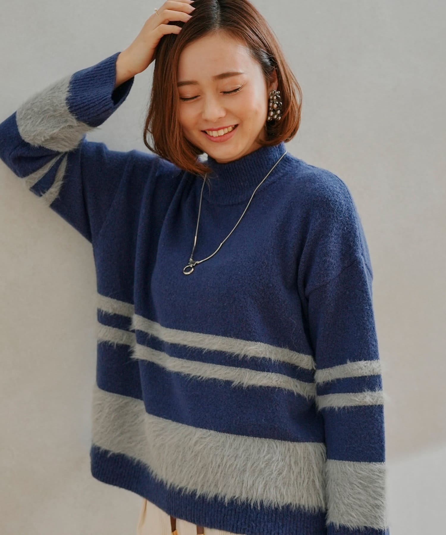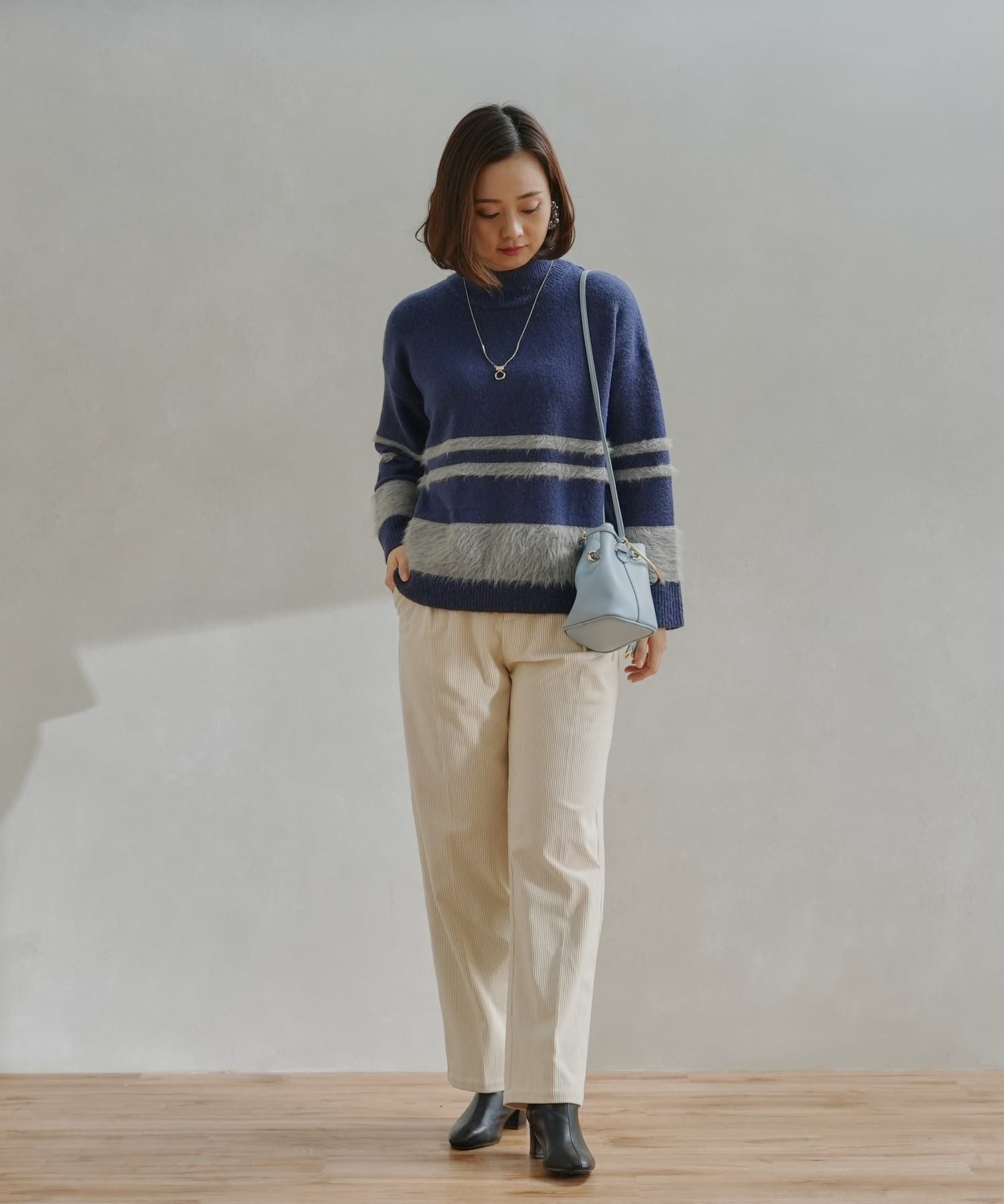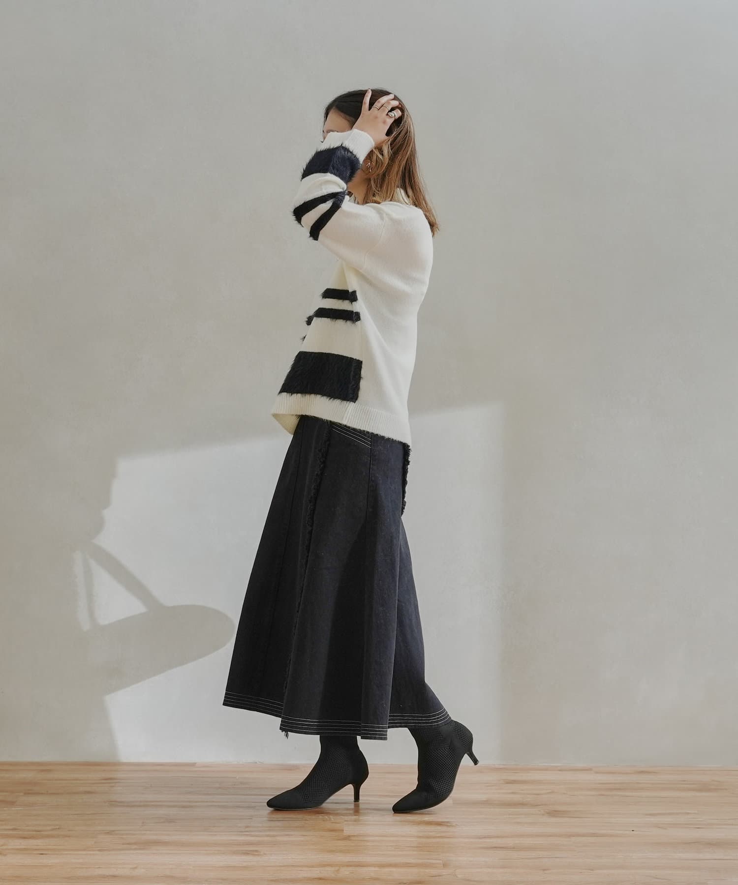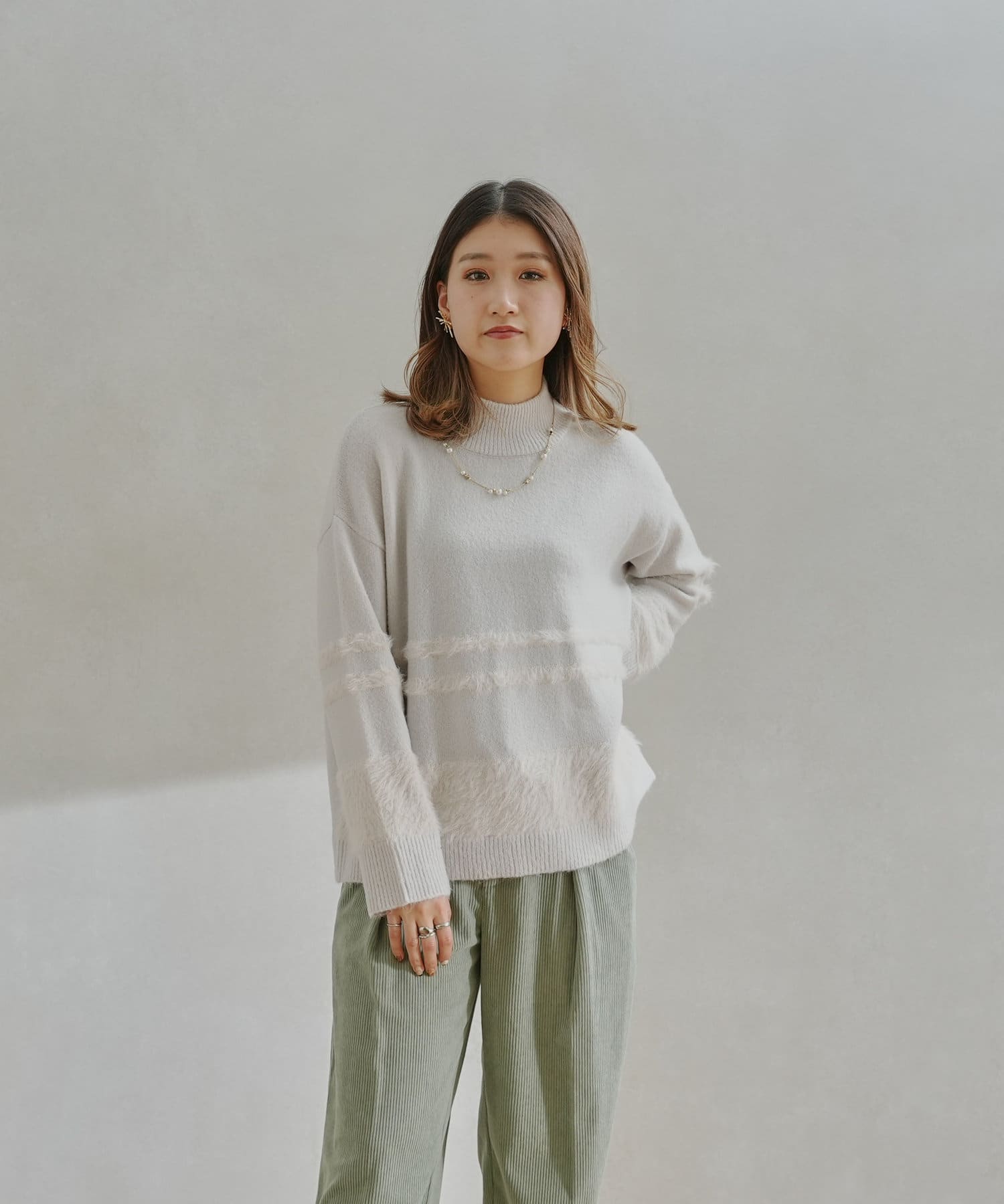 ・部分使いのラインのシャギーニットがボーダー見えしてコーディネートのアクセントを