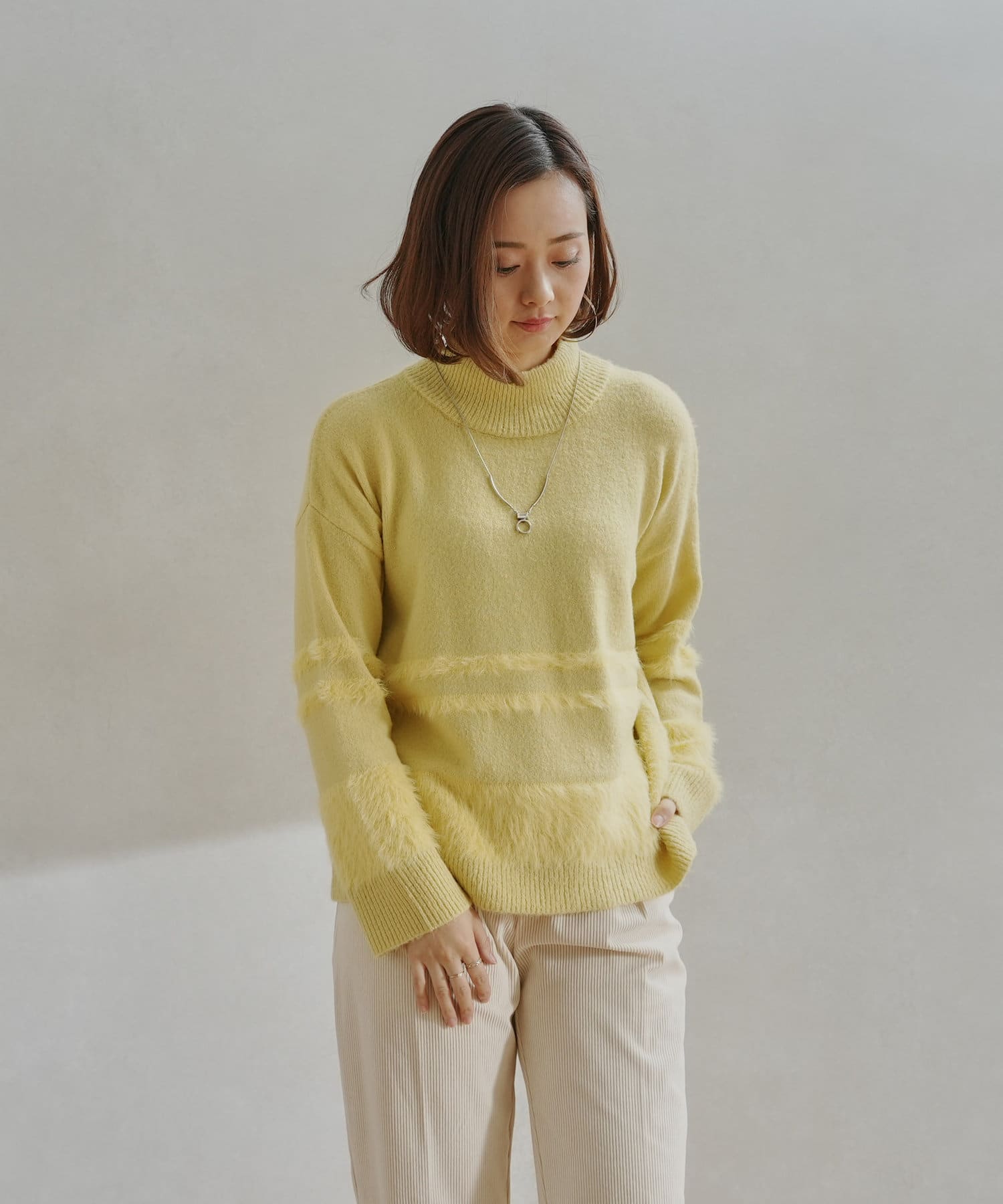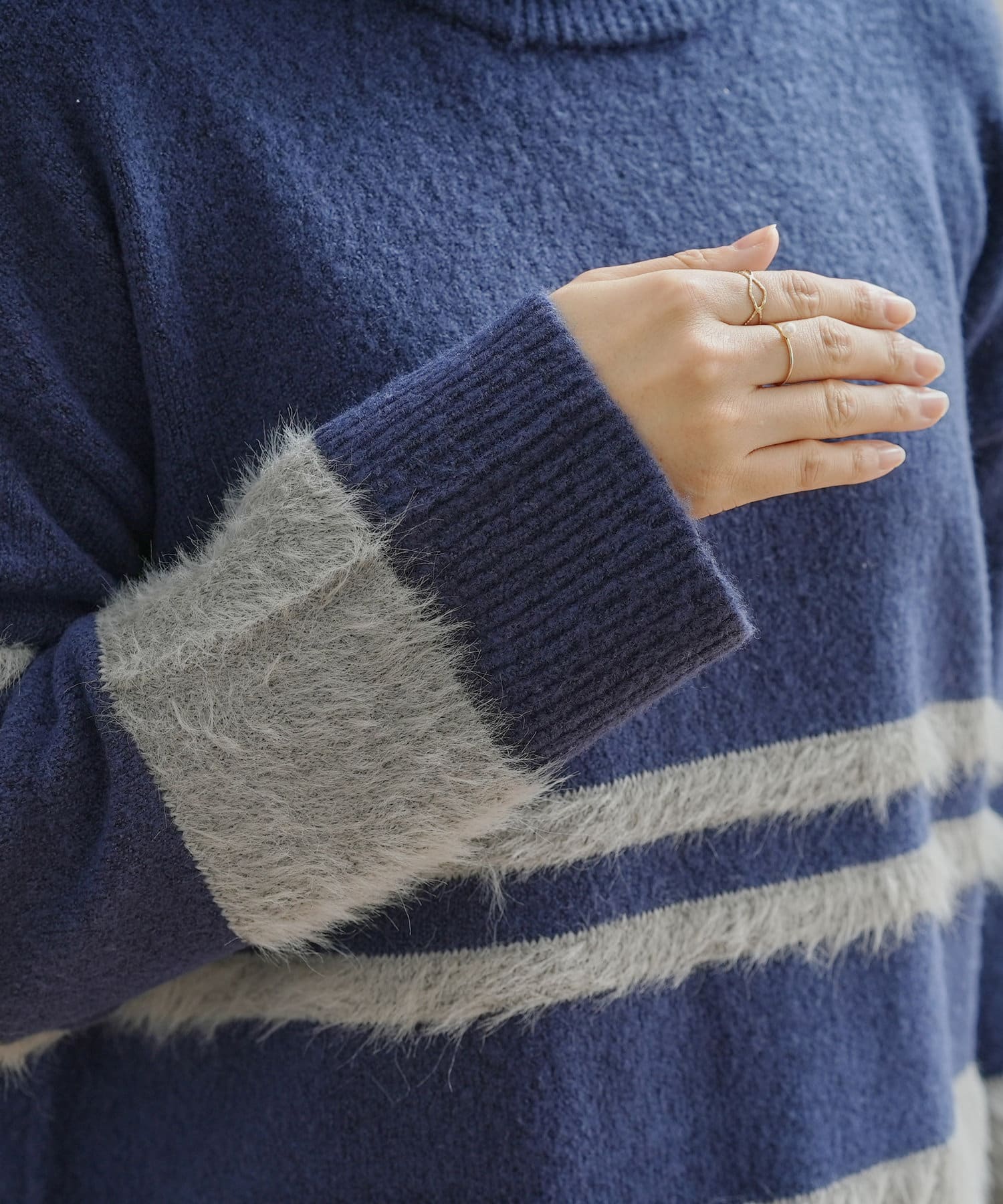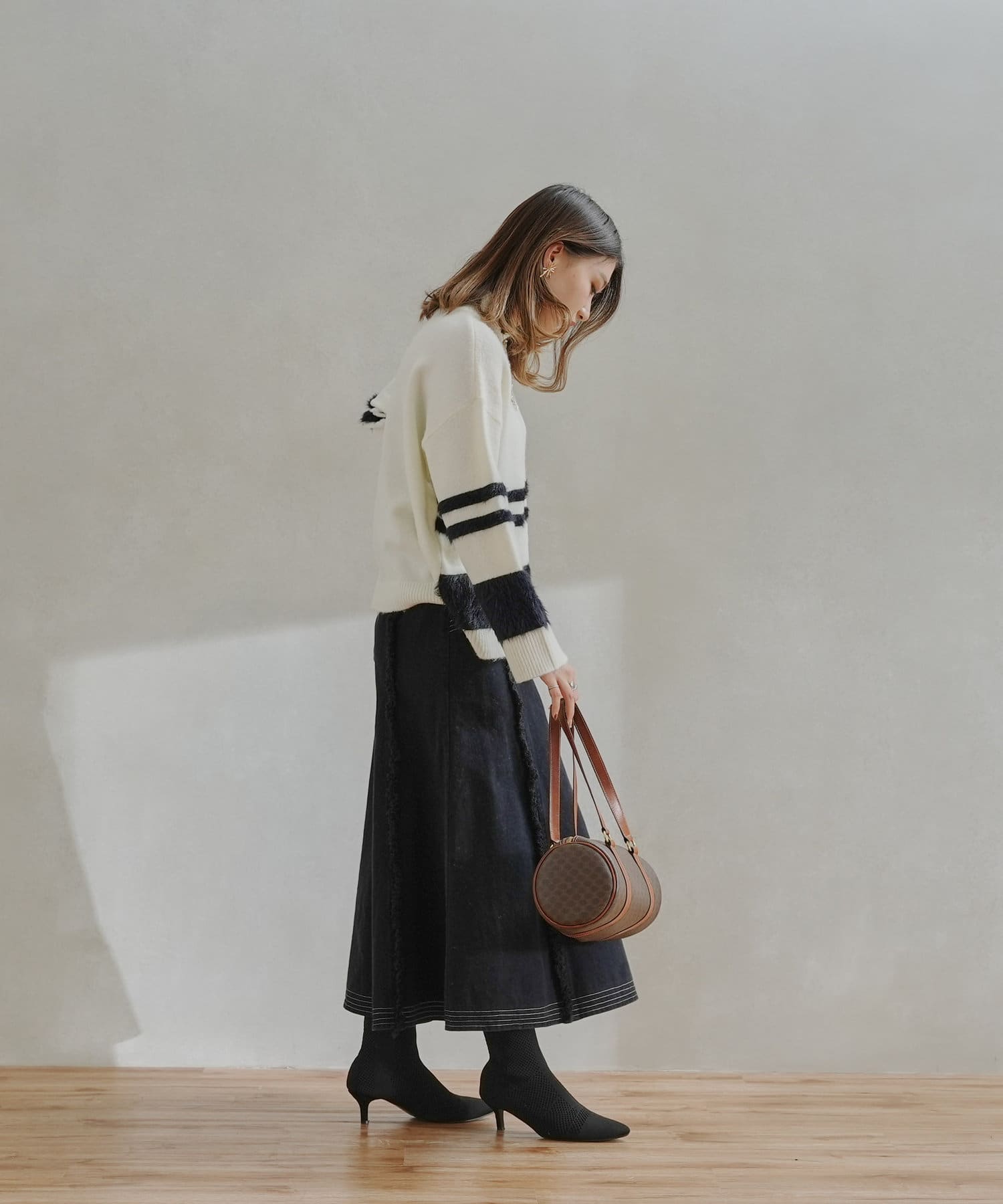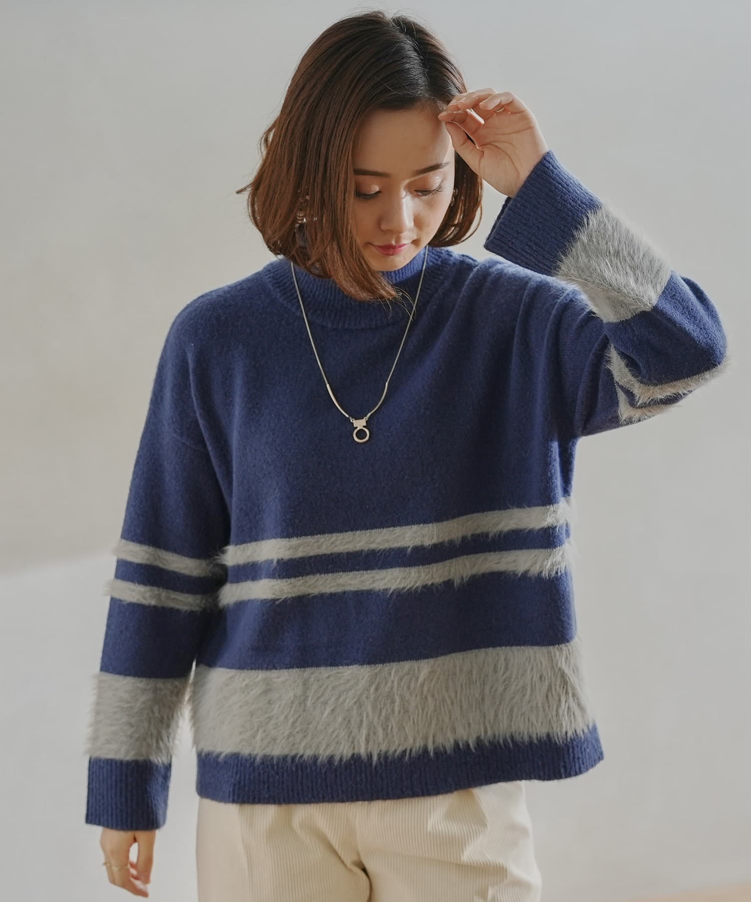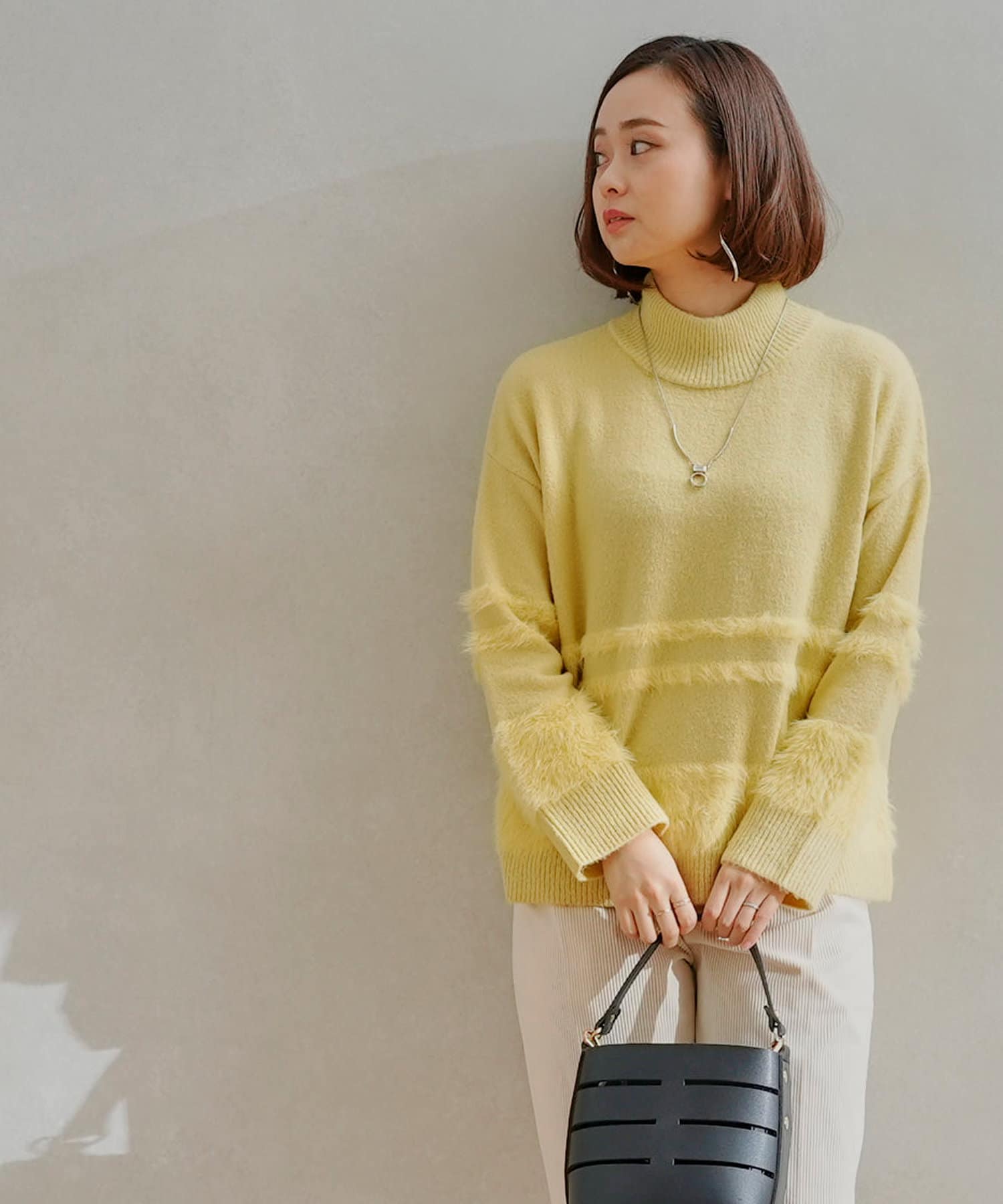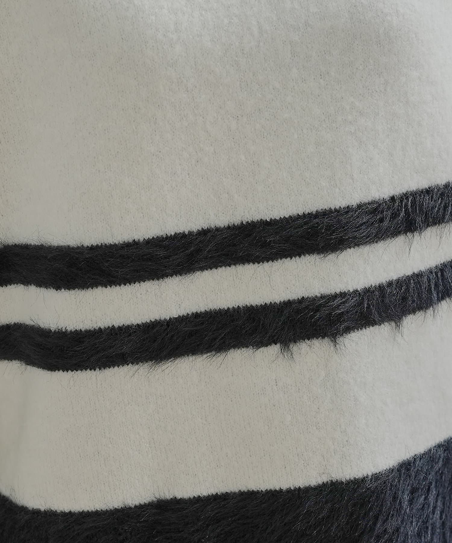 ・部分使いのラインのシャギーニットがボーダー見えしてコーディネートのアクセントを